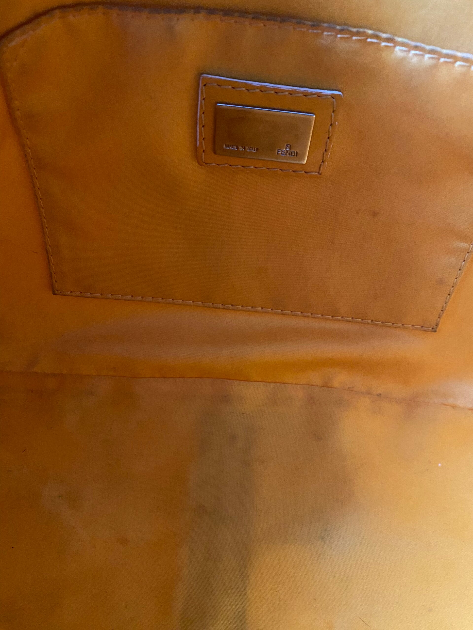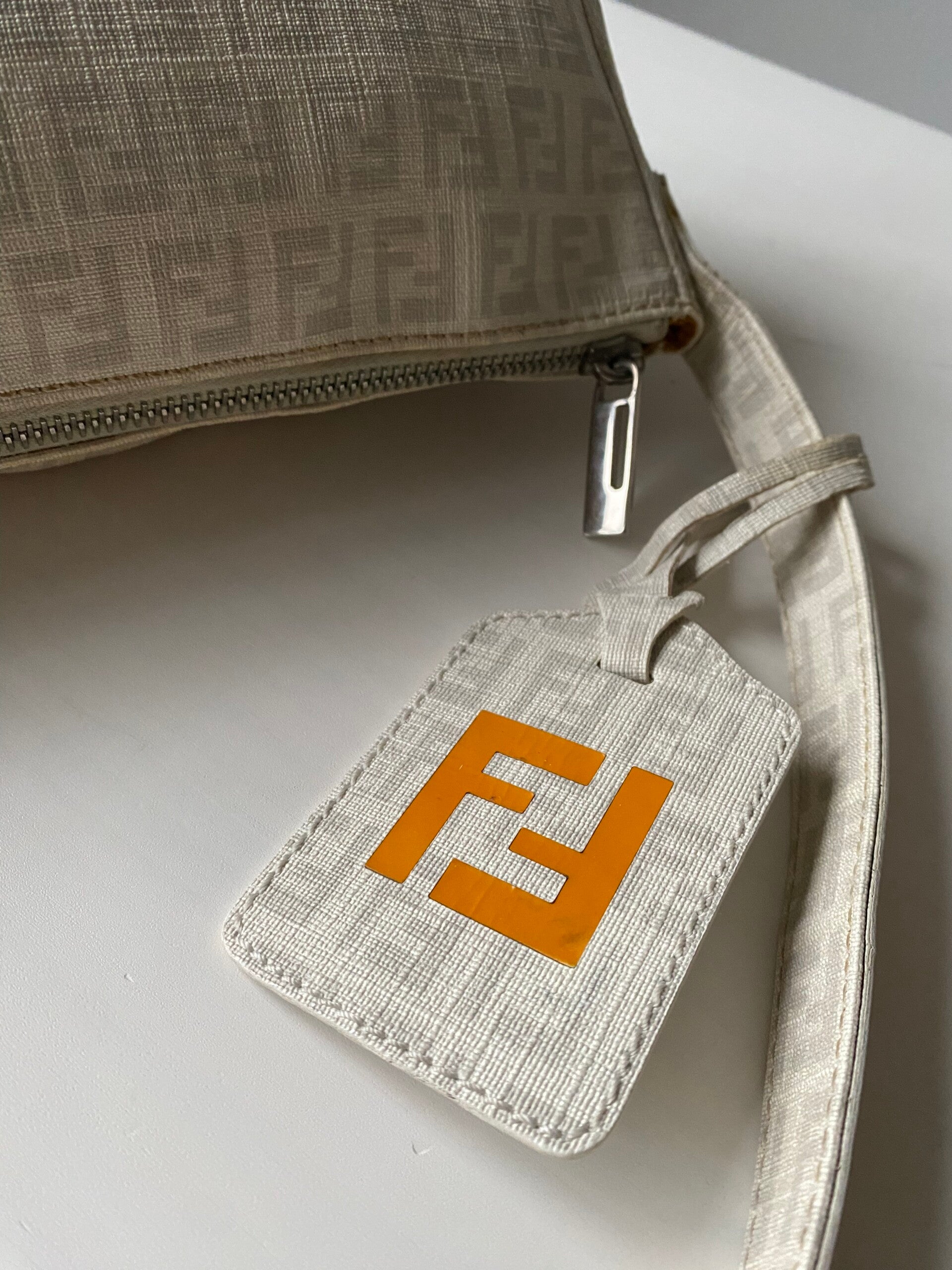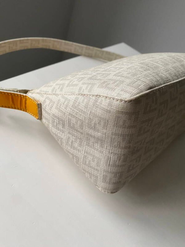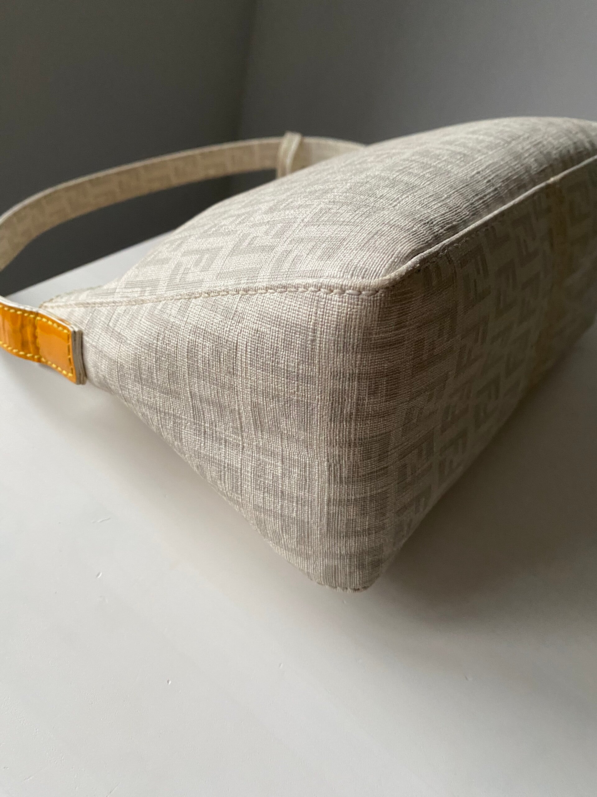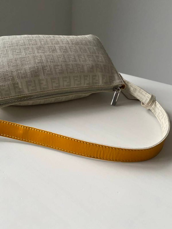 Fendi monogram pochette in very good condition. A small part of the bottom is discolored (pictures 2&4). Small discoloration on strap (picture 11).