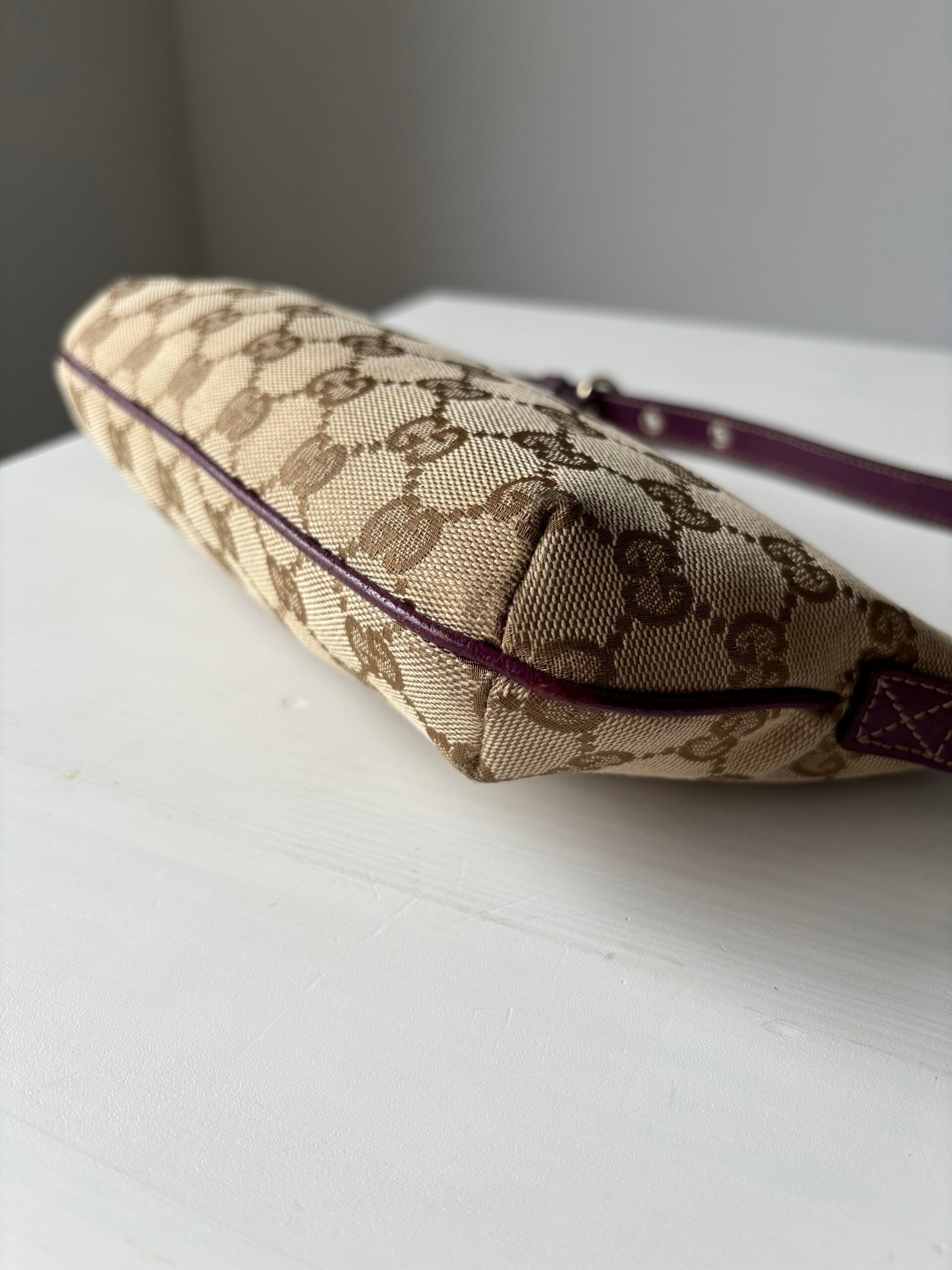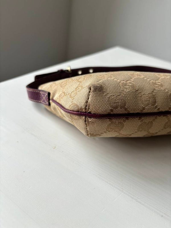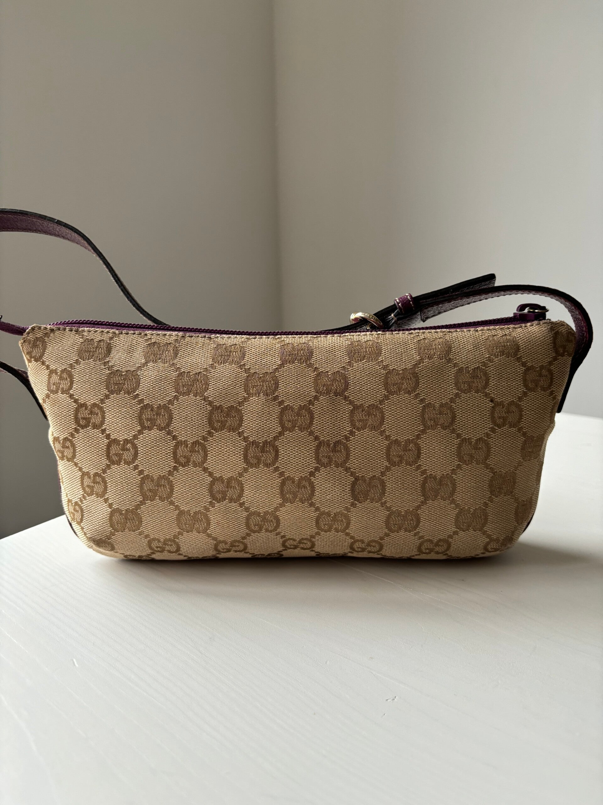 Gucci monogram pochette in perfecte staat. Kan over de schouder worden gedragen. De afmetingen zijn ongeveer 25 x 13 cm. Komt inclusief Veggel Vintage certificaat van authenticiteit en Veggel Vintage dustbag.