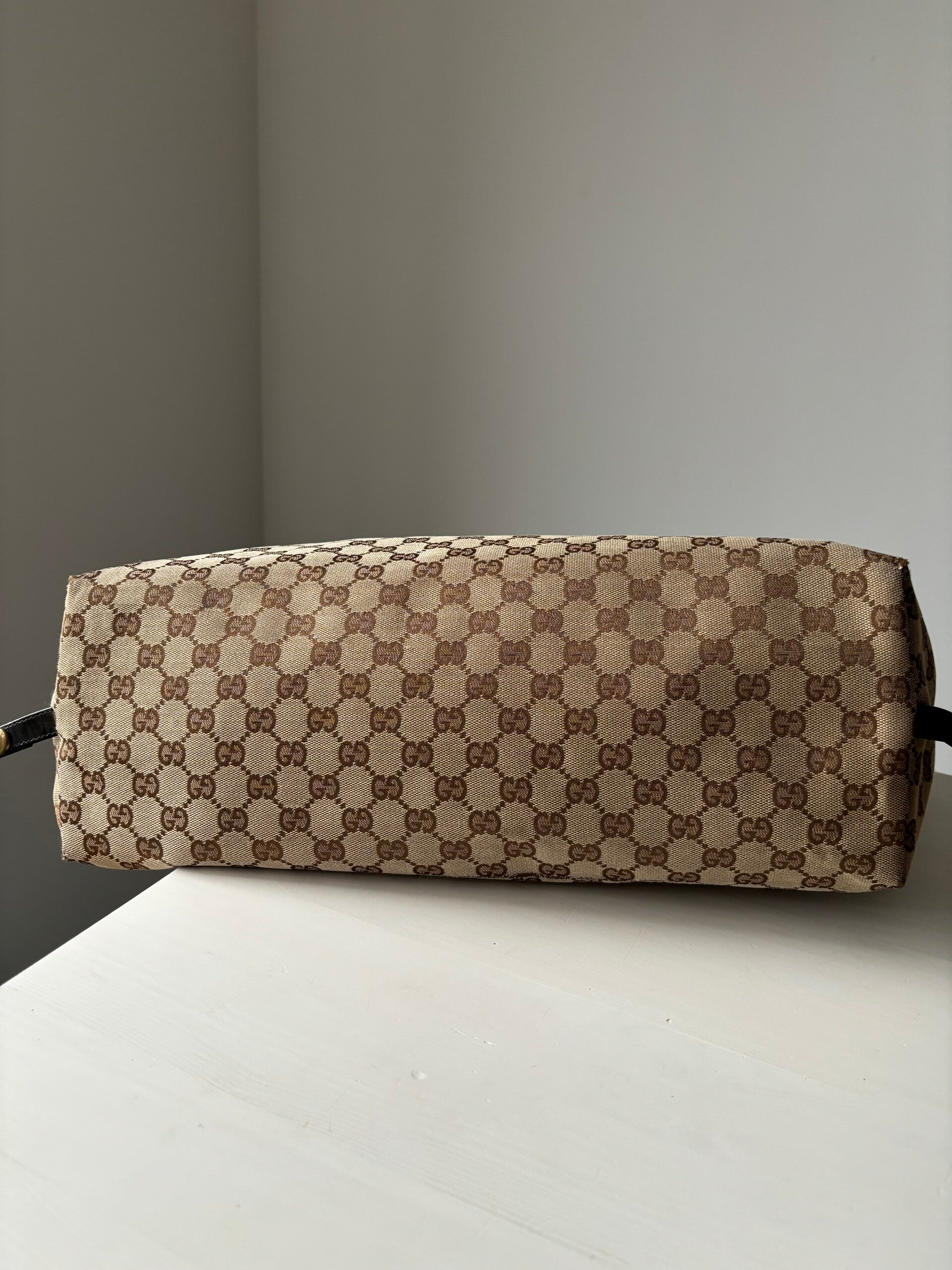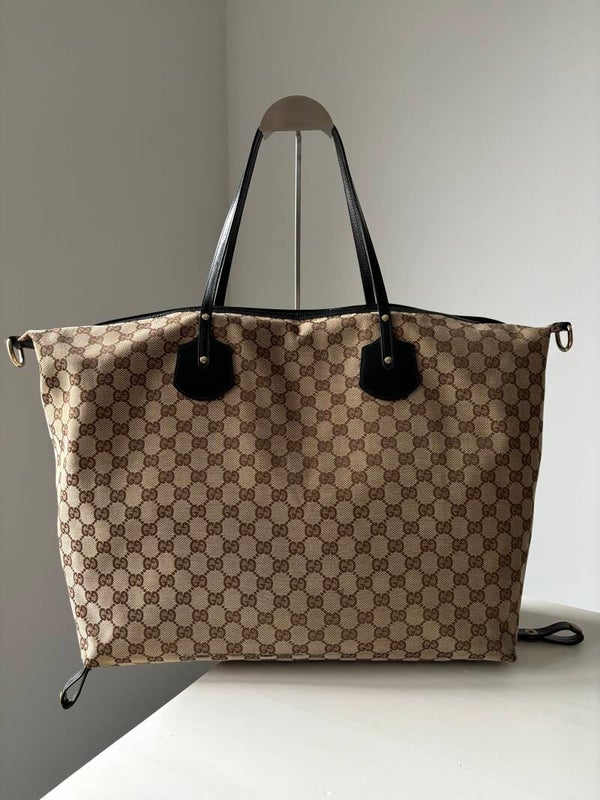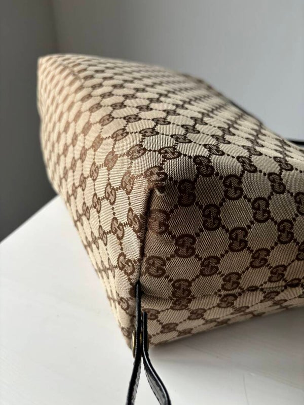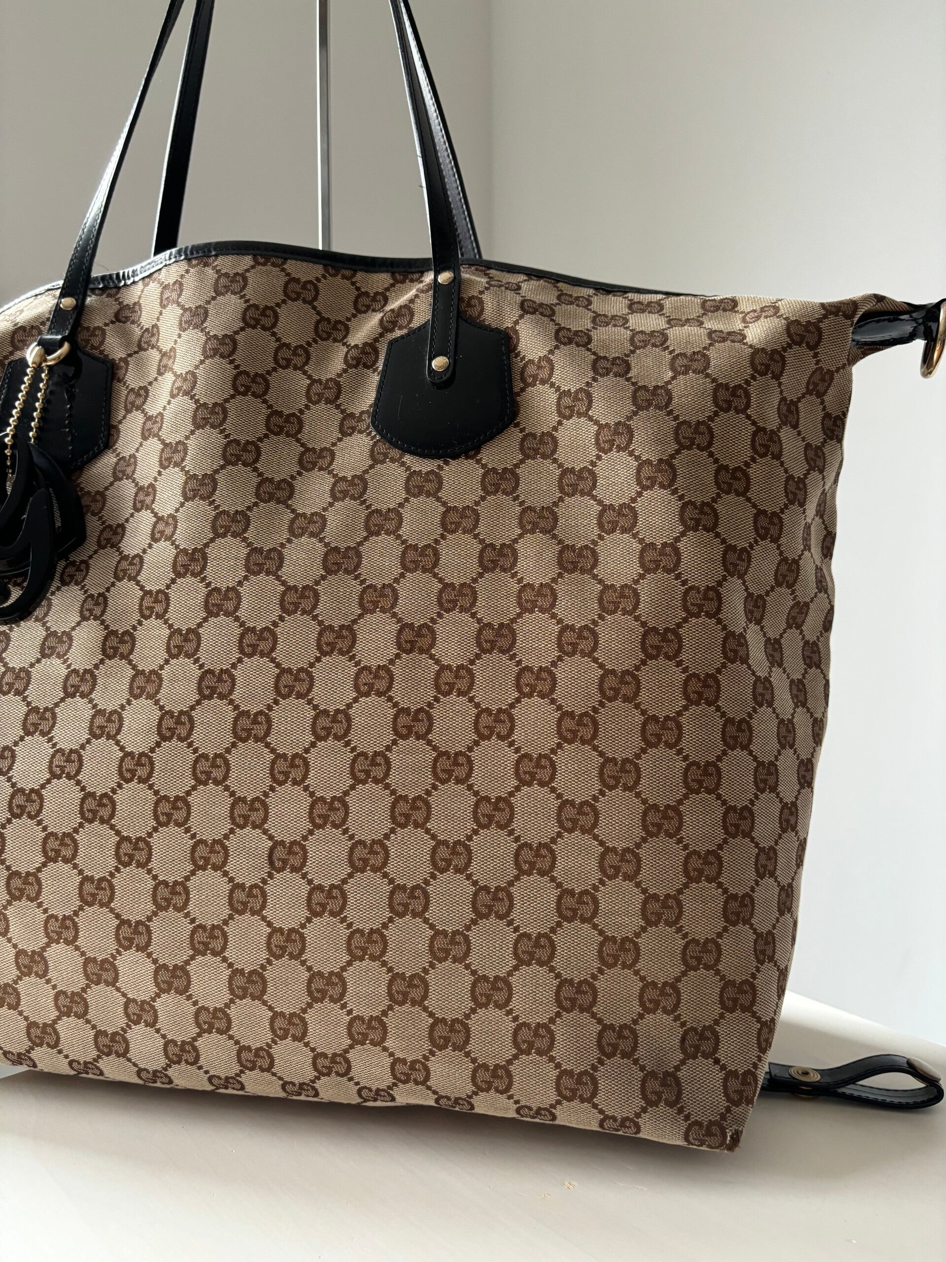 Gucci monogram tote in zeer goede staat. Er past een laptop in. Kan over de schouder worden gedragen. De afmetingen zijn ongeveer 50 x 35 cm. Komt inclusief Veggel Vintage certificaat van authenticiteit.
