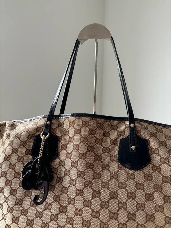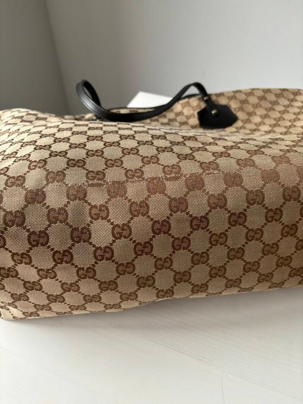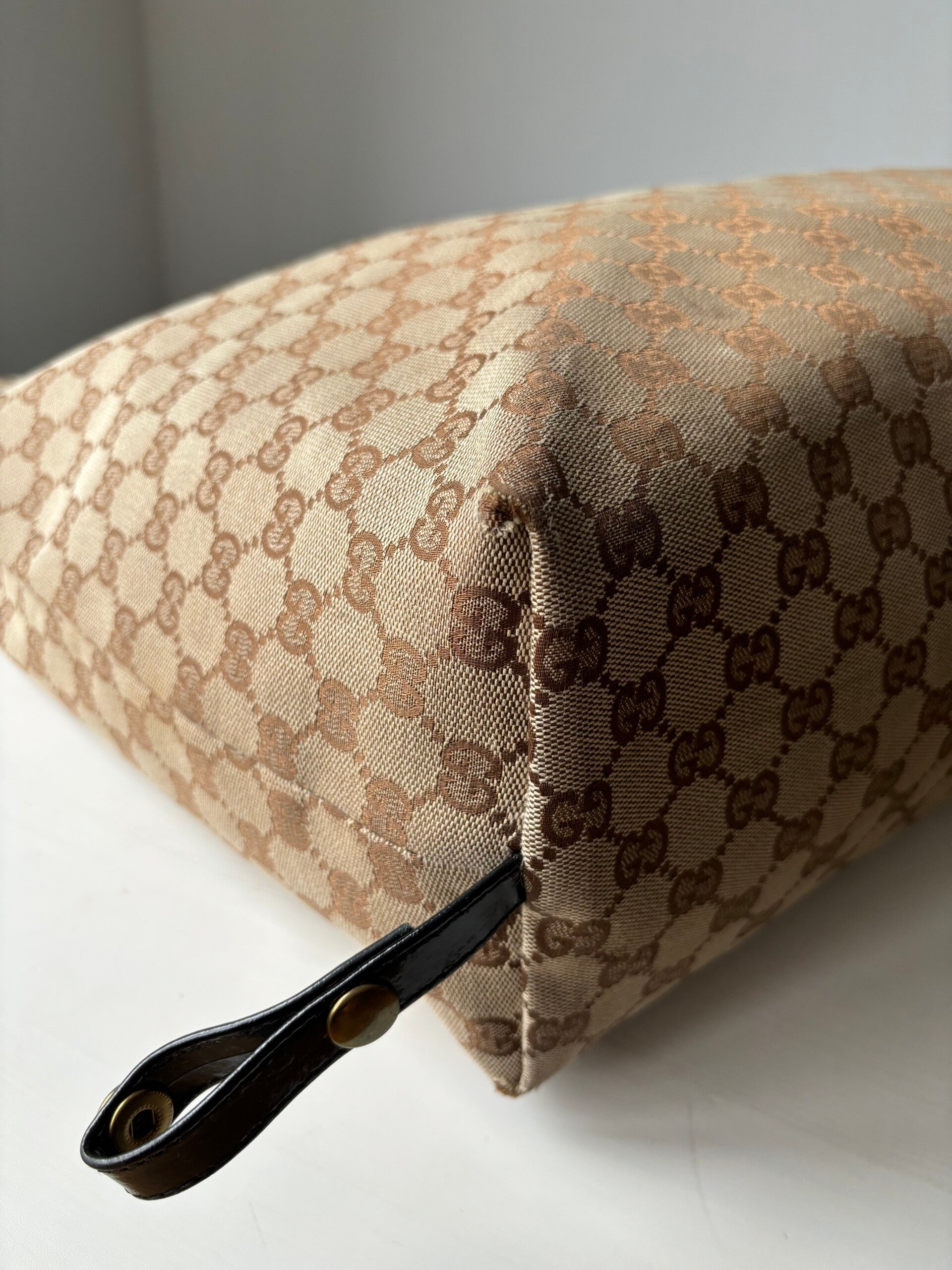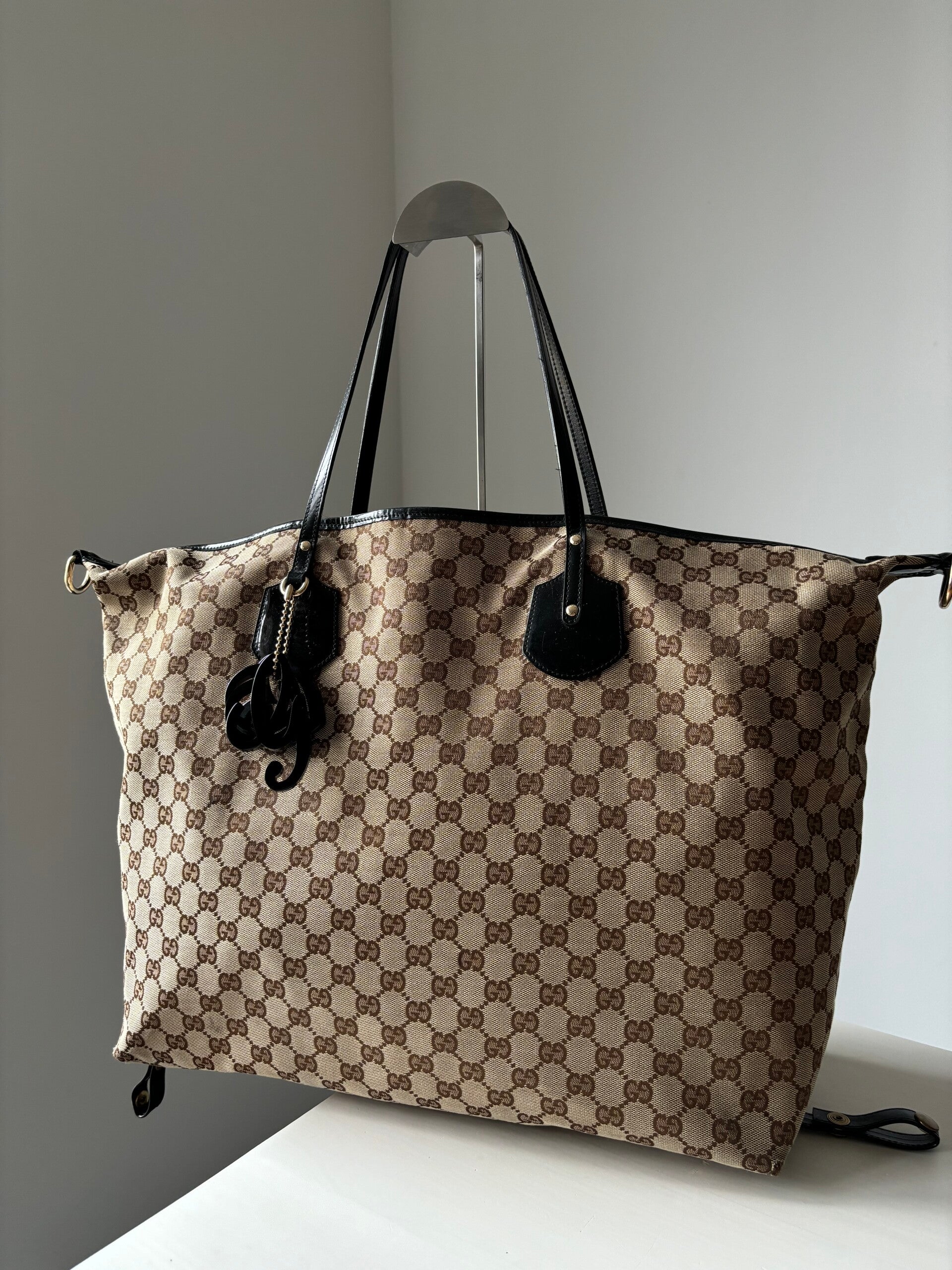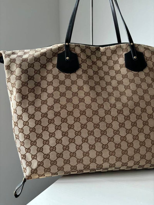 Gucci monogram tote in zeer goede staat. Er past een laptop in. Kan over de schouder worden gedragen. De afmetingen zijn ongeveer 50 x 35 cm. Komt inclusief Veggel Vintage certificaat van authenticiteit.