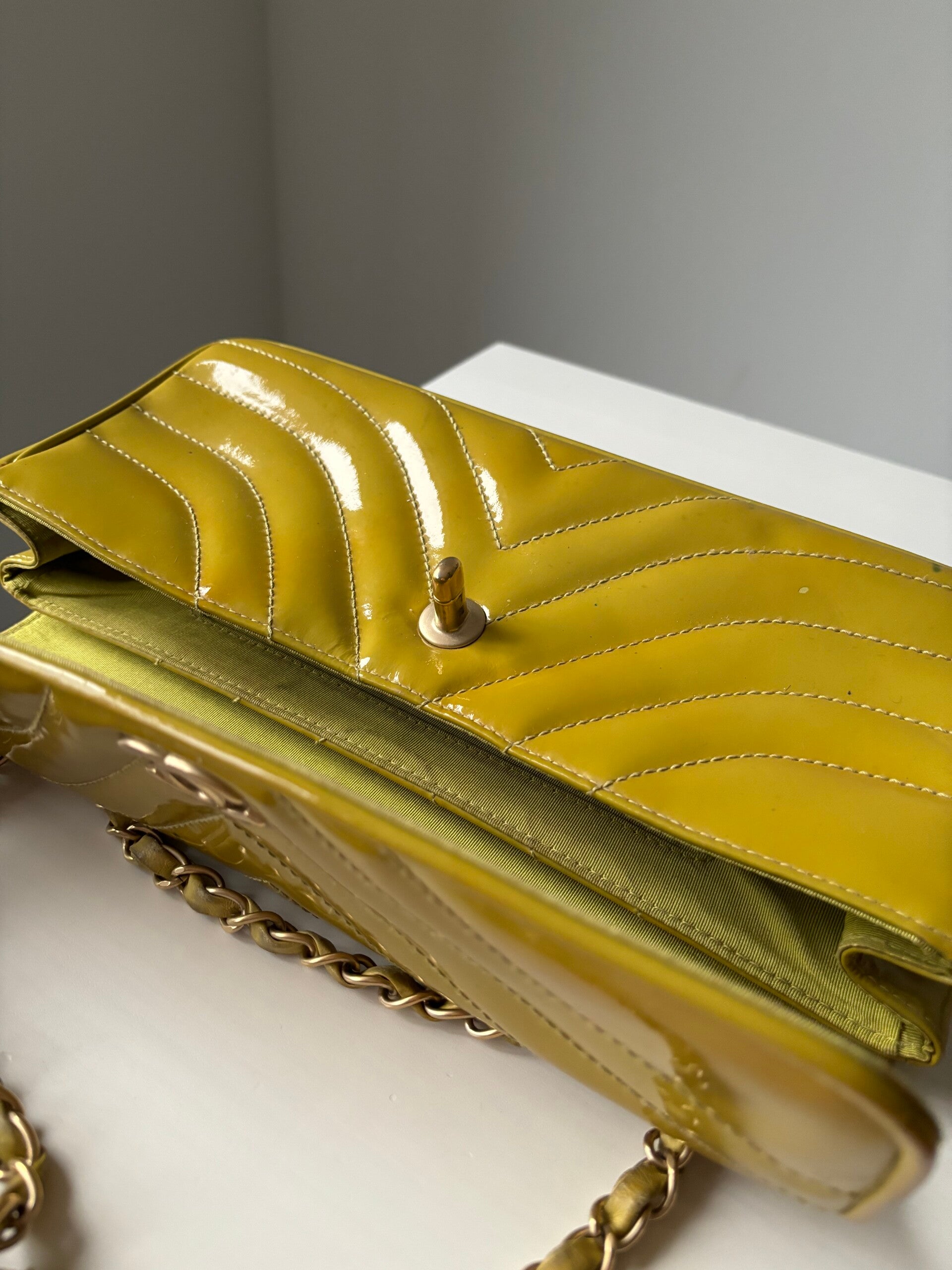 Chanel lakleer crossbody/schoudertas in gebruikte staat. De tas bevat verkleuringen. De tas kan over de schouder en als hoge crossbody worden gedragen. De afmetingen zijn ongeveer 28 x 14 cm. De strap is ongeveer 110 cm. Komt inclusief Veggel Vintage certificaat van authenticiteit en Veggel Vintage dustbag.