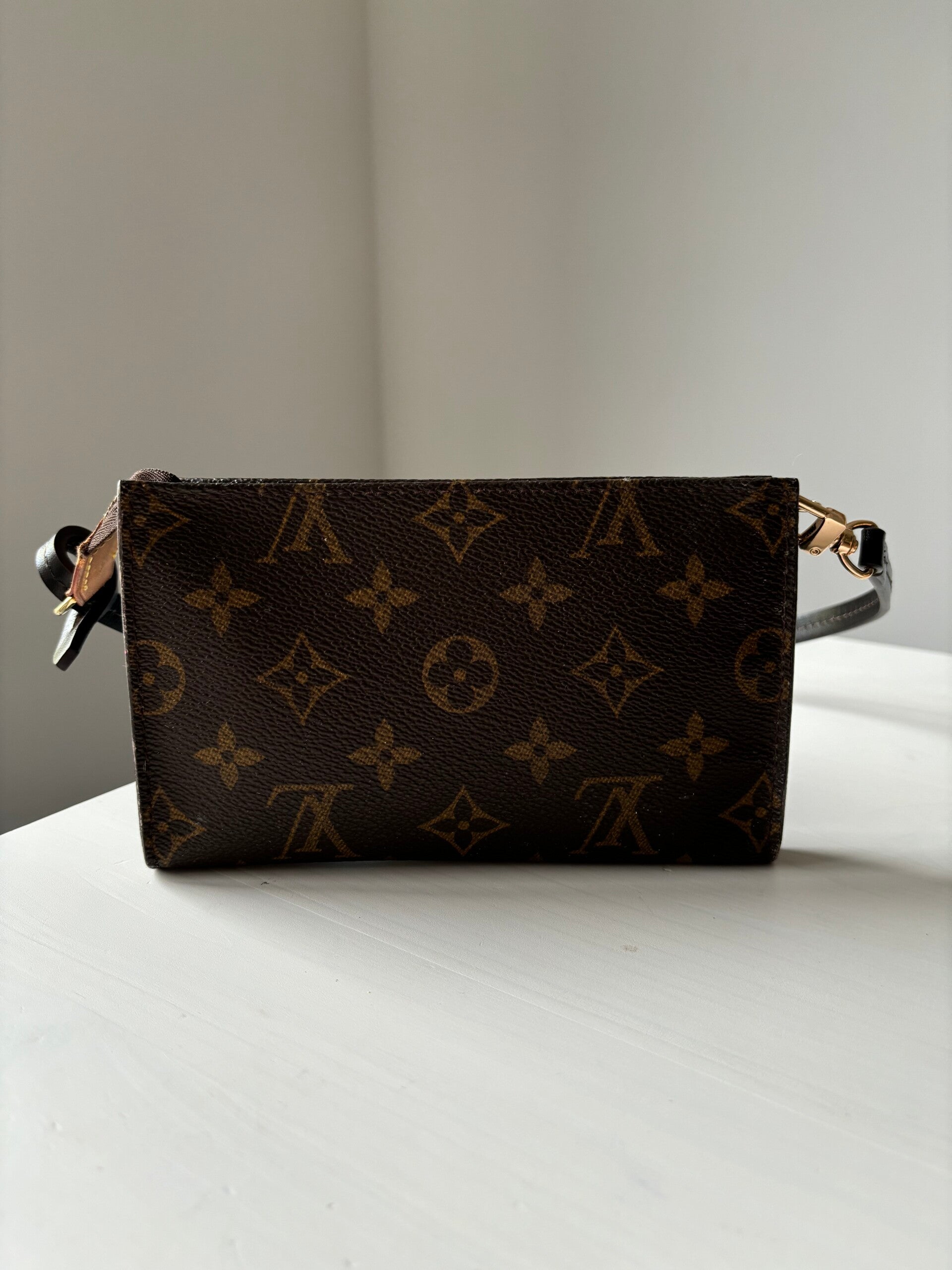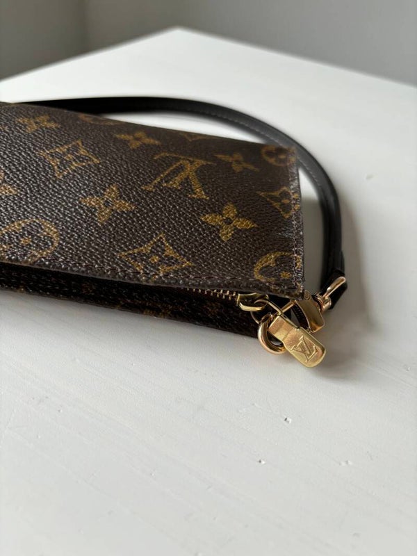 Louis Vuitton momogram pochette in goede staat. De tas kan over de schouder worden gedragen. De strap is merkloos. De binnenkant laat wat los. De afmetingen zijn ongeveer 17 x 11 cm. Komt inclusief Veggel Vintage certificaat van authenticiteit en Veggel Vintage dustbag.