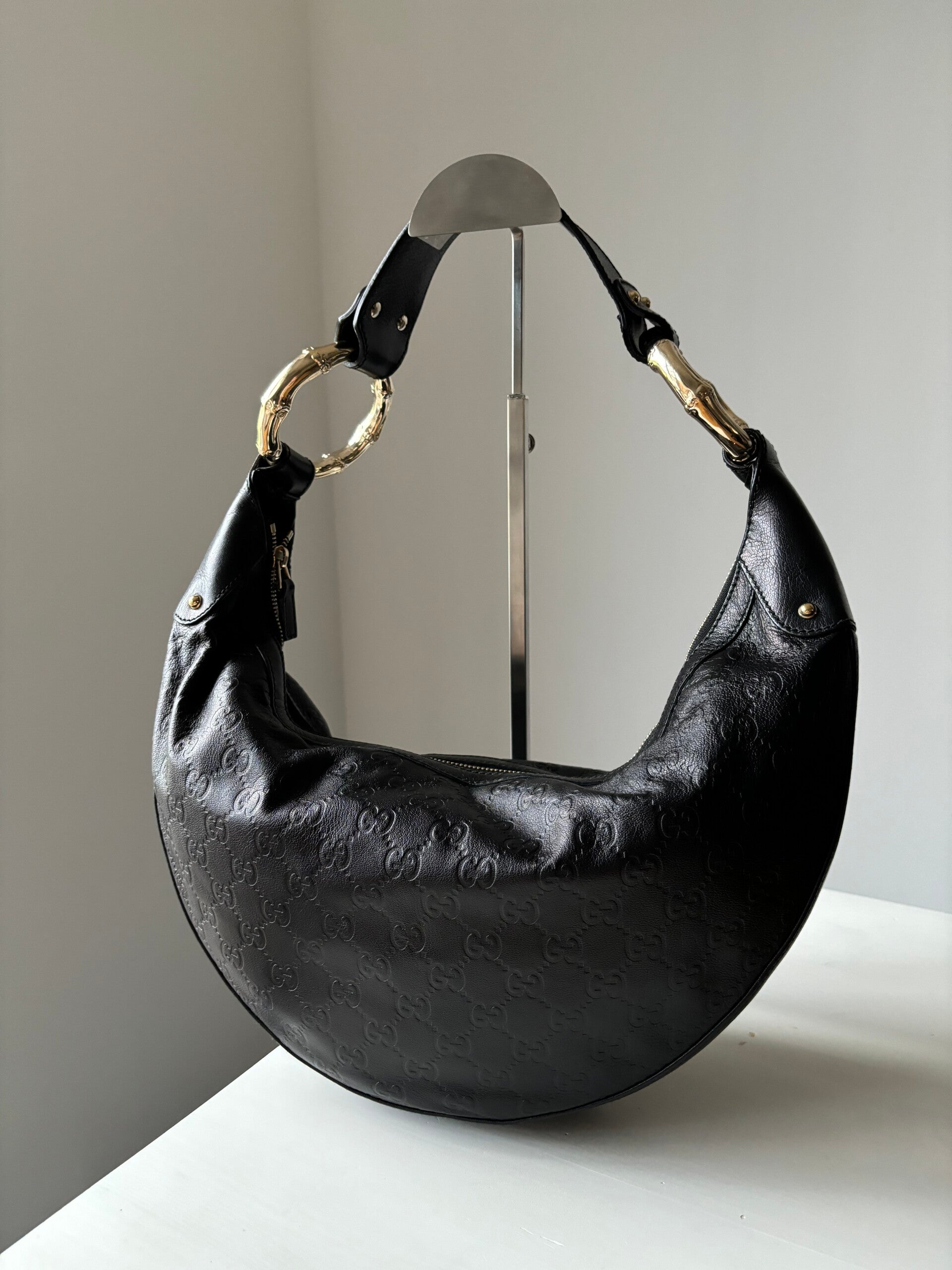 Gucci monogram bamboo hobo in nieuwstaat. De tas kan over de schouder worden gedragen. De afmetingen zijn ongeveer 38 x 25 cm exclusief strap. Komt inclusief Veggel Vintage certificaat van authenticiteit.