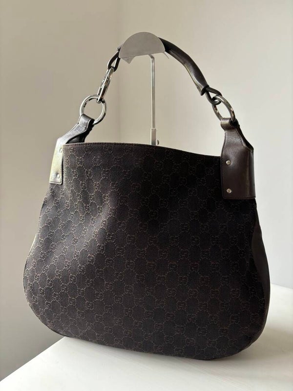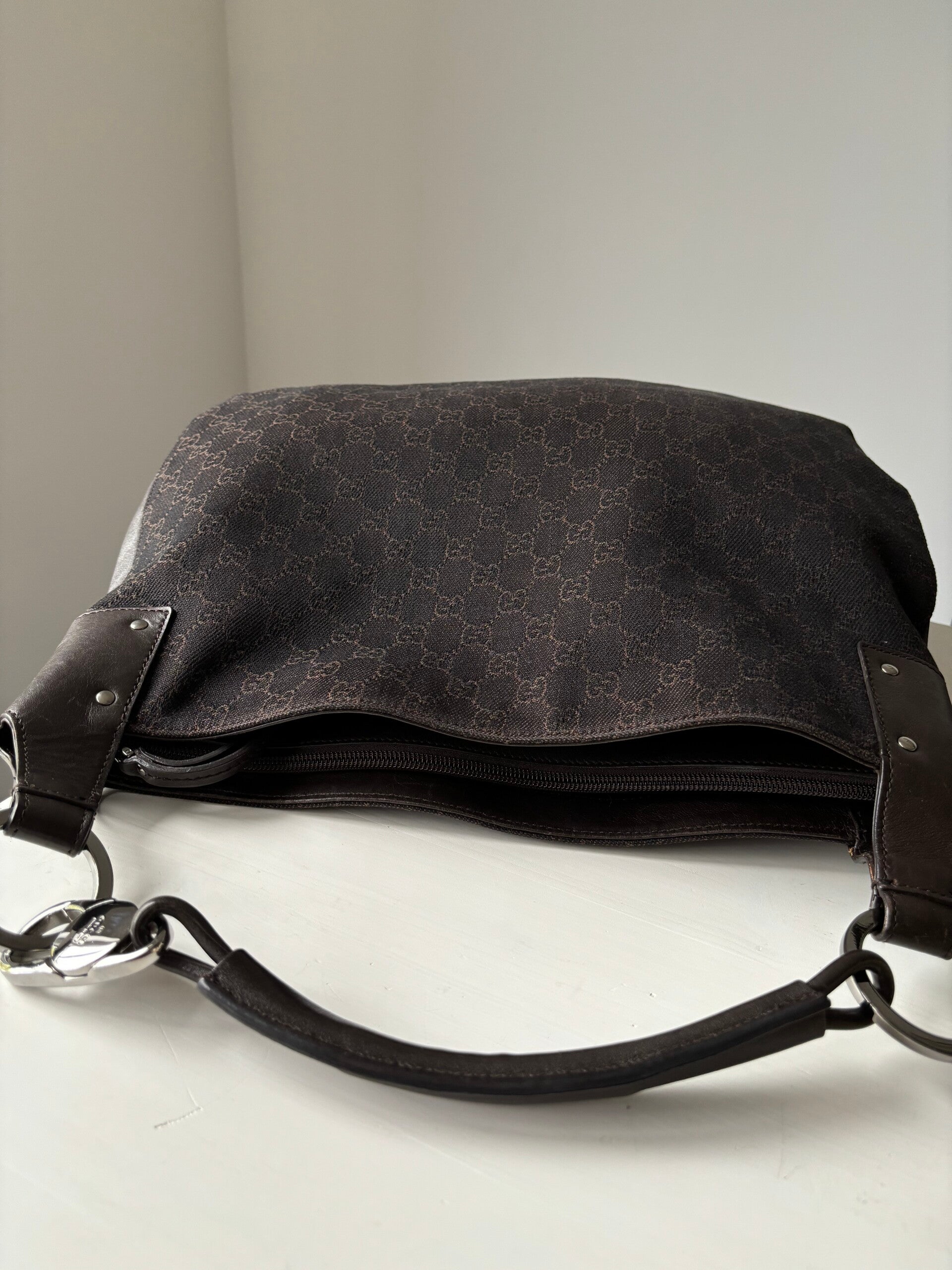Gucci monogram schoudertas in perfecte staat. Kan over de schouder worden gedragen. Er past een laptop in de tas. De afmetingen zijn ongeveer 42 x 32 cm. Komt inclusief Veggel Vintage certificaat van authenticiteit.