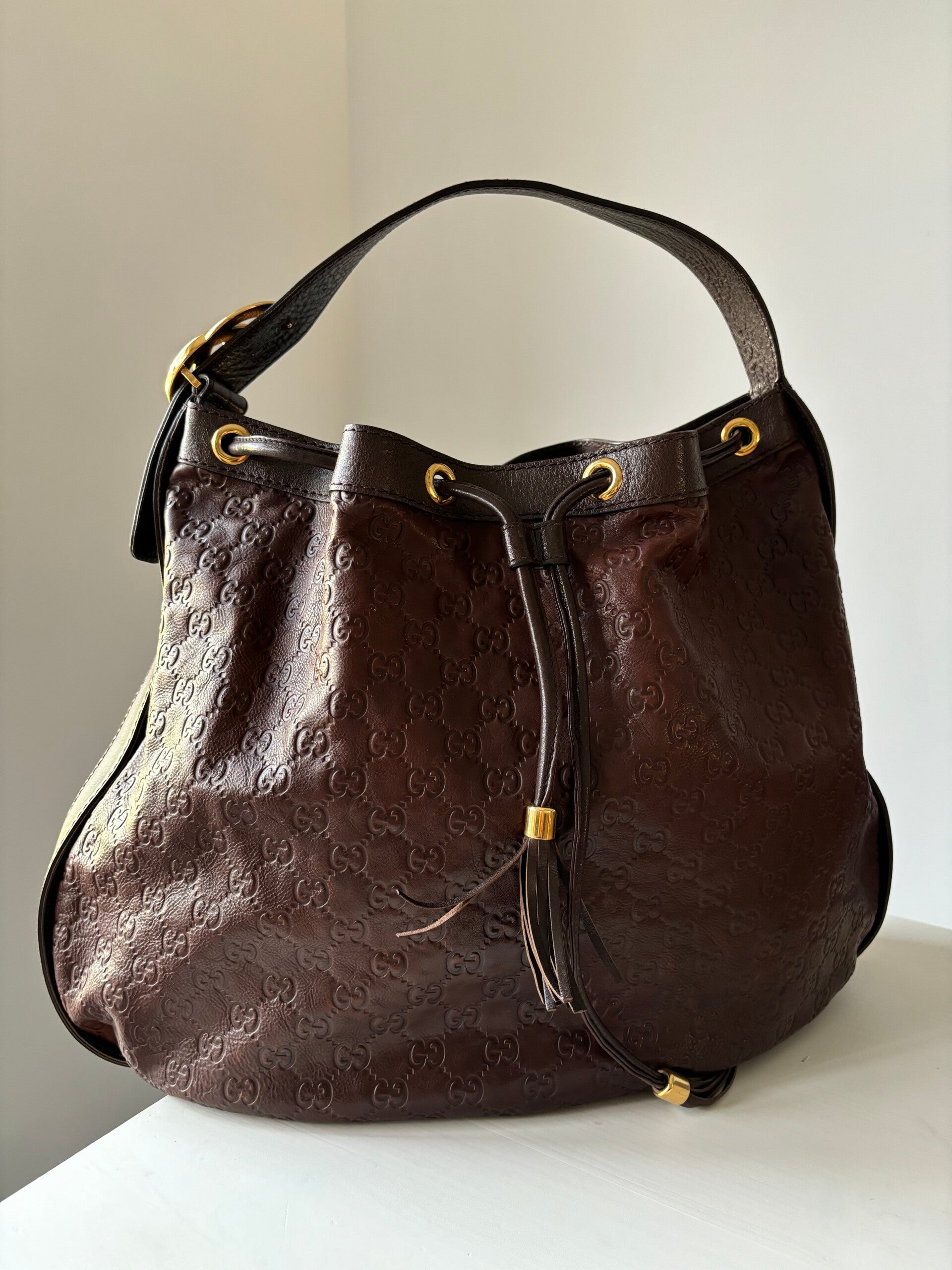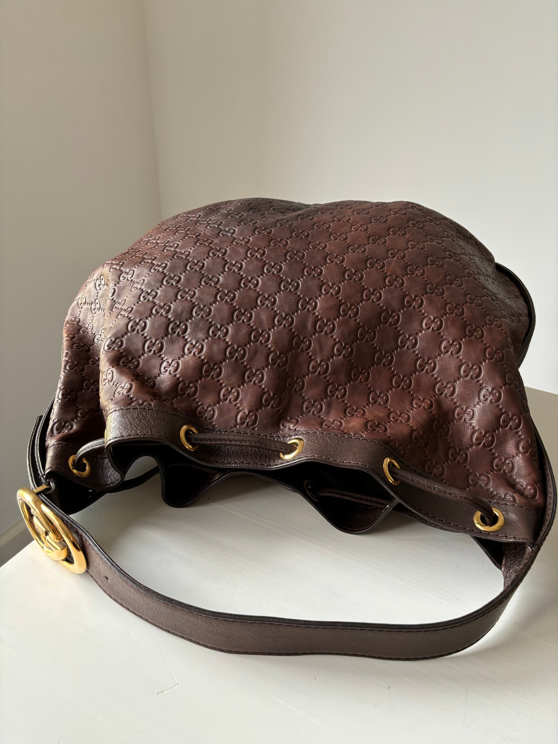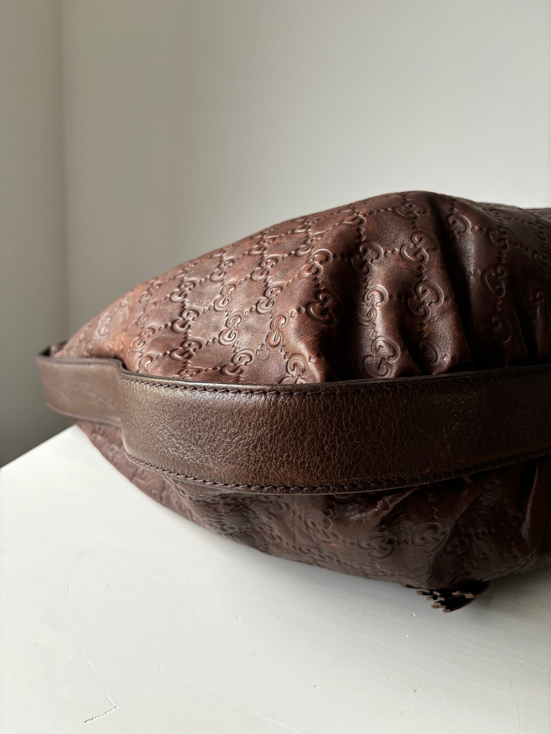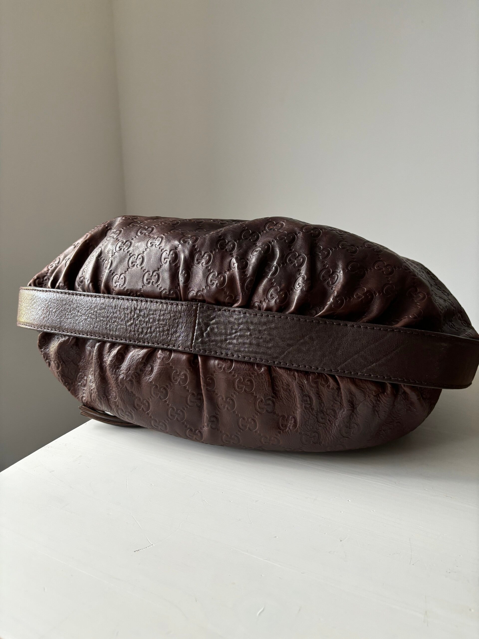 Gucci monogram hobo in goede staat. De tas kan over de schouder worden gedragen. Er past een laptop in. De afmetingen zijn ongeveer 45 x 35 cm. Komt inclusief Veggel Vintage certificaat van authenticiteit.