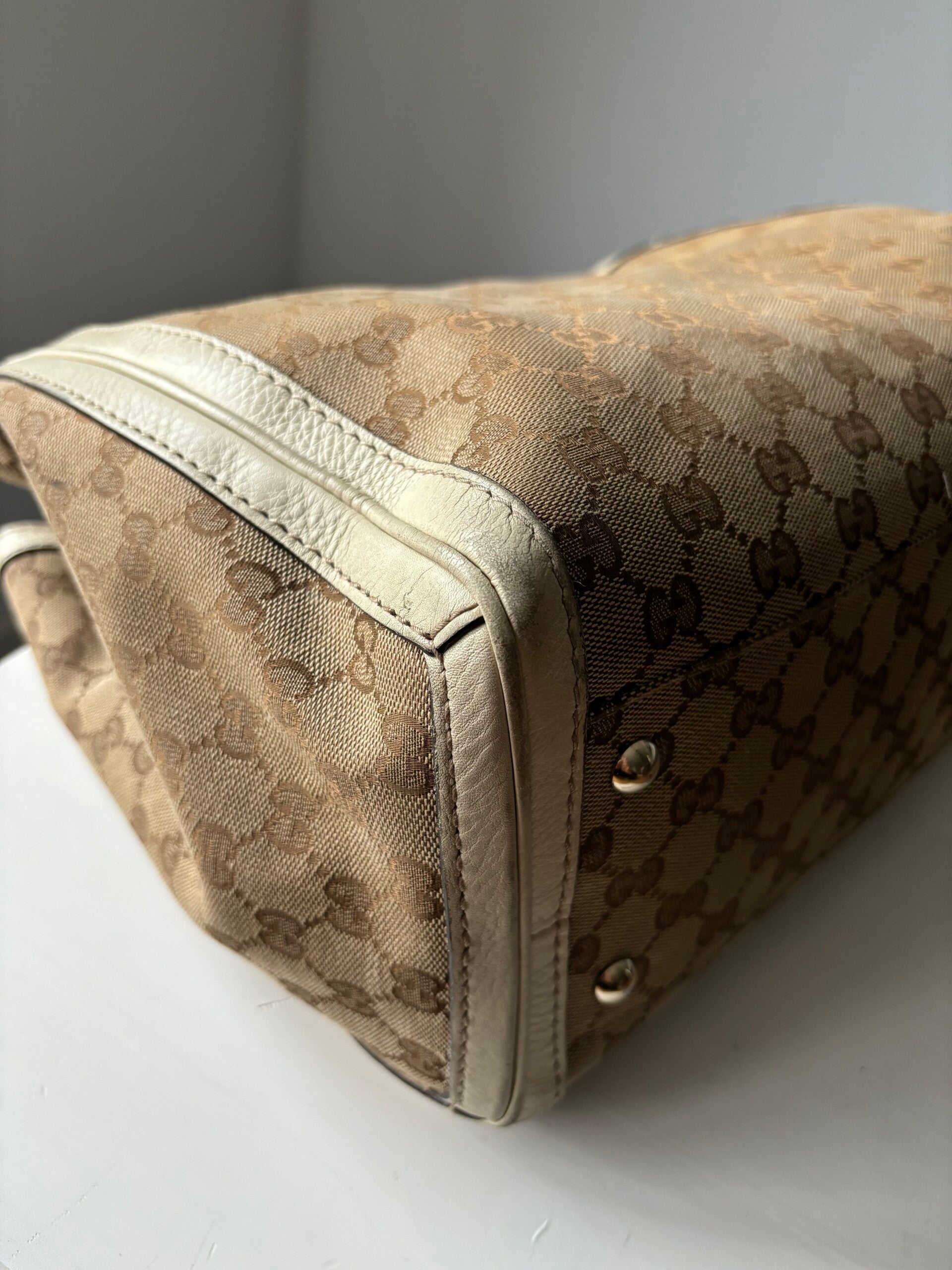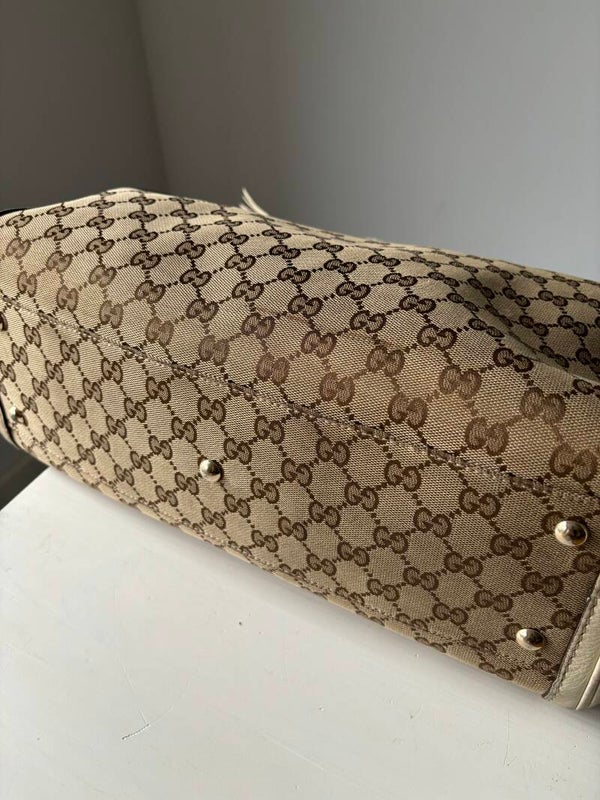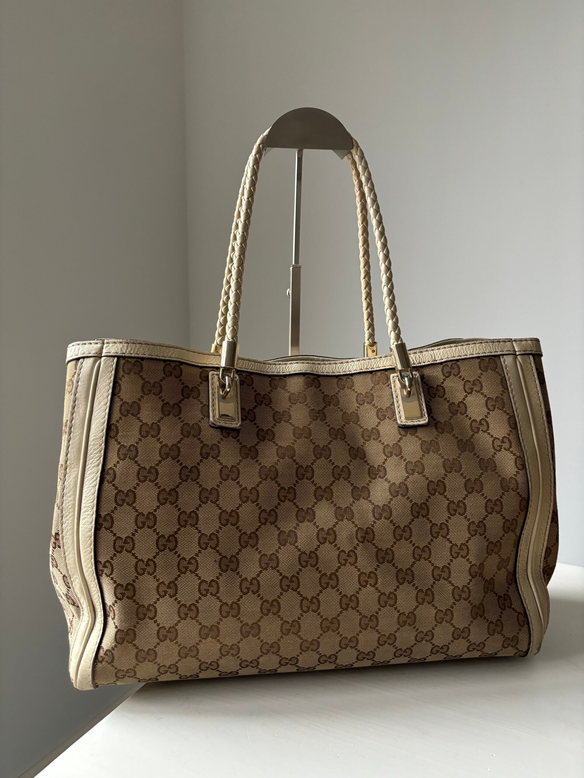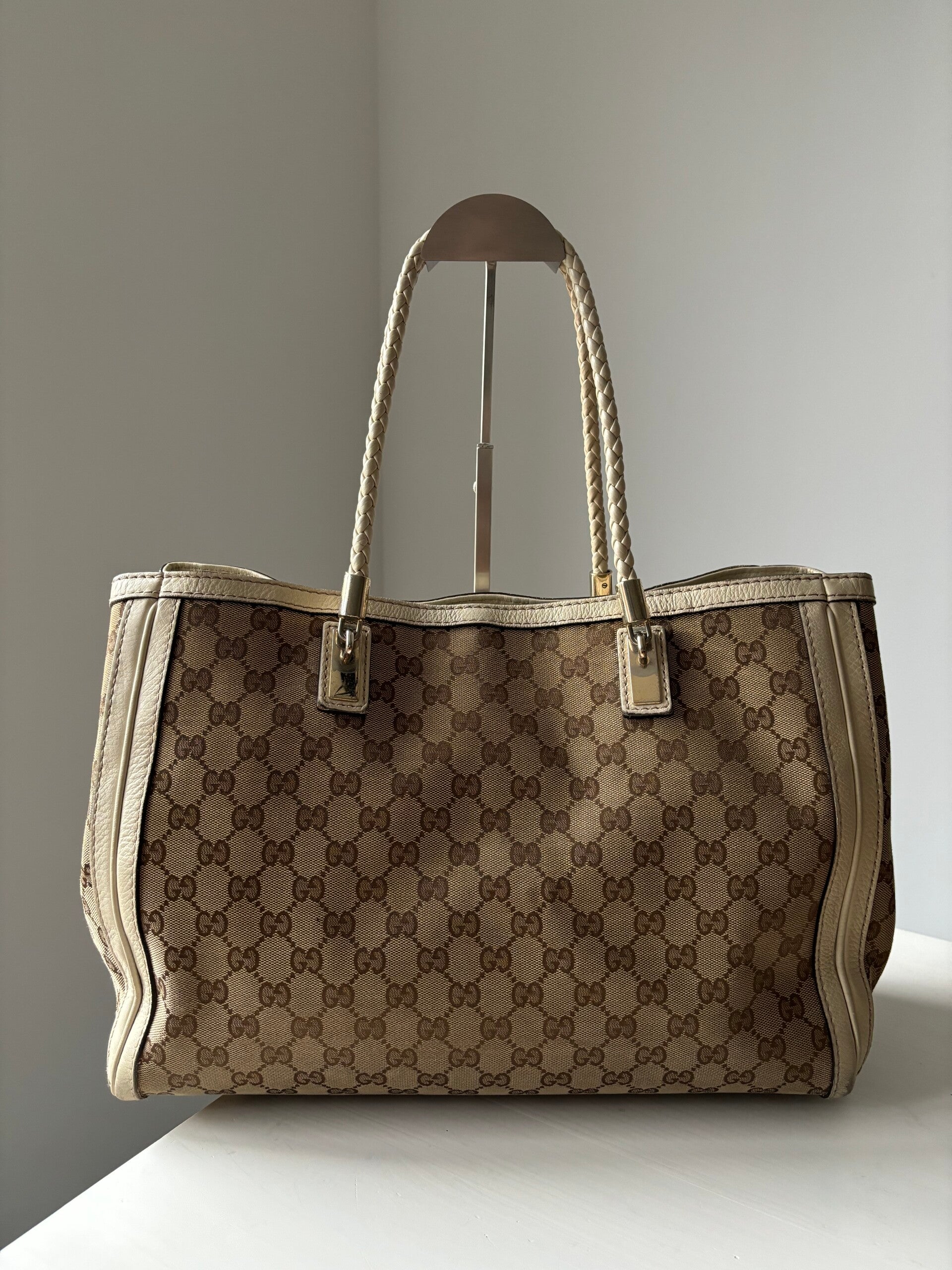 Gucci monogram tote in goede staat. Kan over de schouder worden gedragen. Past een laptop in. De afmetingen zijn ongeveer 40 x 25 cm. Komt inclusief Veggel Vintage certificaat van authenticiteit.