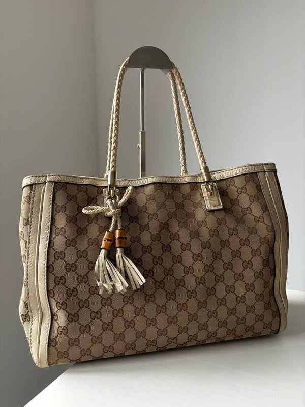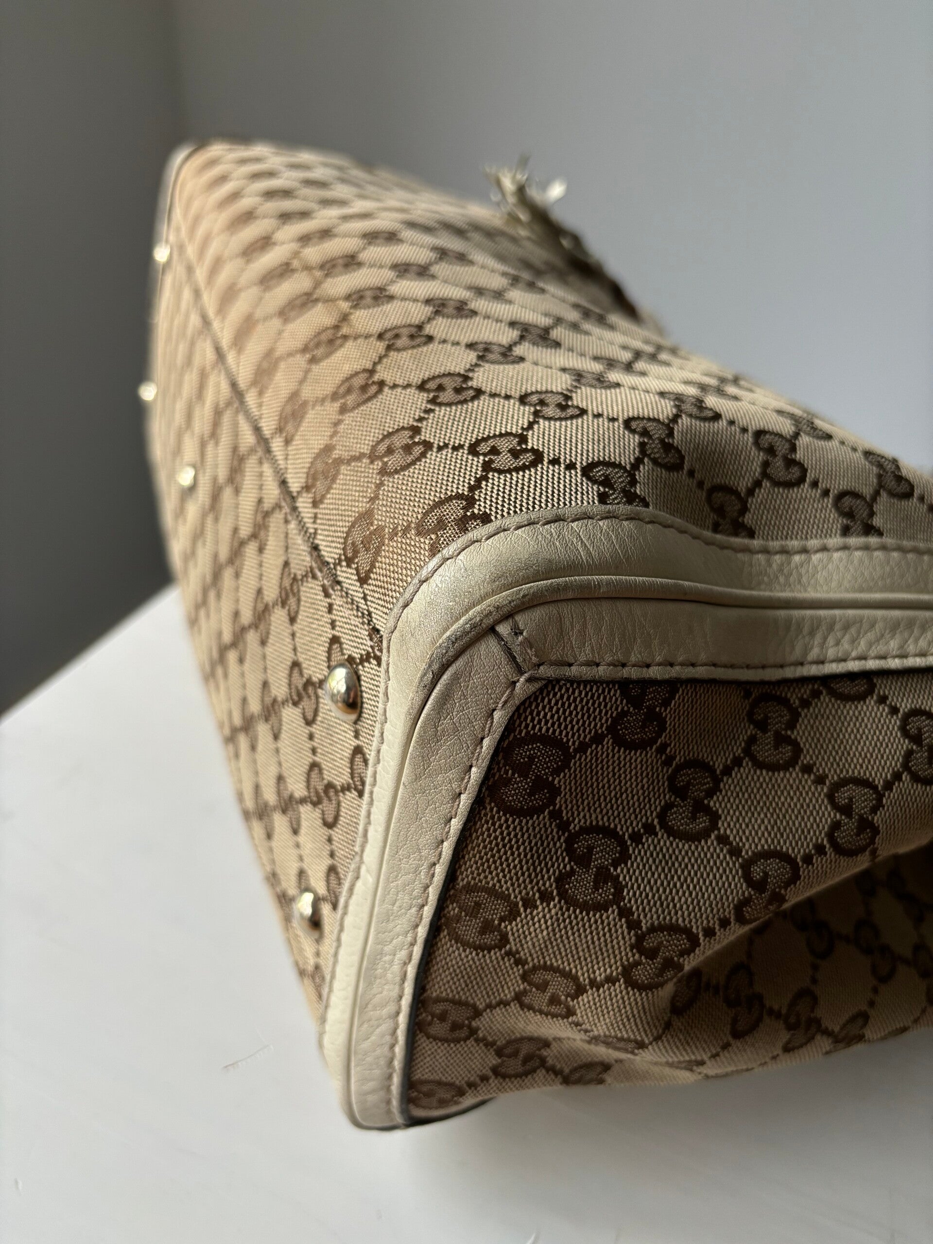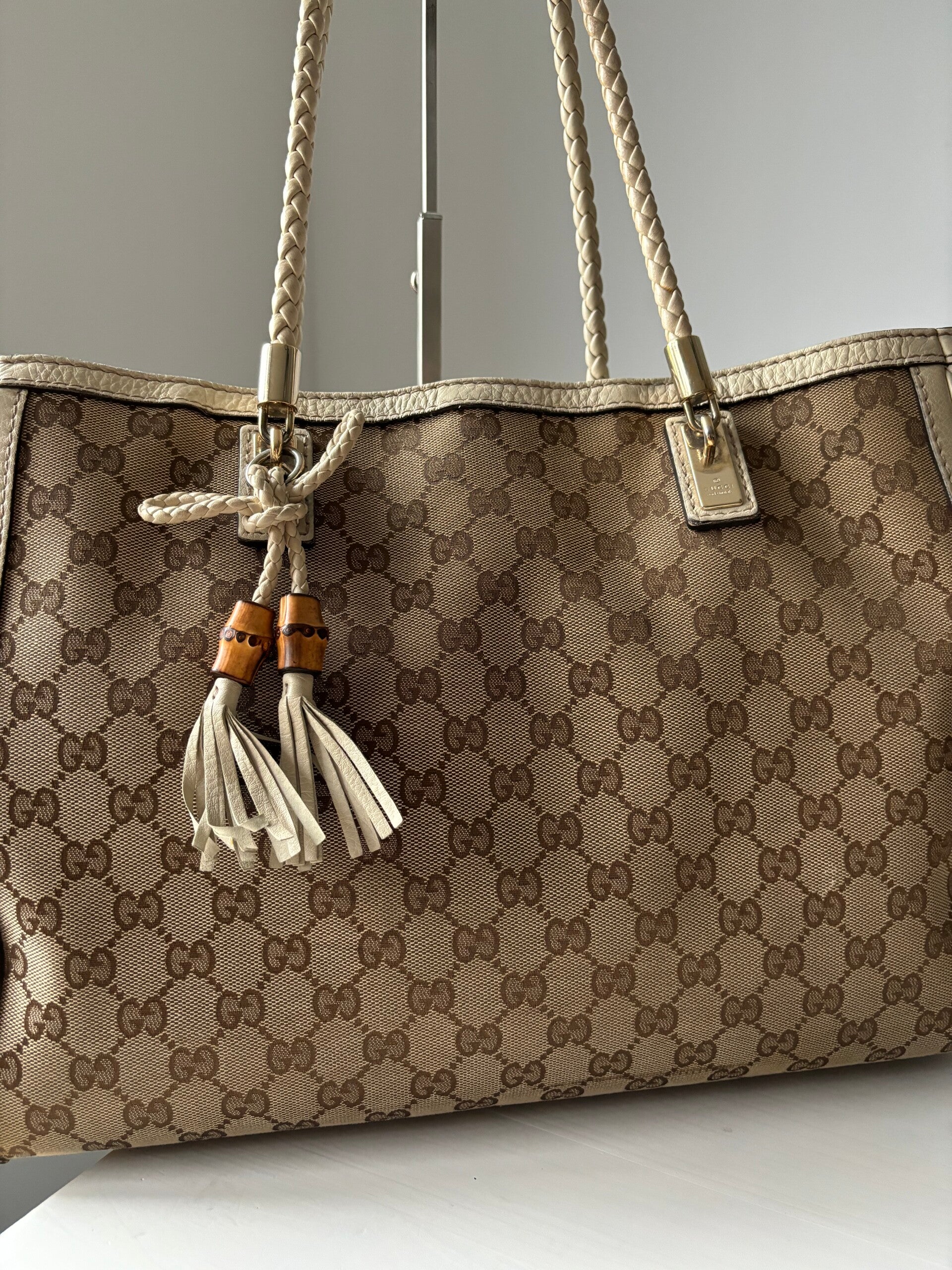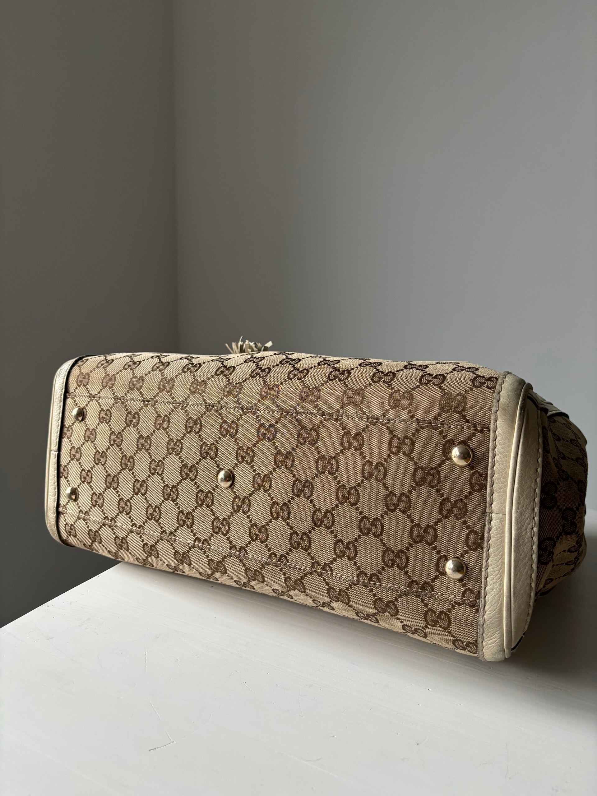 Gucci monogram tote in goede staat. Kan over de schouder worden gedragen. Past een laptop in. De afmetingen zijn ongeveer 40 x 25 cm. Komt inclusief Veggel Vintage certificaat van authenticiteit.