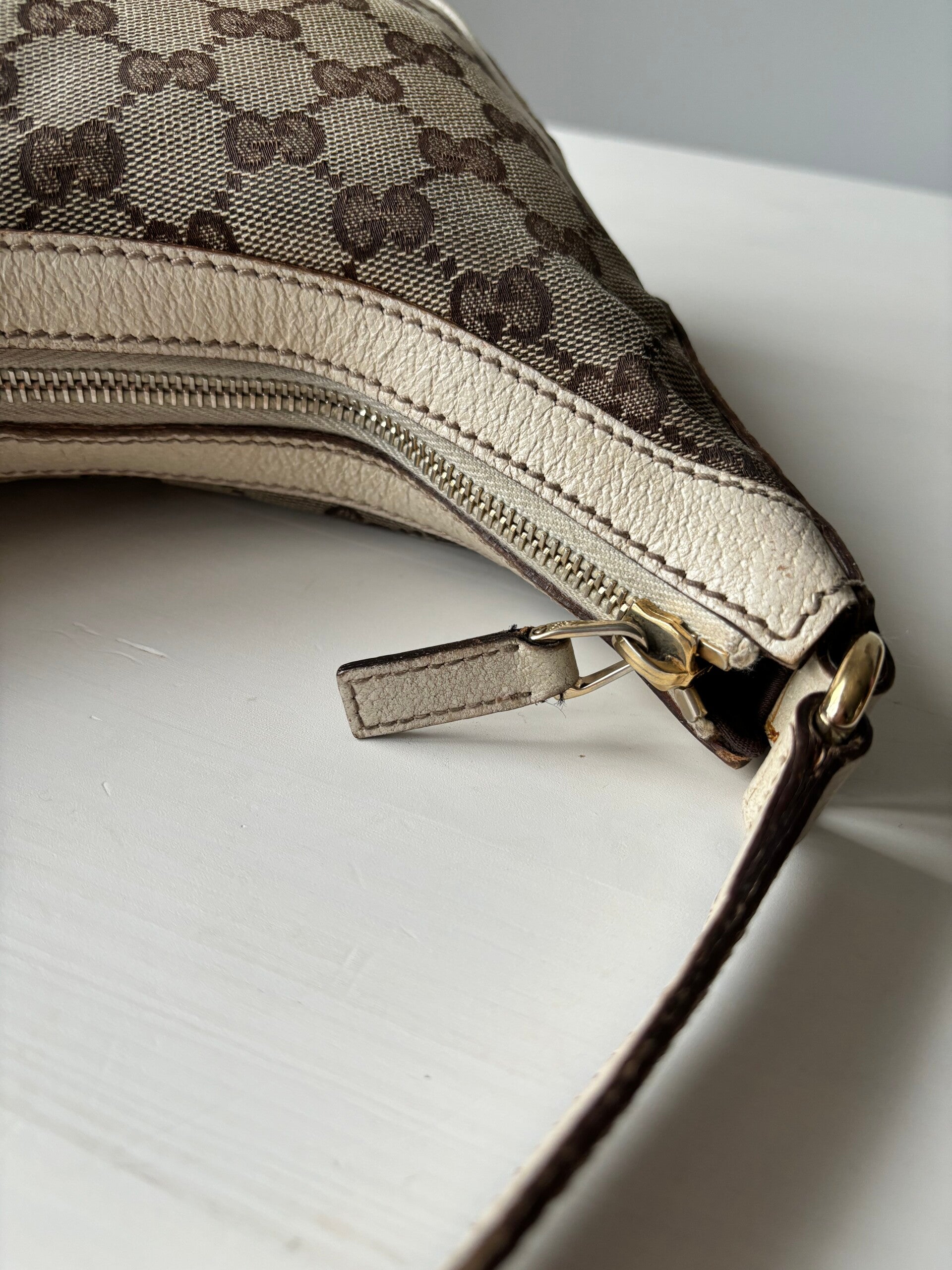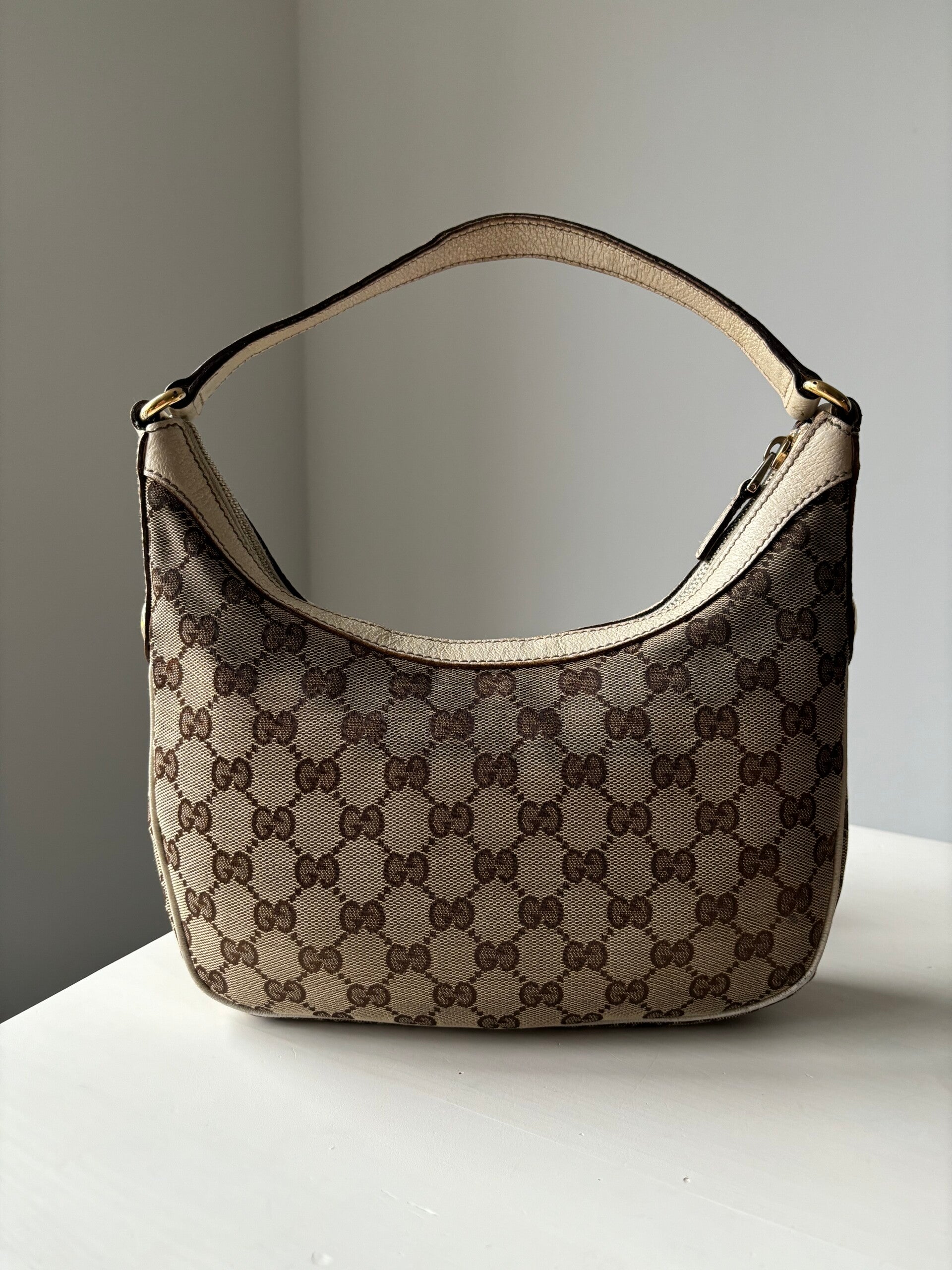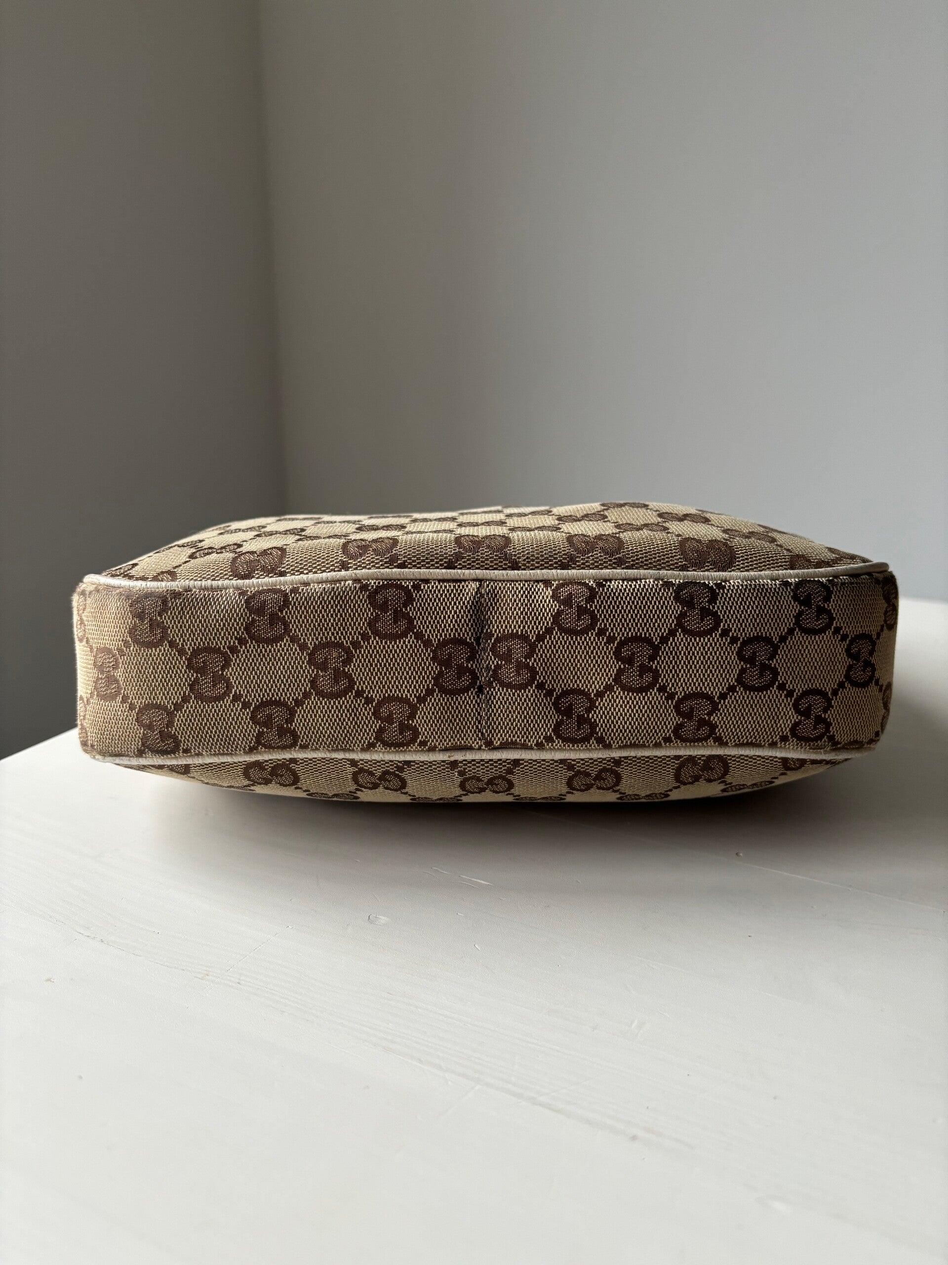 Gucci monogram schoudertas in goede staat. Tas bevat verkleuringen zoals zichtbaar op de foto's. Kan over de schouder worden gedragen. De afmetingen zijn ongeveer 25 x 20 cm. Komt inclusief Veggel Vintage certificaat van authenticiteit en Veggel Vintage dustbag.