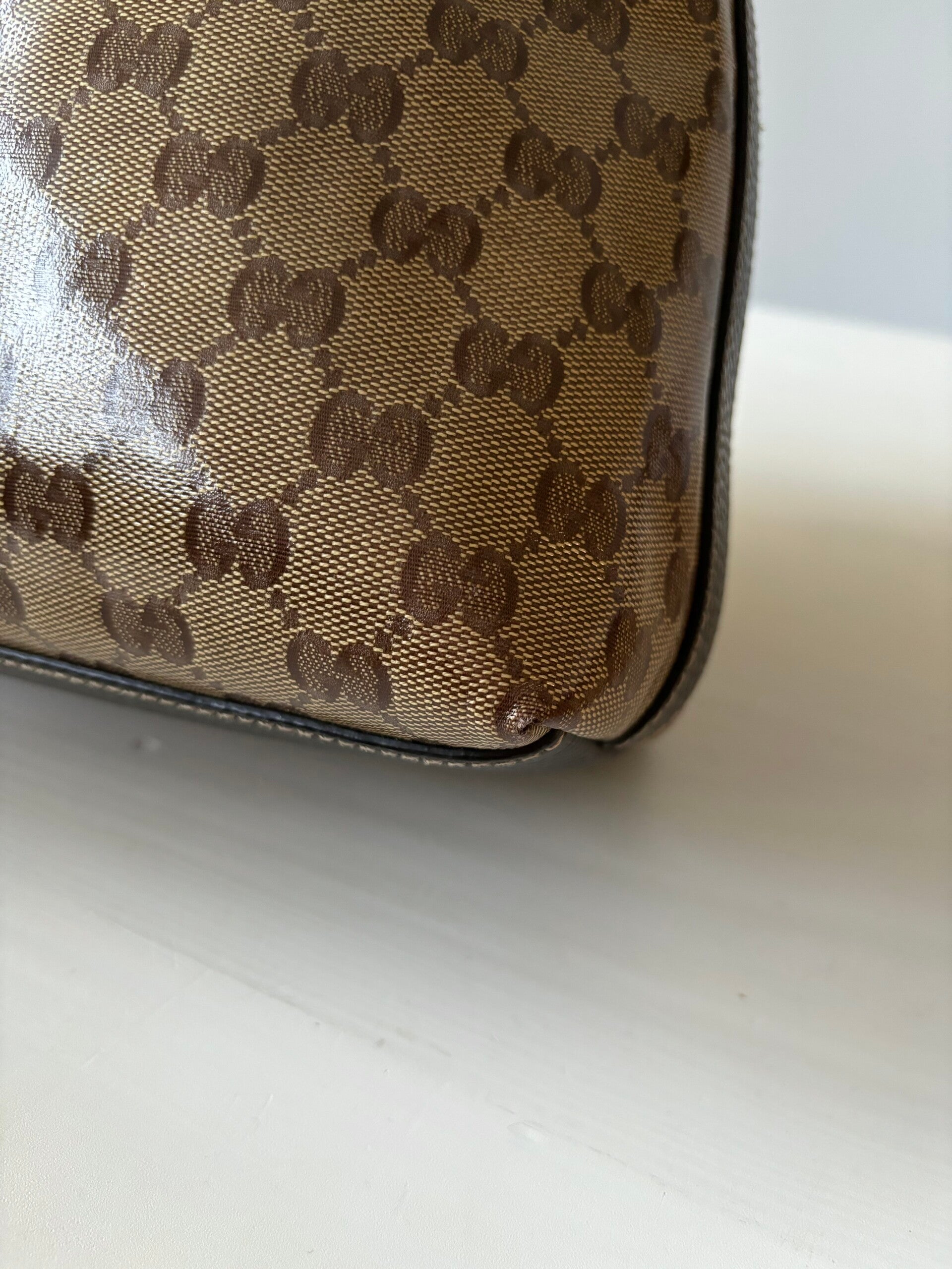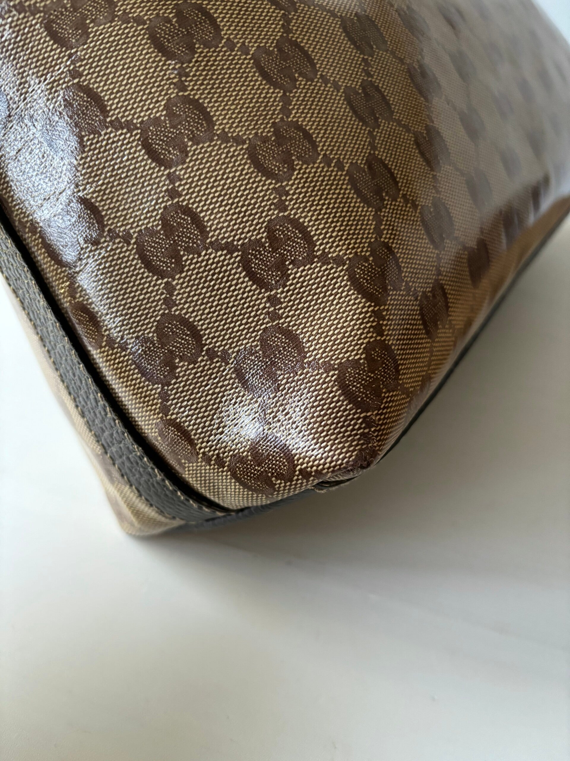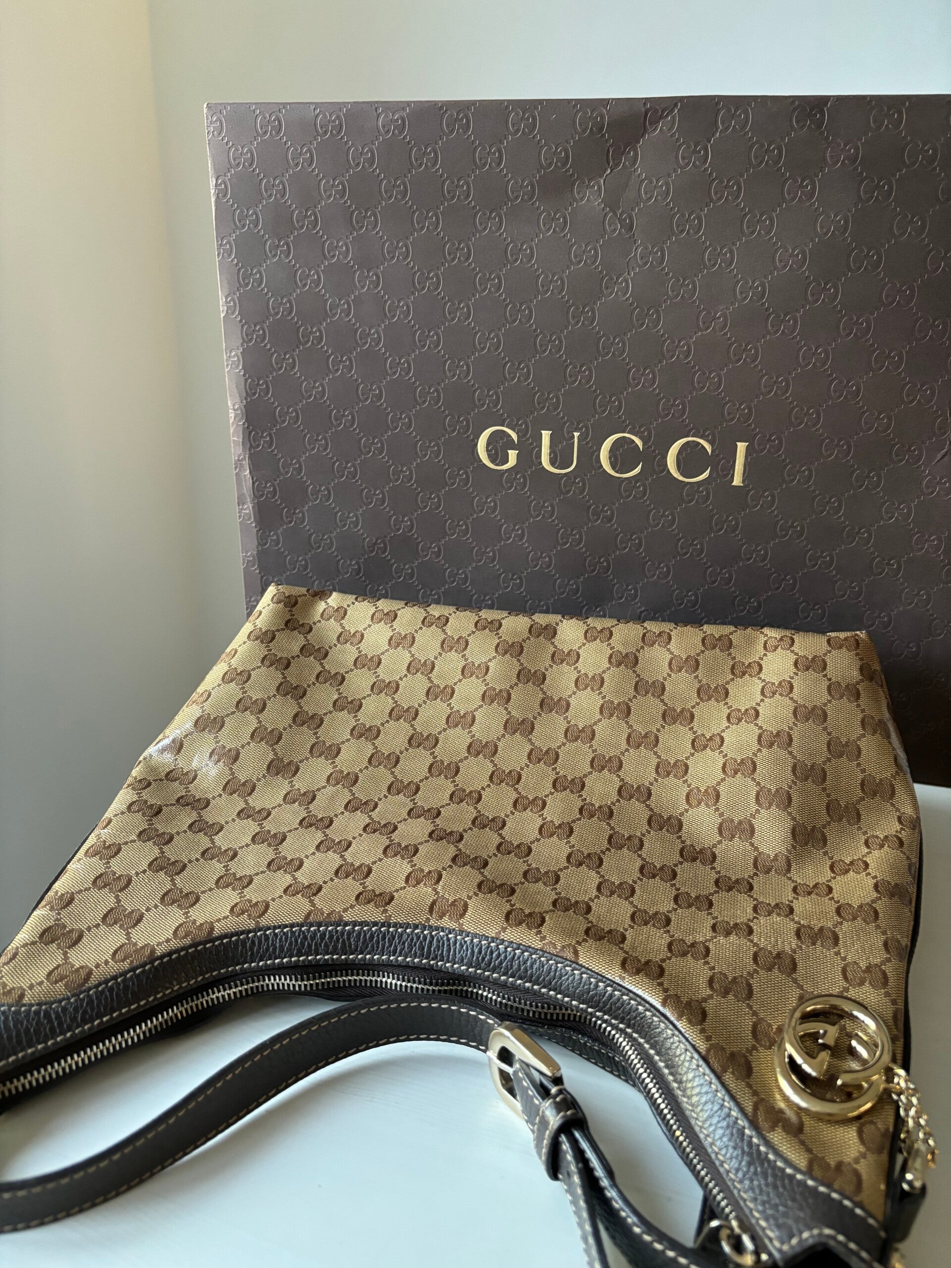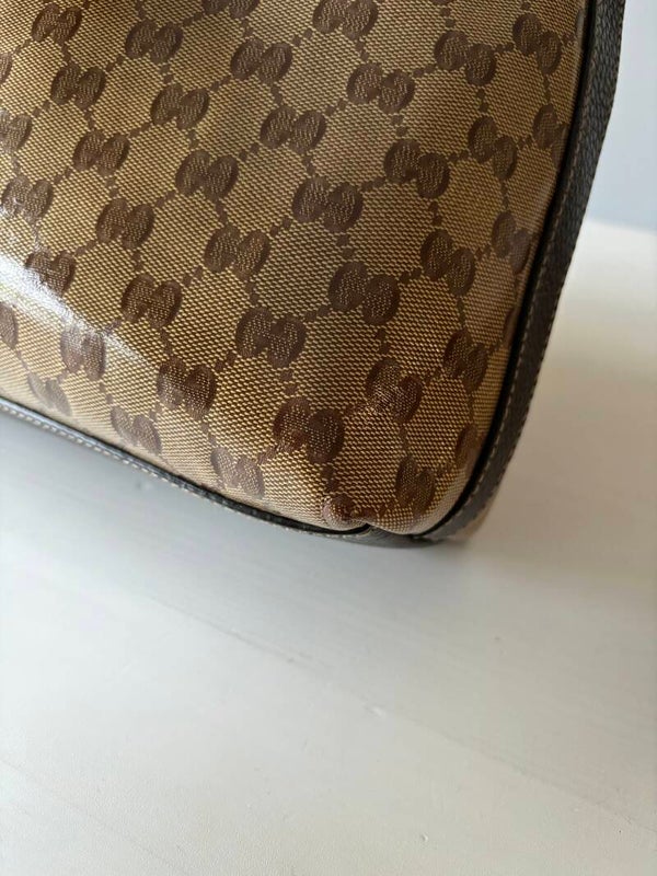 Gucci monogram hobo in perfecte staat. De tas kan over de schouder worden gedragen. Er past een laptop in. De afmetingen zijn ongeveer 35 x 32 cm exclusief strap. Komt inclusief Veggel Vintage certificaat van authenticiteit en Gucci doos.