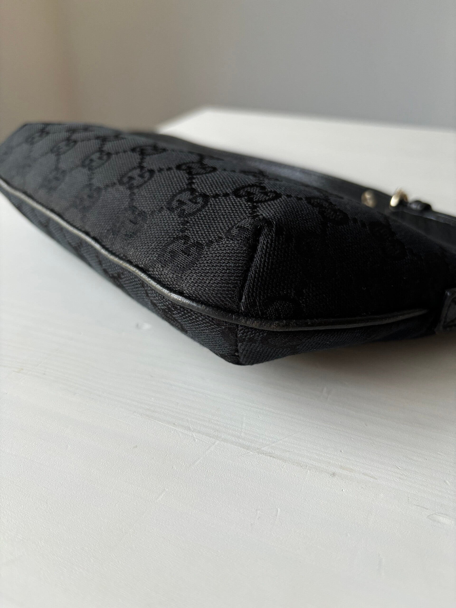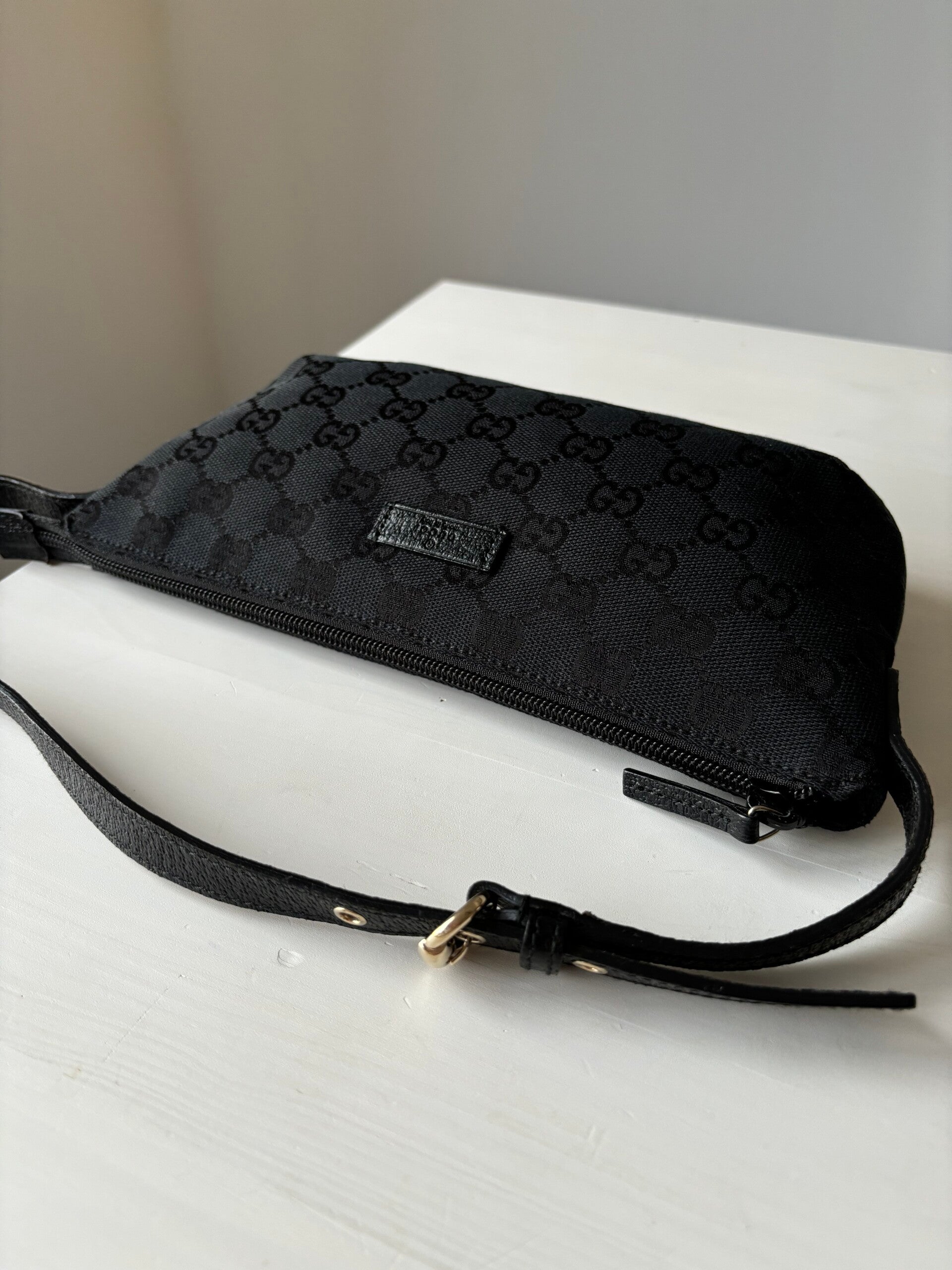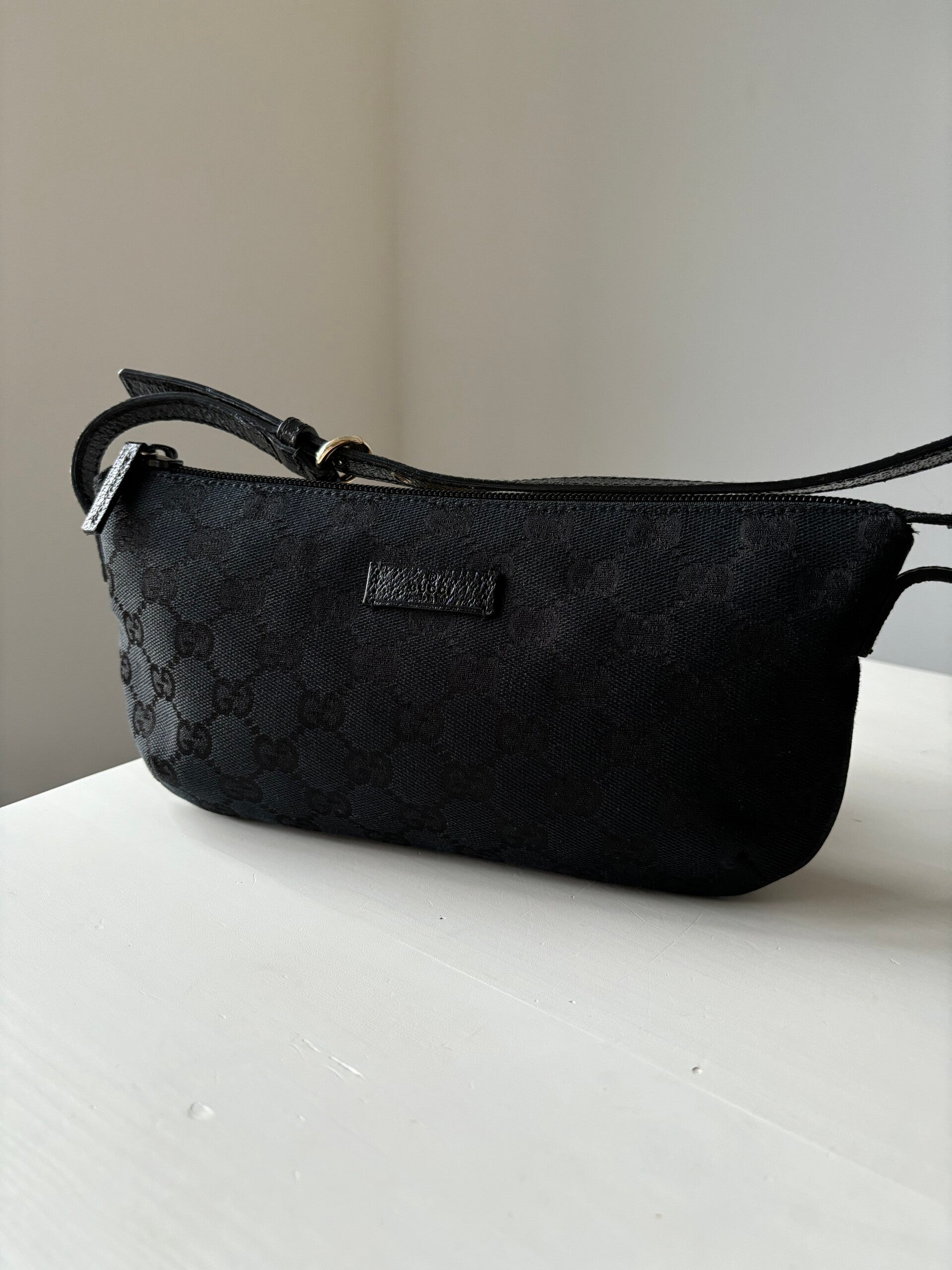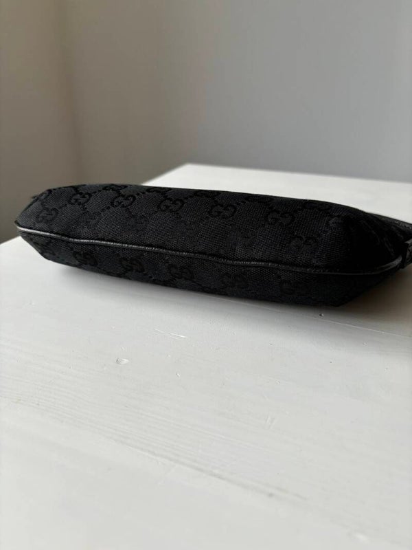 Gucci monogram pochette in nieuwstaat. Kan over de schouder worden gedragen. De afmetingen zijn ongeveer 25 x 13 cm. Komt inclusief Veggel Vintage certificaat van authenticiteit en Veggel Vintage dustbag.