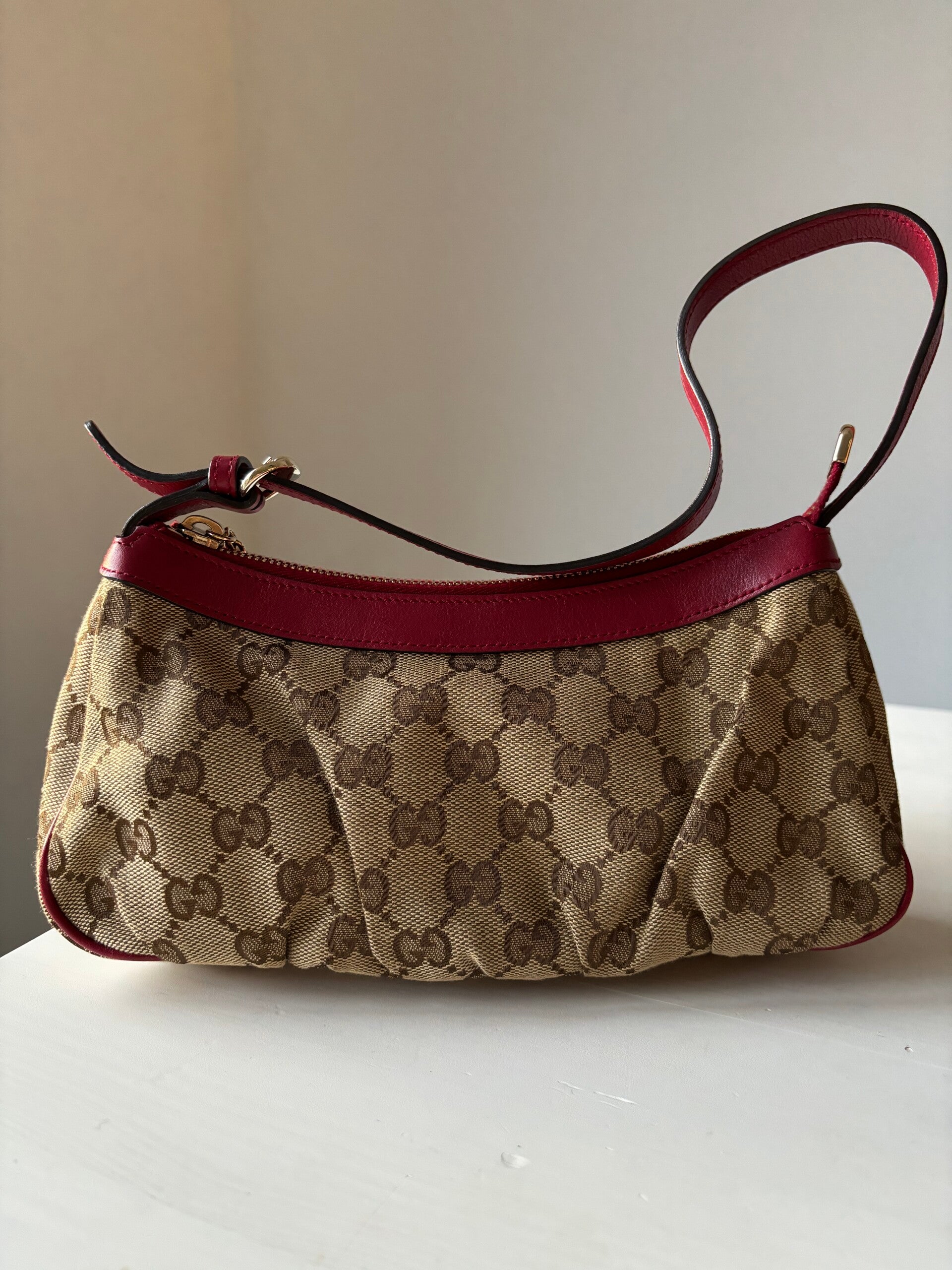 Gucci monogram pochette in nieuwstaat. Kan over de schouder worden gedragen. De afmetingen zijn ongeveer 24 x 12 cm. Komt inclusief Veggel Vintage certificaat van authenticiteit en Veggel Vintage dustbag.