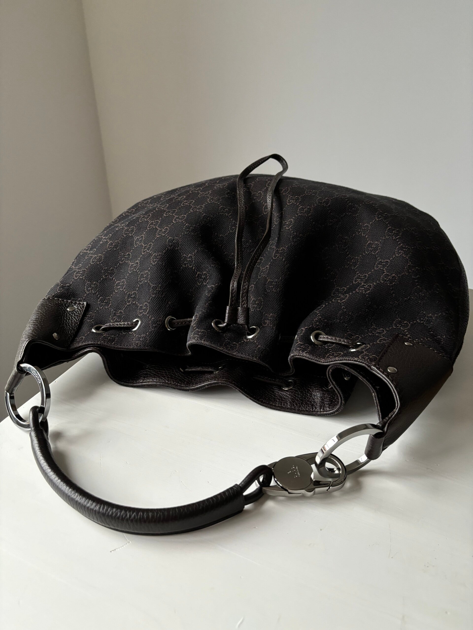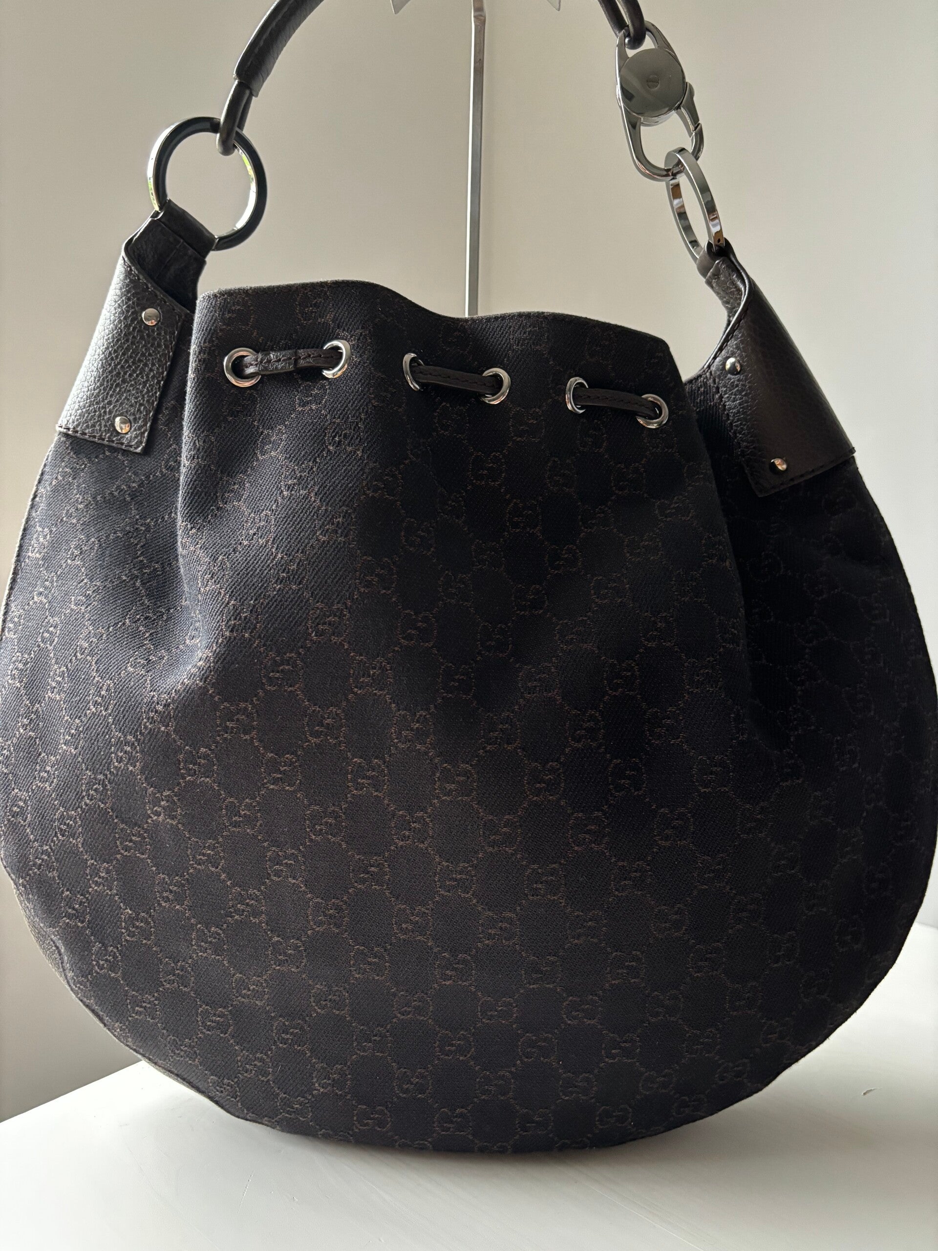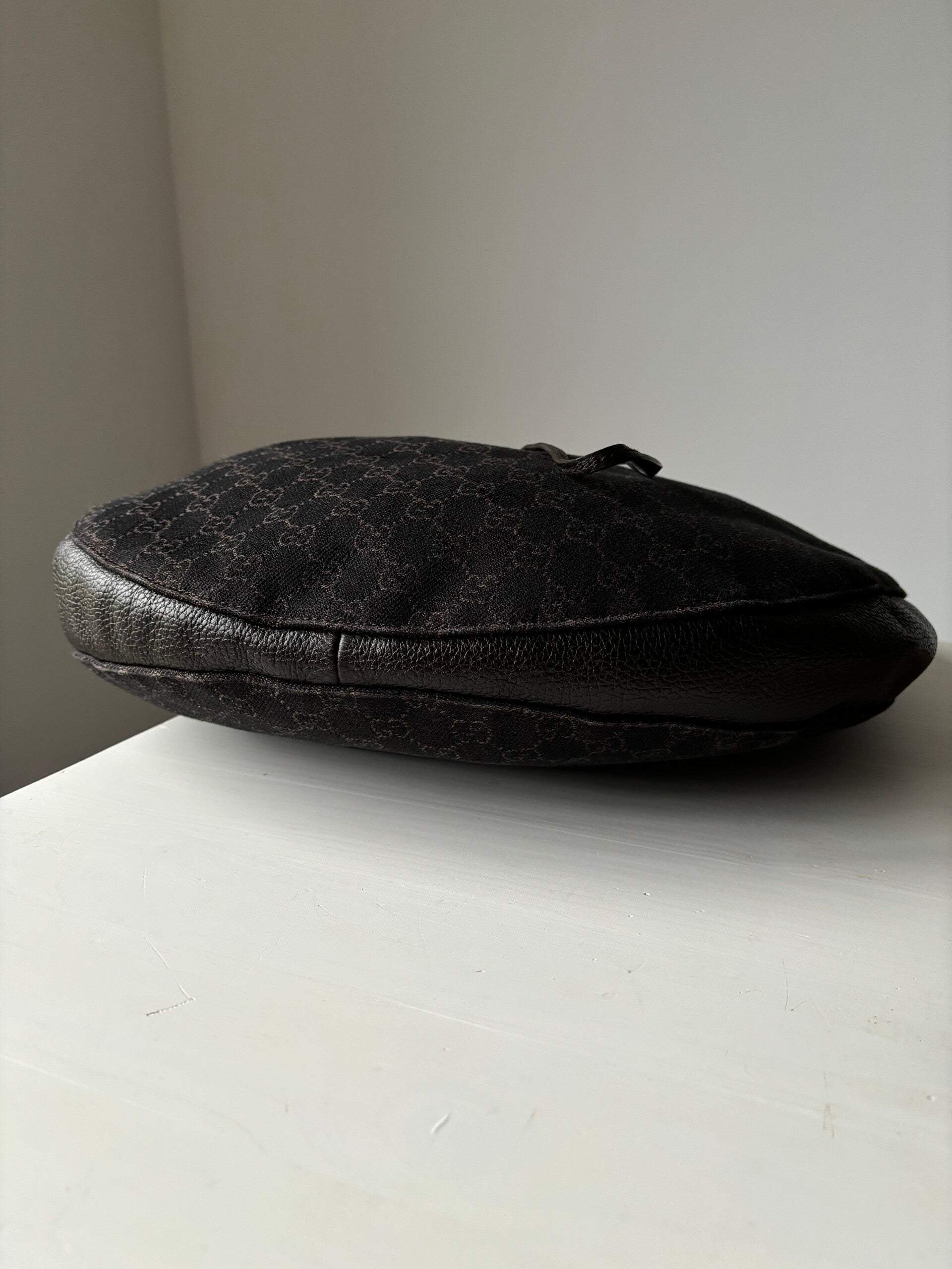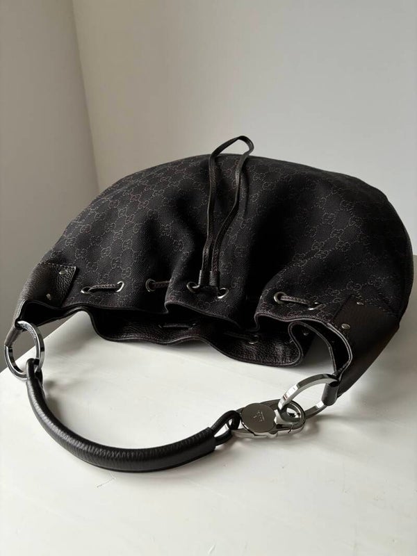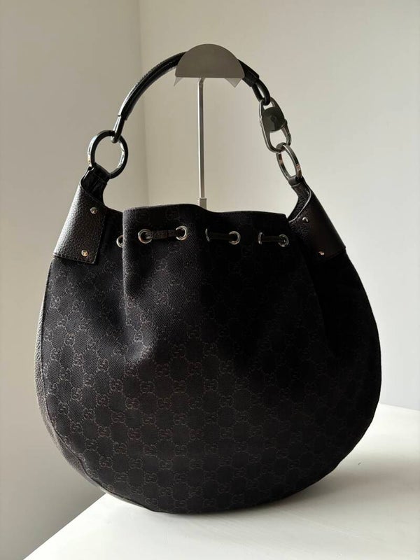 Gucci monogram schoudertas in nieuwstaat. Kan over de schouder worden gedragen. Past een laptop in. De afmetingen zijn ongeveer 40 x 32 cm. Komt inclusief Veggel Vintage certificaat van authenticiteit.