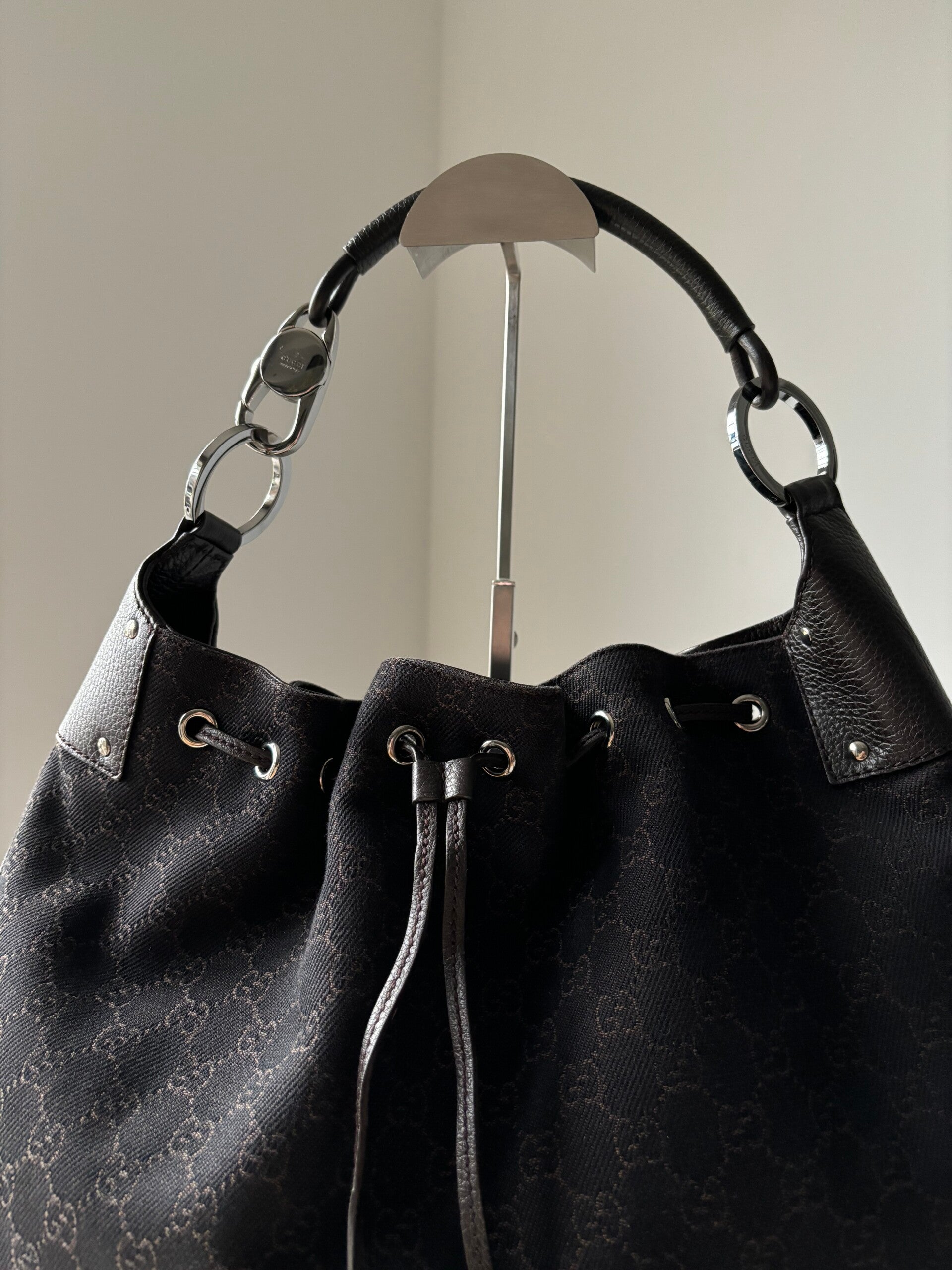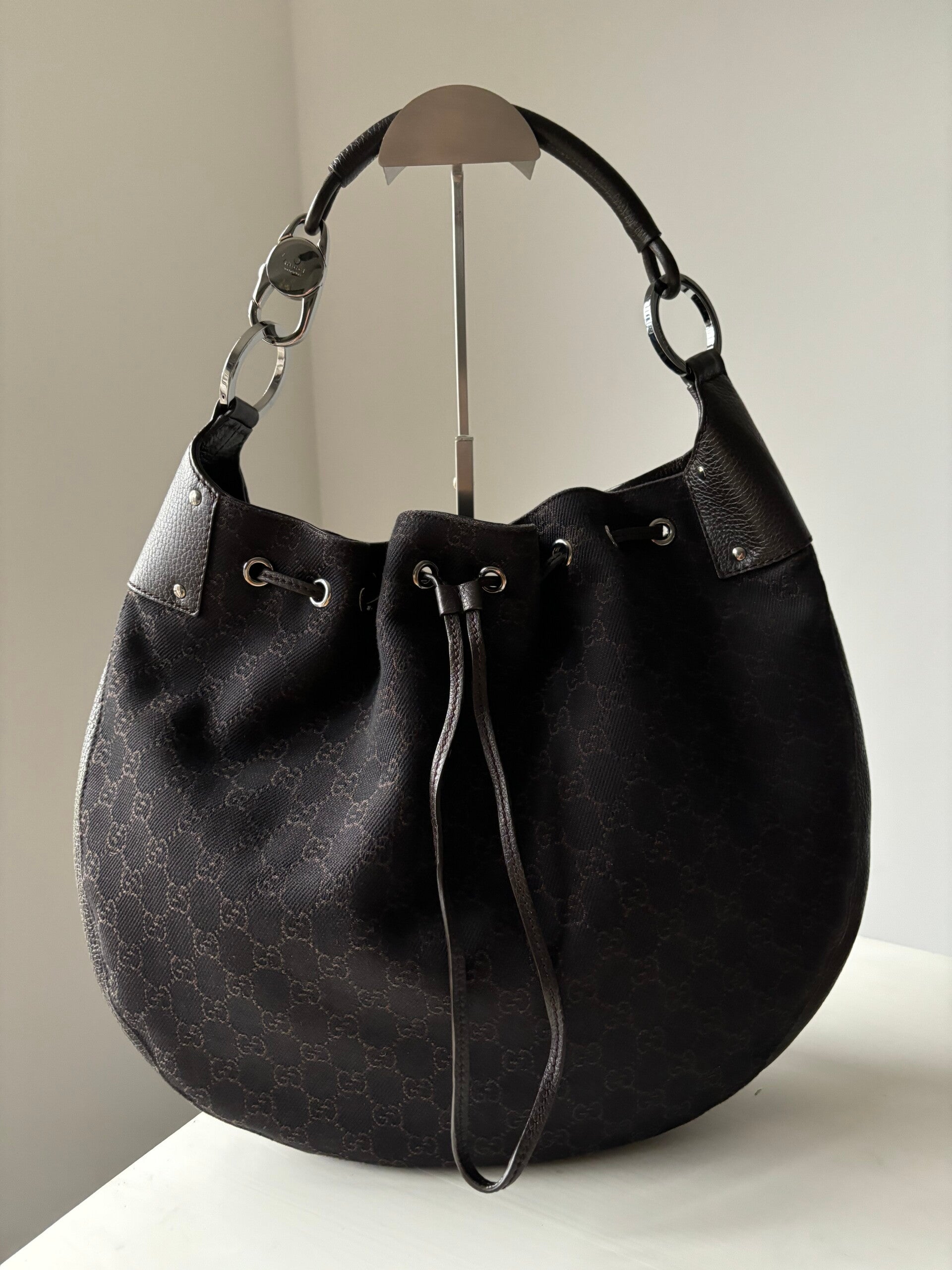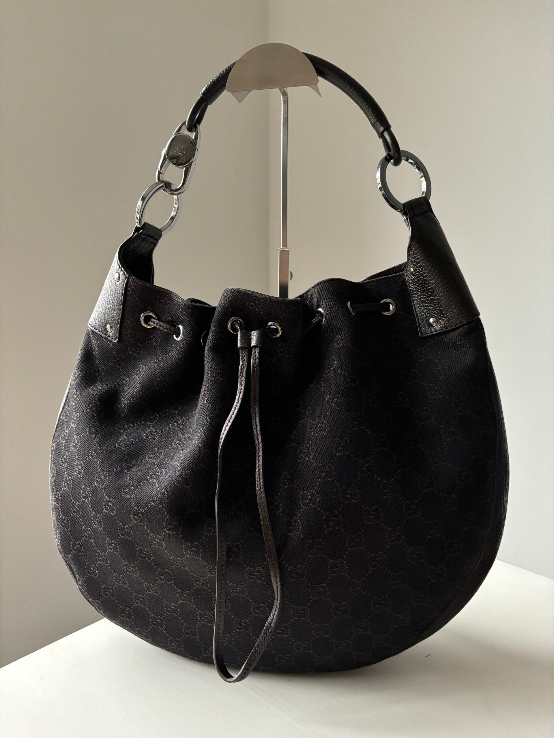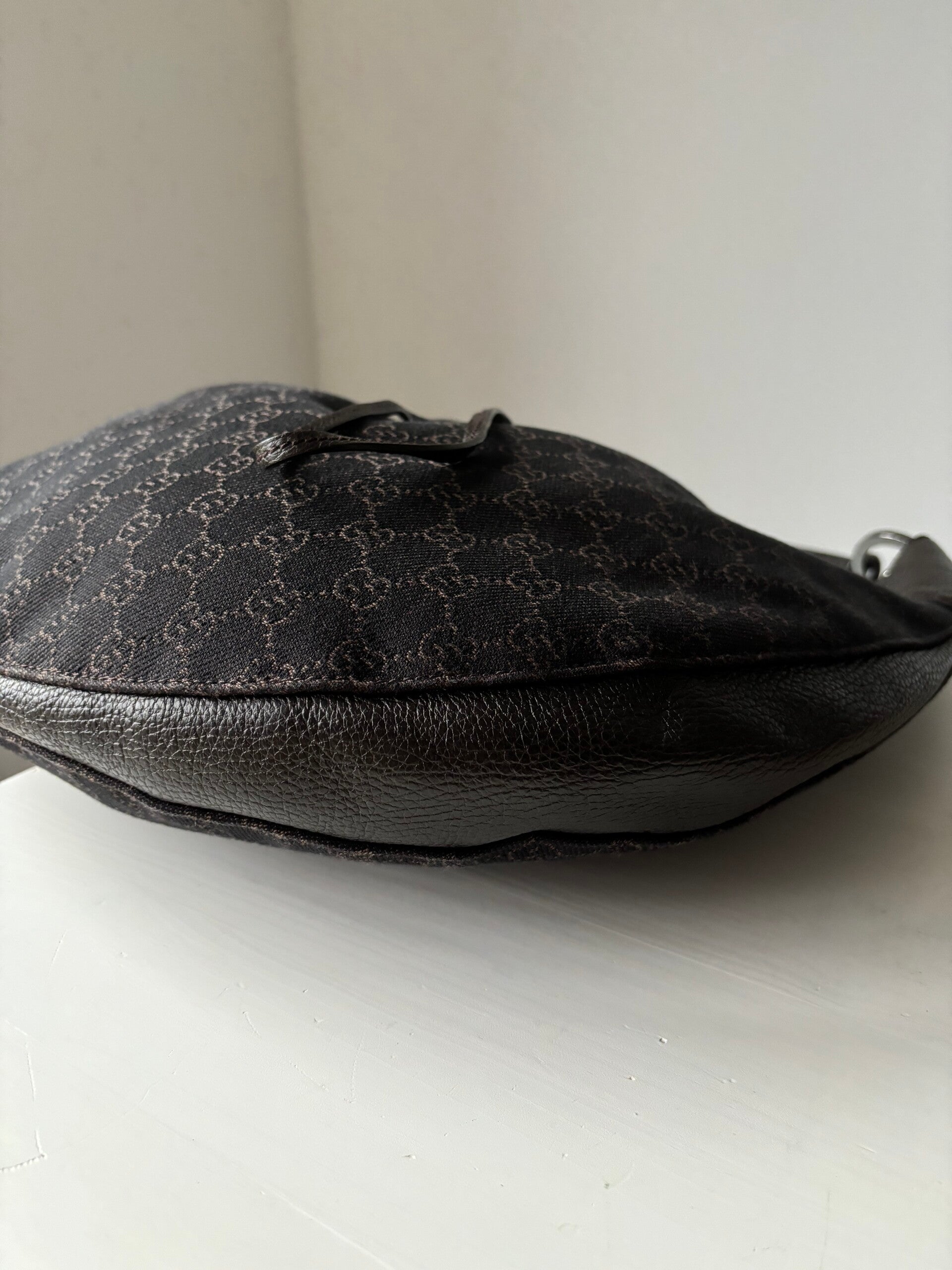 Gucci monogram schoudertas in nieuwstaat. Kan over de schouder worden gedragen. Past een laptop in. De afmetingen zijn ongeveer 40 x 32 cm. Komt inclusief Veggel Vintage certificaat van authenticiteit.