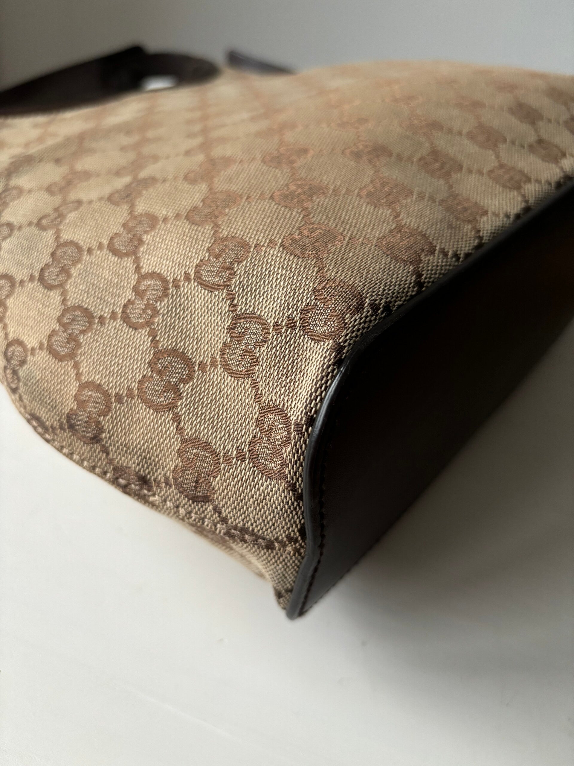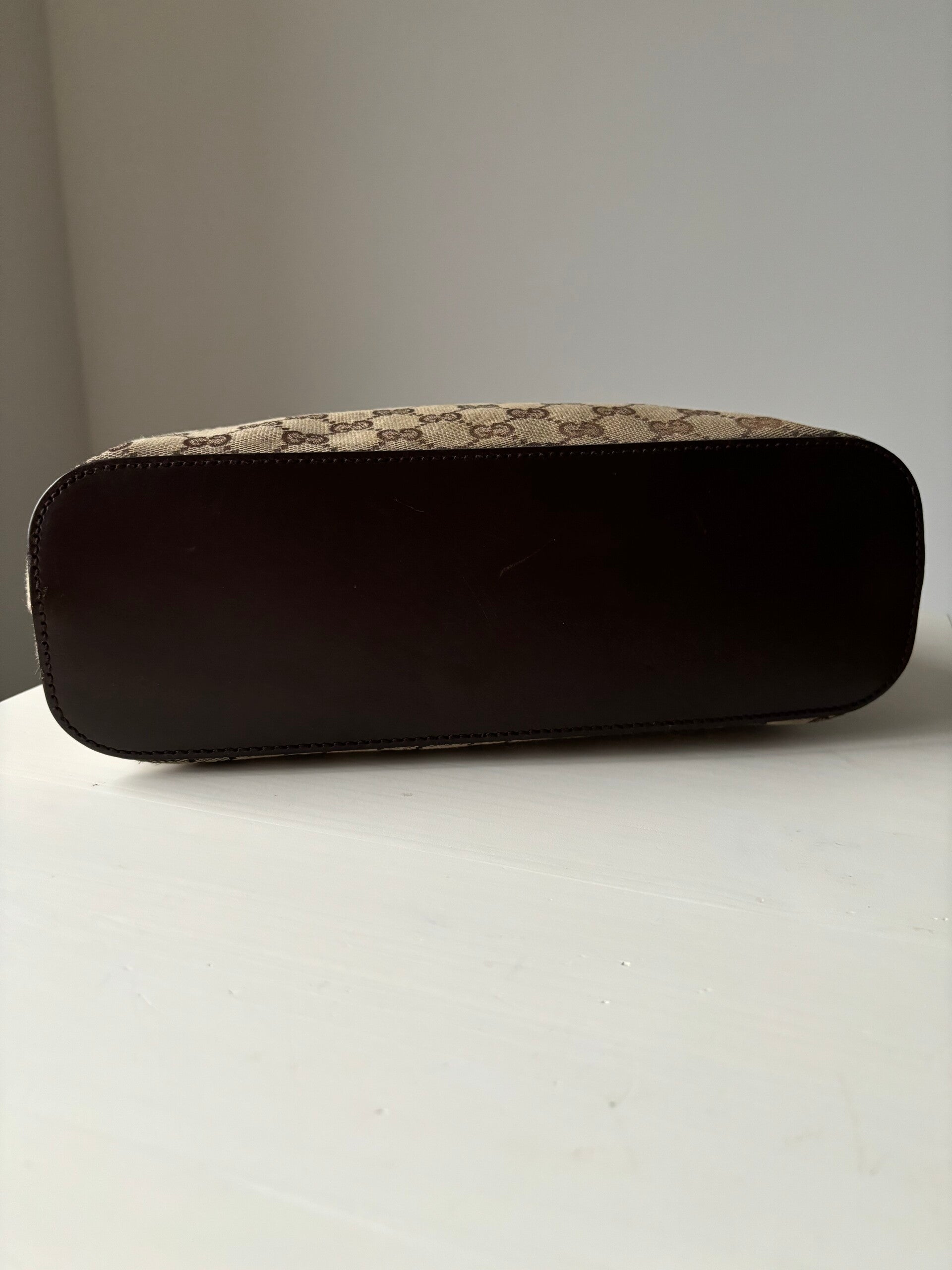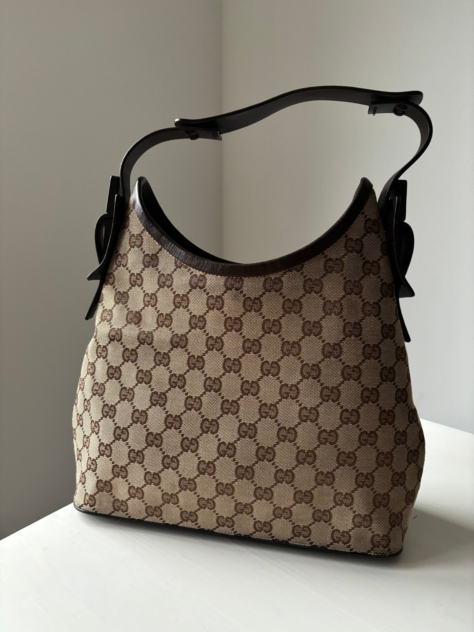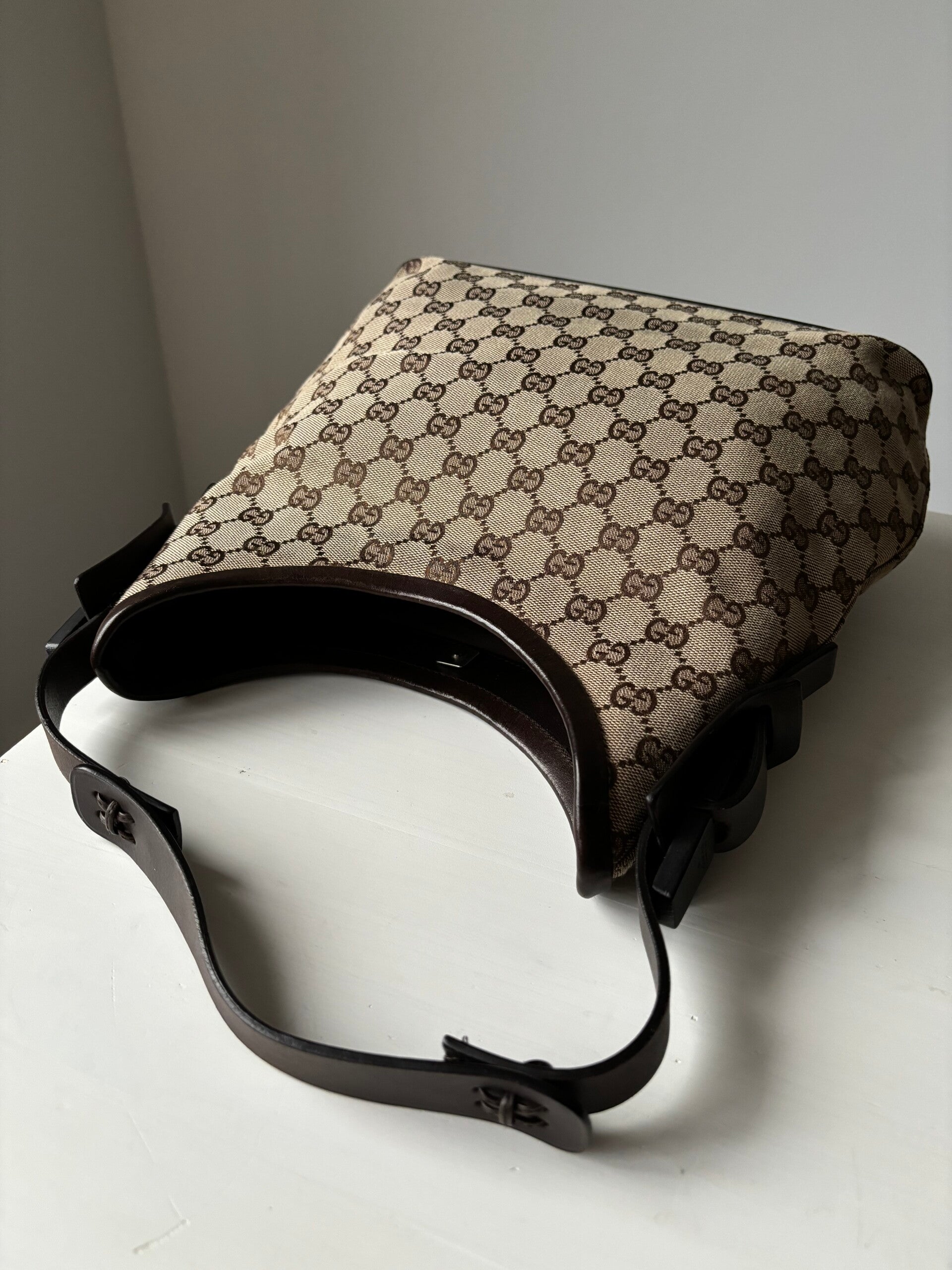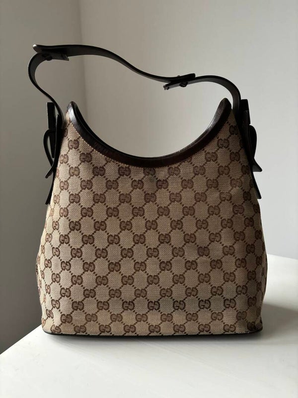 Gucci monogram schoudertas in zeer goede staat. Kan over de schouder worden gedragen. De afmetingen zijn ongeveer 30 x 27 cm exclusief strap. Komt inclusief Veggel Vintage certificaat van authenticiteit.