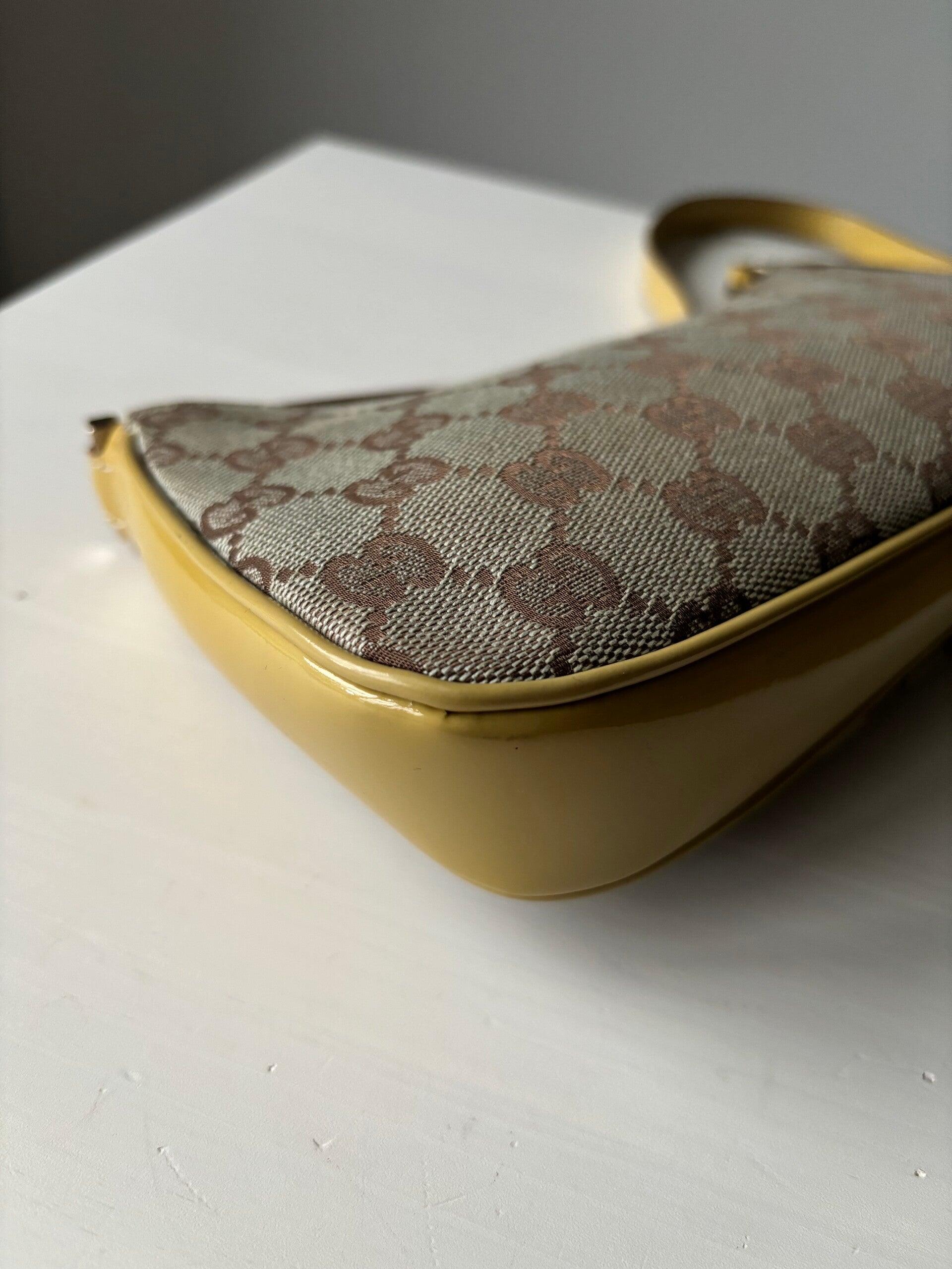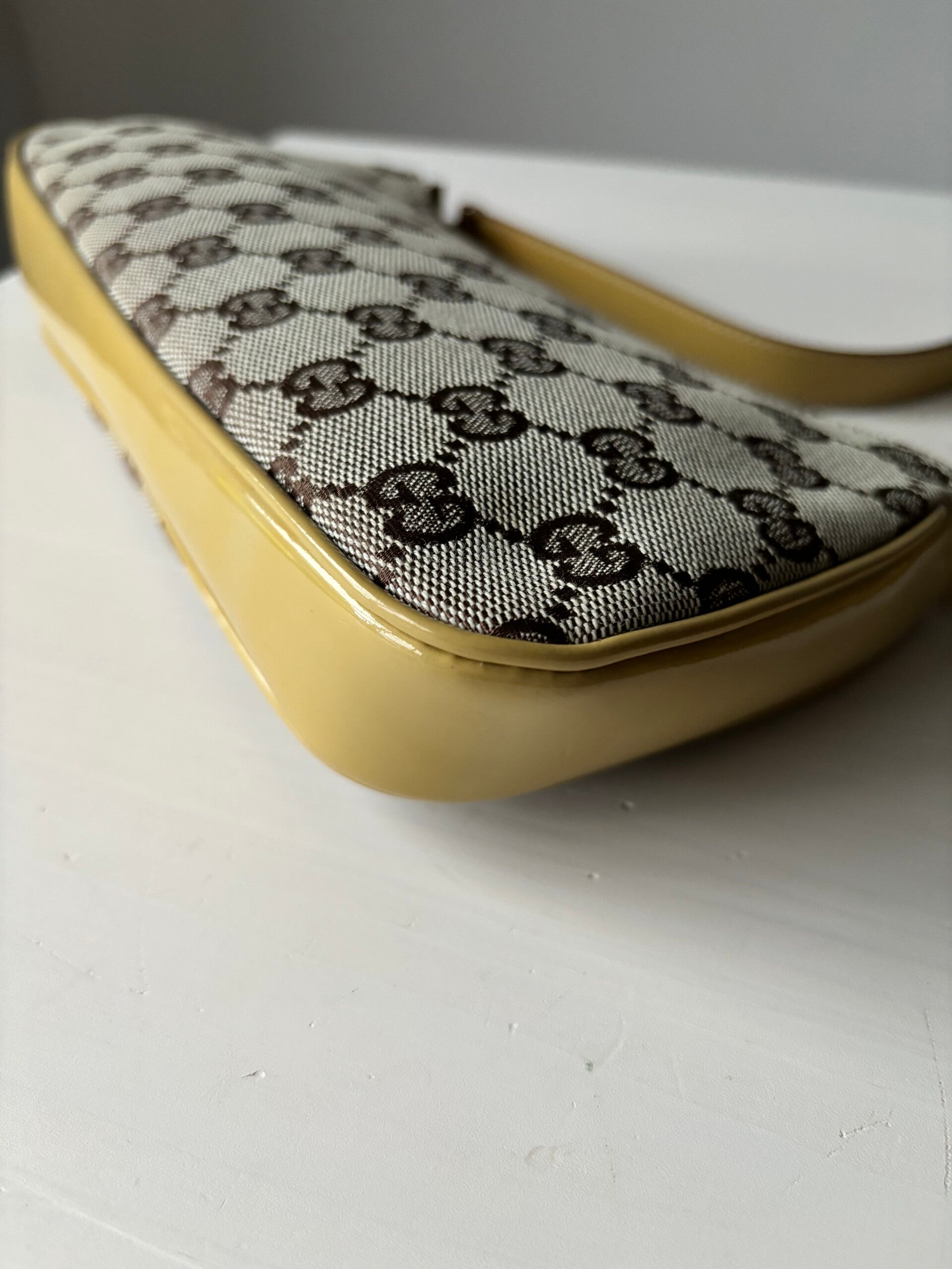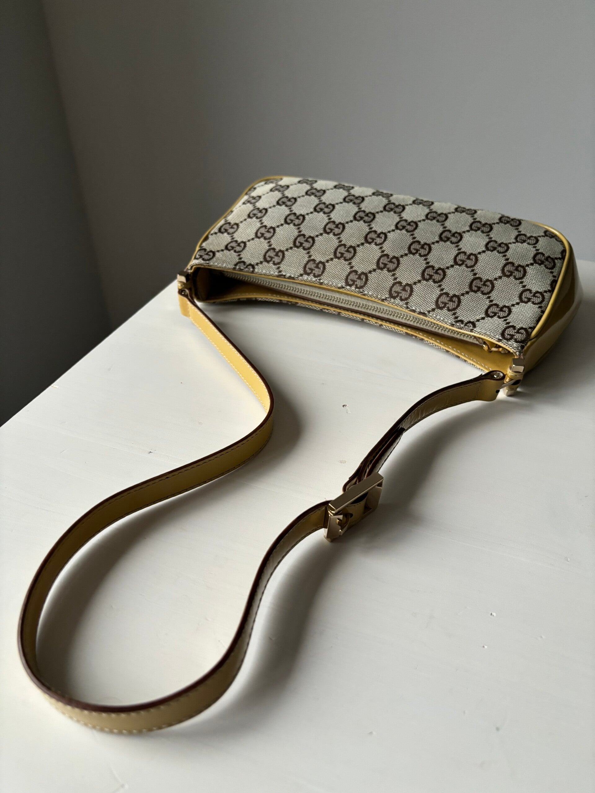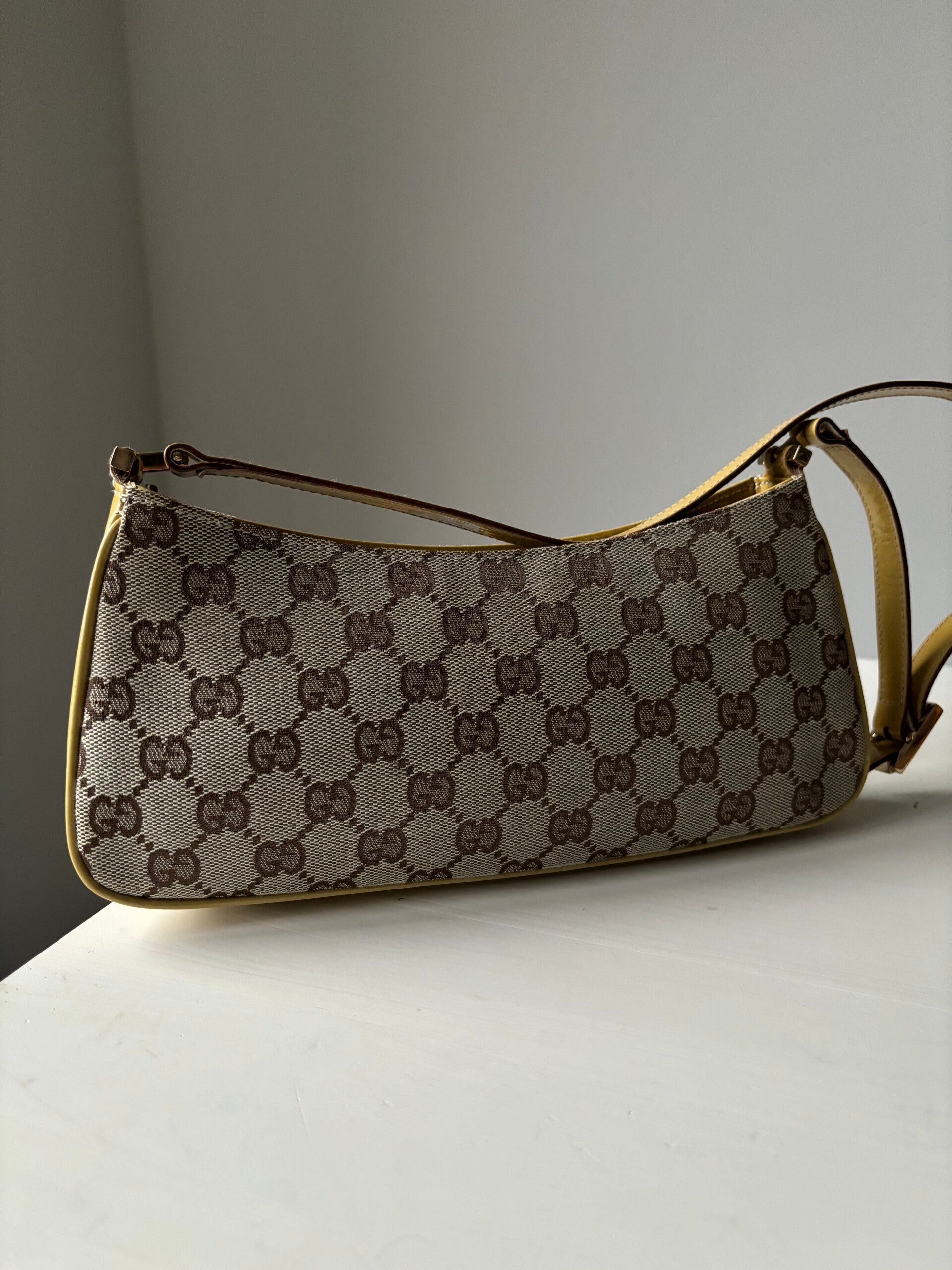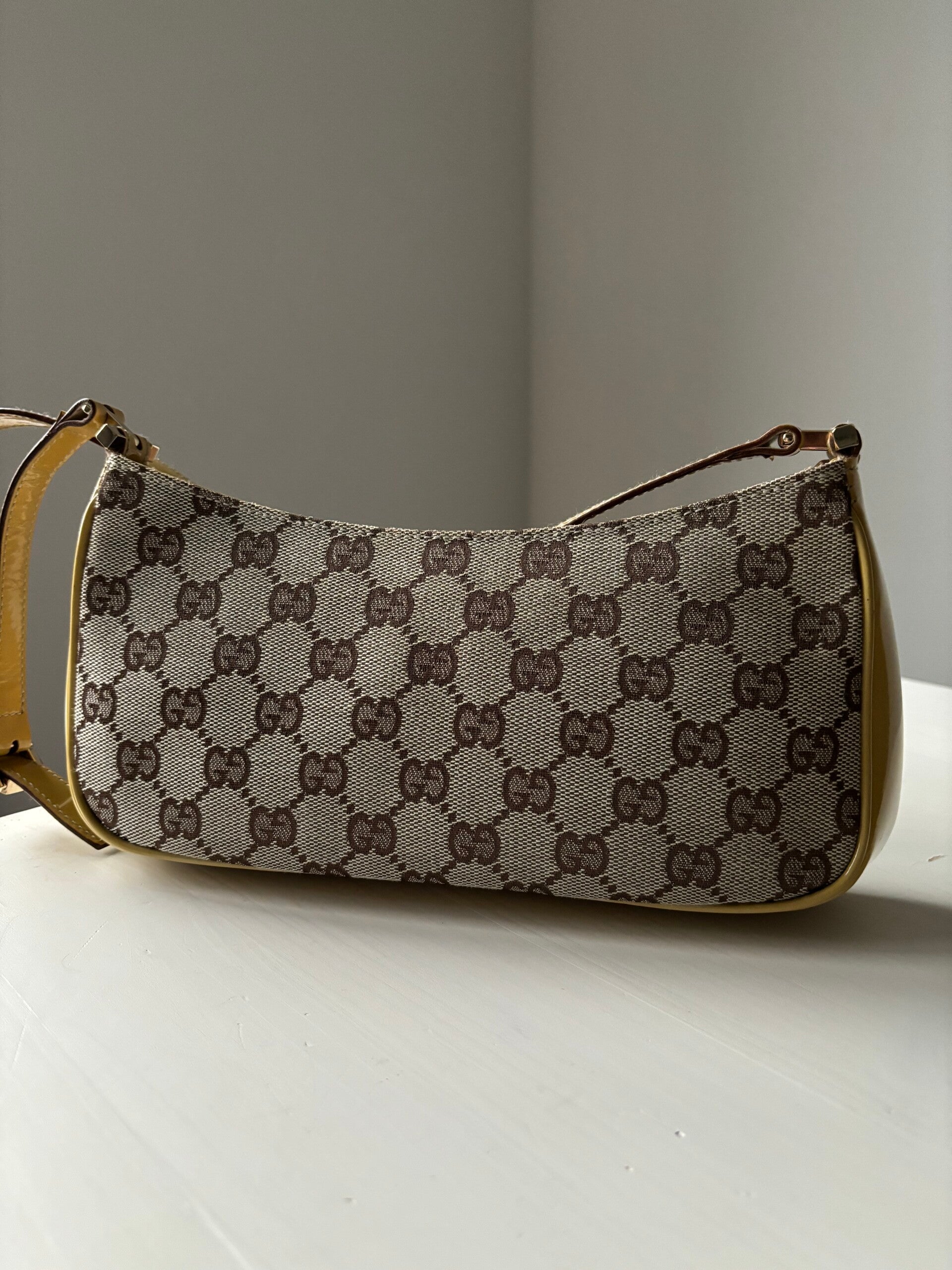 Gucci monogram pochette in perfecte staat. Kan over de schouder worden gedragen. De afmetingen zijn ongeveer 26 x 12 cm. Komt inclusief Veggel Vintage certificaat van authenticiteit en Veggel Vintage dustbag.