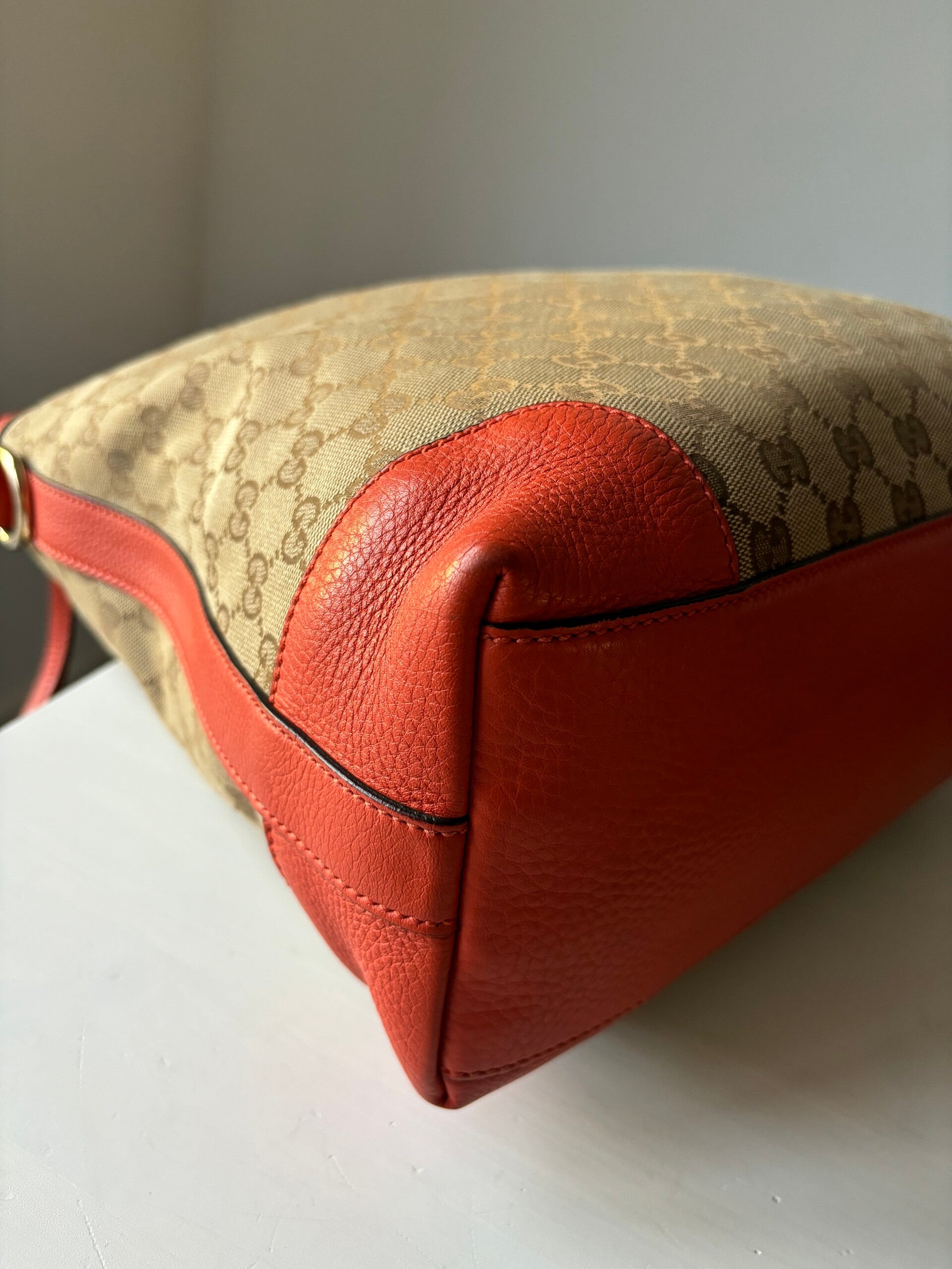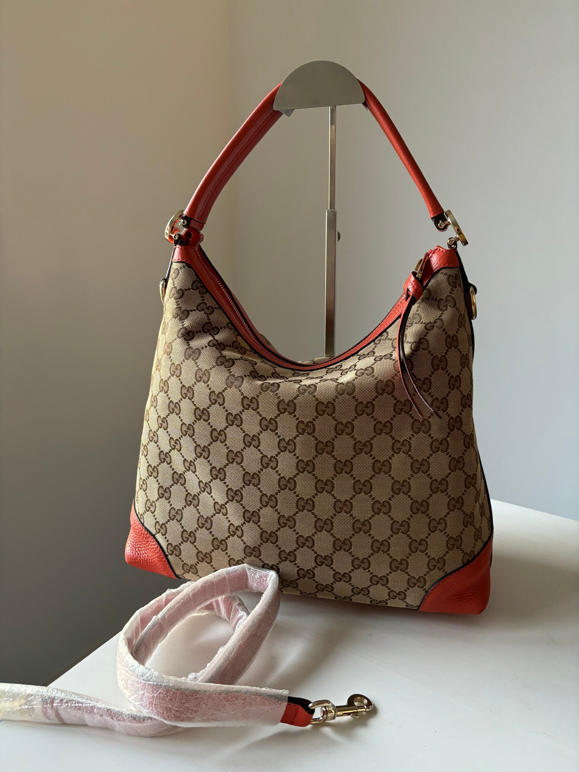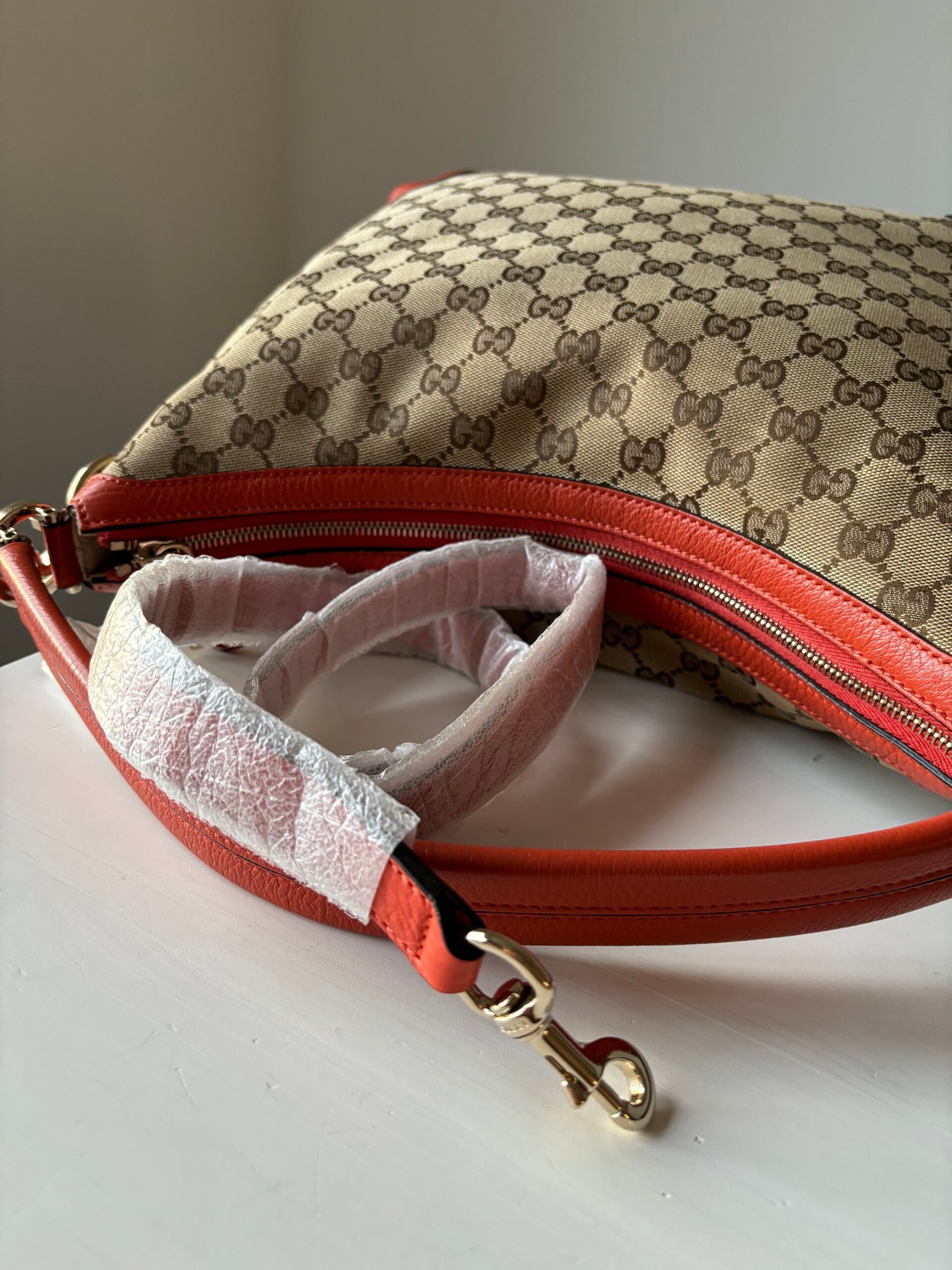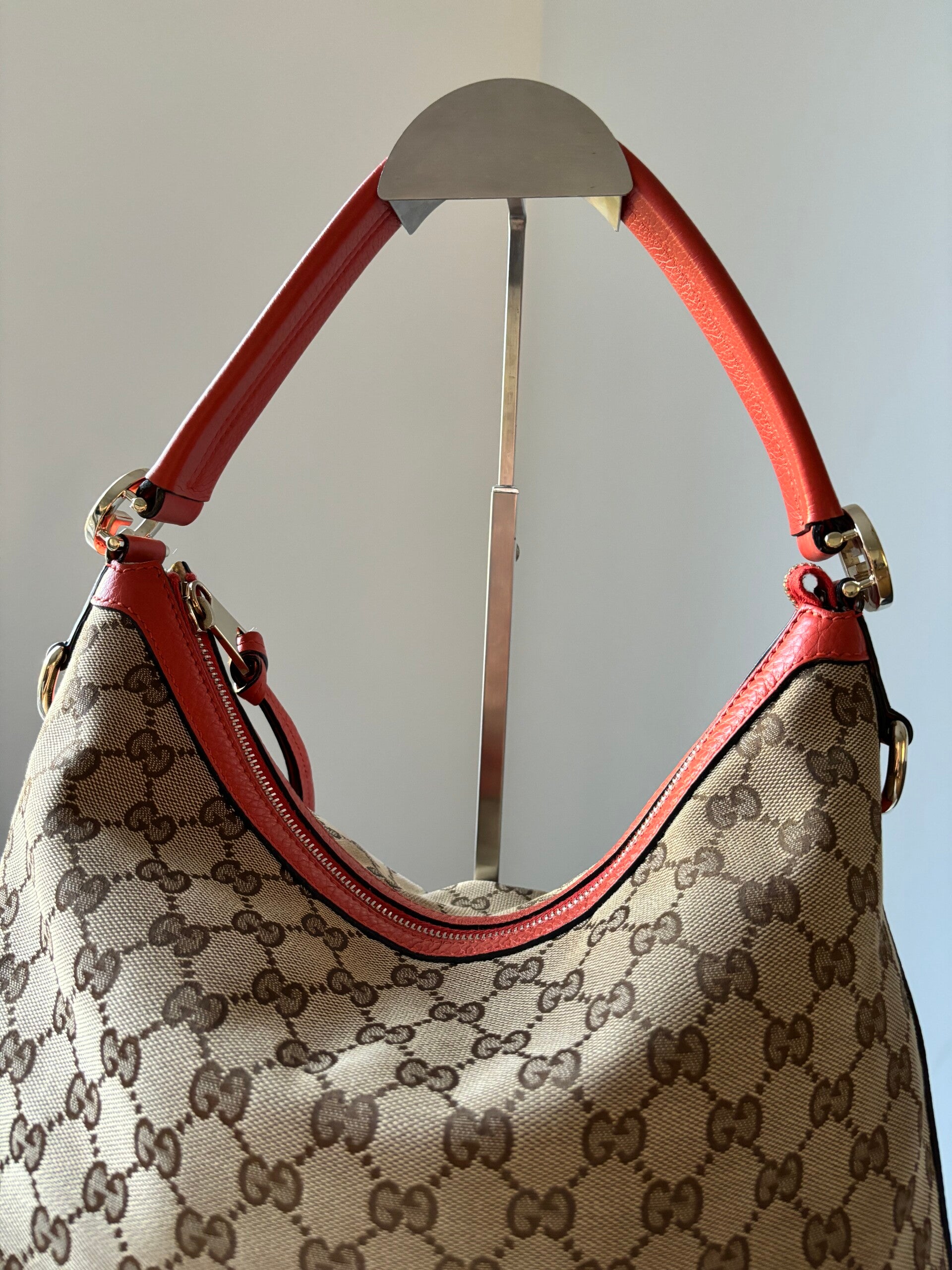 Gucci monogram hobo in perfecte staat. Kan over de schouder worden gedragen. De afmetingen zijn ongeveer 33 x 30 cm. Komt inclusief Veggel Vintage certificaat van authenticiteit.