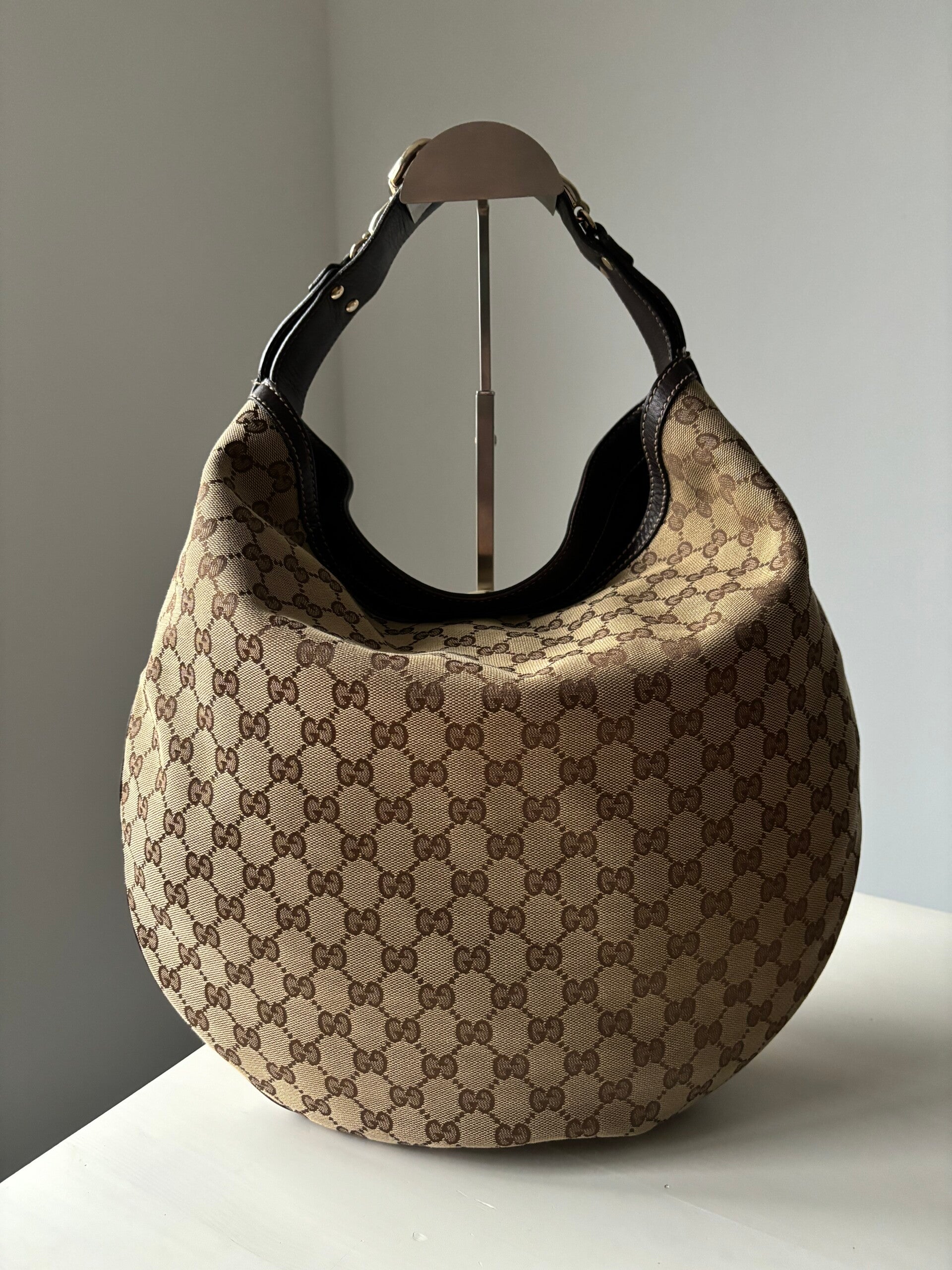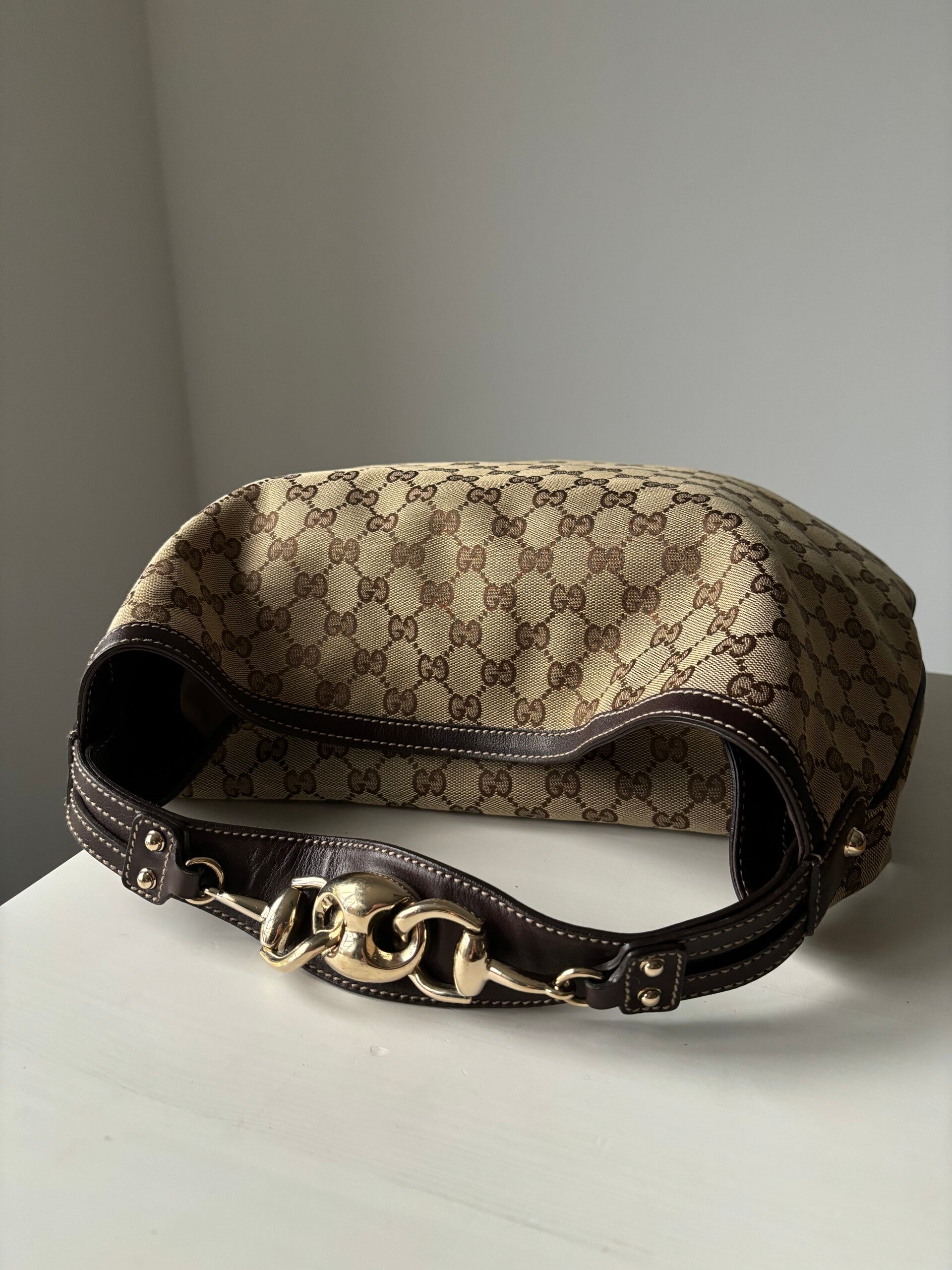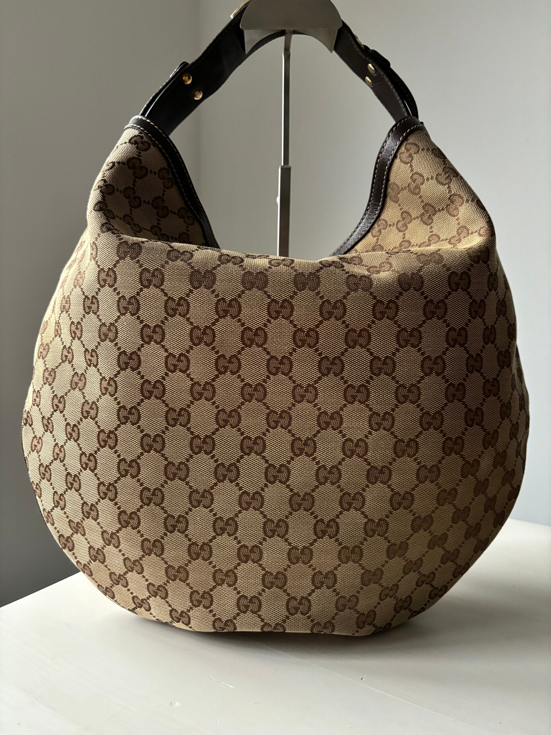 Gucci monogram hobo in perfecte staat. Kan over de schouder worden gedragen. Er past een laptop in. De afmetingen zijn ongeveer 40 x 35 cm. Komt inclusief Veggel Vintage certificaat van authenticiteit.