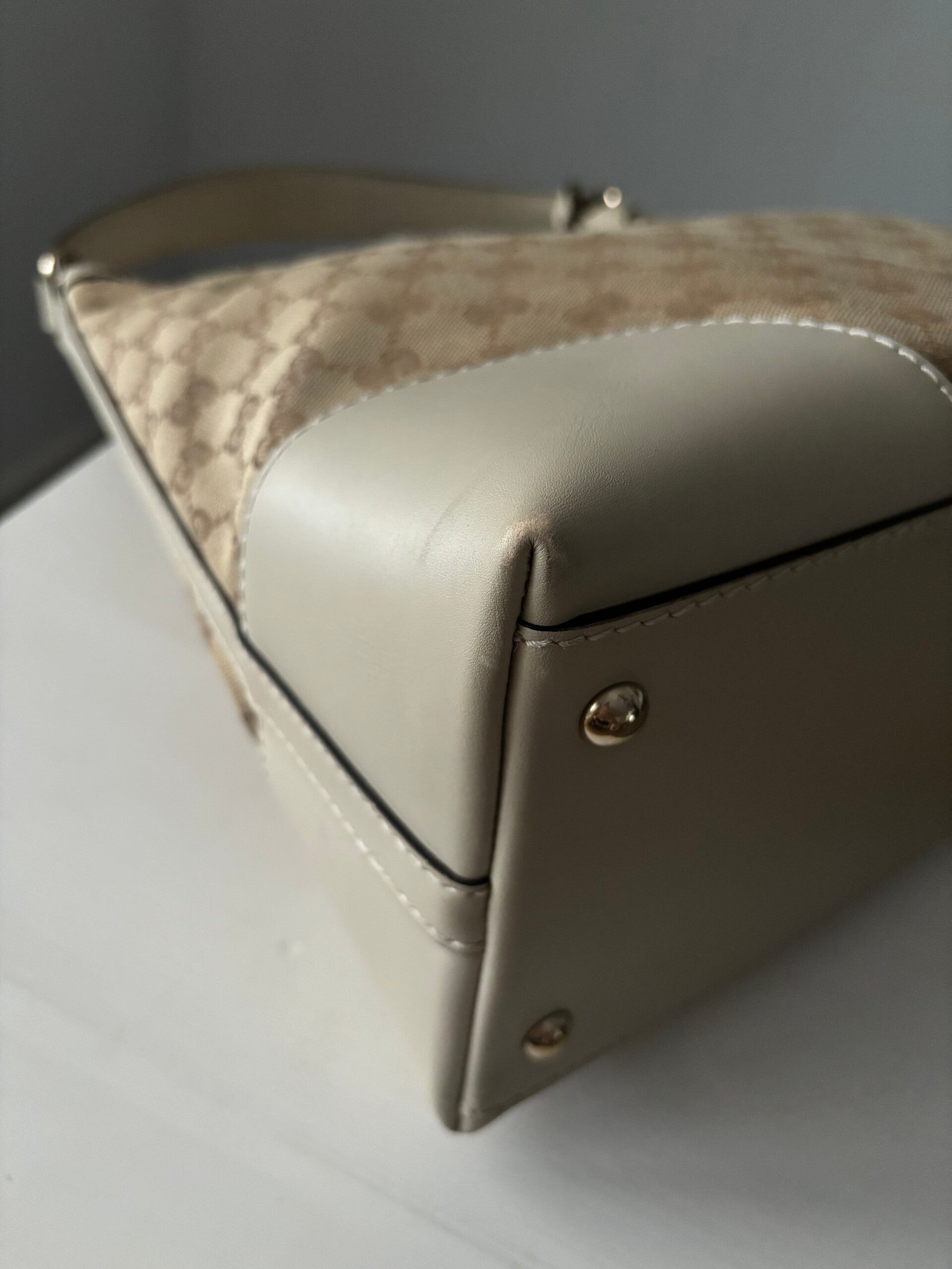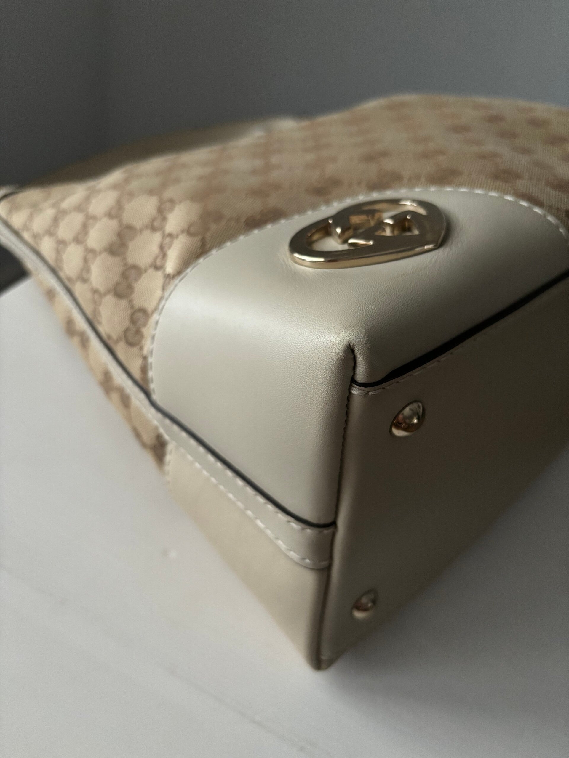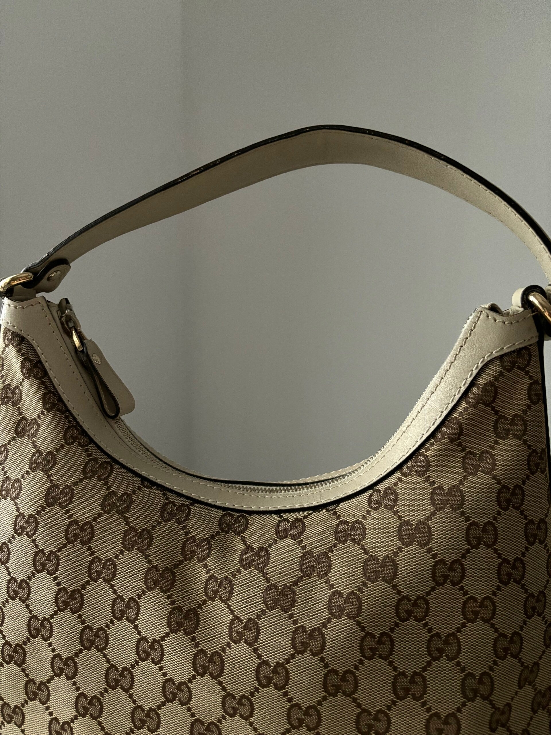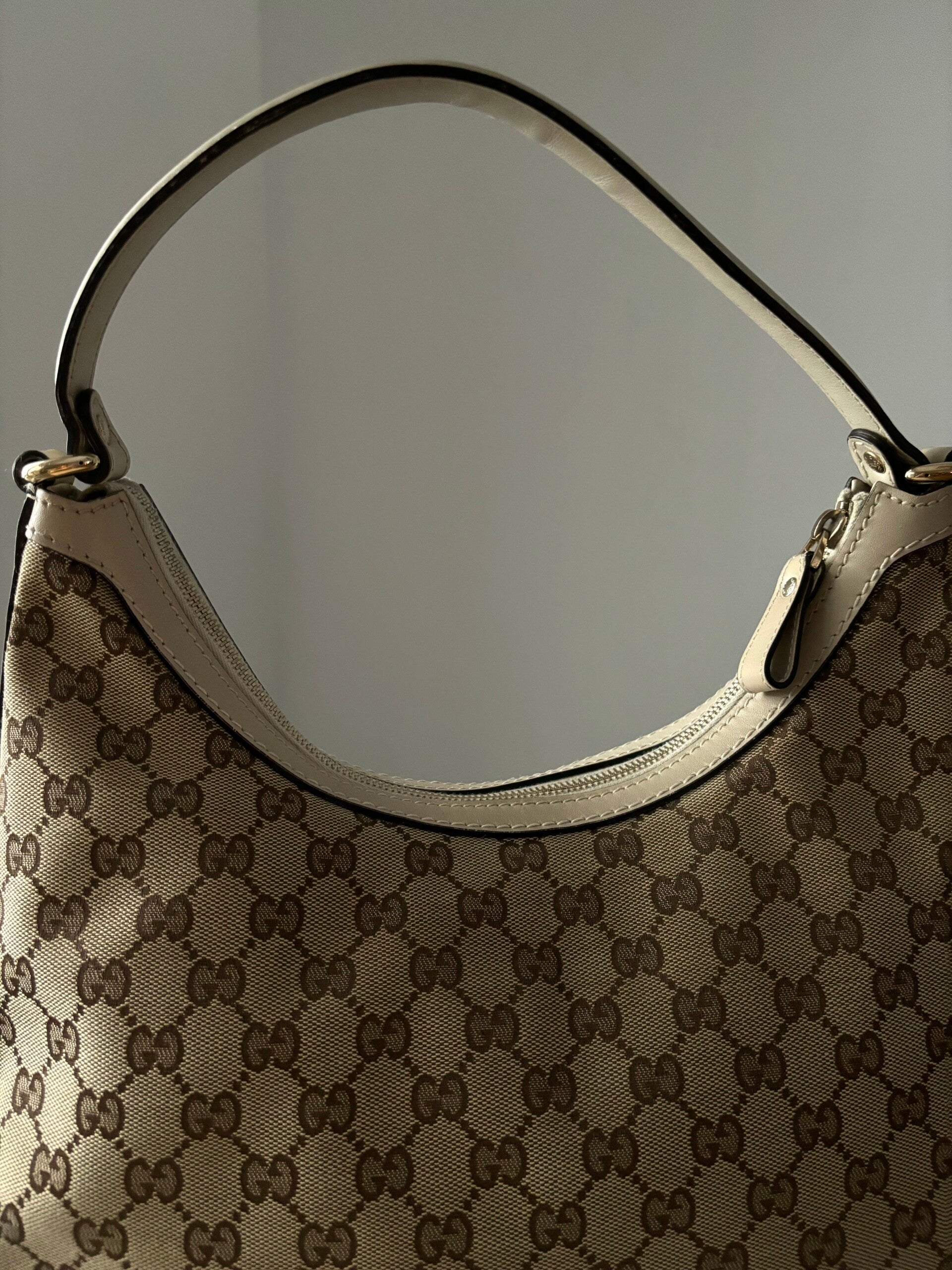 Gucci monogram hobo in zeer goede staat. Kan over de schouder worden gedragen. De afmetingen zijn ongeveer 34 x 30 cm exclusief strap. Komt inclusief Veggel Vintage certificaat van authenticiteit.