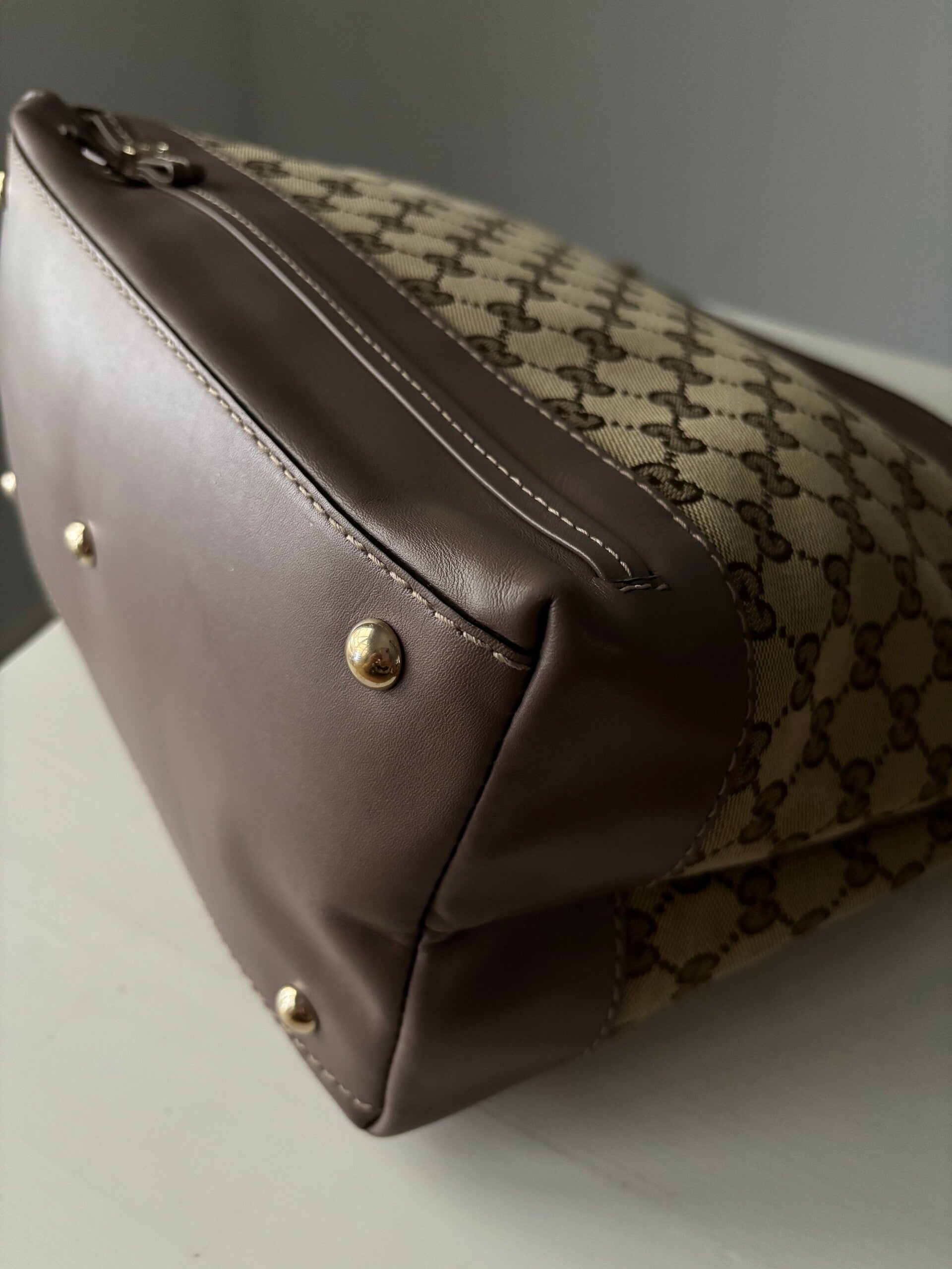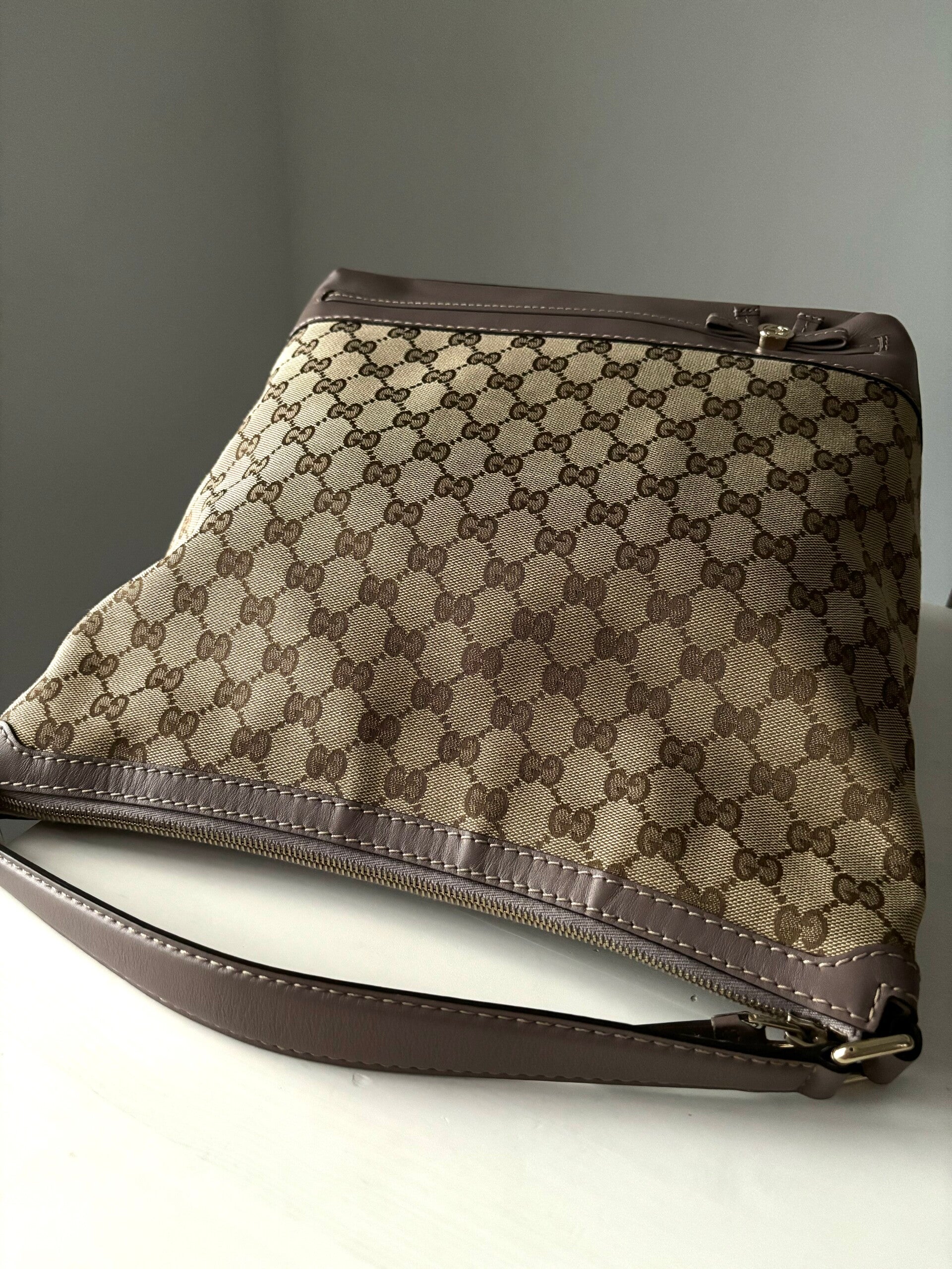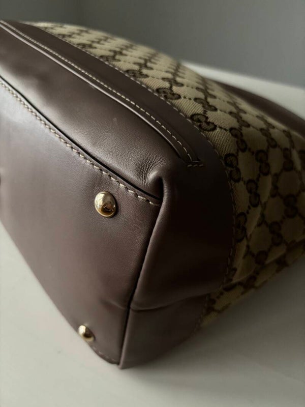 Gucci monogram hobo in perfecte staat. Kan over de schouder worden gedragen. Er past een laptop in. De afmetingen zijn ongeveer 35 x 30 cm. Komt inclusief Veggel Vintage certificaat van authenticiteit.