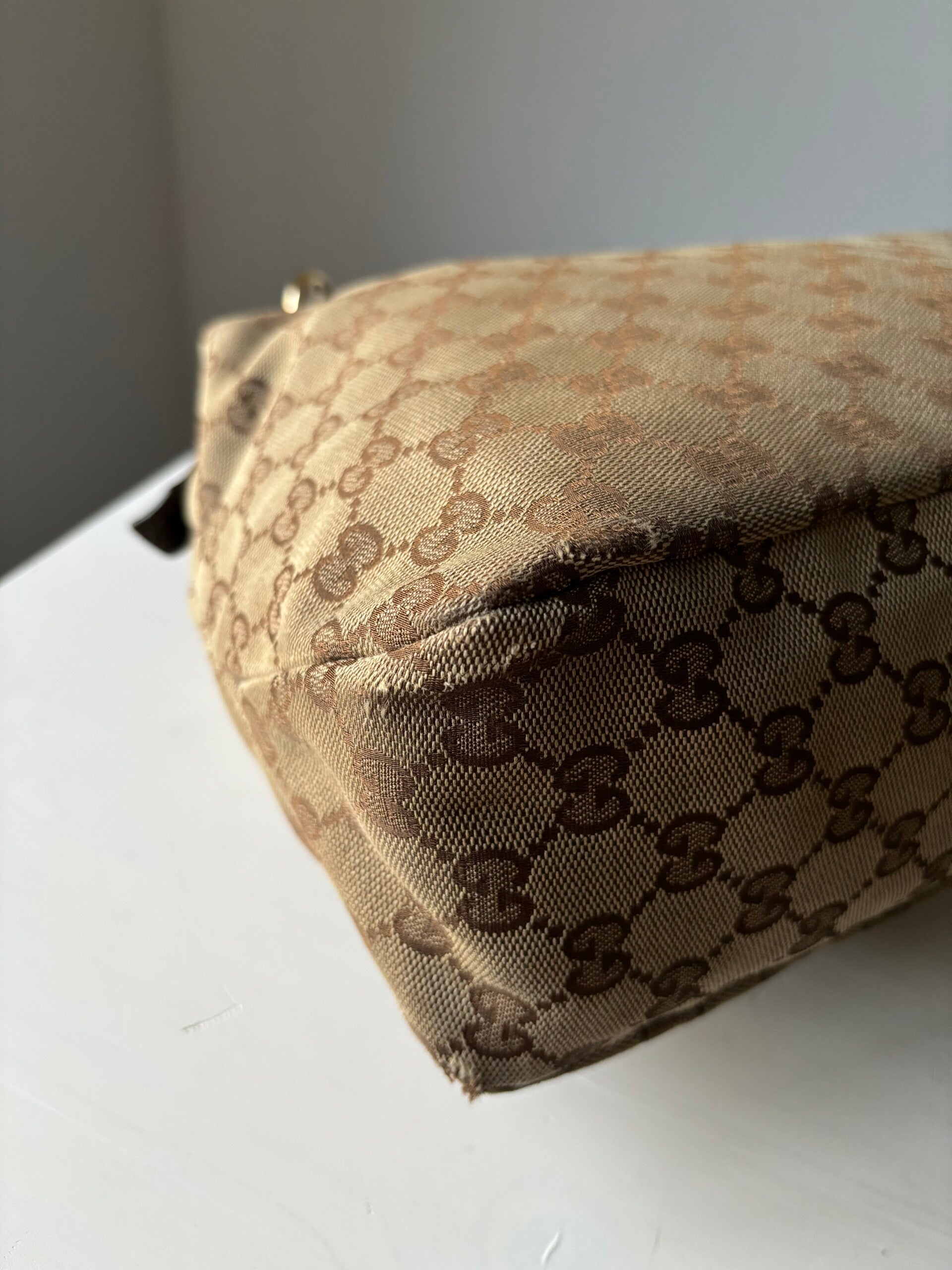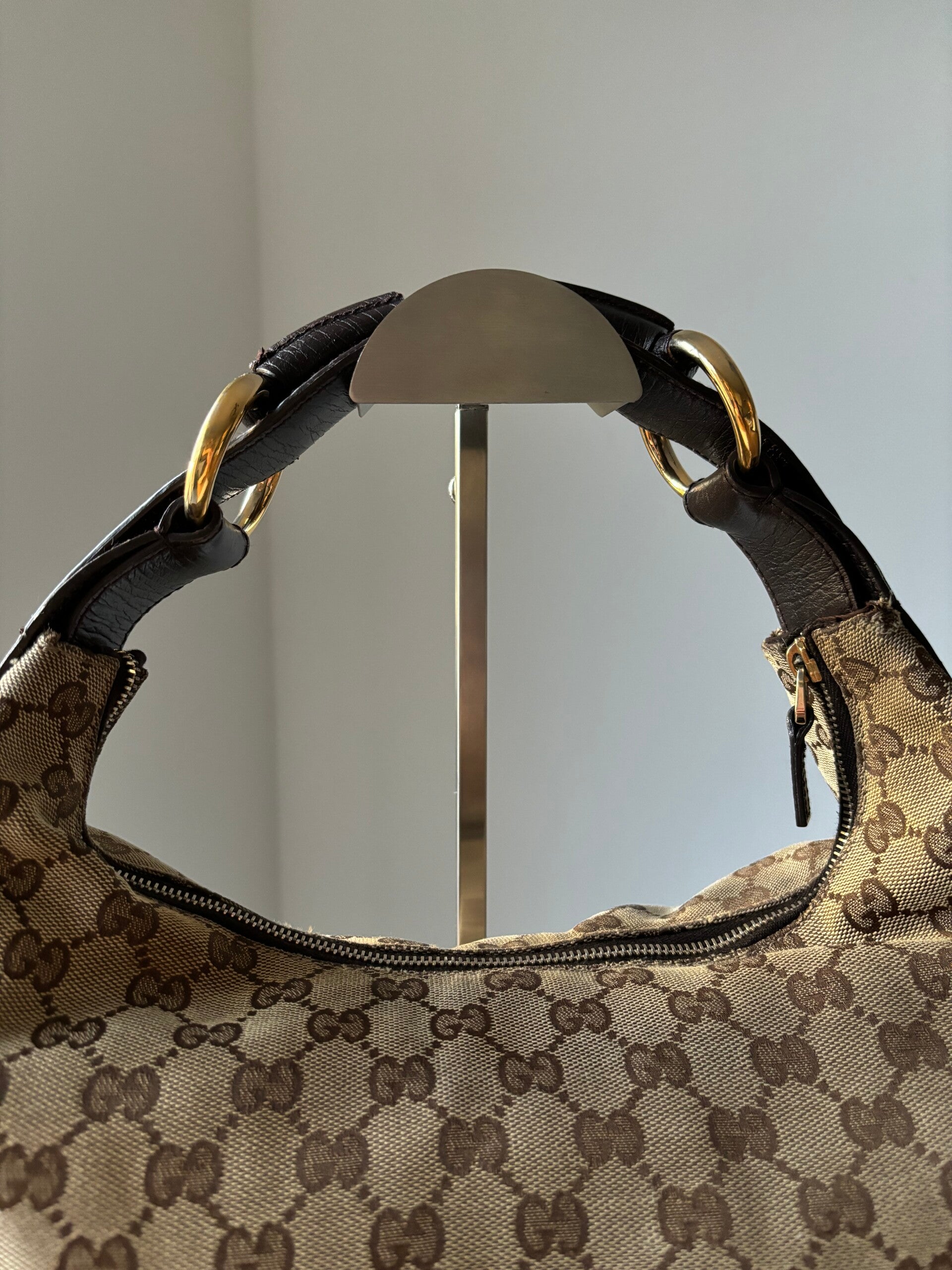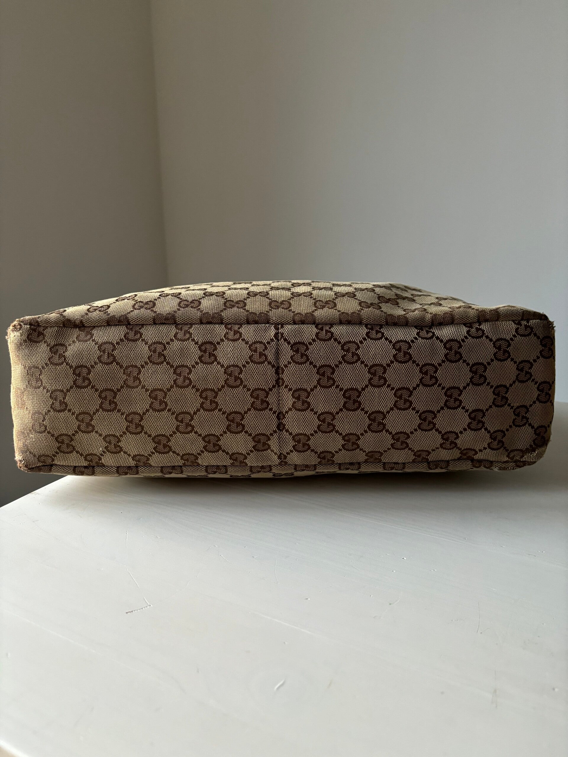 Gucci monogram horsebit hobo in goede staat. Kan over de schouder worden gedragen. De afmetingen zijn ongeveer 37 x 27 cm exclusief strap. Komt inclusief Veggel Vintage certificaat van authenticiteit.