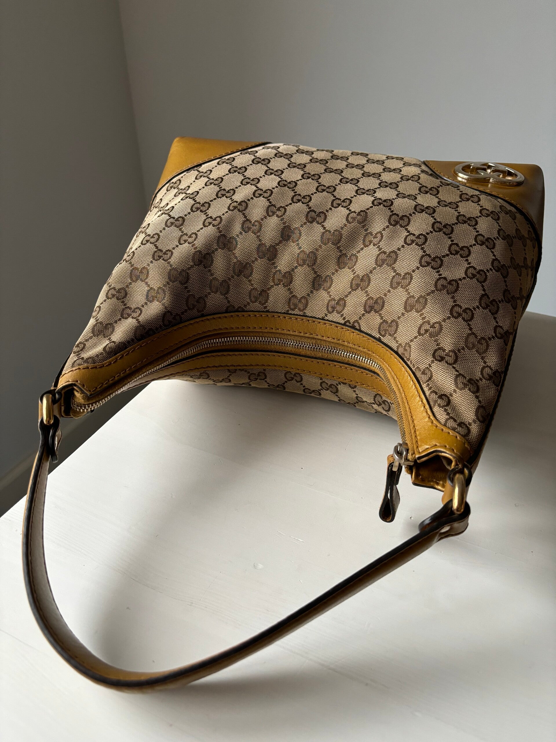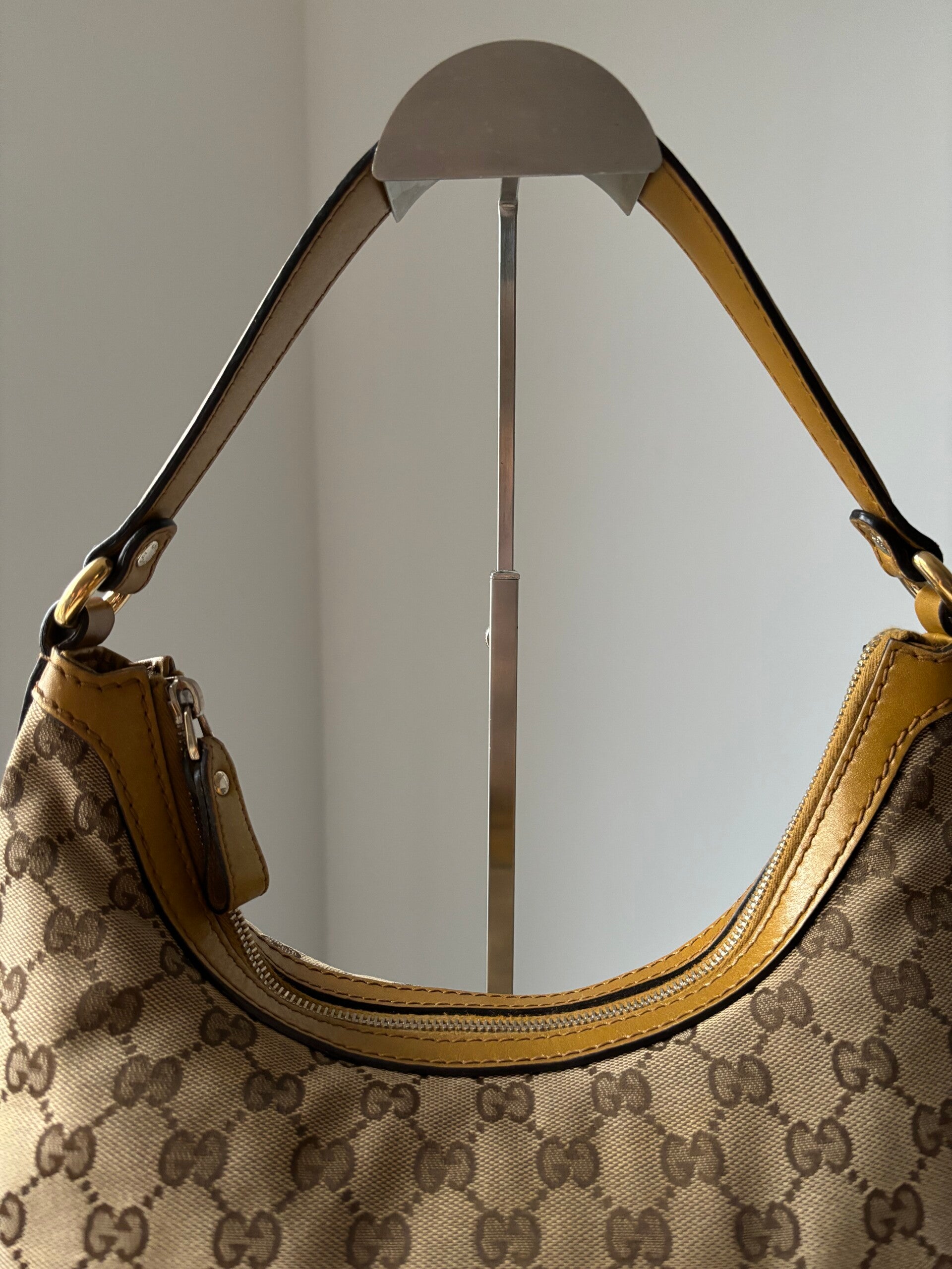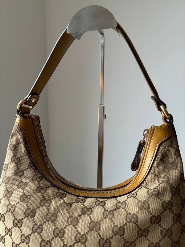 Gucci monogram hobo in perfecte staat. Kan over de schouder worden gedragen. De afmetingen zijn ongeveer 33 x 30 cm exclusief strap. Komt inclusief Veggel Vintage certificaat van authenticiteit.