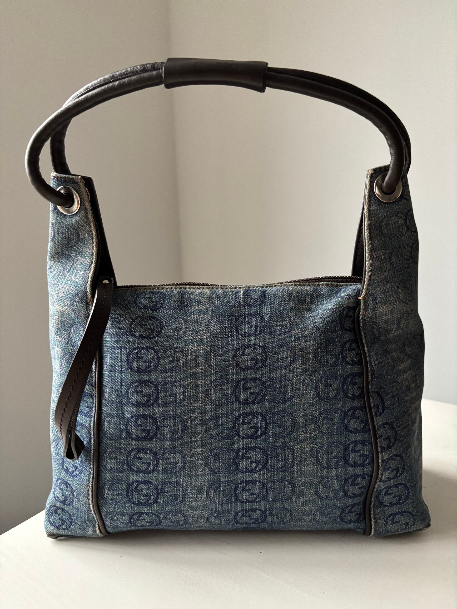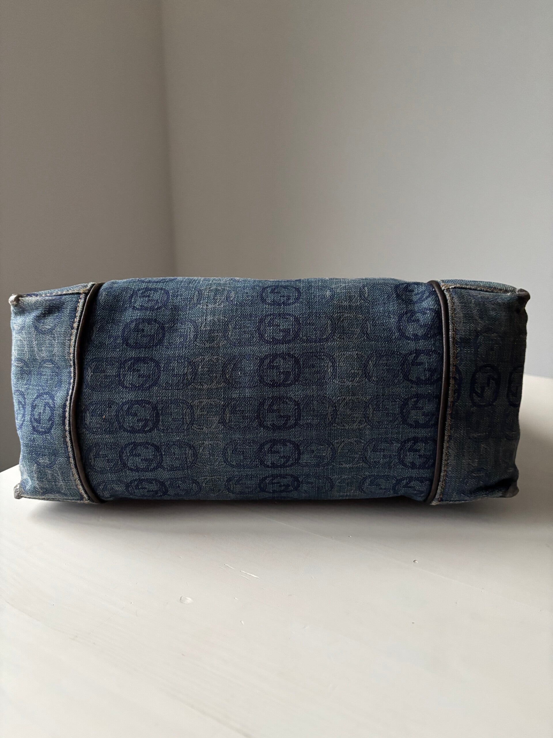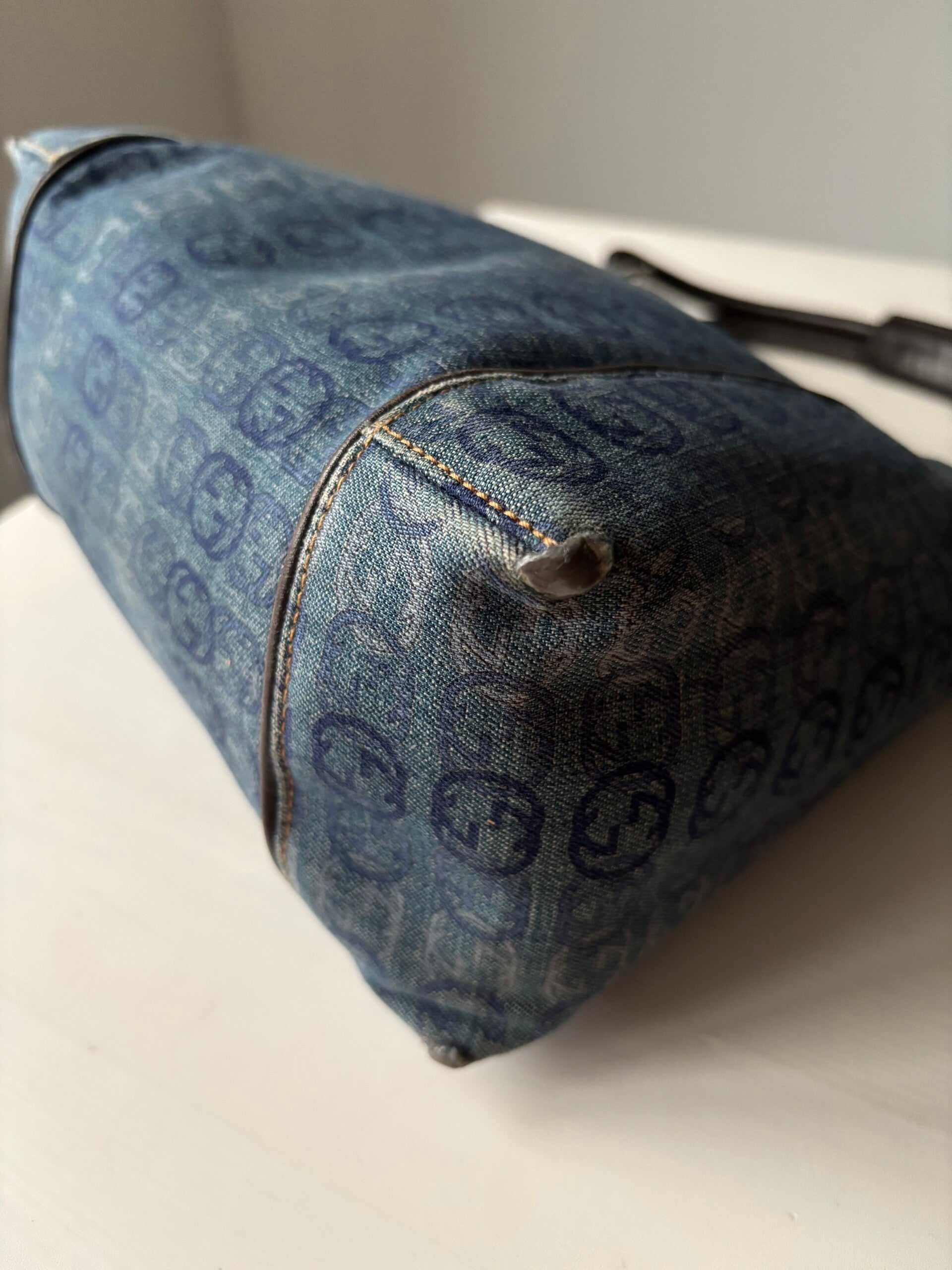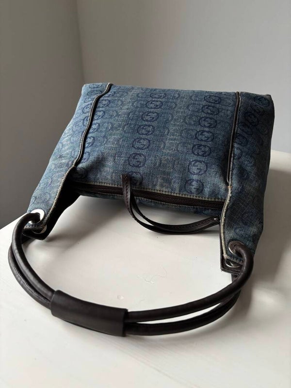 Gucci interlocking denim schoudertas in zeer goede staat. De hoeken zijn verstevigd. Kan over de schouder worden gedragen. De afmetingen zijn ongeveer 27 x 25 cm exclusief strap. Komt inclusief Veggel Vintage certificaat van authenticiteit en Veggel Vintage dustbag.