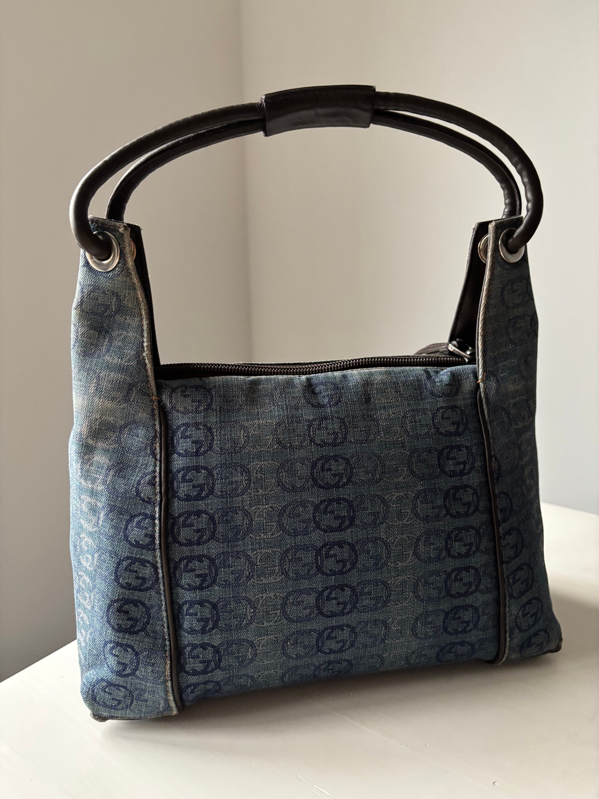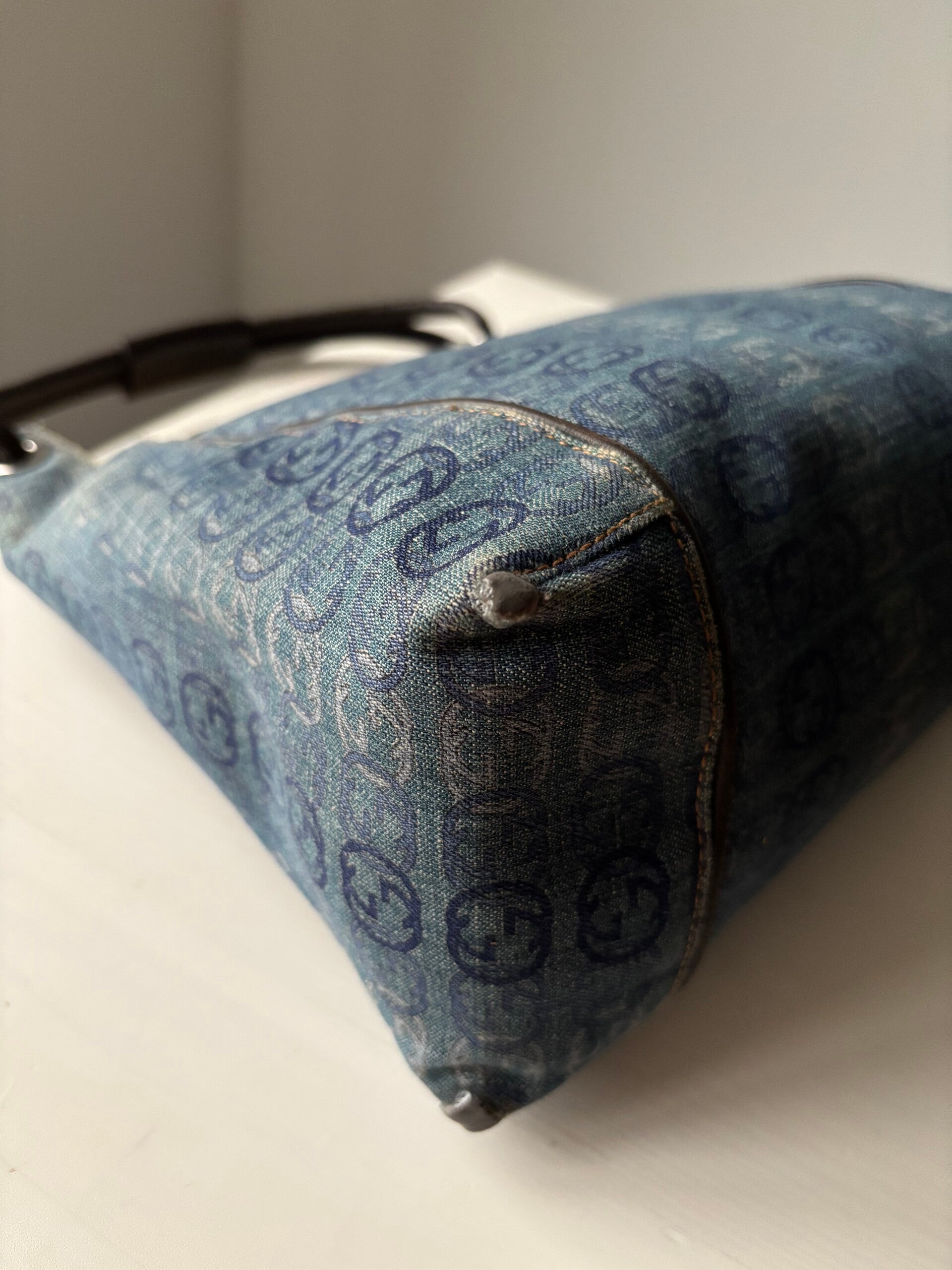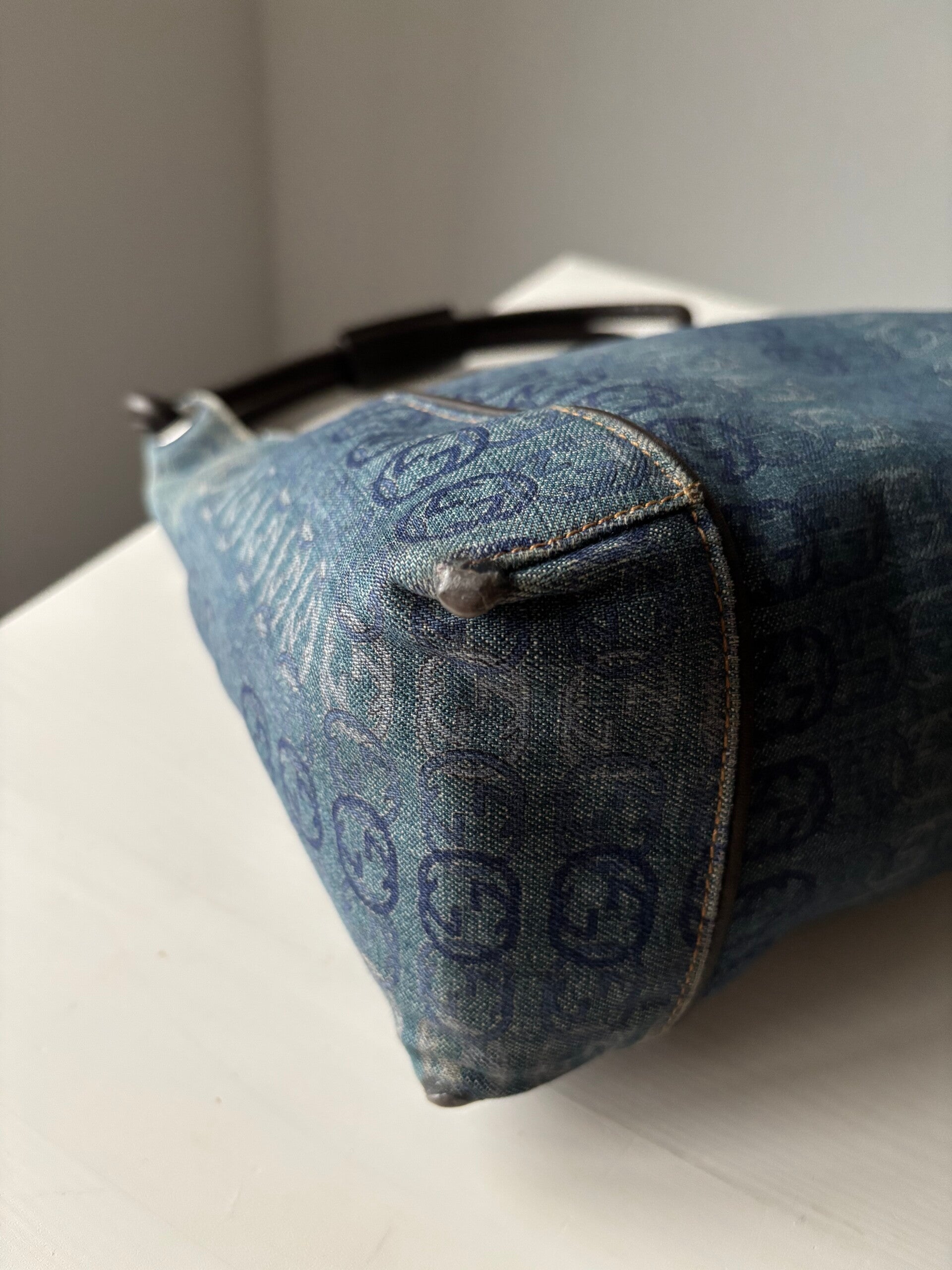 Gucci interlocking denim schoudertas in zeer goede staat. De hoeken zijn verstevigd. Kan over de schouder worden gedragen. De afmetingen zijn ongeveer 27 x 25 cm exclusief strap. Komt inclusief Veggel Vintage certificaat van authenticiteit en Veggel Vintage dustbag.