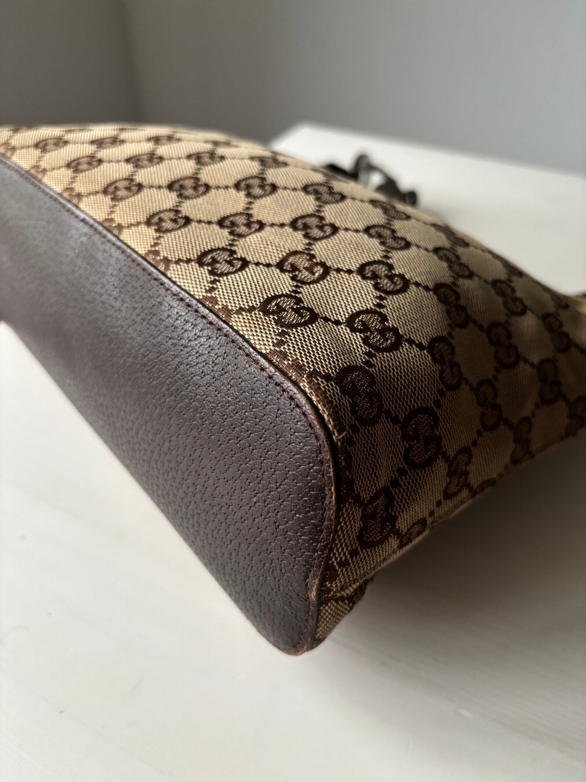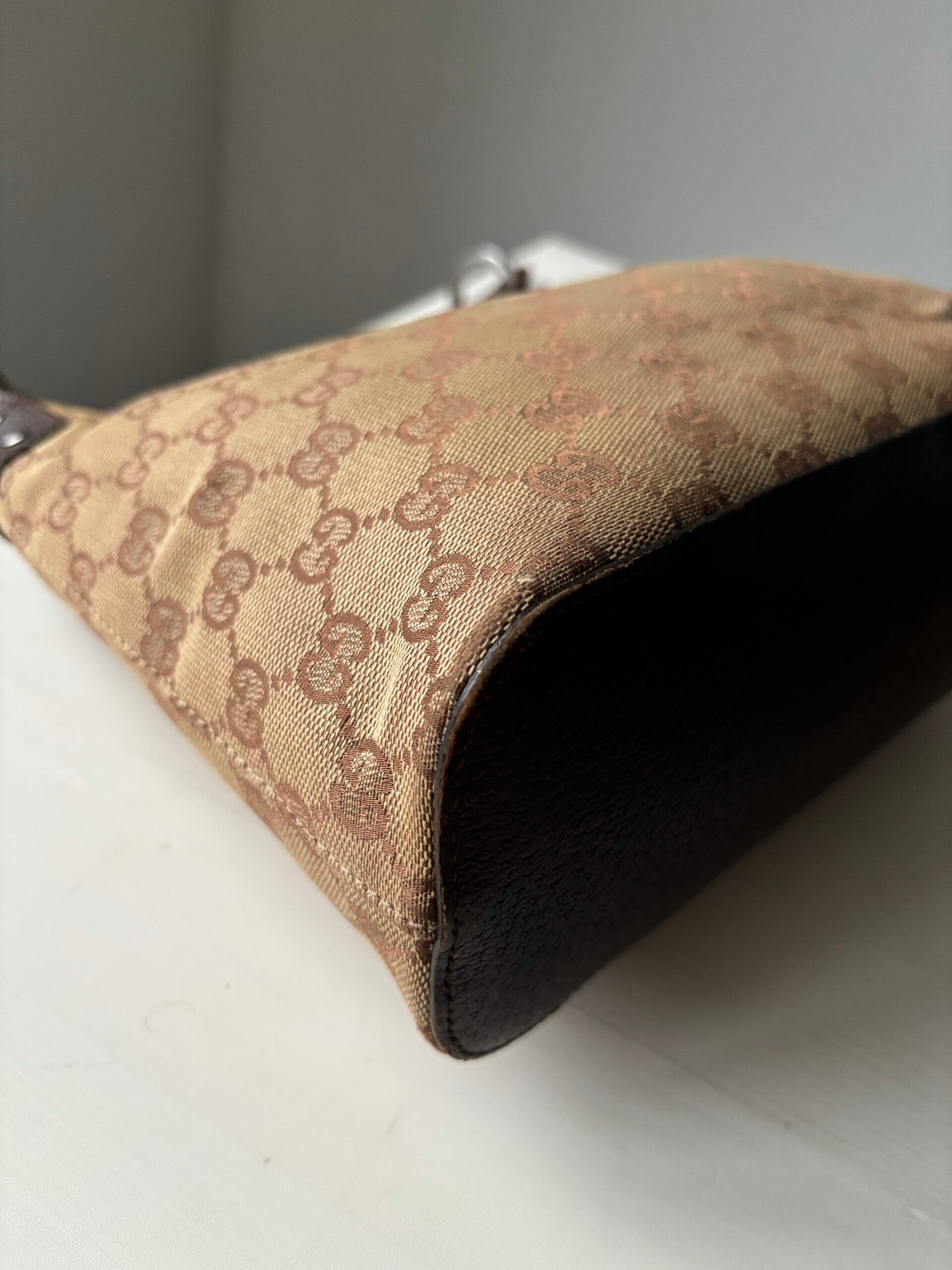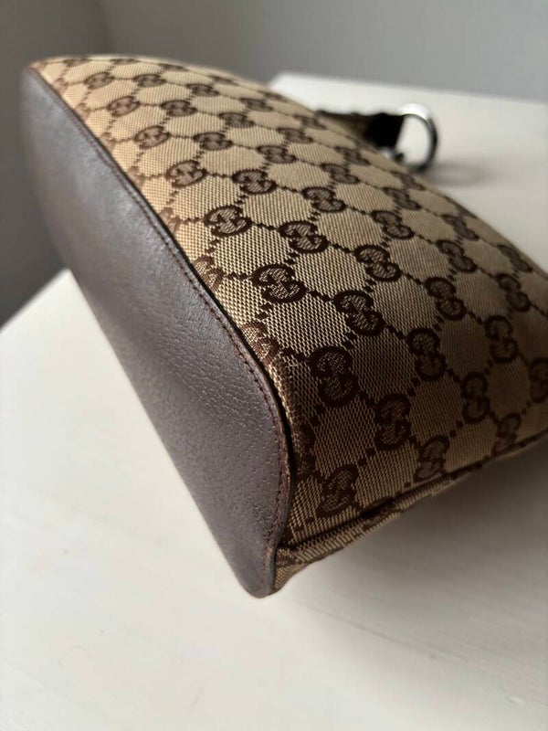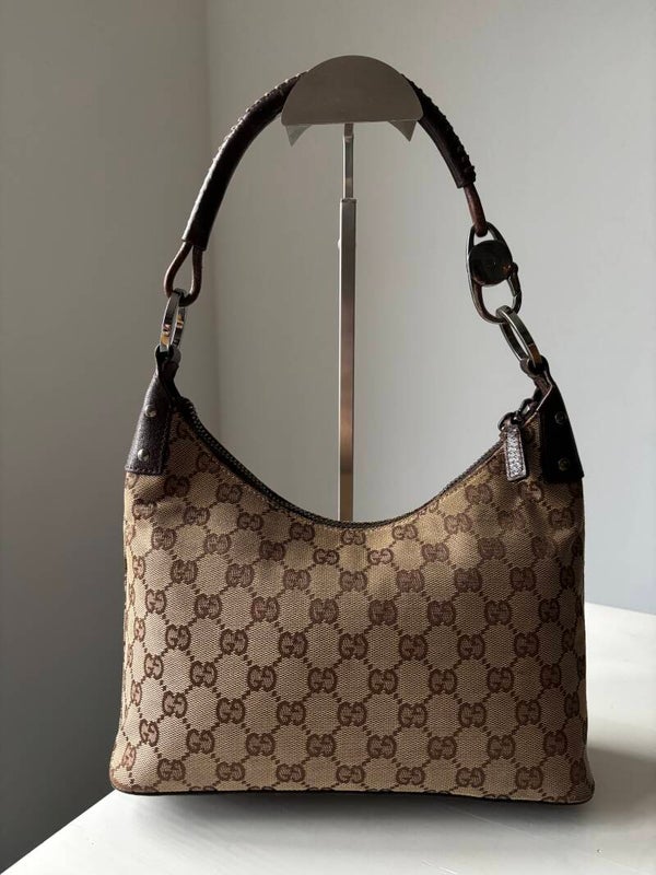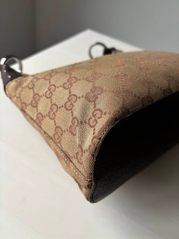 Gucci monogram hobo in goede staat. Kan over de schouder worden gedragen. De afmetingen zijn ongeveer 28 x 20 cm. Komt inclusief Veggel Vintage certificaat van authenticiteit en Veggel Vintage dustbag.