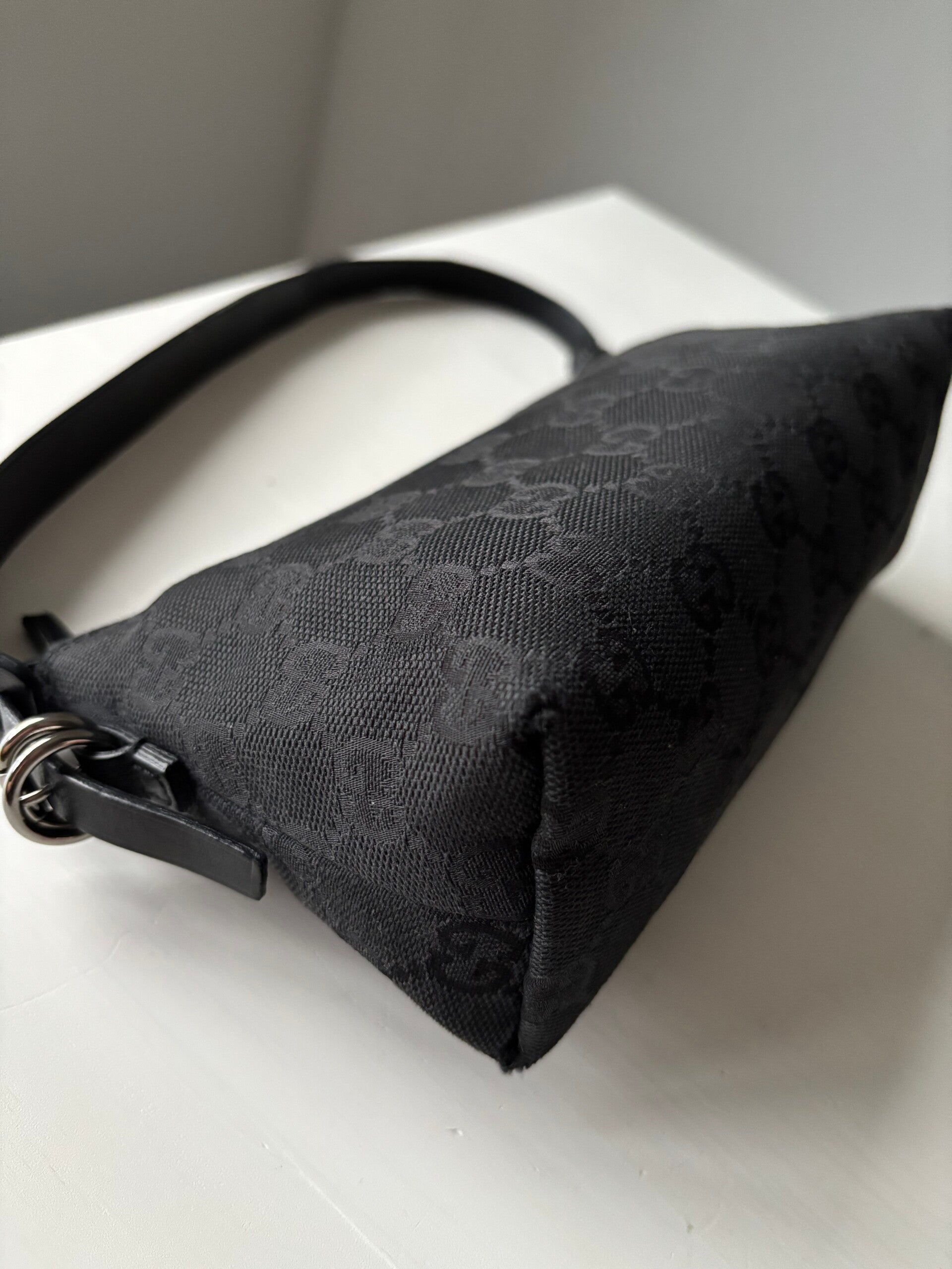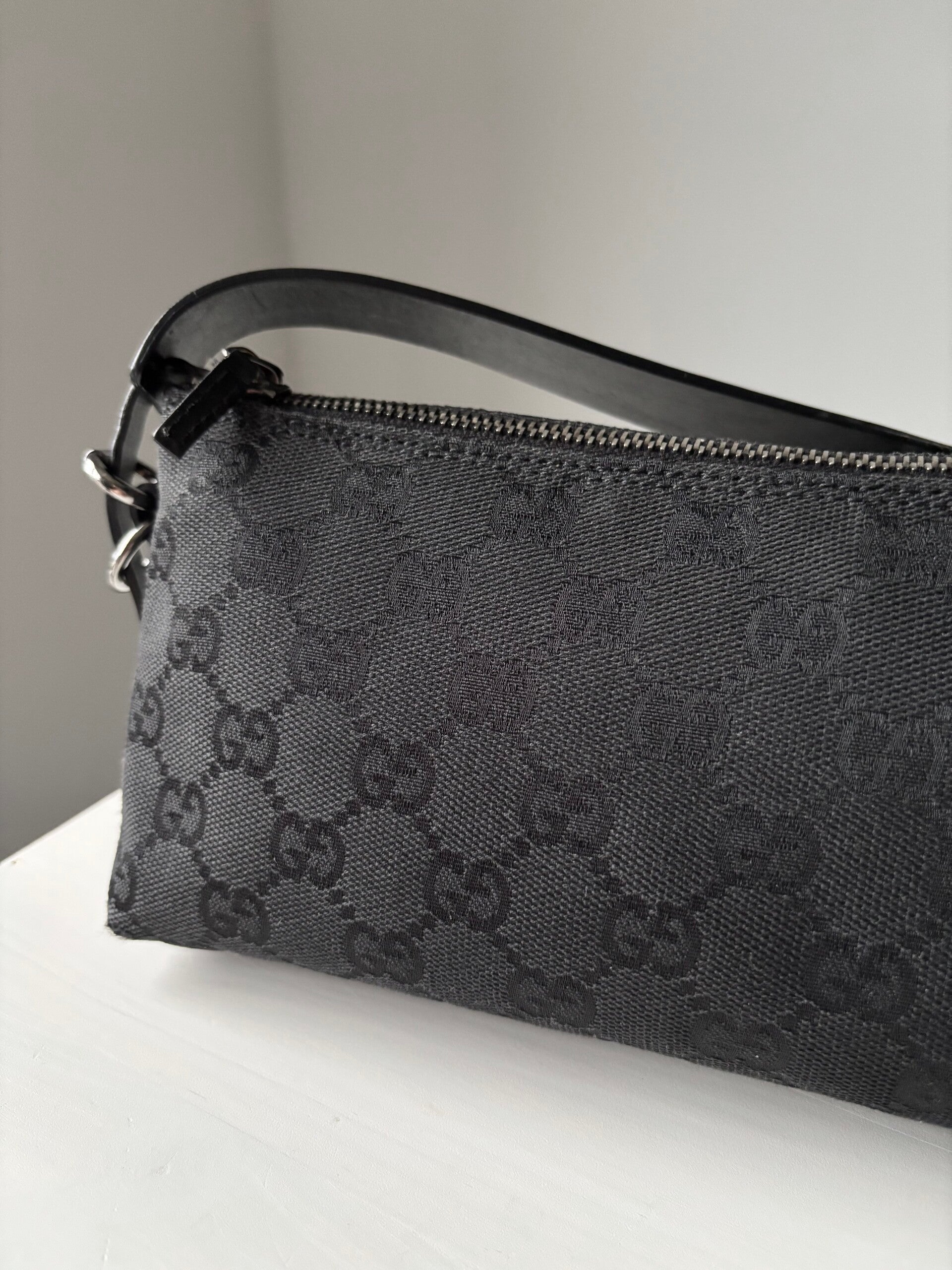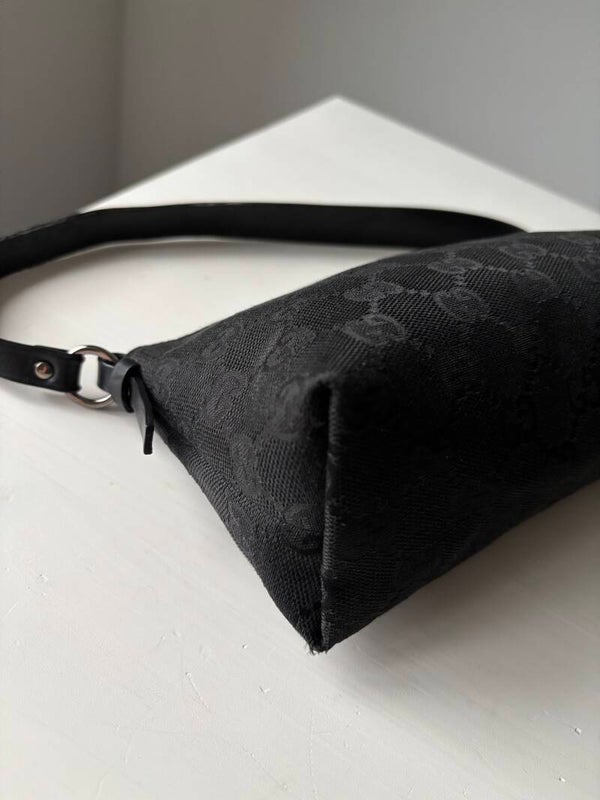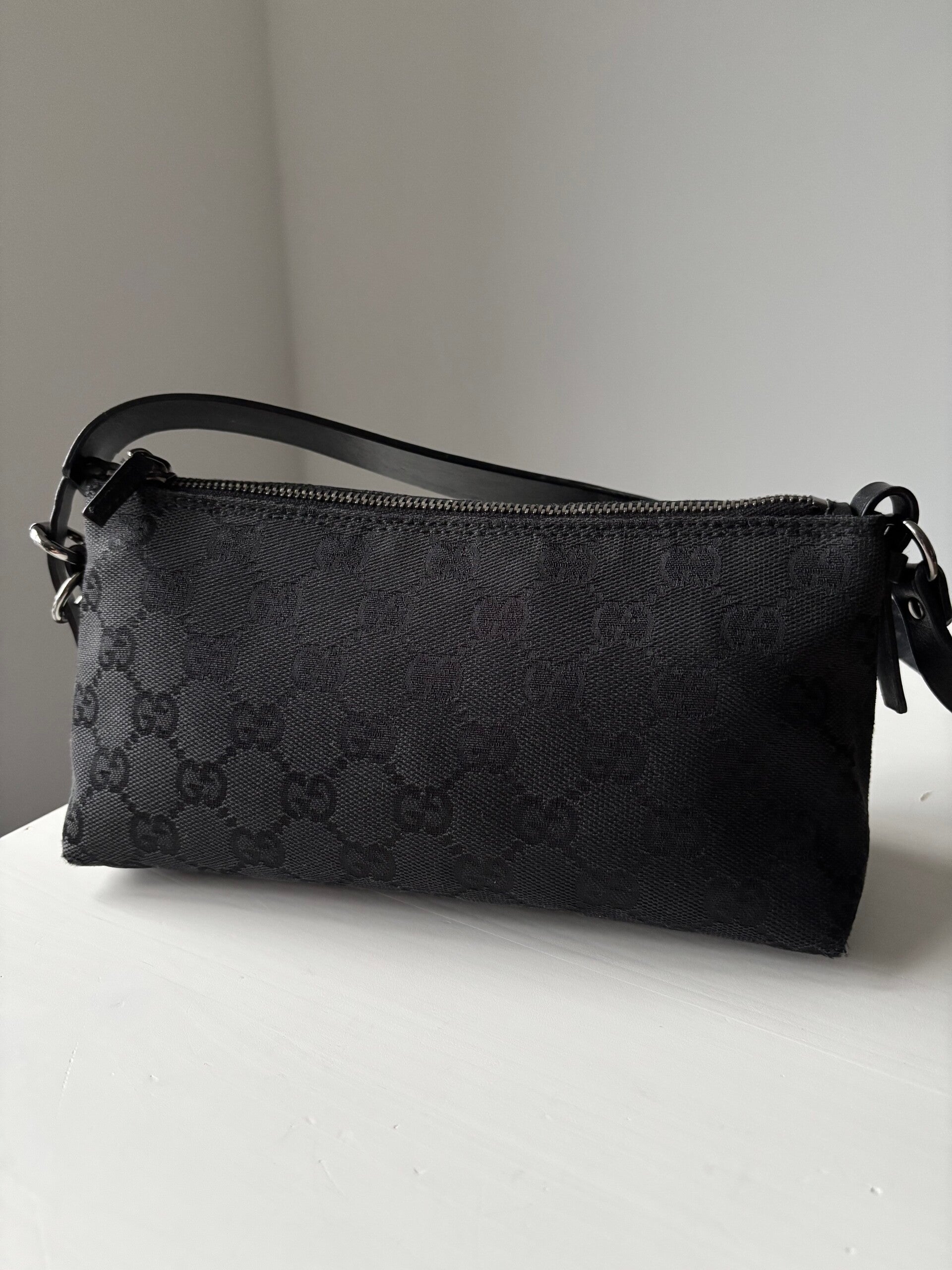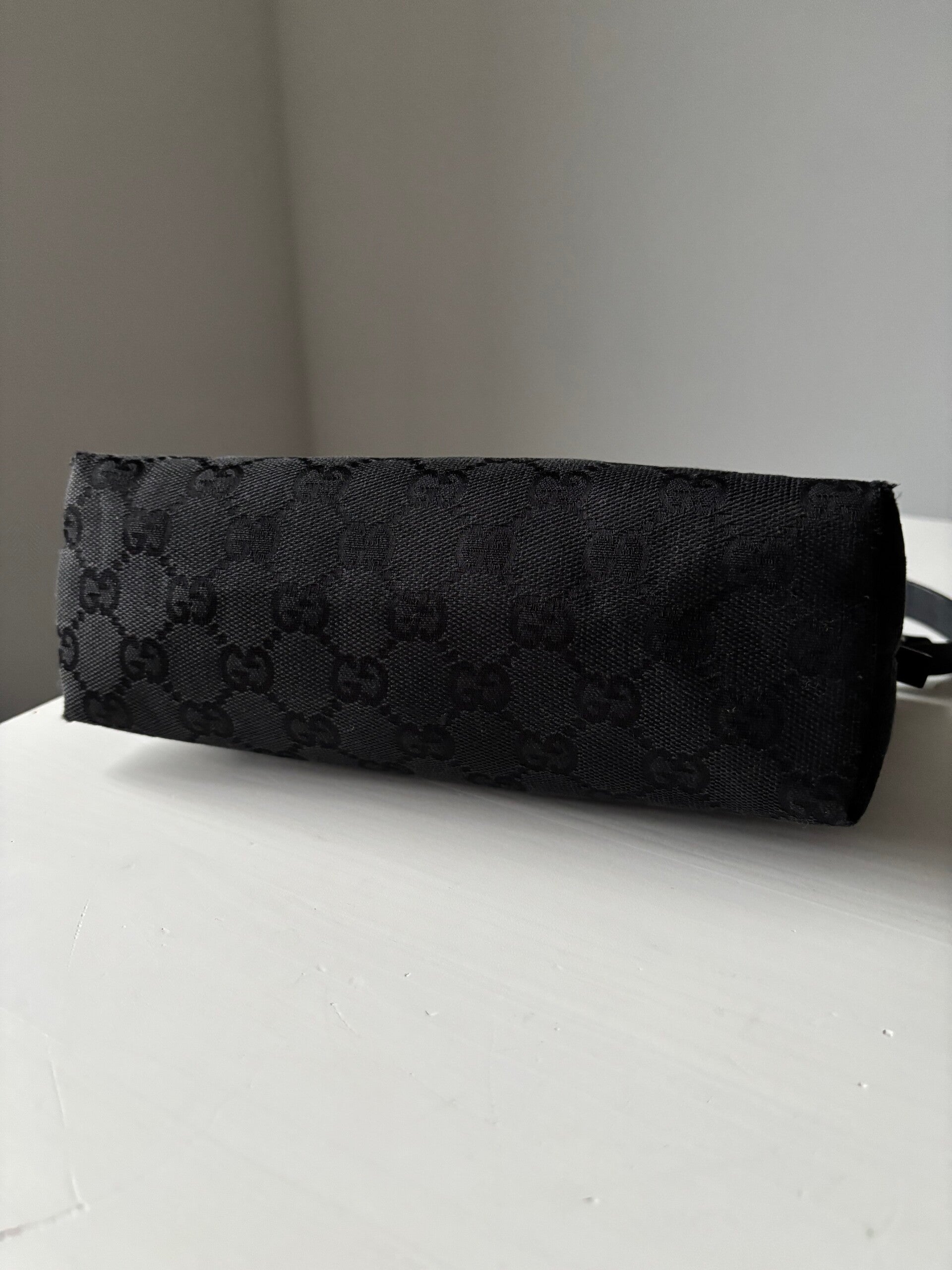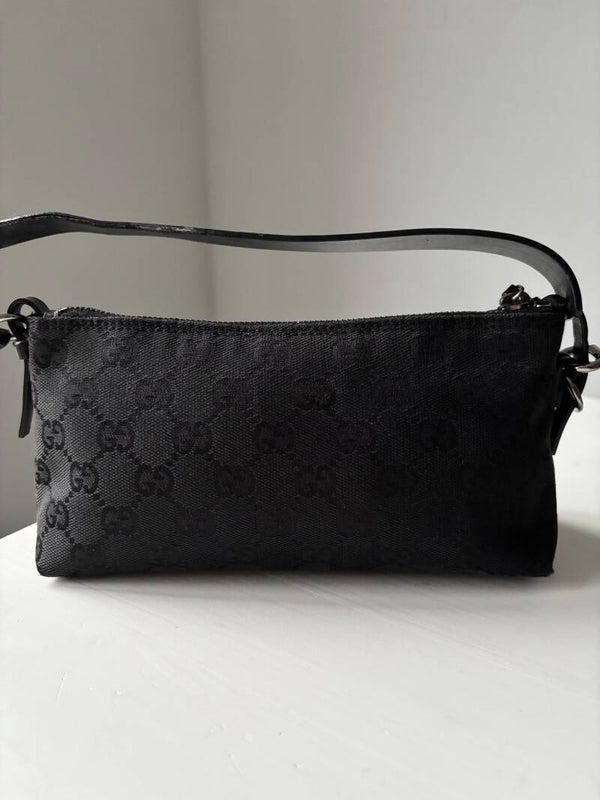 Gucci monogram pochette in goede staat. Kan over de schouder worden gedragen. De afmetingen zijn ongeveer 22 x 12 cm. Bevat een klein vlekje (foto 6). Komt inclusief Veggel Vintage certificaat van authenticiteit en Veggel Vintage dustbag.