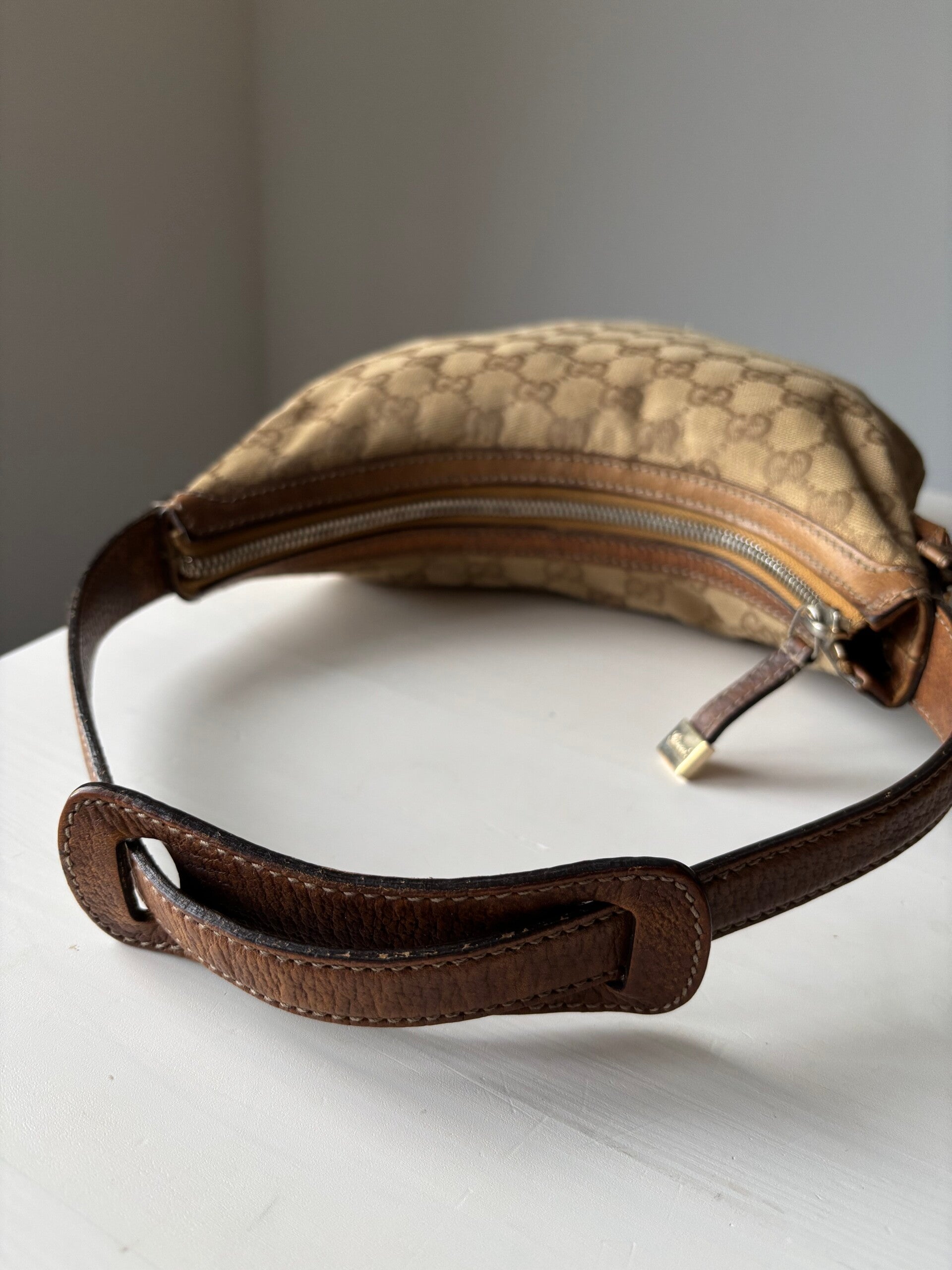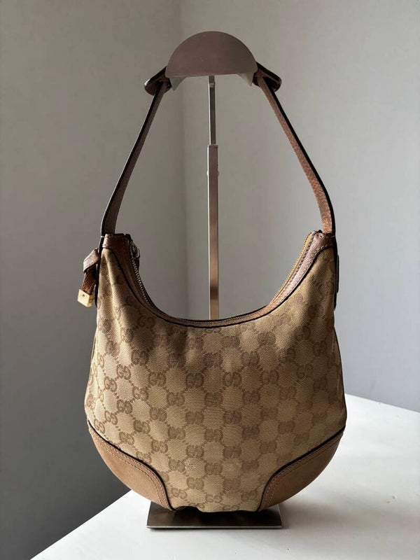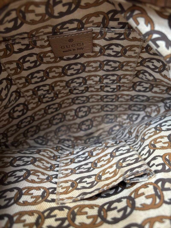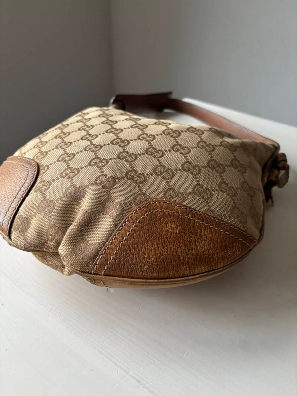 Gucci monogram schoudertas in goede staat. Kan over de schouder worden gedragen. De afmetingen zijn ongeveer 25 x 21 cm exclusief strap. De vier leren gedeeltes aan de onderzijde bevatten verkleuringen. Komt inclusief Veggel Vintage certificaat van authenticiteit en Veggel Vintage dustbag.