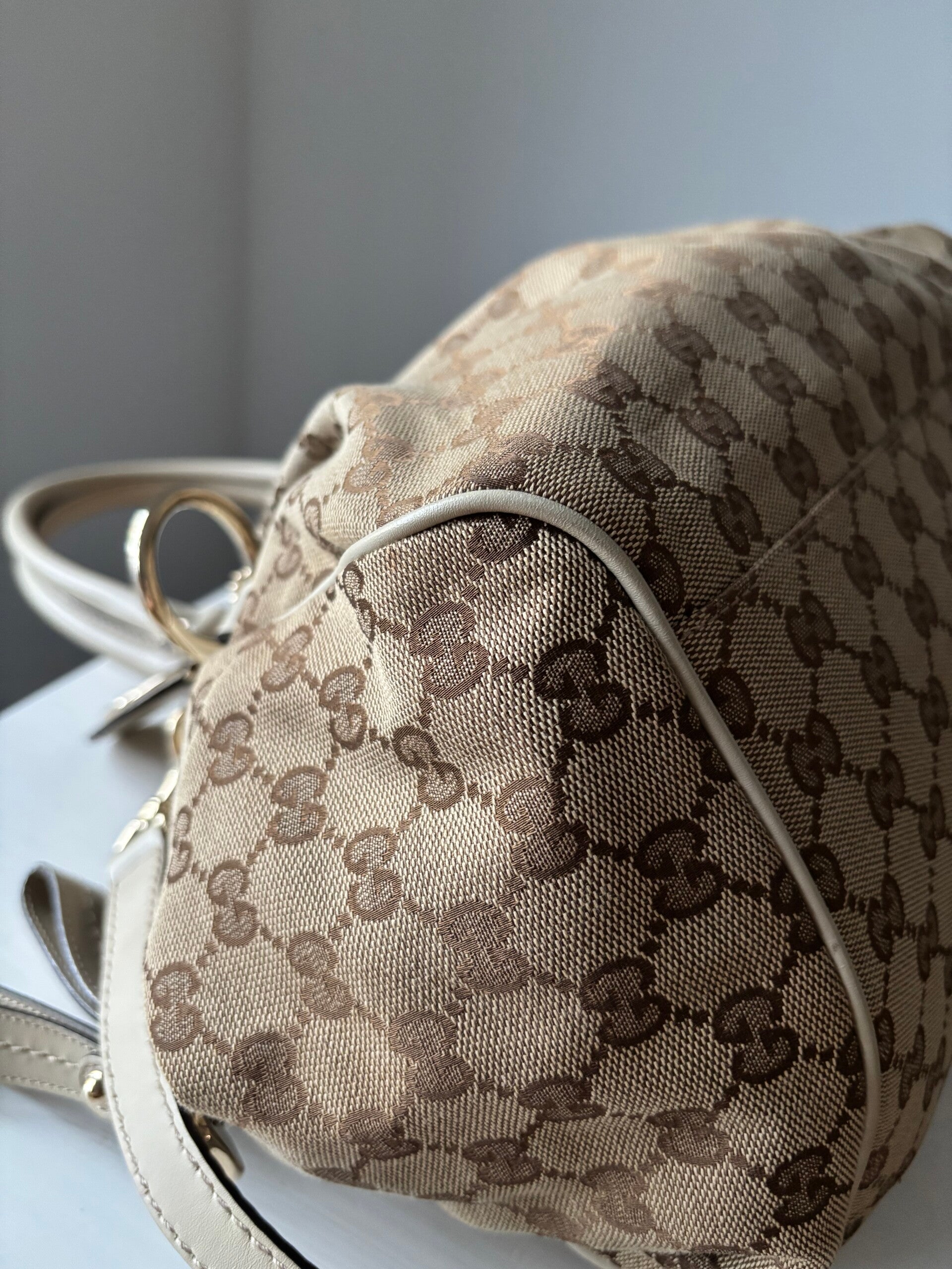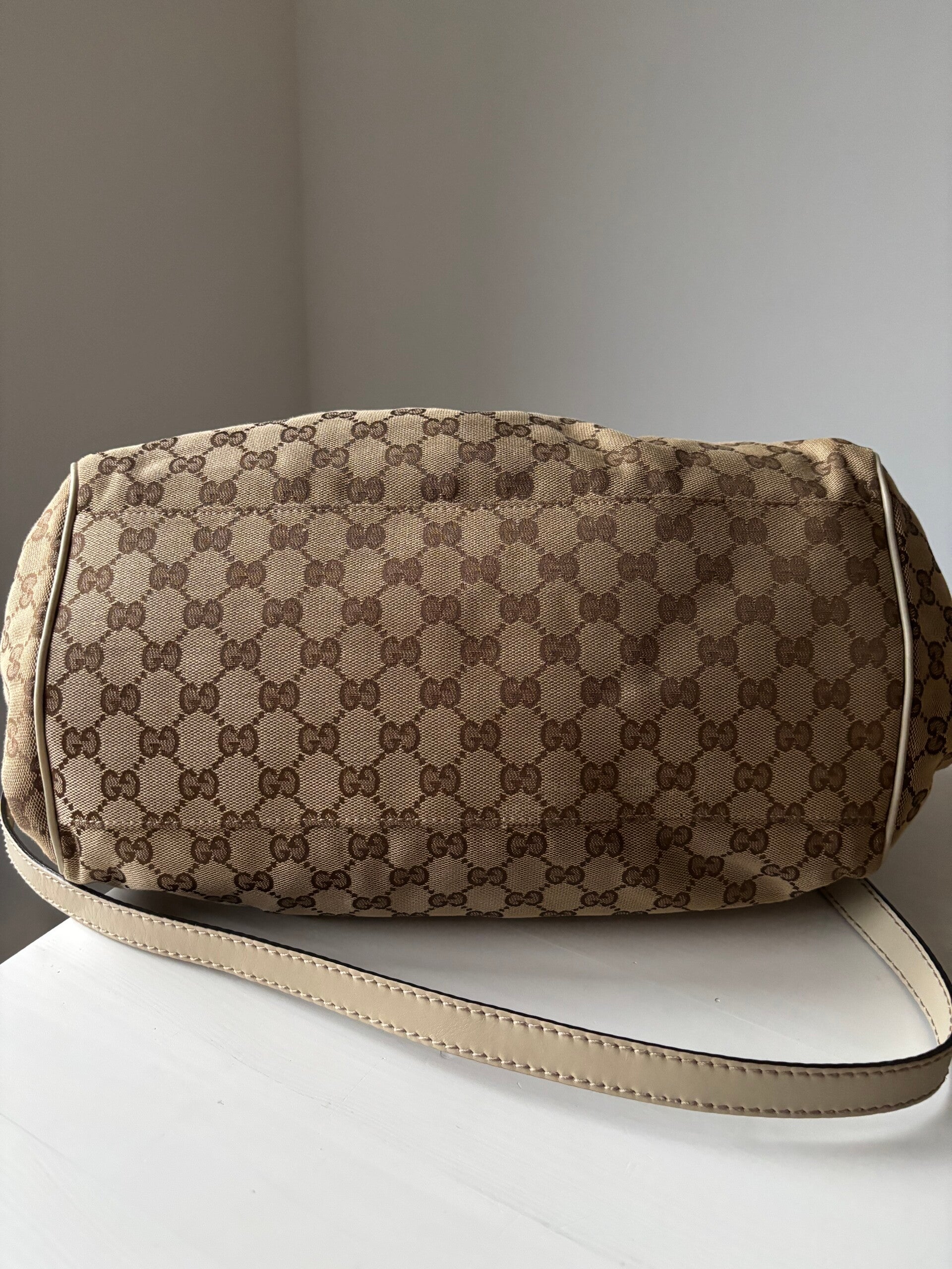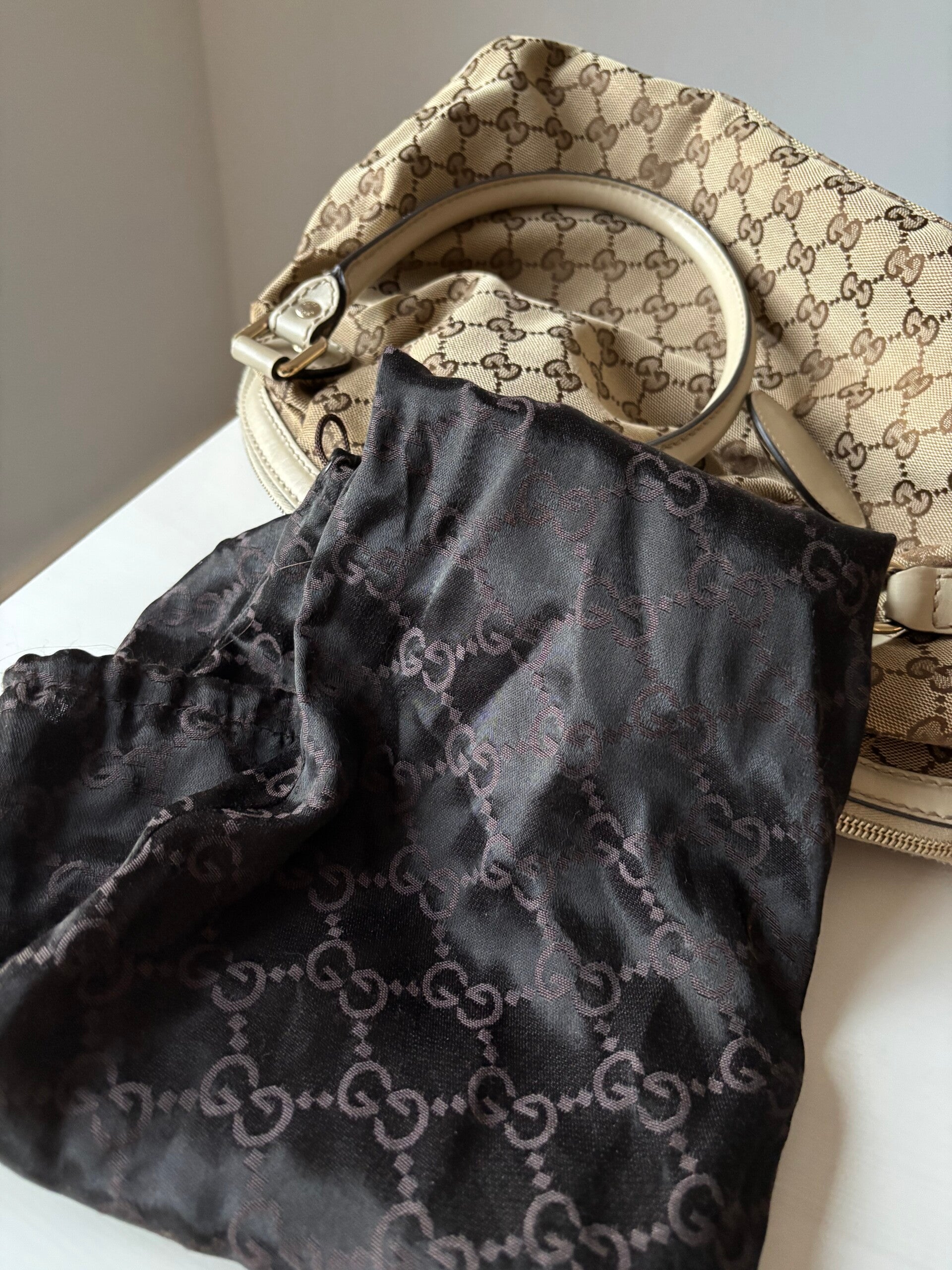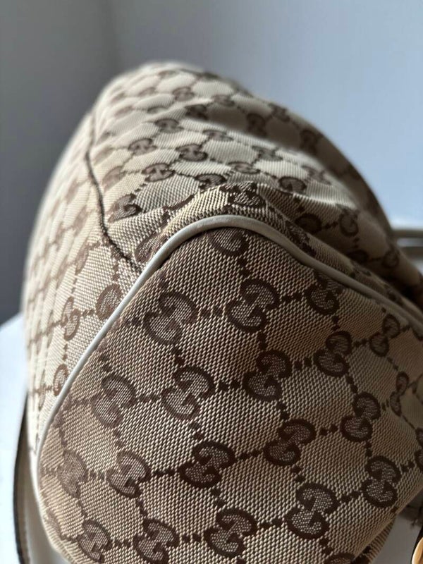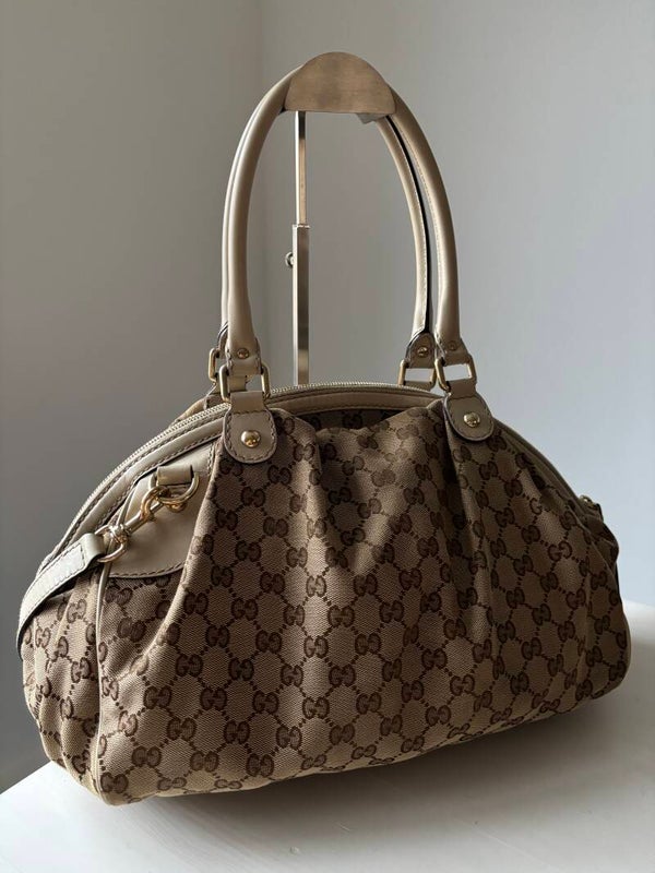 Gucci monogram Sukey in perfecte staat. Kan over de schouder worden gedragen. Er past een laptop in. De afmetingen zijn ongeveer 38 x 28 cm. Komt inclusief Veggel Vintage certificaat van authenticiteit en Gucci dustbag.