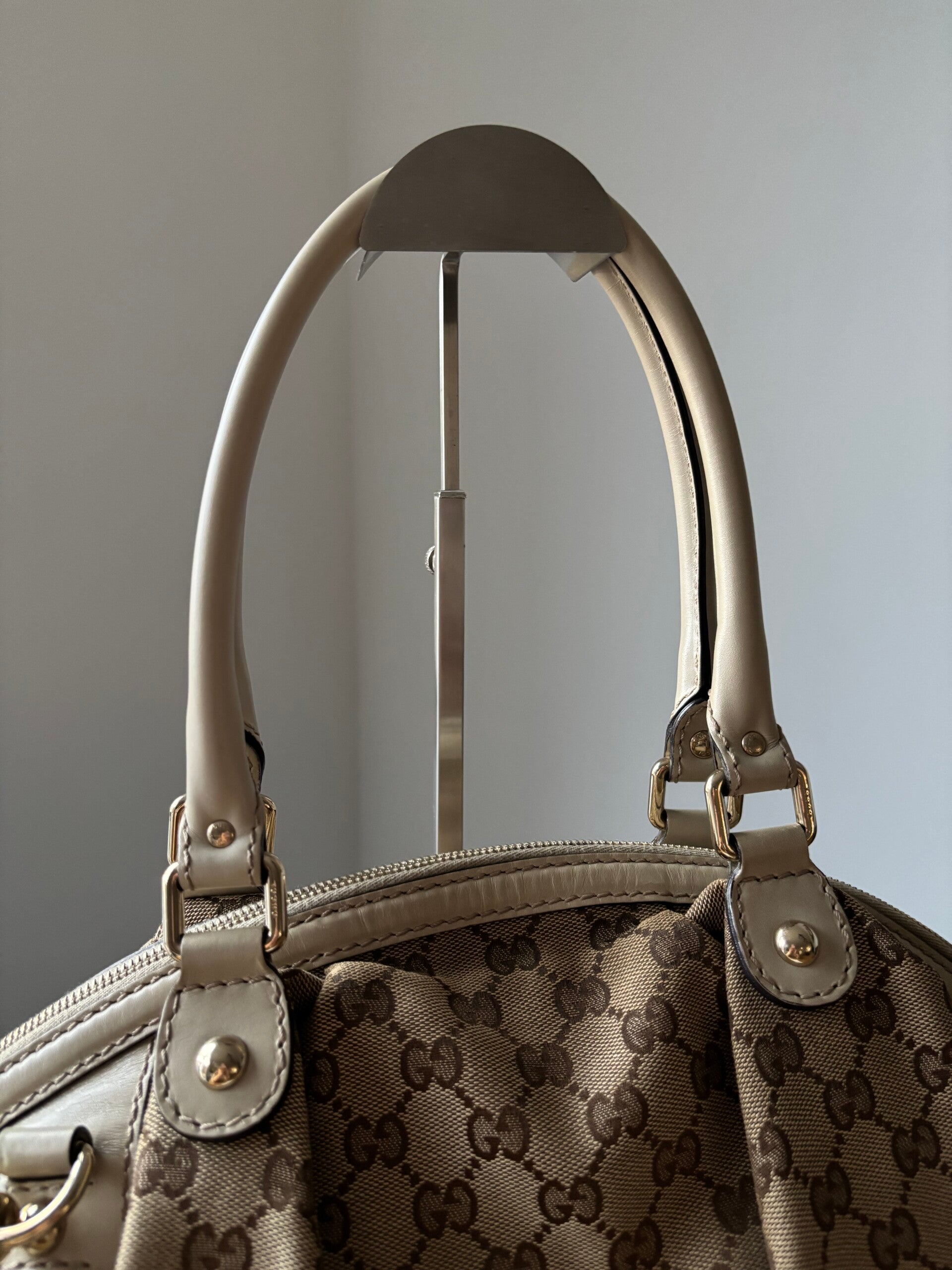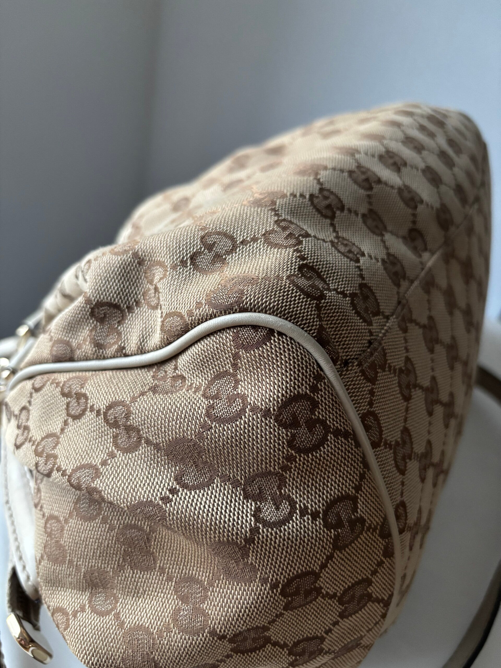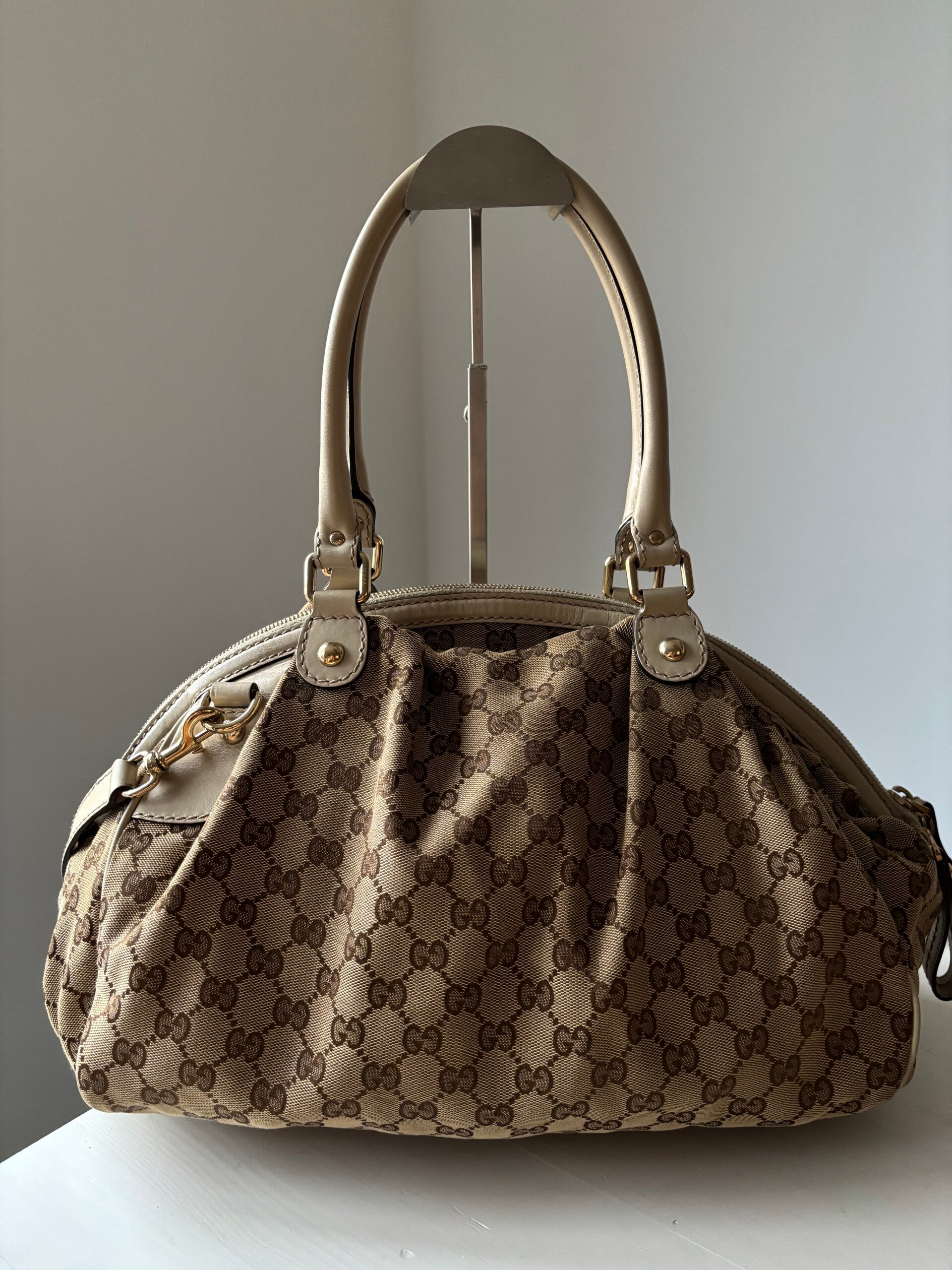 Gucci monogram Sukey in perfecte staat. Kan over de schouder worden gedragen. Er past een laptop in. De afmetingen zijn ongeveer 38 x 28 cm. Komt inclusief Veggel Vintage certificaat van authenticiteit en Gucci dustbag.