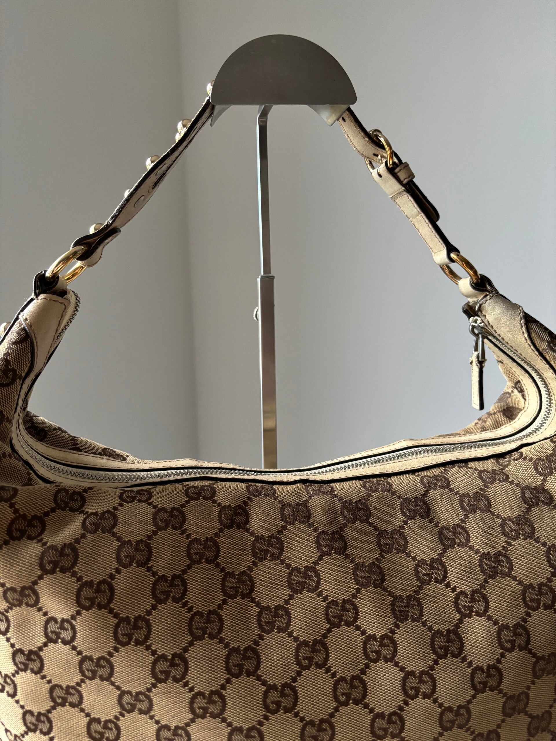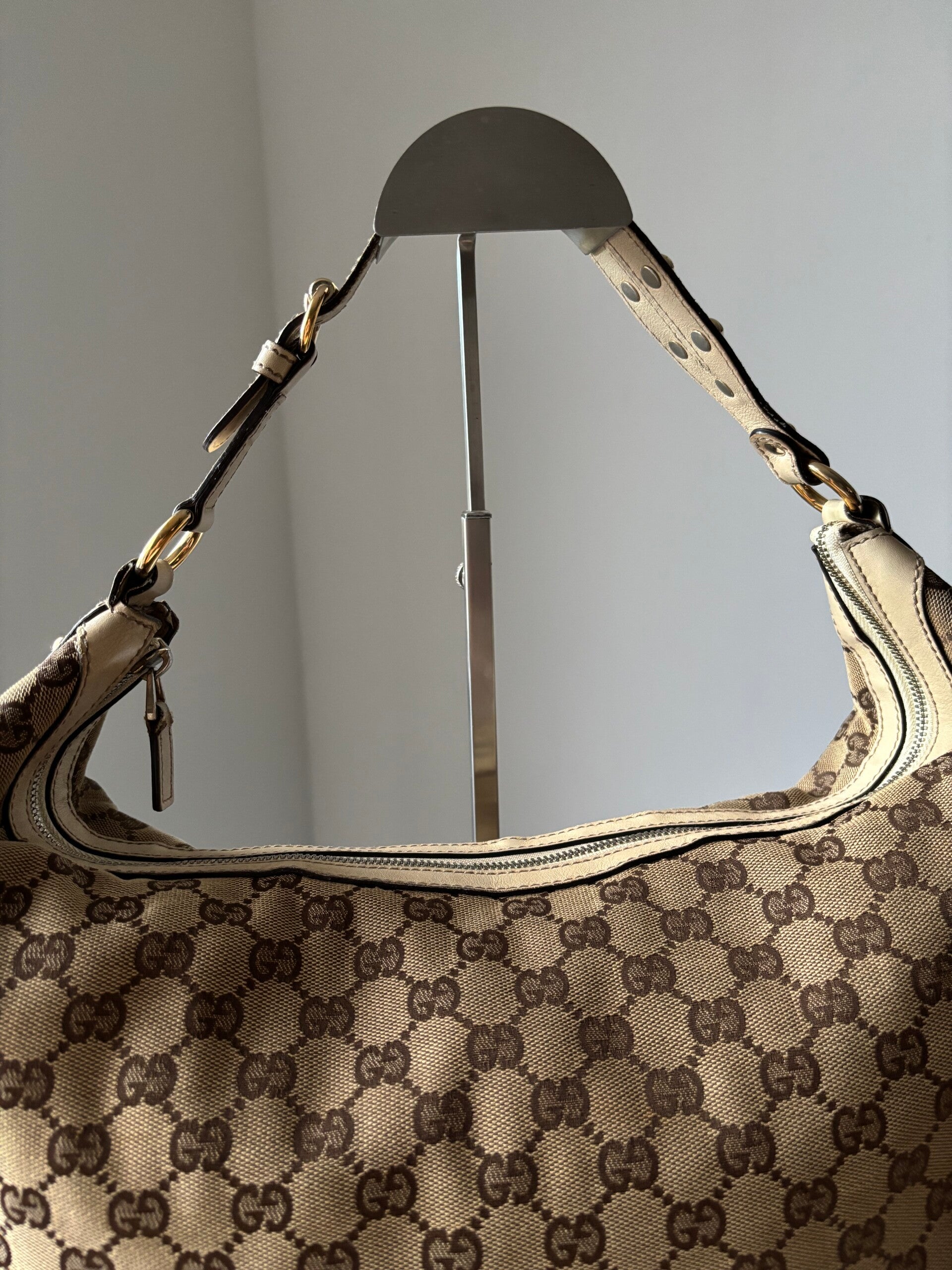 Gucci monogram hobo in zeer goede staat. Kan over de schouder worden gedragen. De afmetingen zijn ongeveer 40 x 30 cm. Komt inclusief Veggel Vintage certificaat van authenticiteit en Veggel Vintage dustbag.