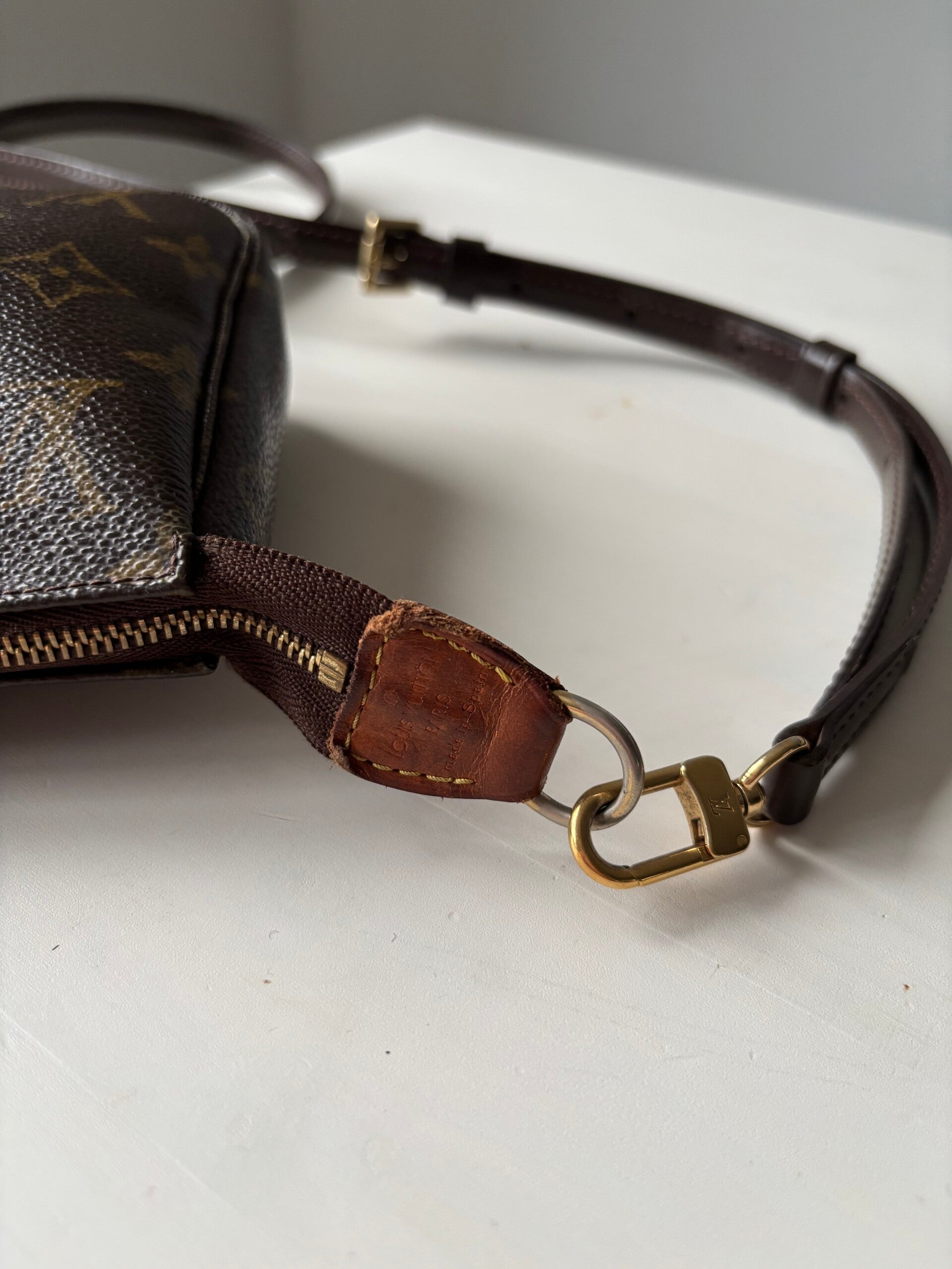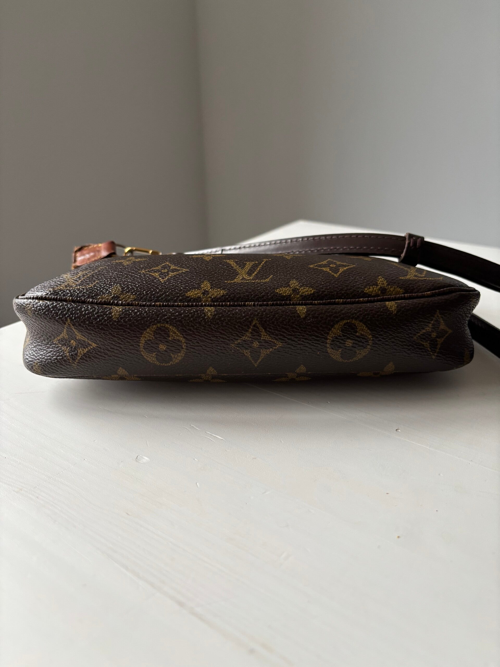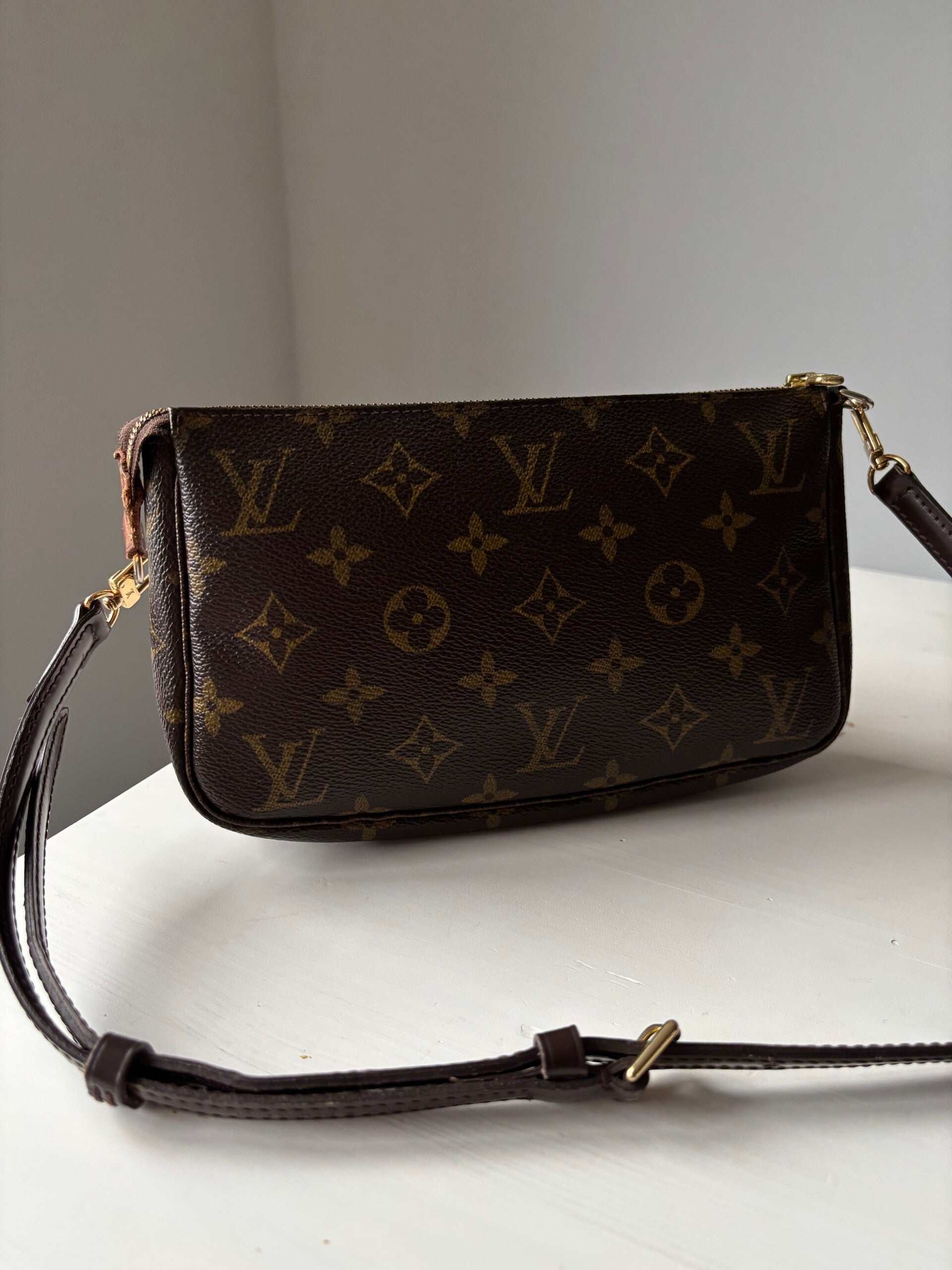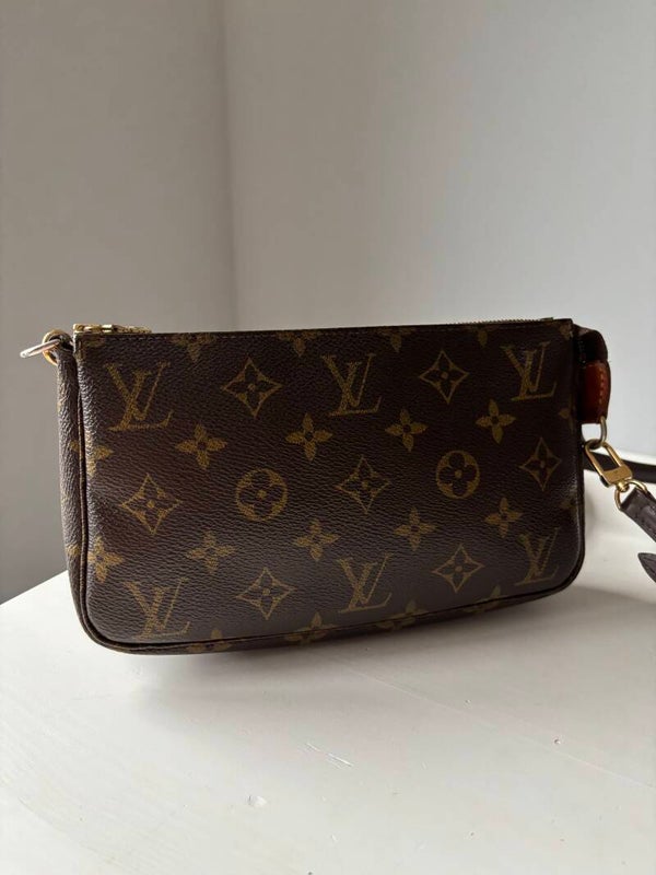 Louis Vuitton pochette accessoires in zeer goede staat. Aan de tas zit een Louis Vuitton crossbody strap bevestigd. Er zit een kopie van de factuur van de strap bij. De strap is verstelbaar. De afmetingen van de tas zijn ongeveer 22 x 13 cm. Komt inclusief Veggel Vintage certificaat van authenticiteit, Veggel Vintage dustbag en kopie van factuur van LV strap.