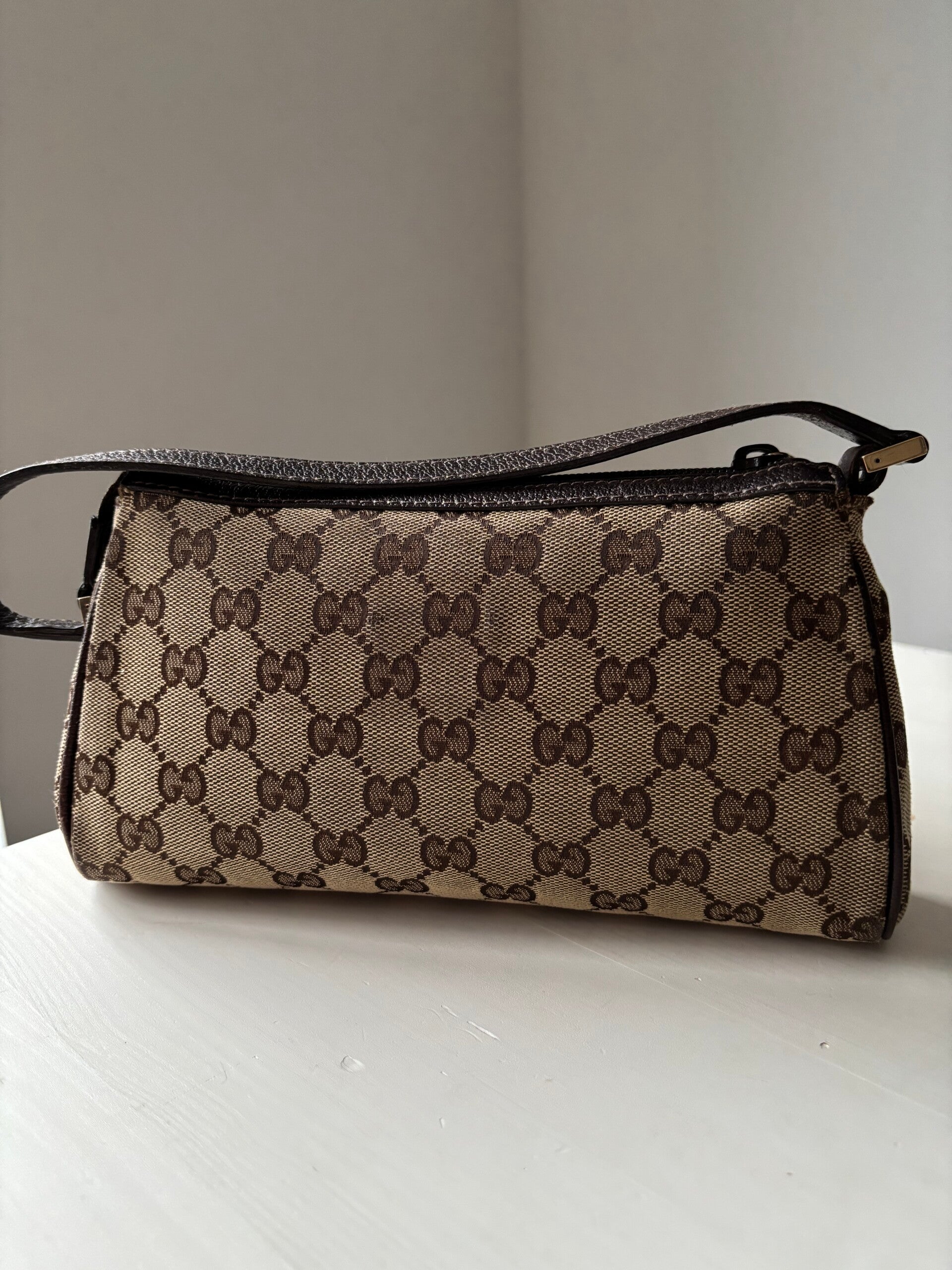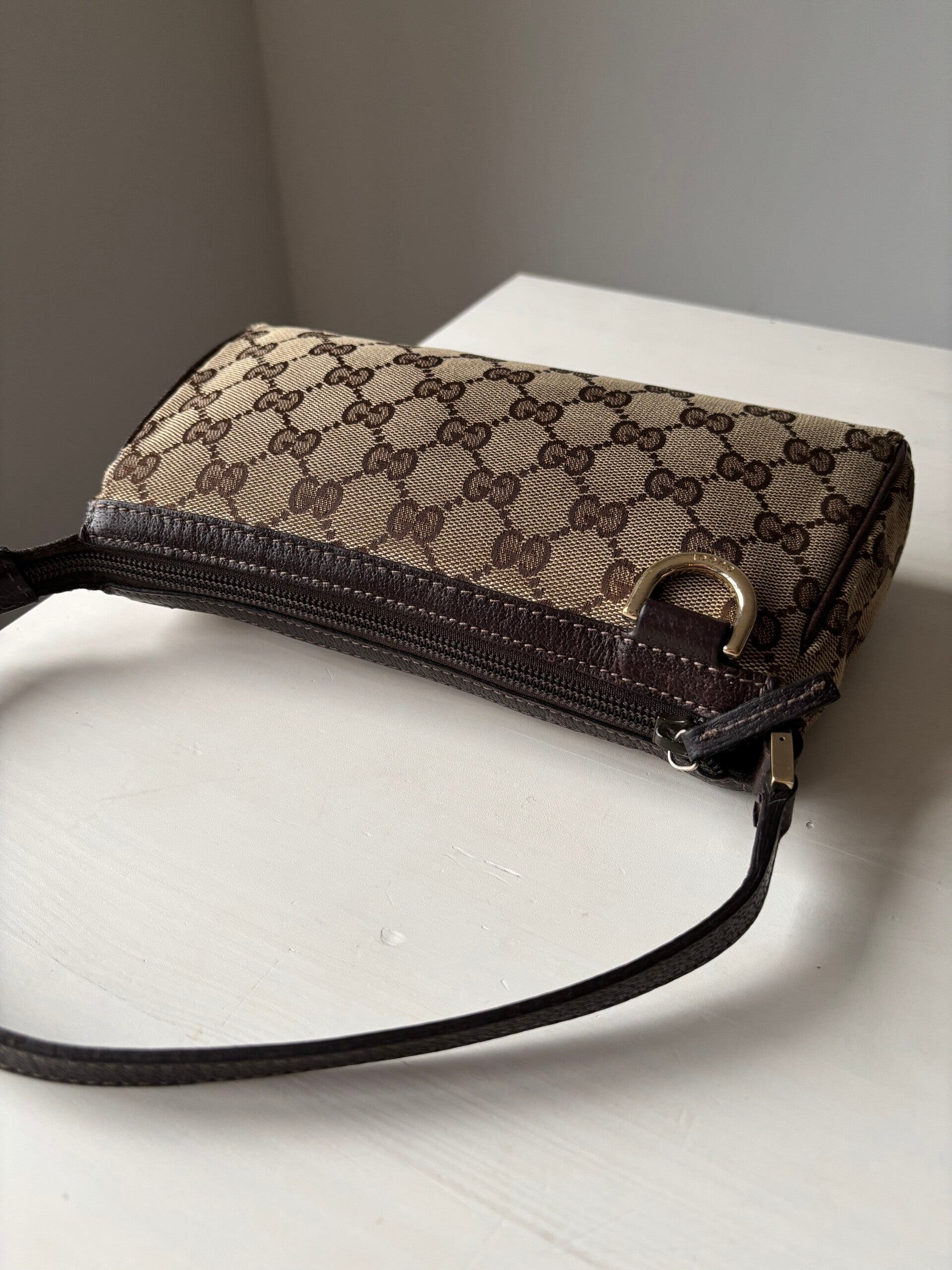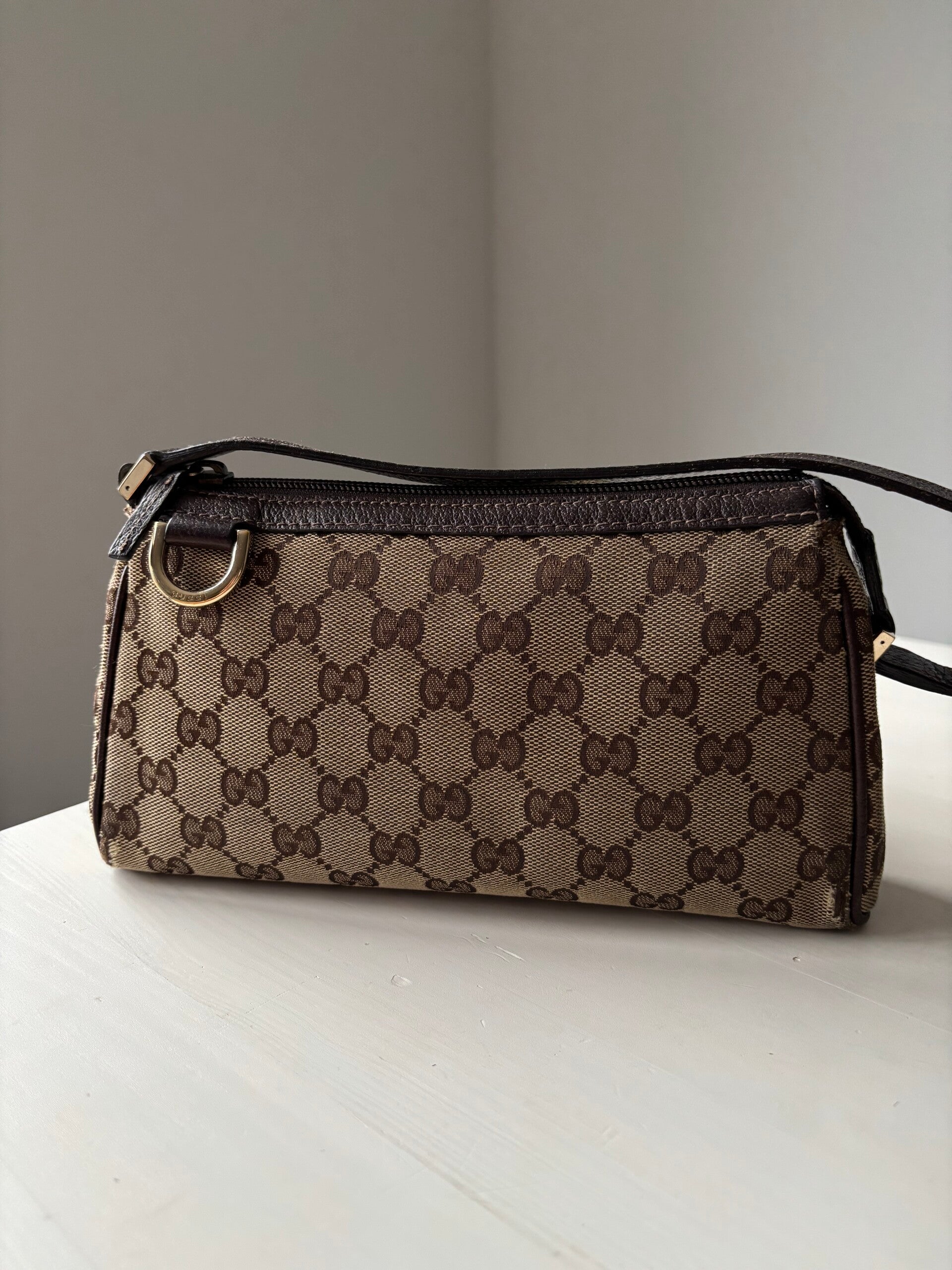 Gucci D ring pochette in goede staat. Kan over de schouder worden gedragen. De afmetingen zijn ongeveer 23 x 14 cm. Komt inclusief Veggel Vintage certificaat van authenticiteit en Veggel Vintage dustbag.