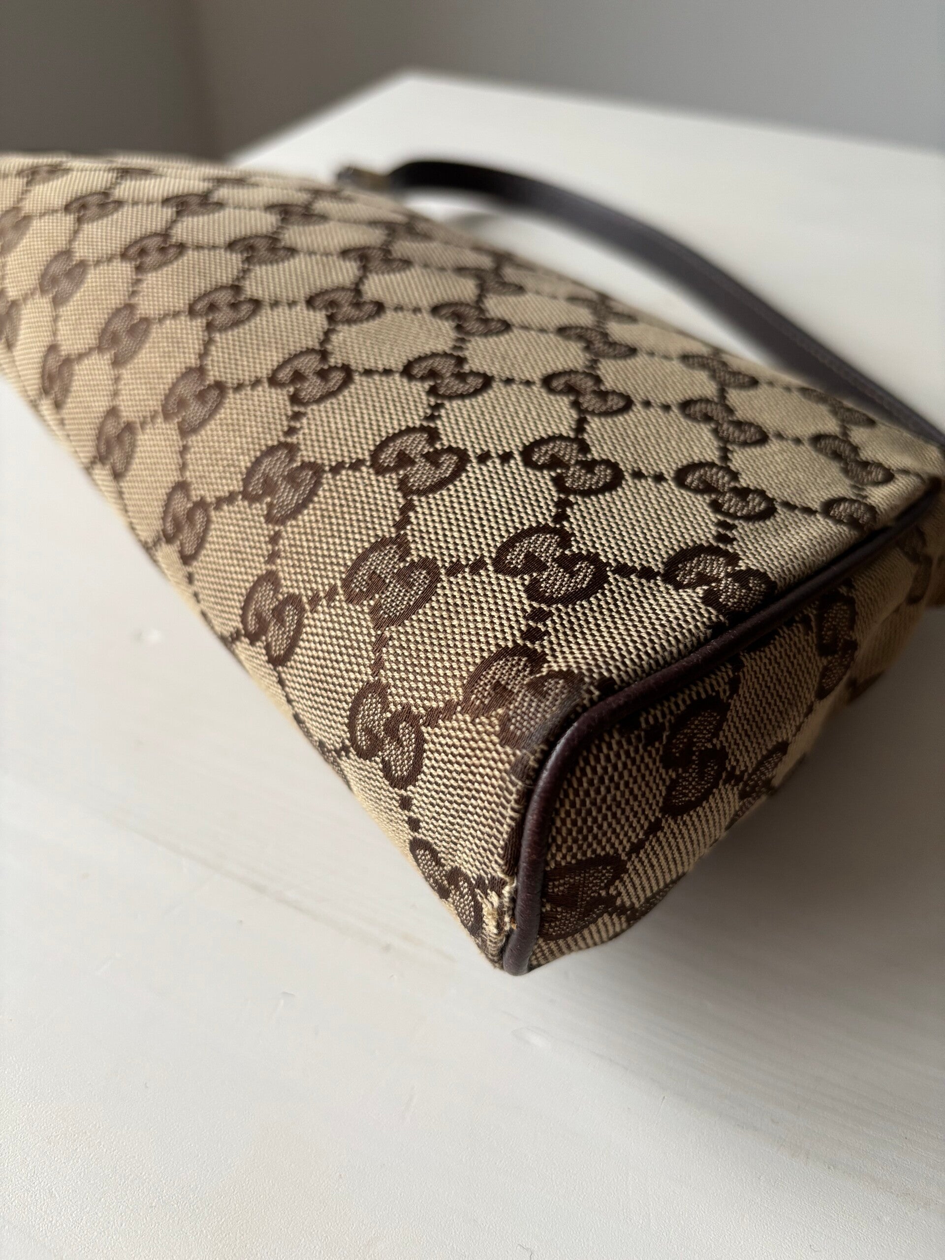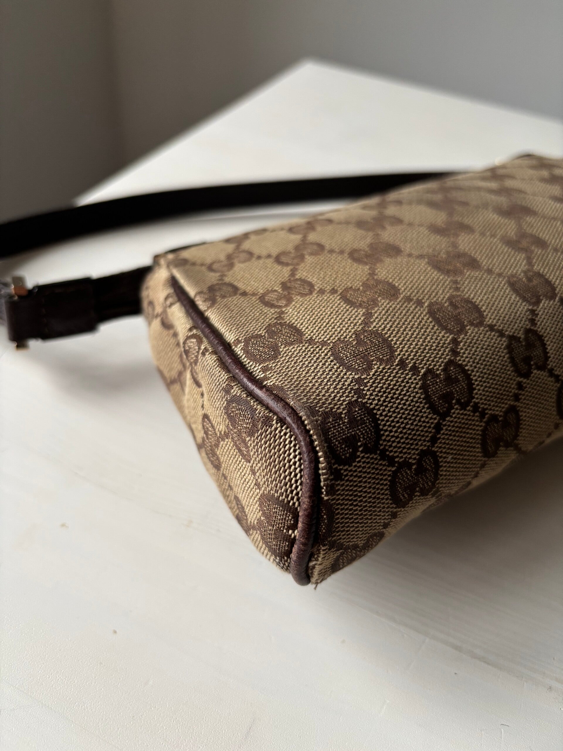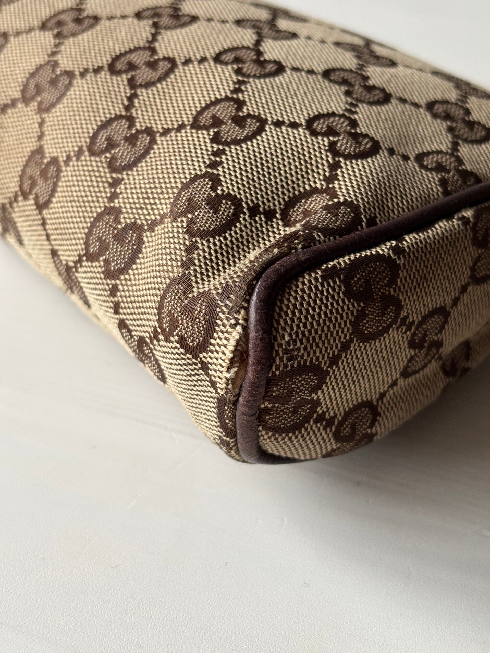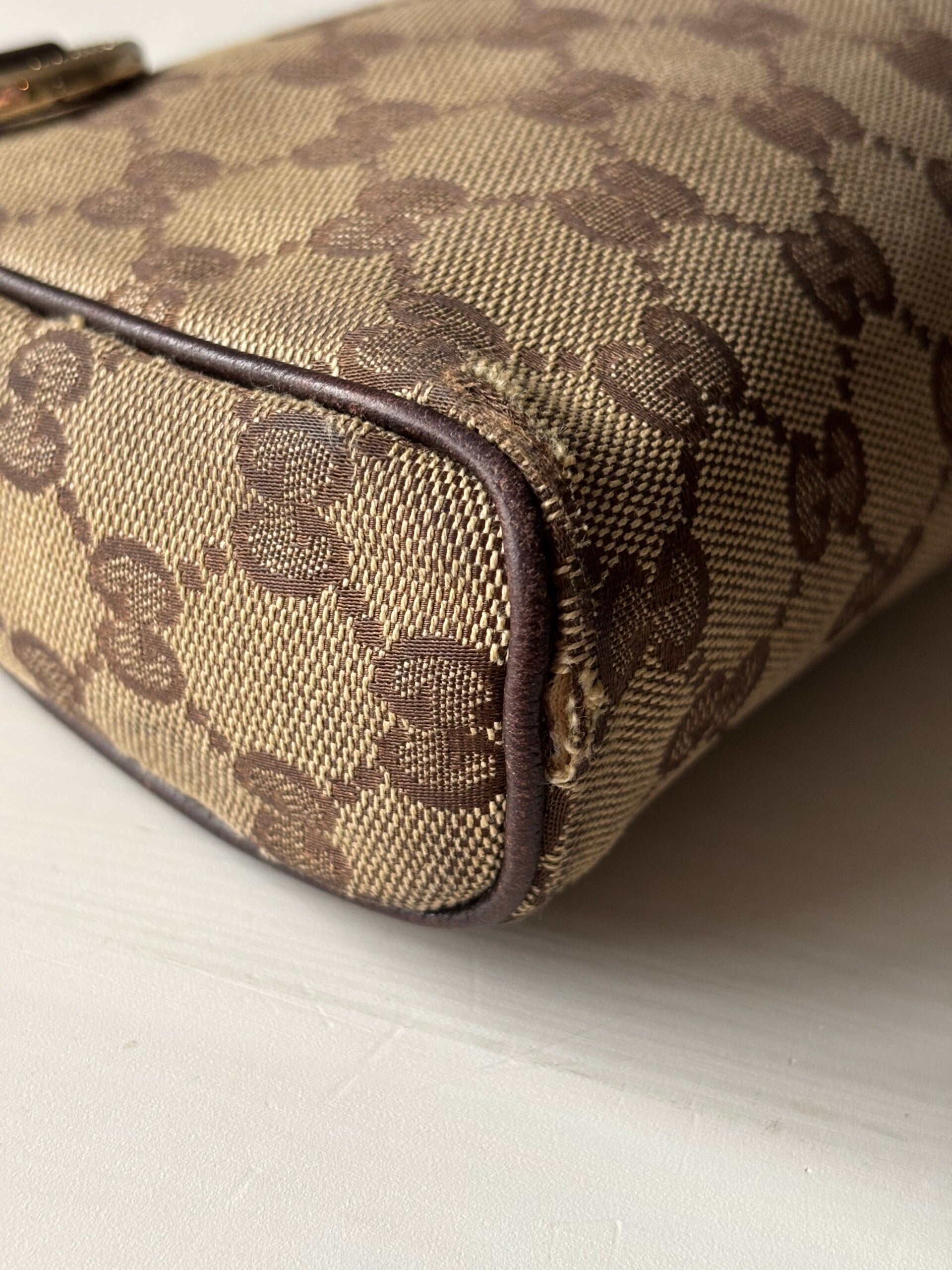Gucci D ring pochette in goede staat. Kan over de schouder worden gedragen. De afmetingen zijn ongeveer 23 x 14 cm. Komt inclusief Veggel Vintage certificaat van authenticiteit en Veggel Vintage dustbag.