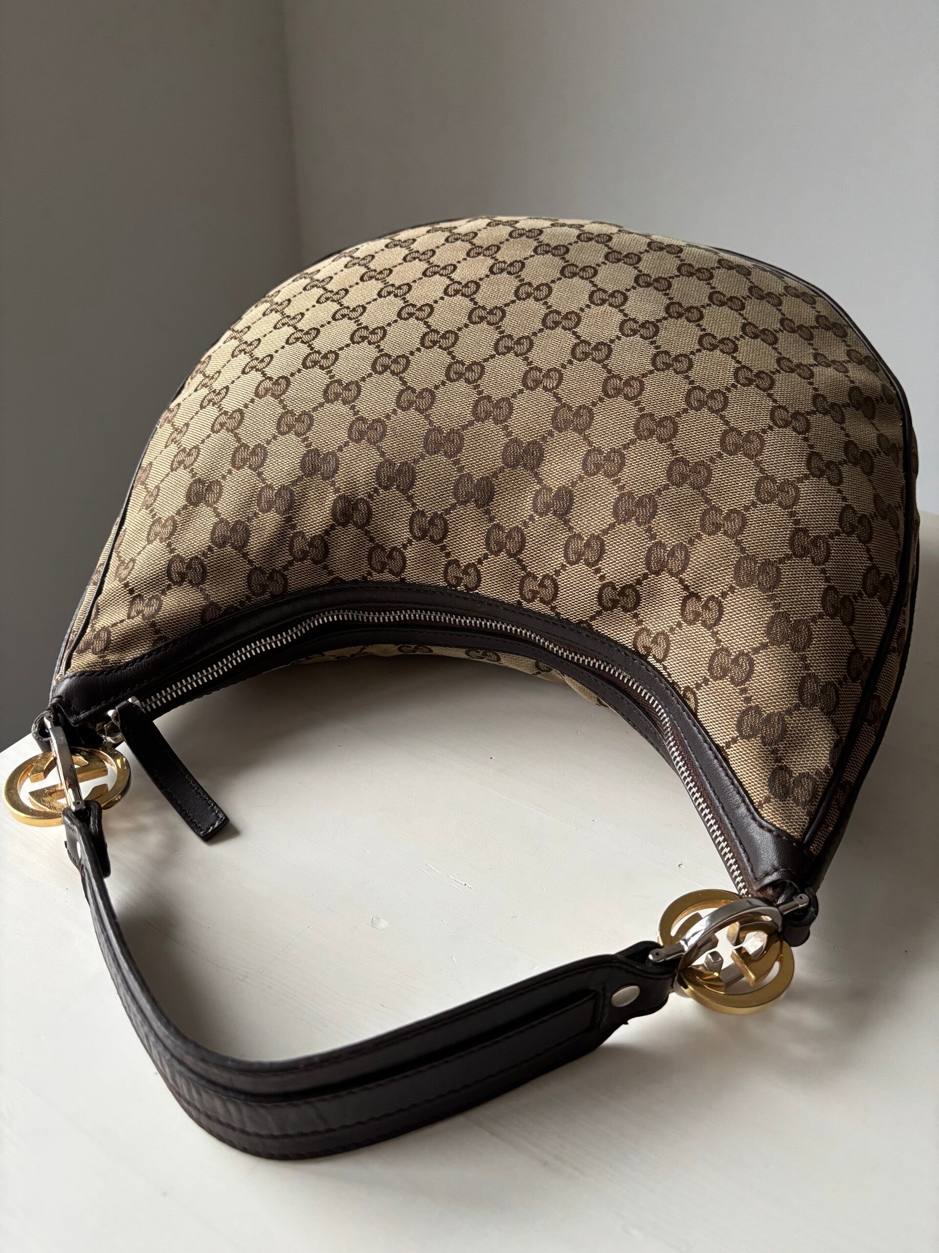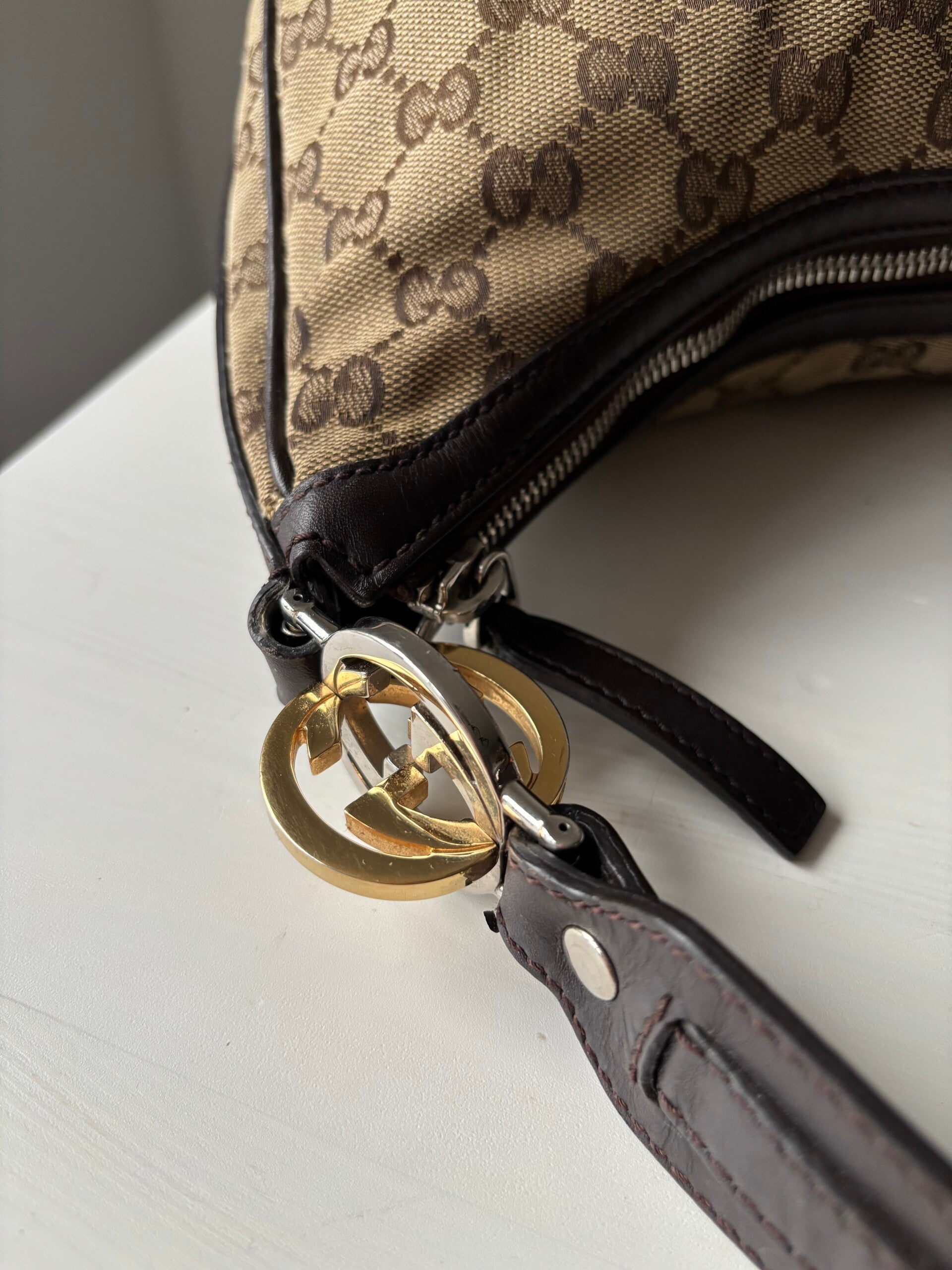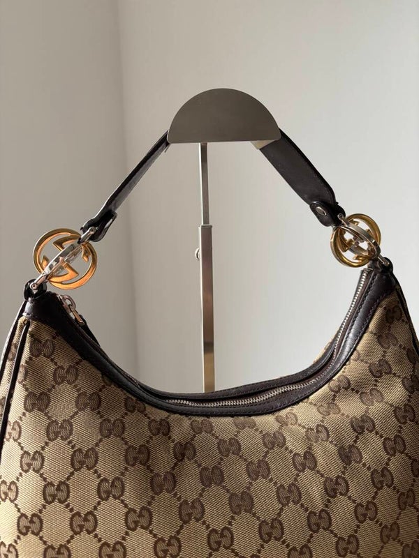 Gucci monogram twins hobo in zeer goede staat. Kan over de schouder worden gedragen. De afmetingen zijn ongeveer 32 x 28 cm. Komt inclusief Veggel Vintage certificaat van authenticiteit en Veggel Vintage dustbag.