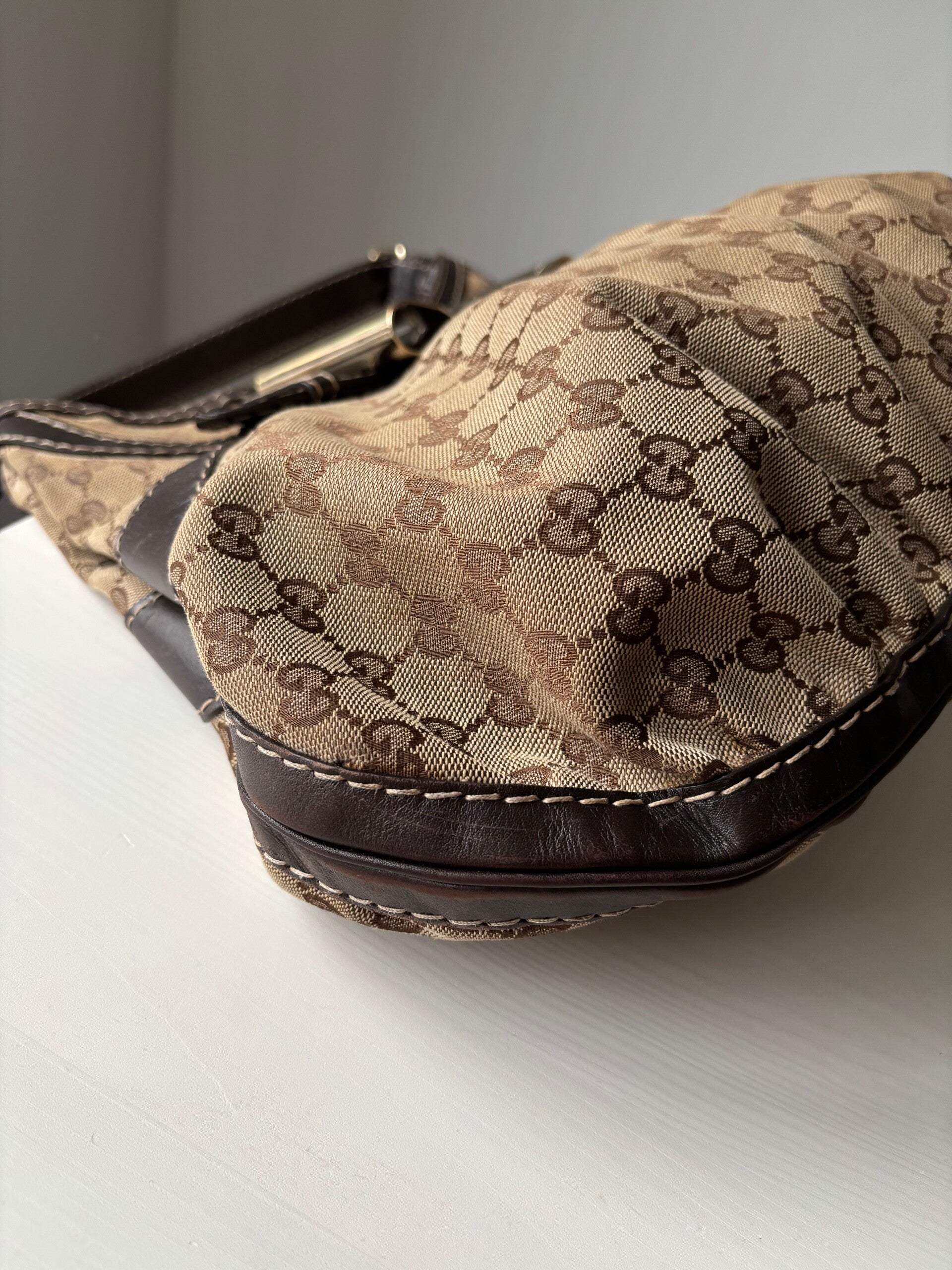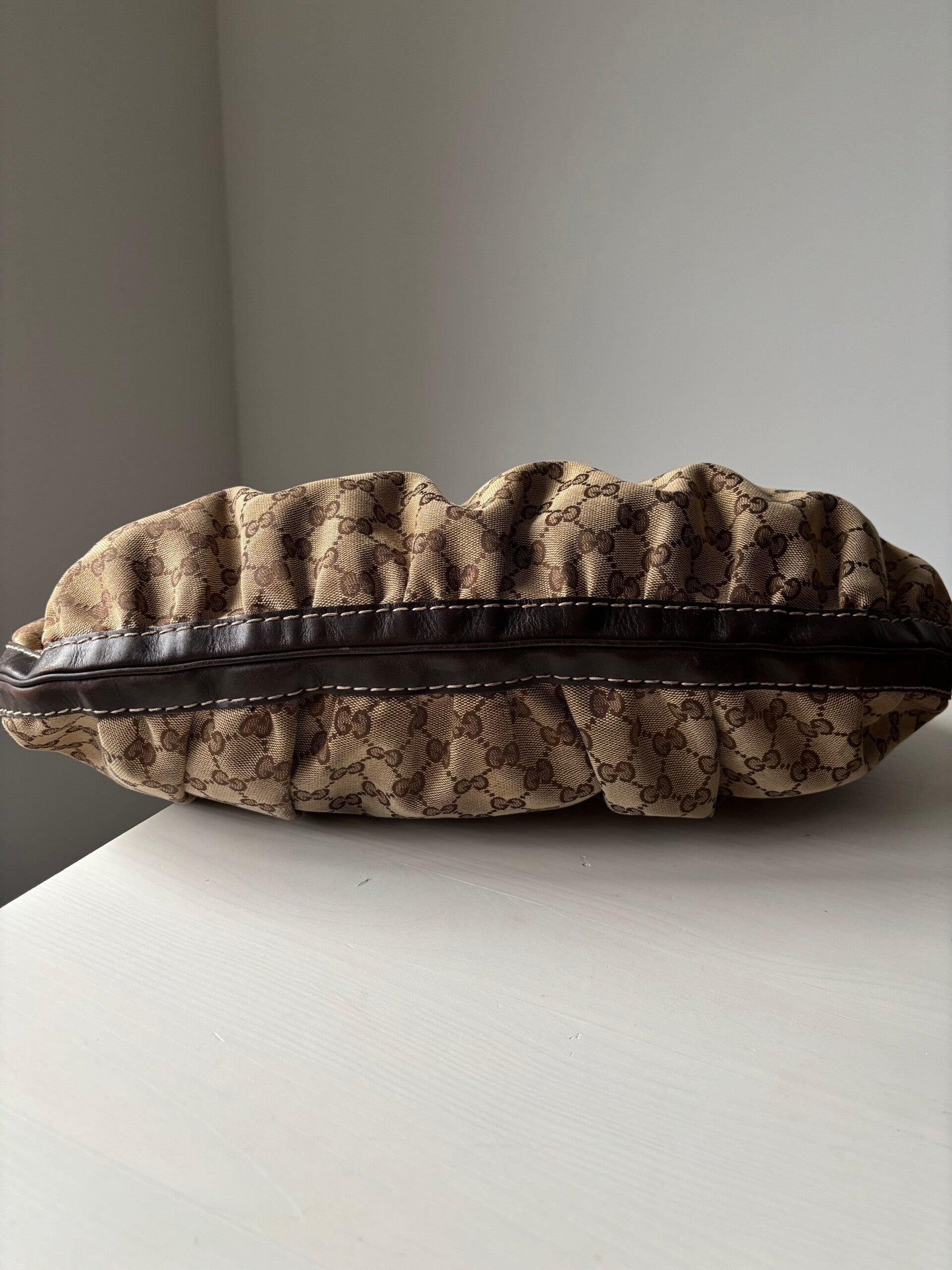 Gucci monogram hobo in zeer goede staat. Kan over de schouder worden gedragen. De afmetingen zijn ongeveer 30 x 40 cm. Er past een laptop in. Komt inclusief Veggel Vintage certificaat van authenticiteit.