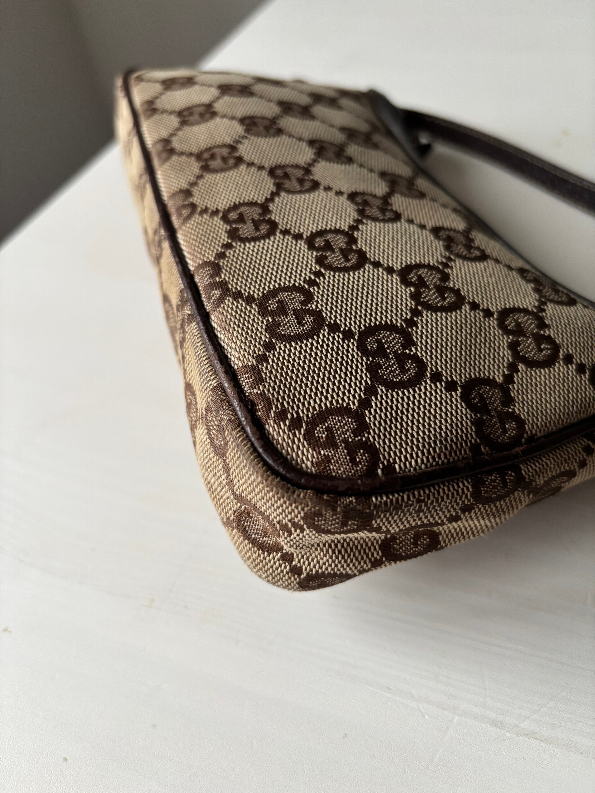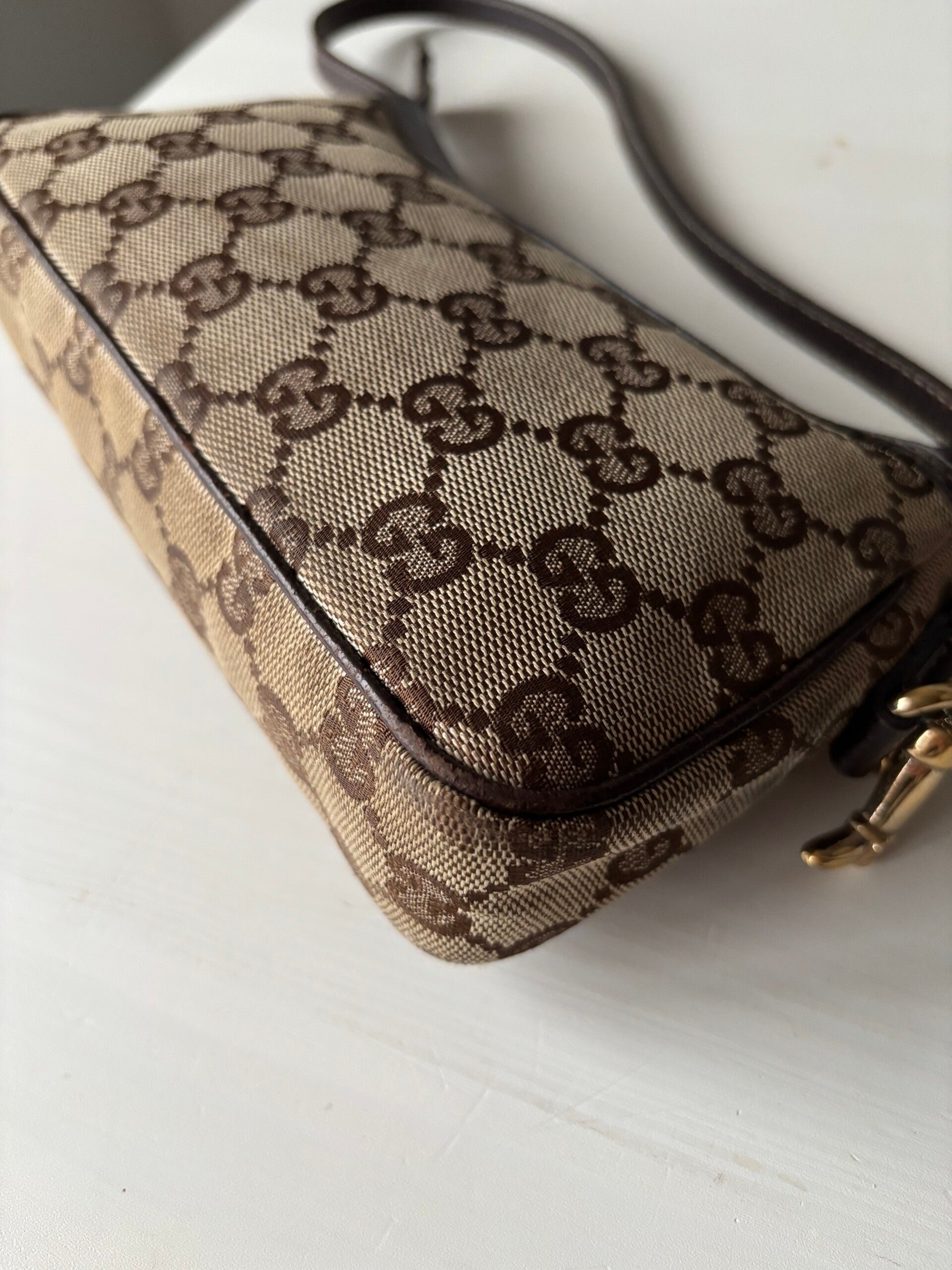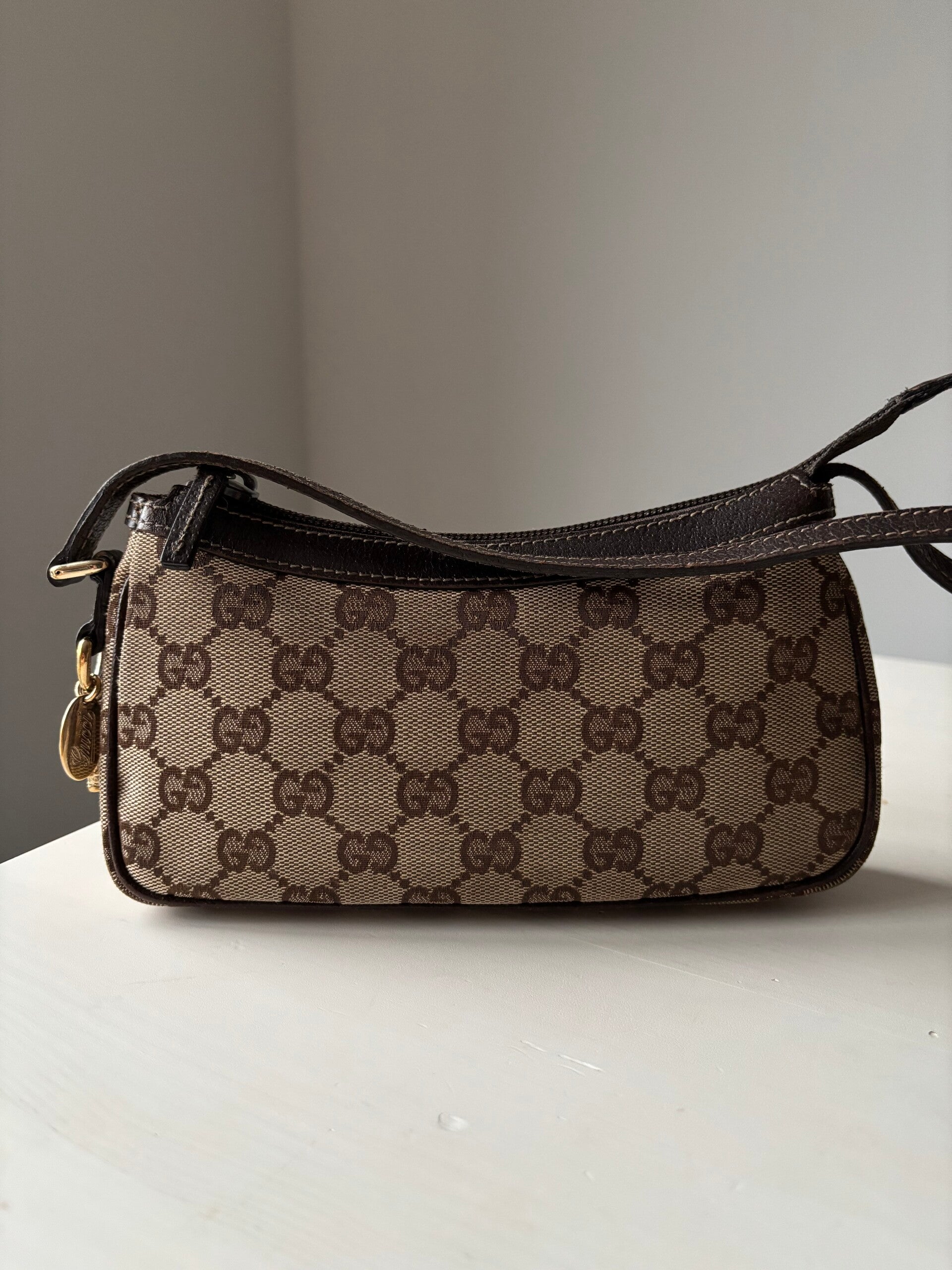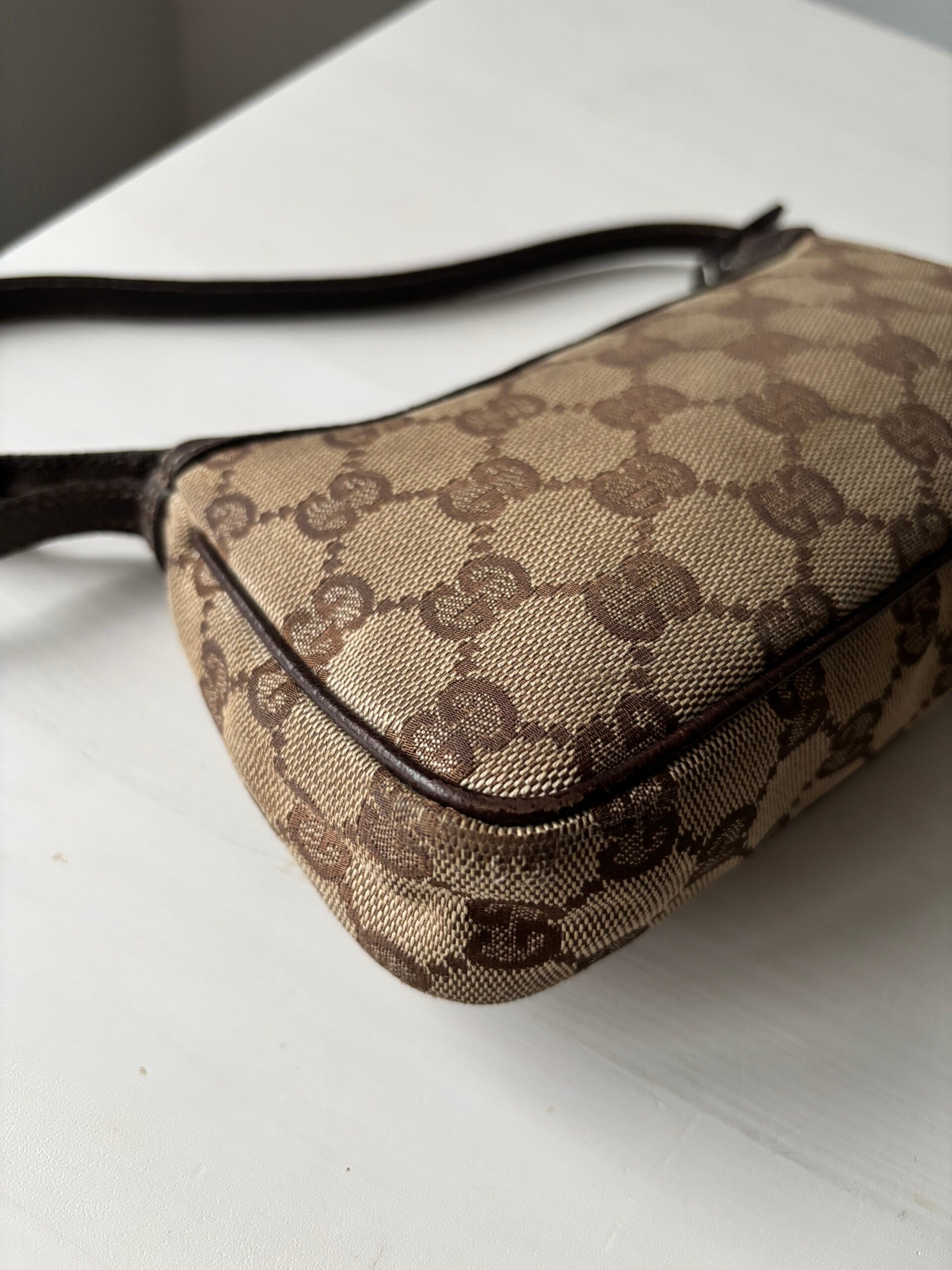 Gucci monogram pochette in zeer goede staat. Kan over de schouder worden gedragen. De afmetingen zijn ongeveer 20 x 10 cm. Komt inclusief Veggel Vintage certificaat van authenticiteit en Veggel Vintage dustbag.