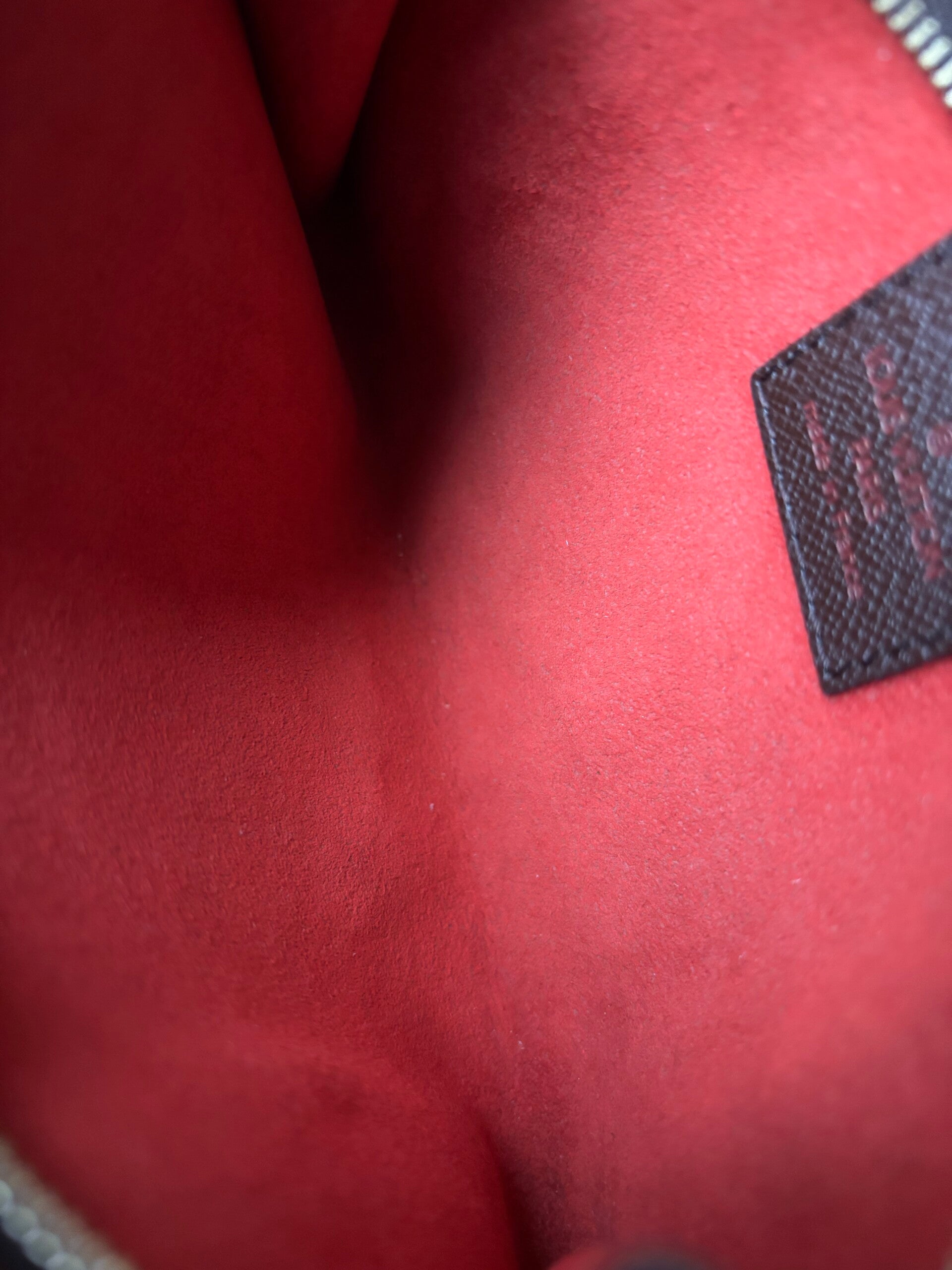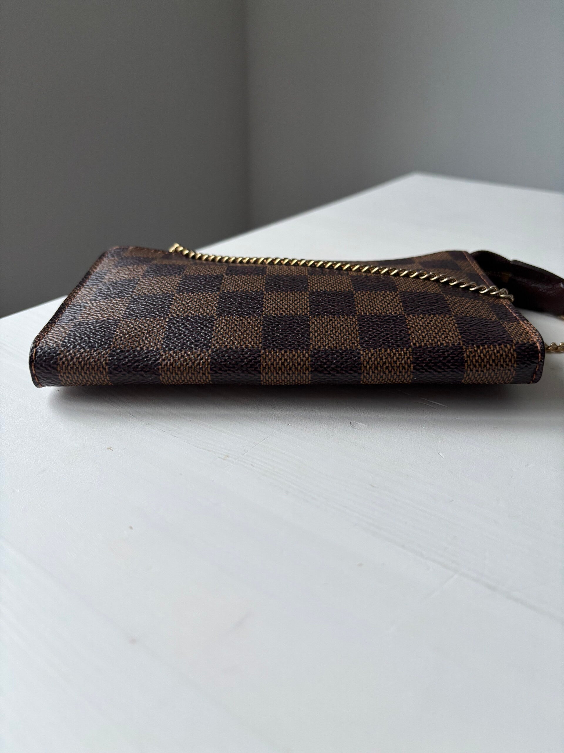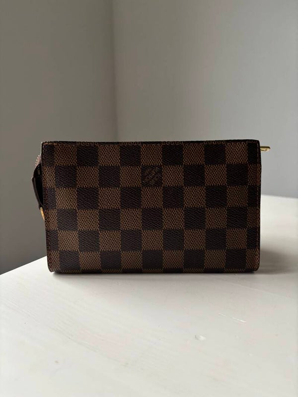 Louis Vuitton damier pochette in nieuwstaat. Kan over de schouder worden gedragen. De afmetingen zijn ongeveer 17 x 11 cm. Komt inclusief Veggel Vintage certificaat van authenticiteit en Veggel Vintage dustbag.