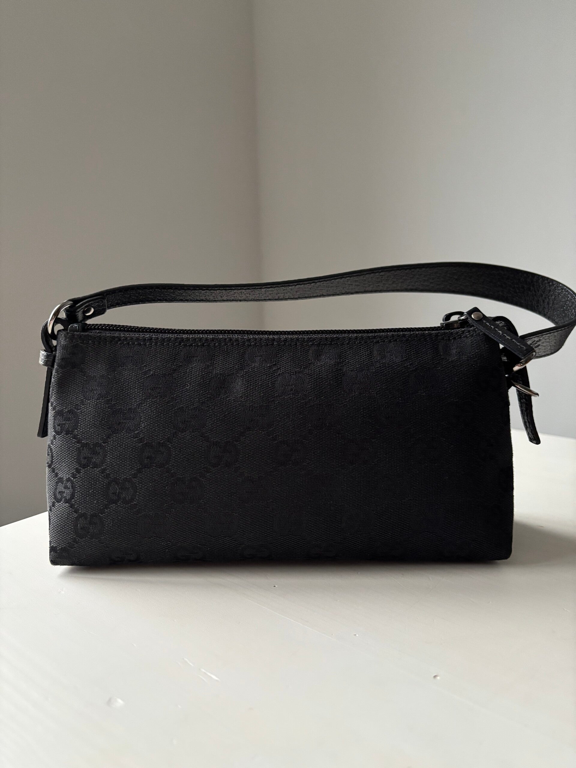 Gucci monogram pochette in nieuwstaat. In de schouder worden gedragen. De afmetingen zijn ongeveer 21 x 12 cm. Komt inclusief Veggel Vintage certificaat van authenticiteit en Gucci dustbag.
