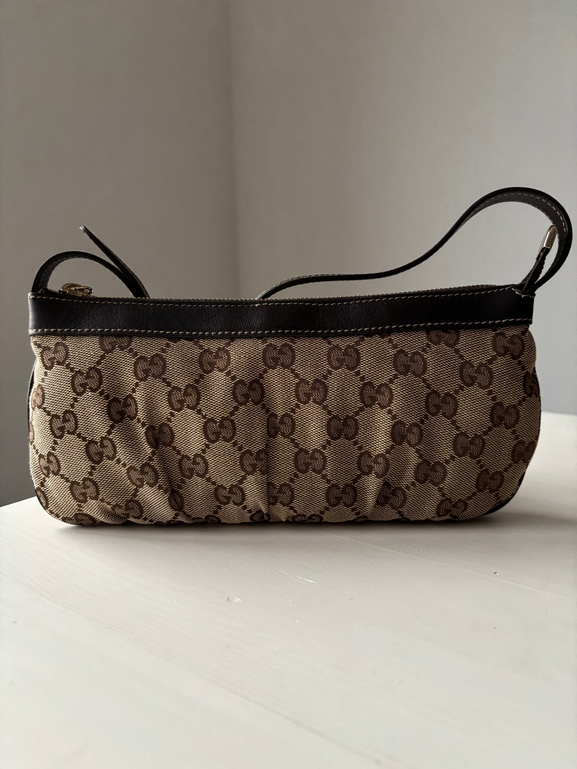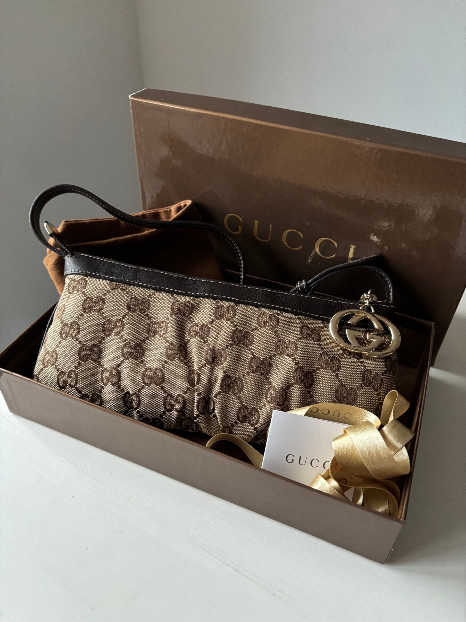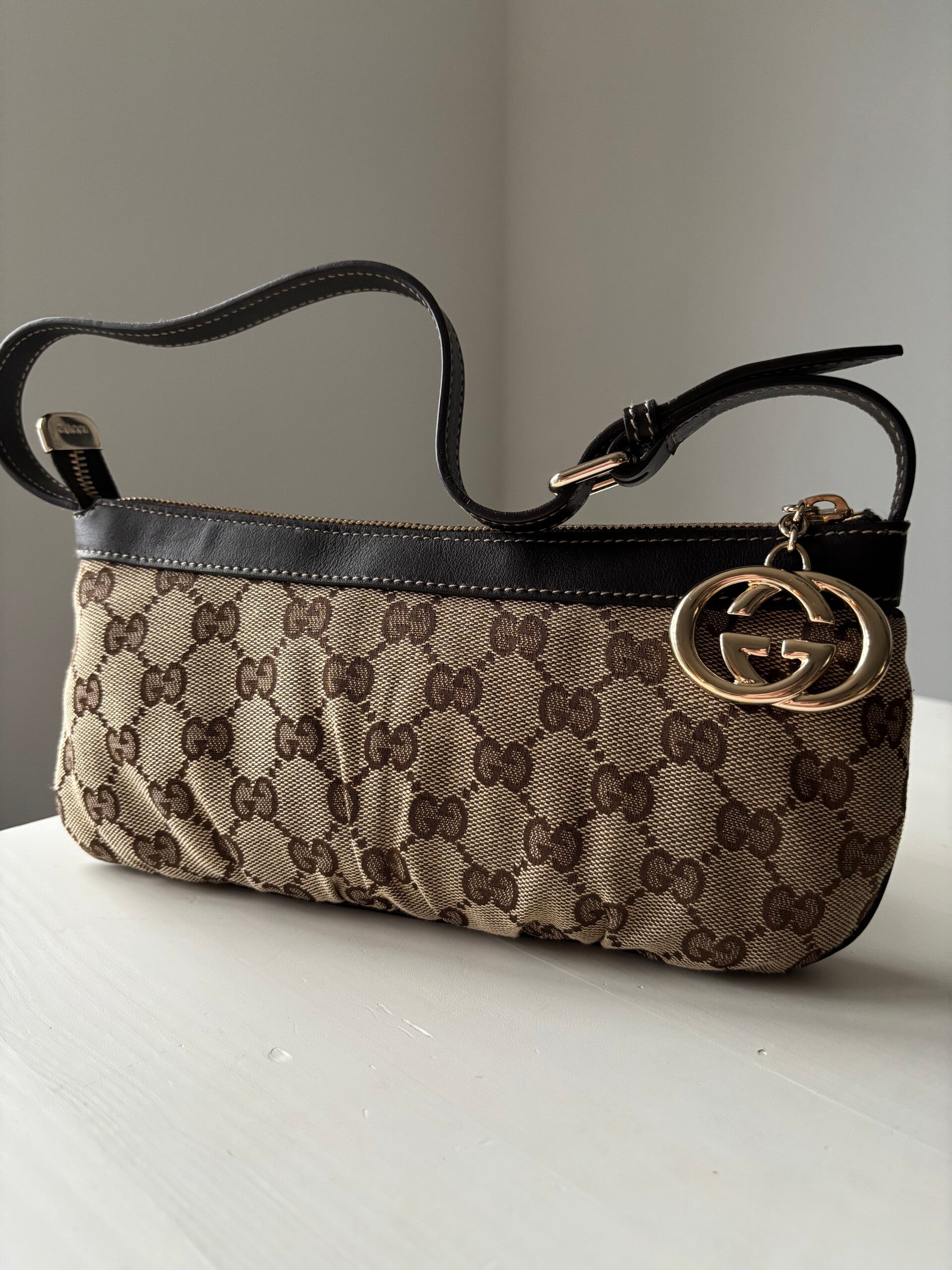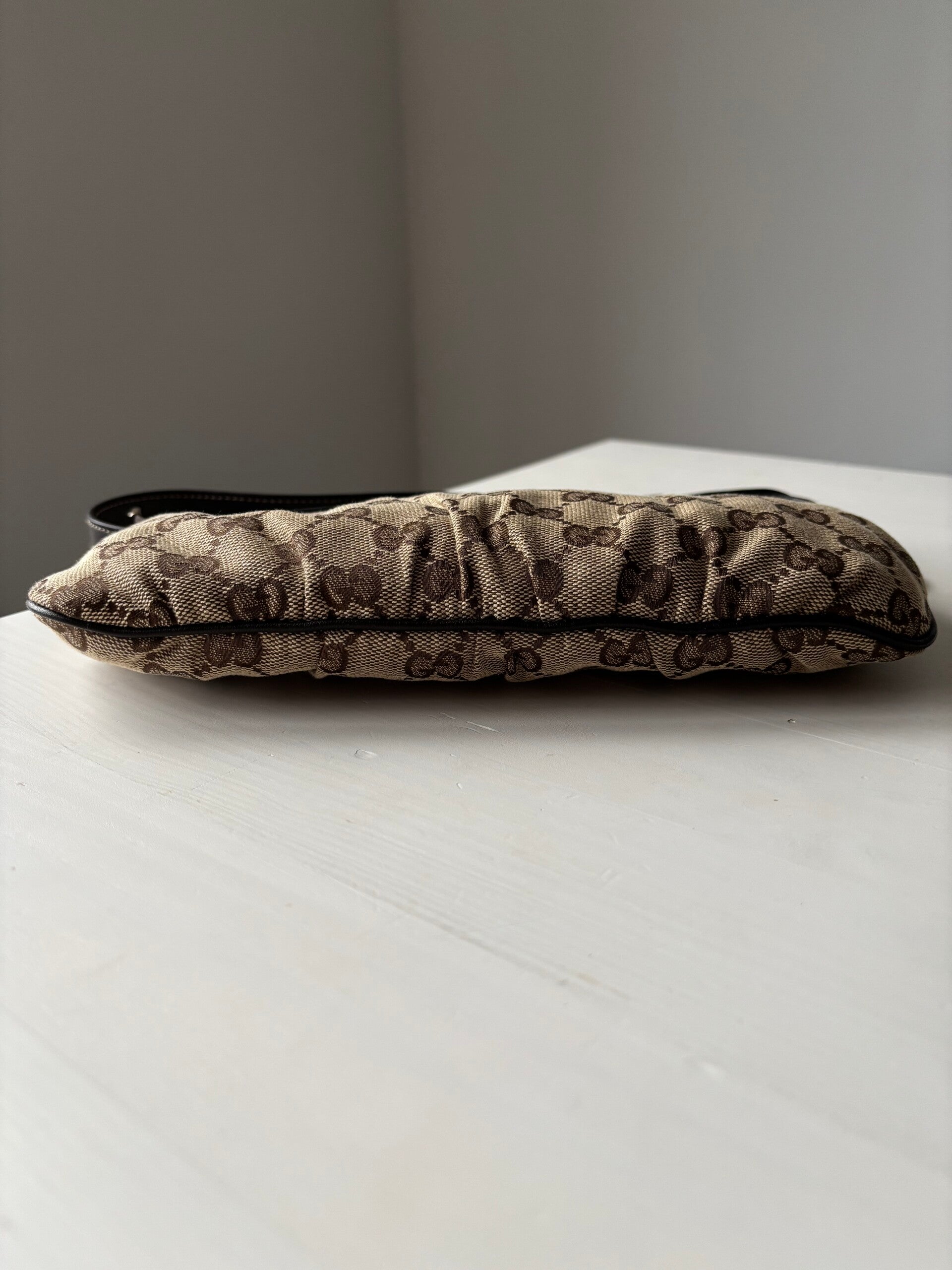 Gucci monogram pochette in nieuwstaat. Kan over de schouder worden gedragen. De afmetingen zijn ongeveer 25 x 12 cm. Komt inclusief Veggel Vintage certificaat van authenticiteit, Gucci doos en Gucci dustbag.