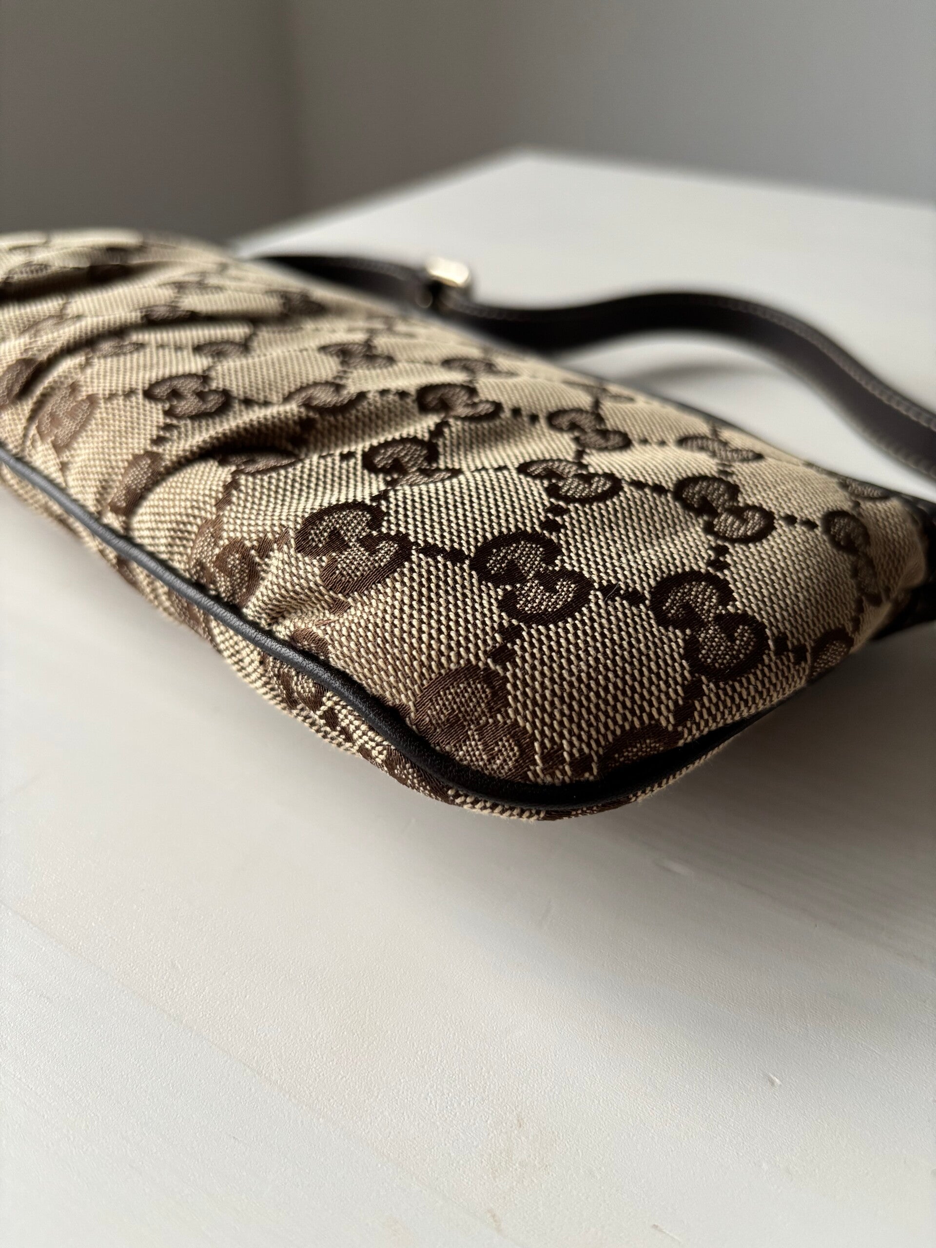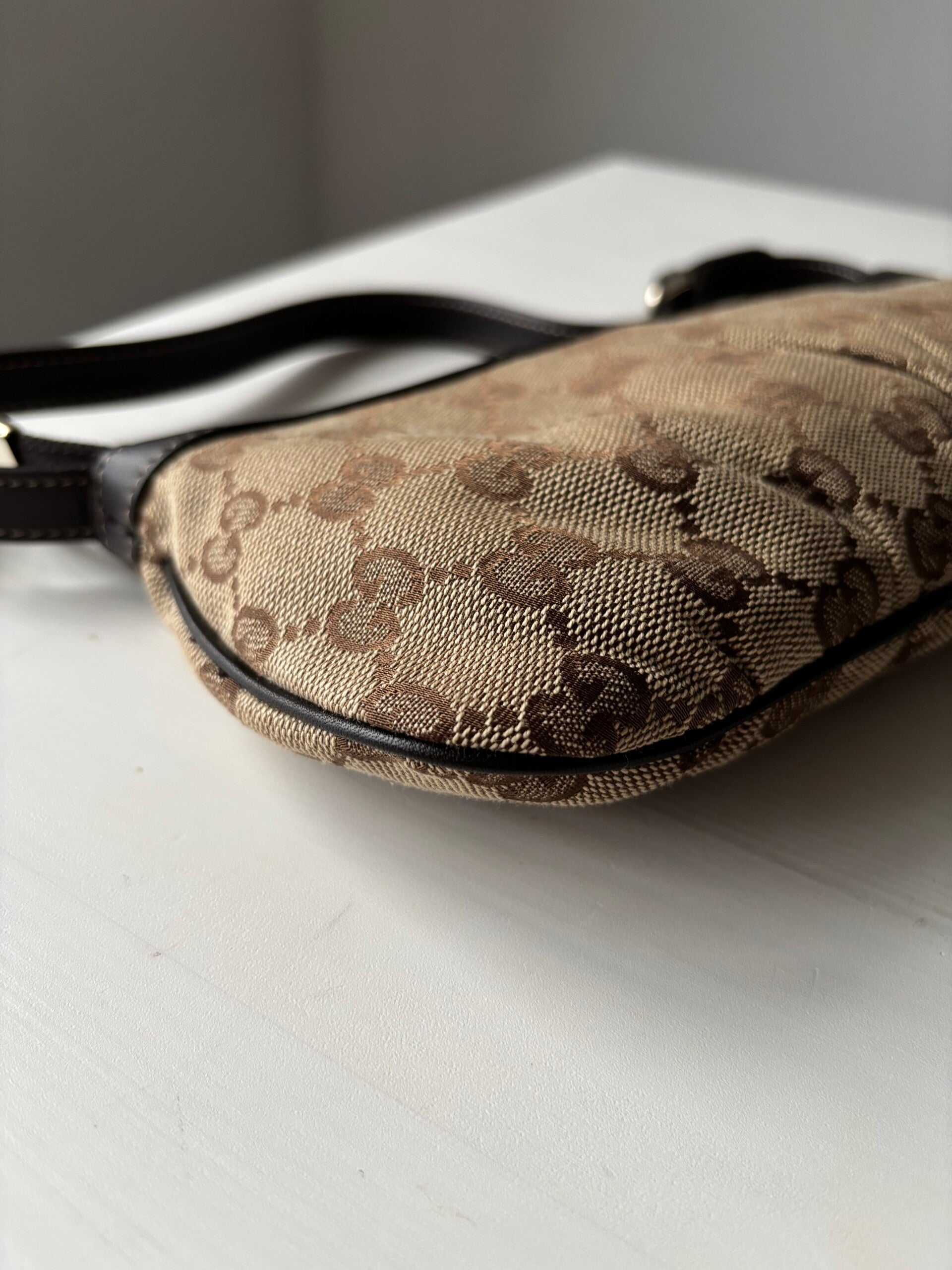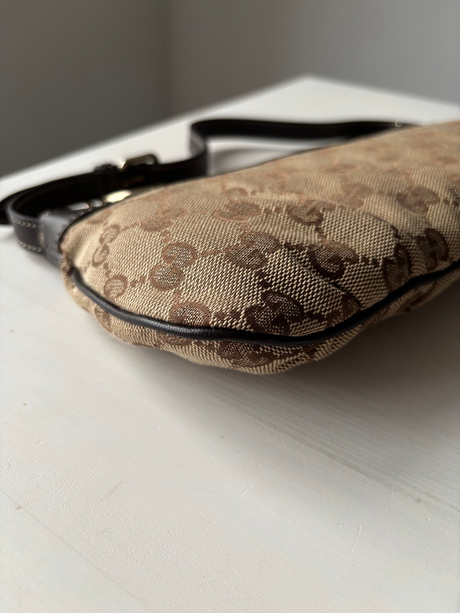 Gucci monogram pochette in nieuwstaat. Kan over de schouder worden gedragen. De afmetingen zijn ongeveer 25 x 12 cm. Komt inclusief Veggel Vintage certificaat van authenticiteit, Gucci doos en Gucci dustbag.