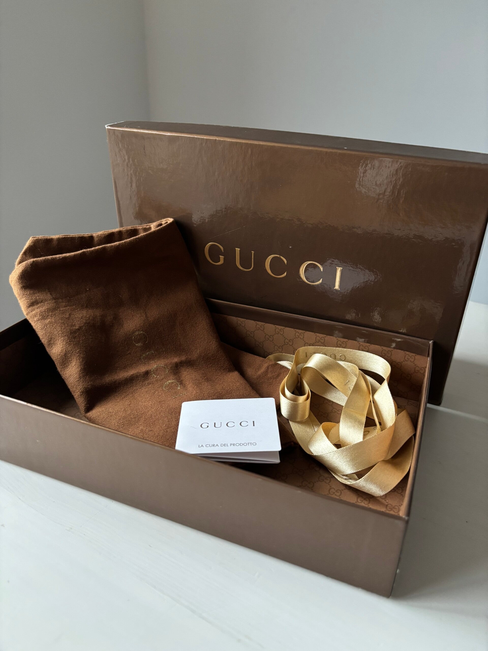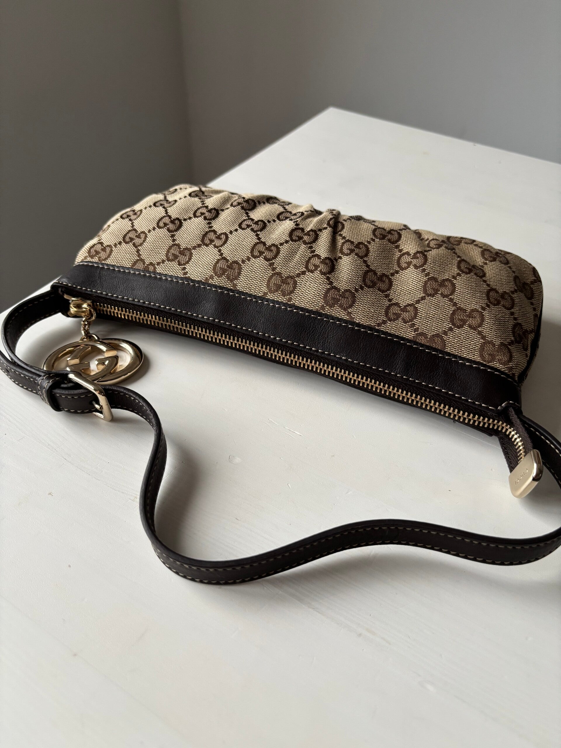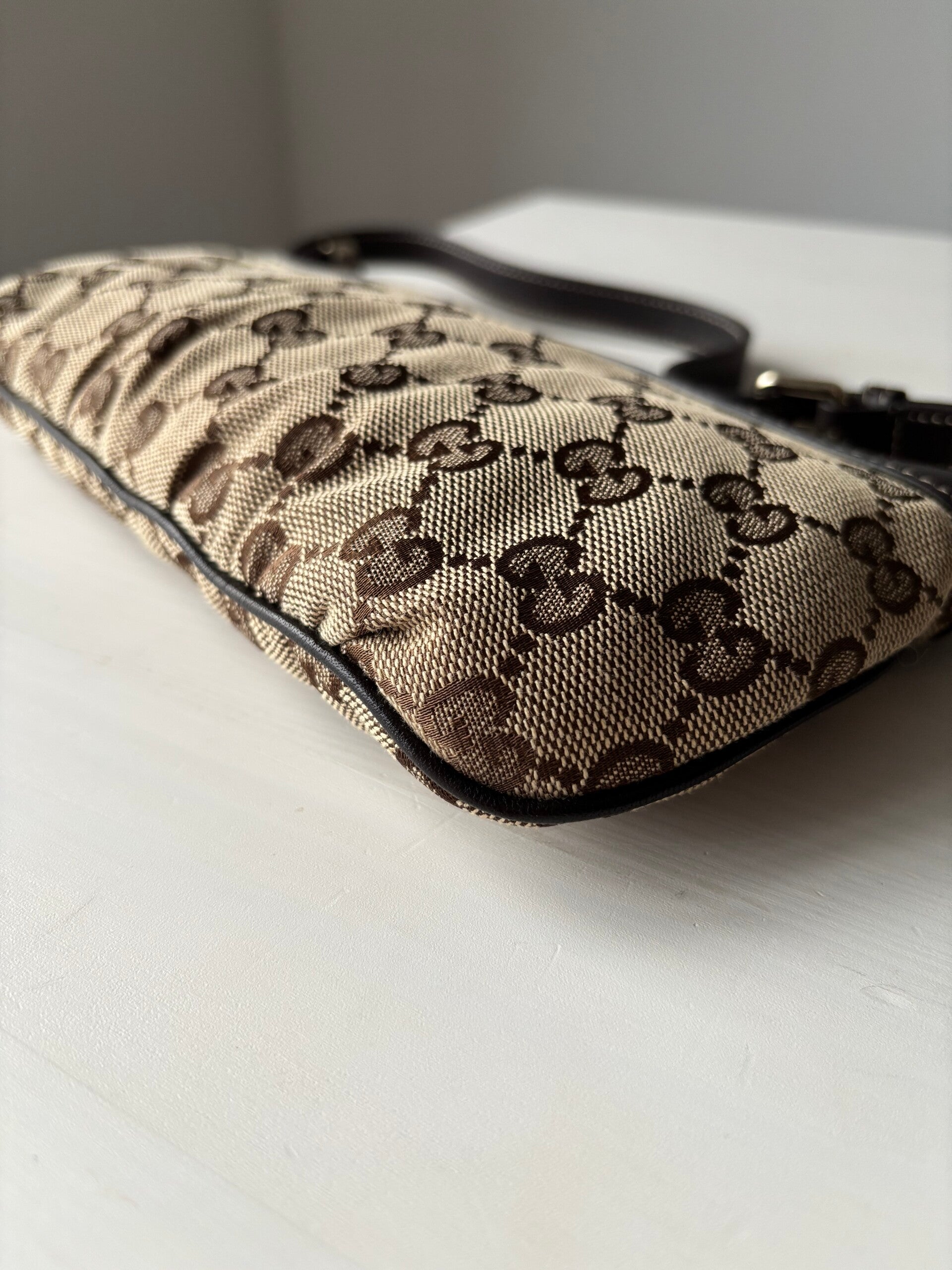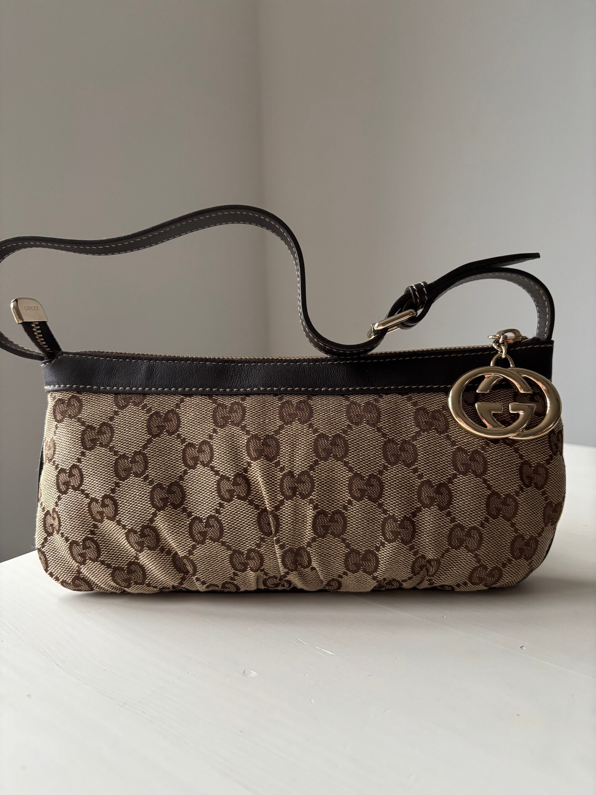 Gucci monogram pochette in nieuwstaat. Kan over de schouder worden gedragen. De afmetingen zijn ongeveer 25 x 12 cm. Komt inclusief Veggel Vintage certificaat van authenticiteit, Gucci doos en Gucci dustbag.