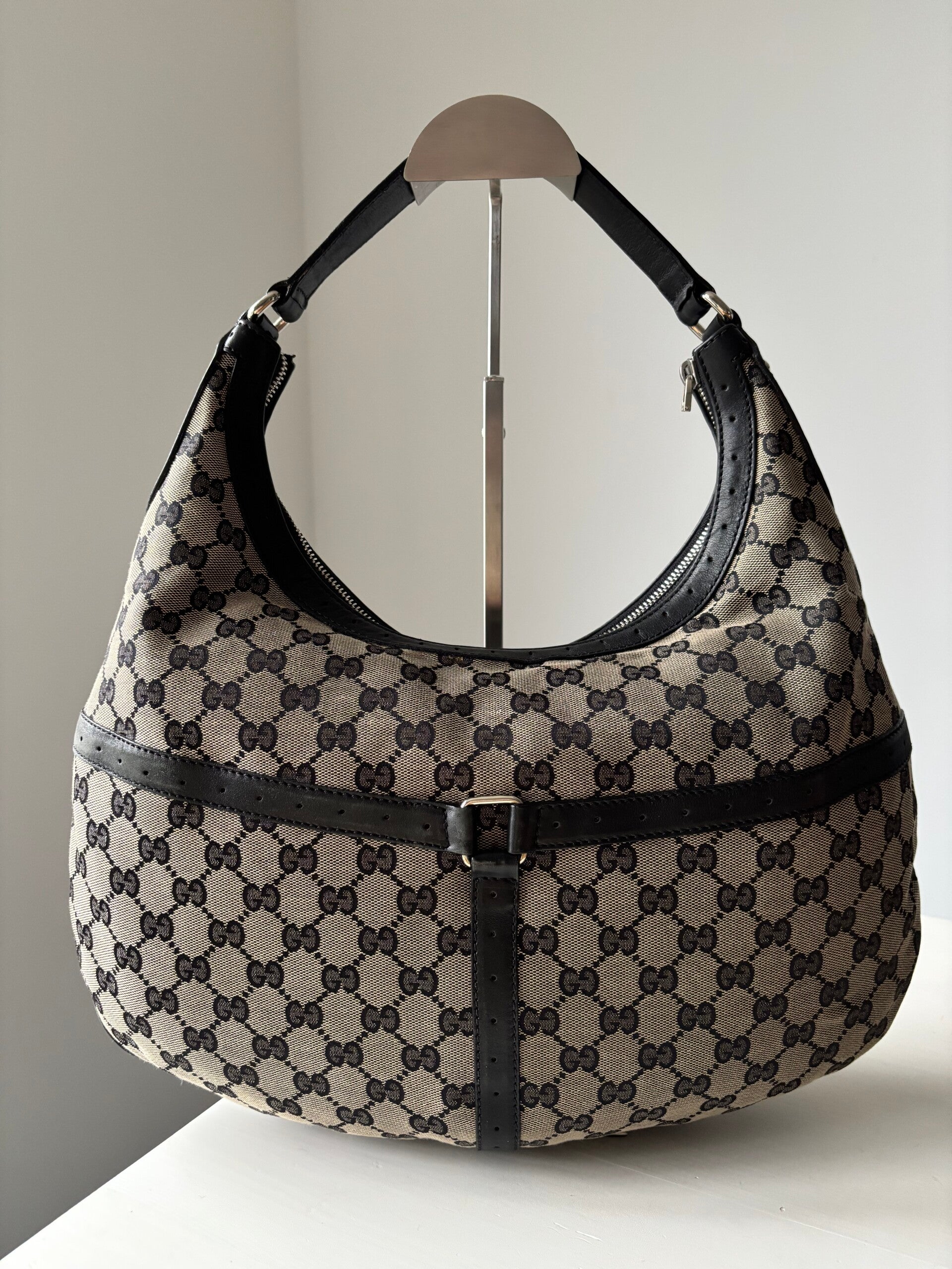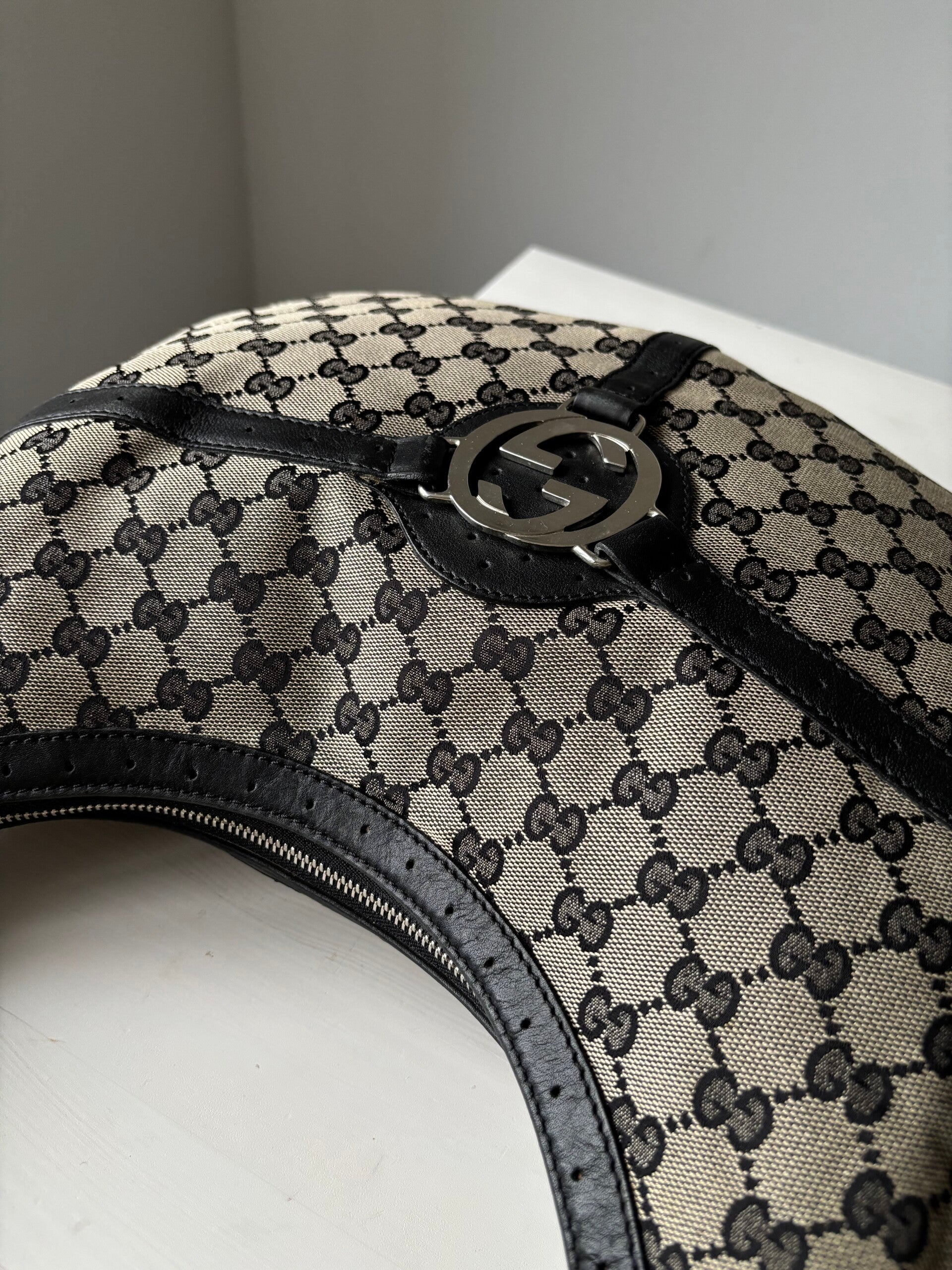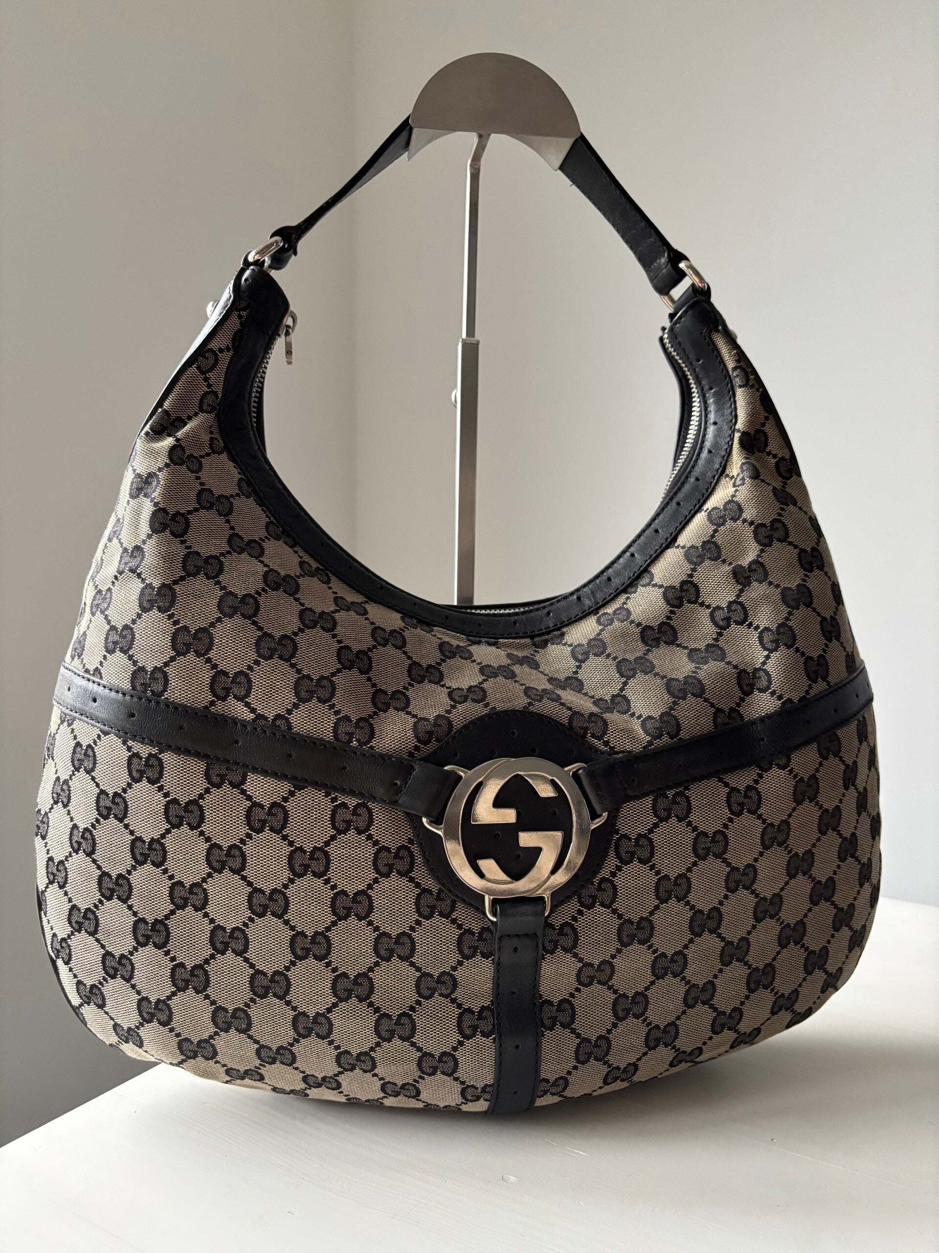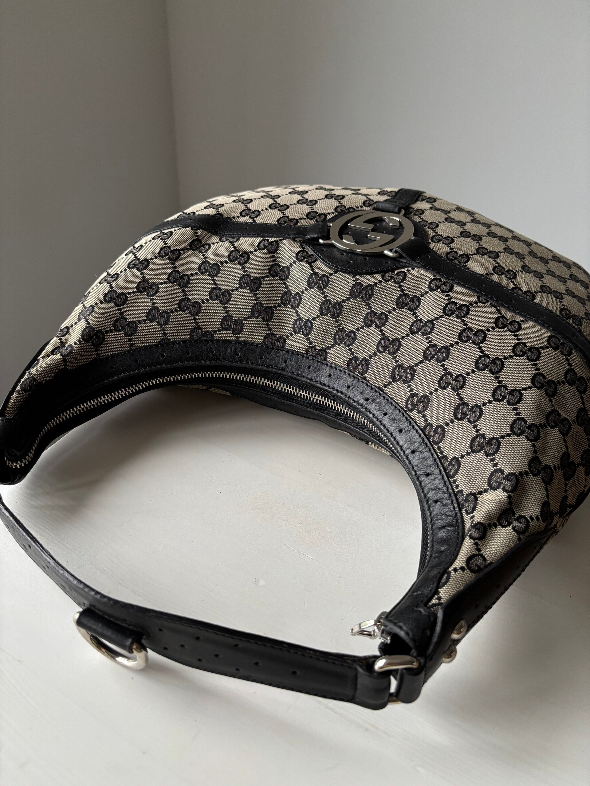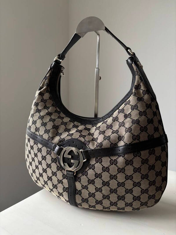 Gucci monogram hobo in zeer goede staat. Kan over de schouder worden gedragen. De afmetingen zijn ongeveer 38 x 25 cm. Komt inclusief Veggel Vintage certificaat van authenticiteit.