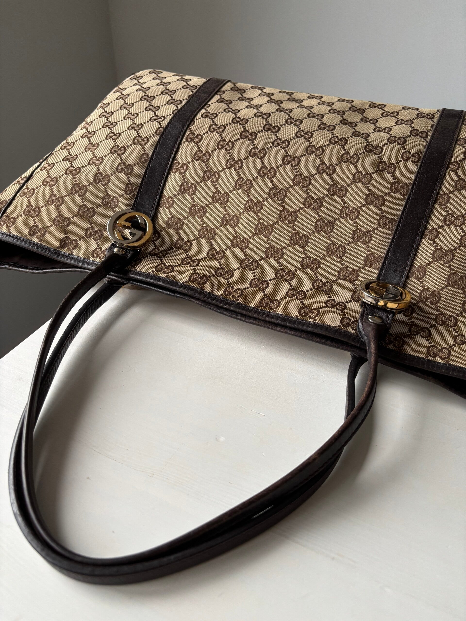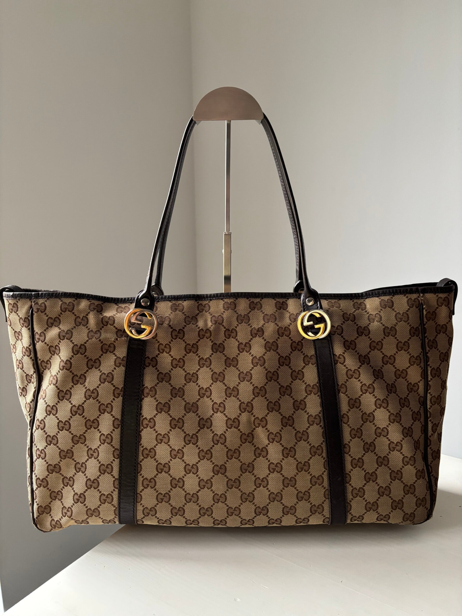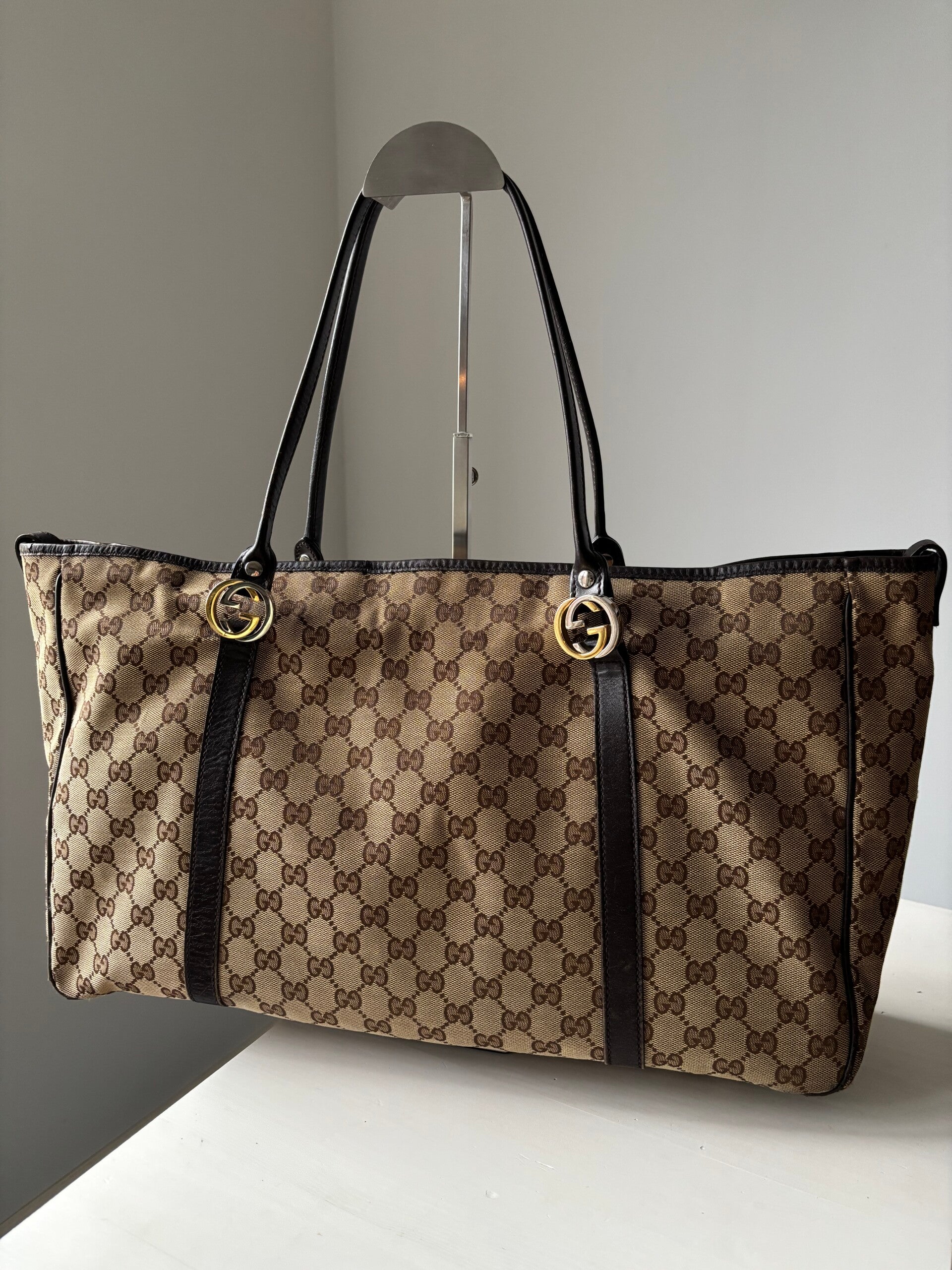 Gucci monogram twins hobo in zeer goede staat. Kan over de schouder worden gedragen. De afmetingen zijn ongeveer 45 x 27 cm. Er past een laptop in. Komt inclusief Veggel Vintage certificaat van authenticiteit.