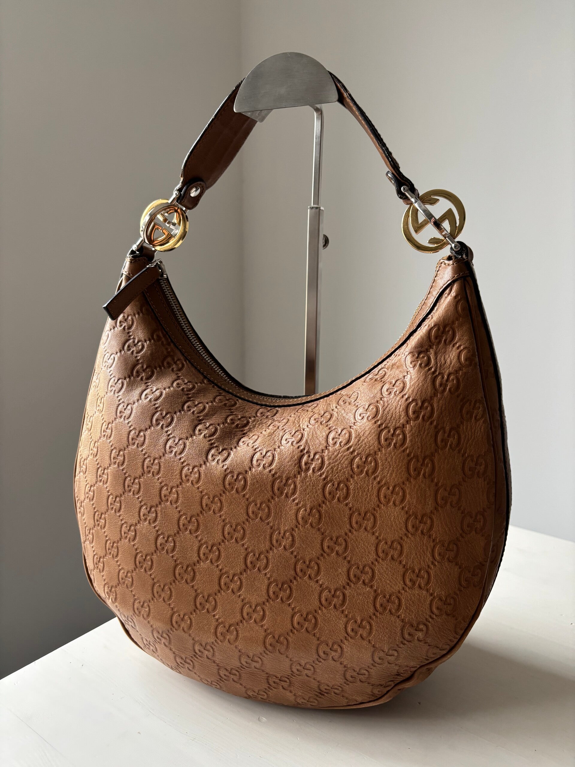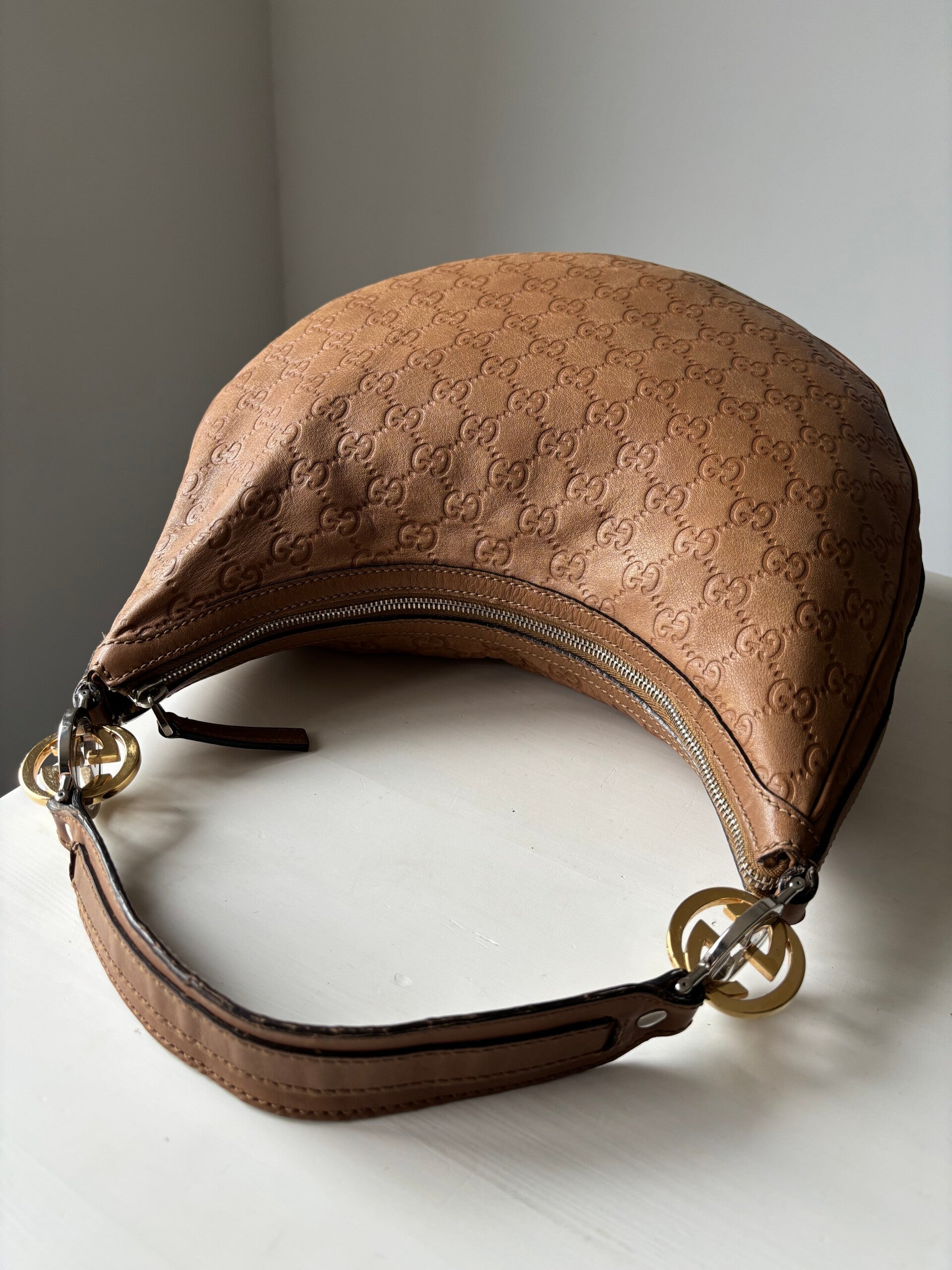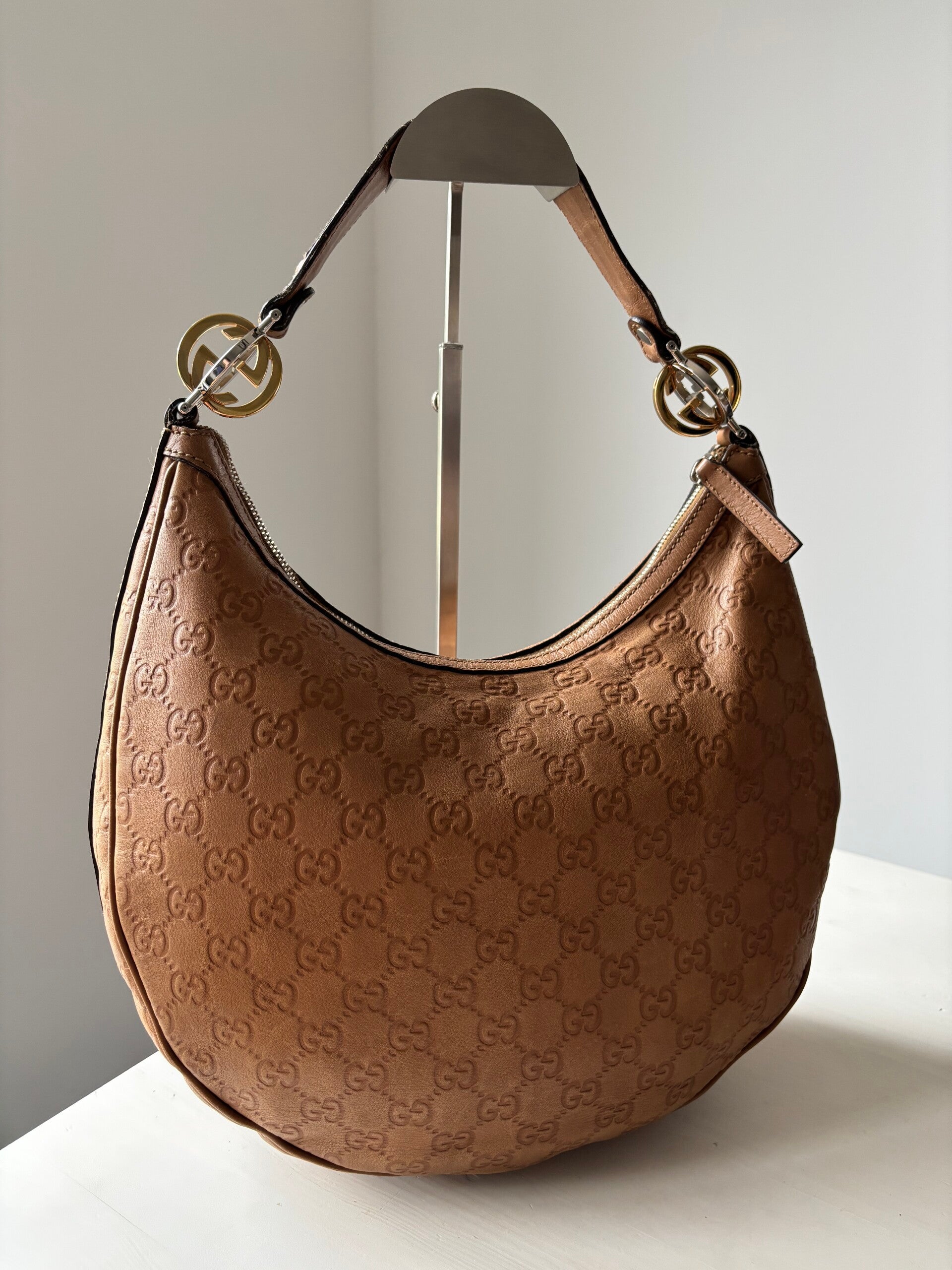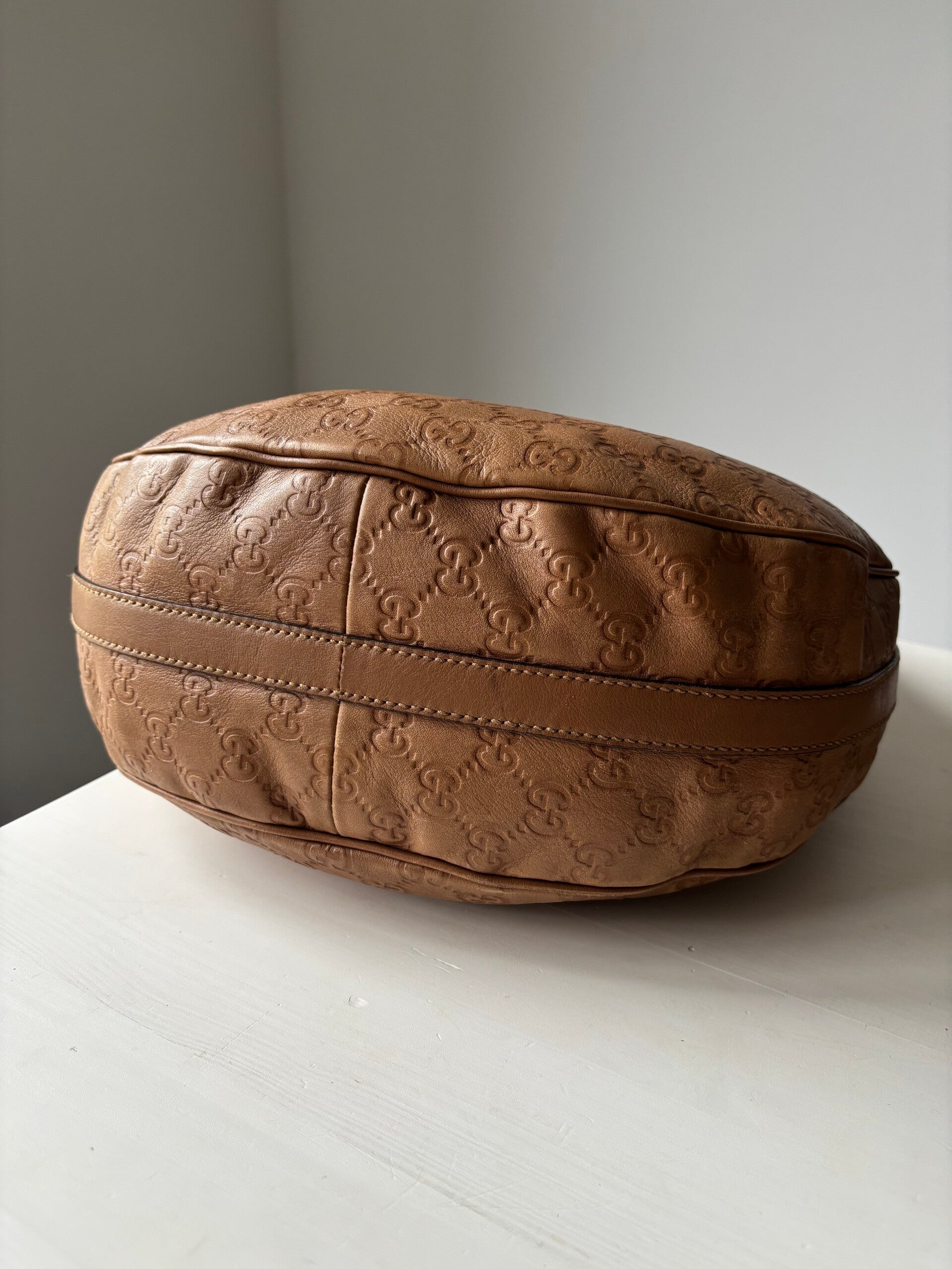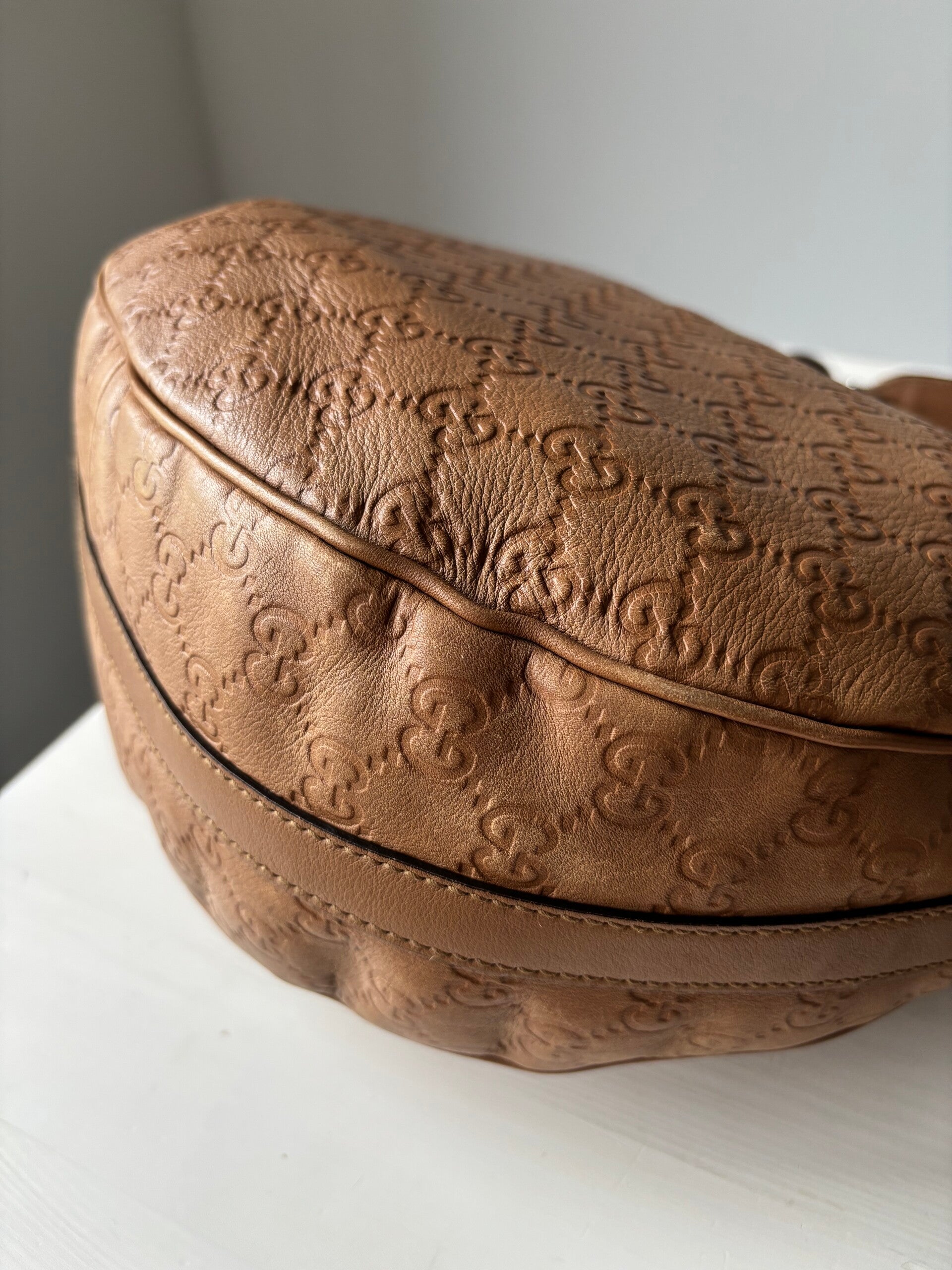 Gucci guccissima twins hobo in zeer goede staat. Kan over de schouder worden gedragen. De afmetingen zijn ongeveer 30 x 25 cm. Komt inclusief Veggel Vintage certificaat van authenticiteit en Veggel Vintage dustbag.