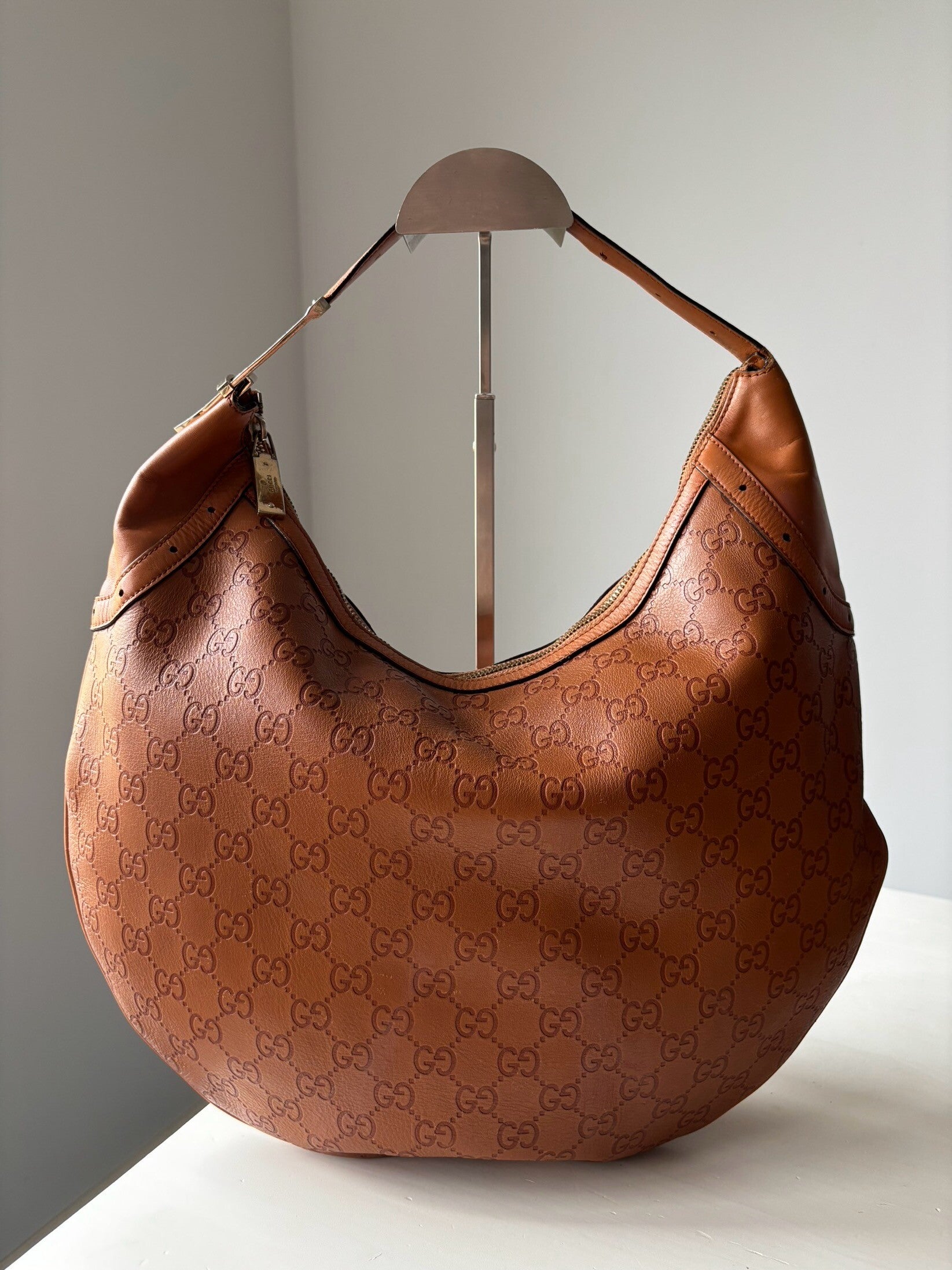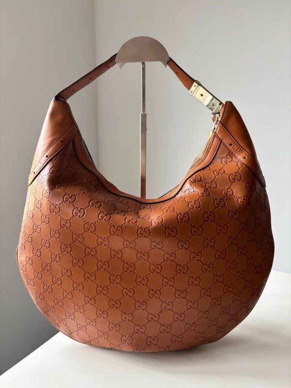 Gucci guccissima hobo in goede staat. Kan over de schouder worden gedragen. De afmetingen zijn ongeveer 40 x 30 cm. Er past een laptop in. Er mist een klein metalen deel van de strap (zie foto 6). Er verandert gelukkig niks aan de functionaliteit van de strap. Komt inclusief Veggel Vintage certificaat van authenticiteit en Veggel Vintage dustbag.