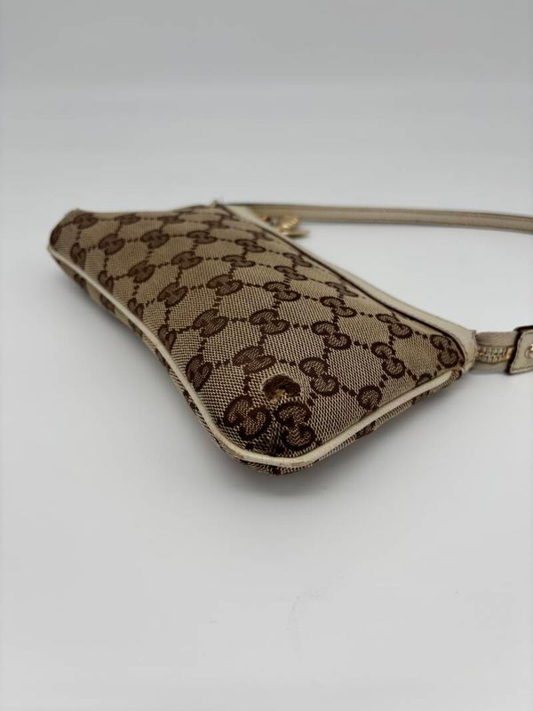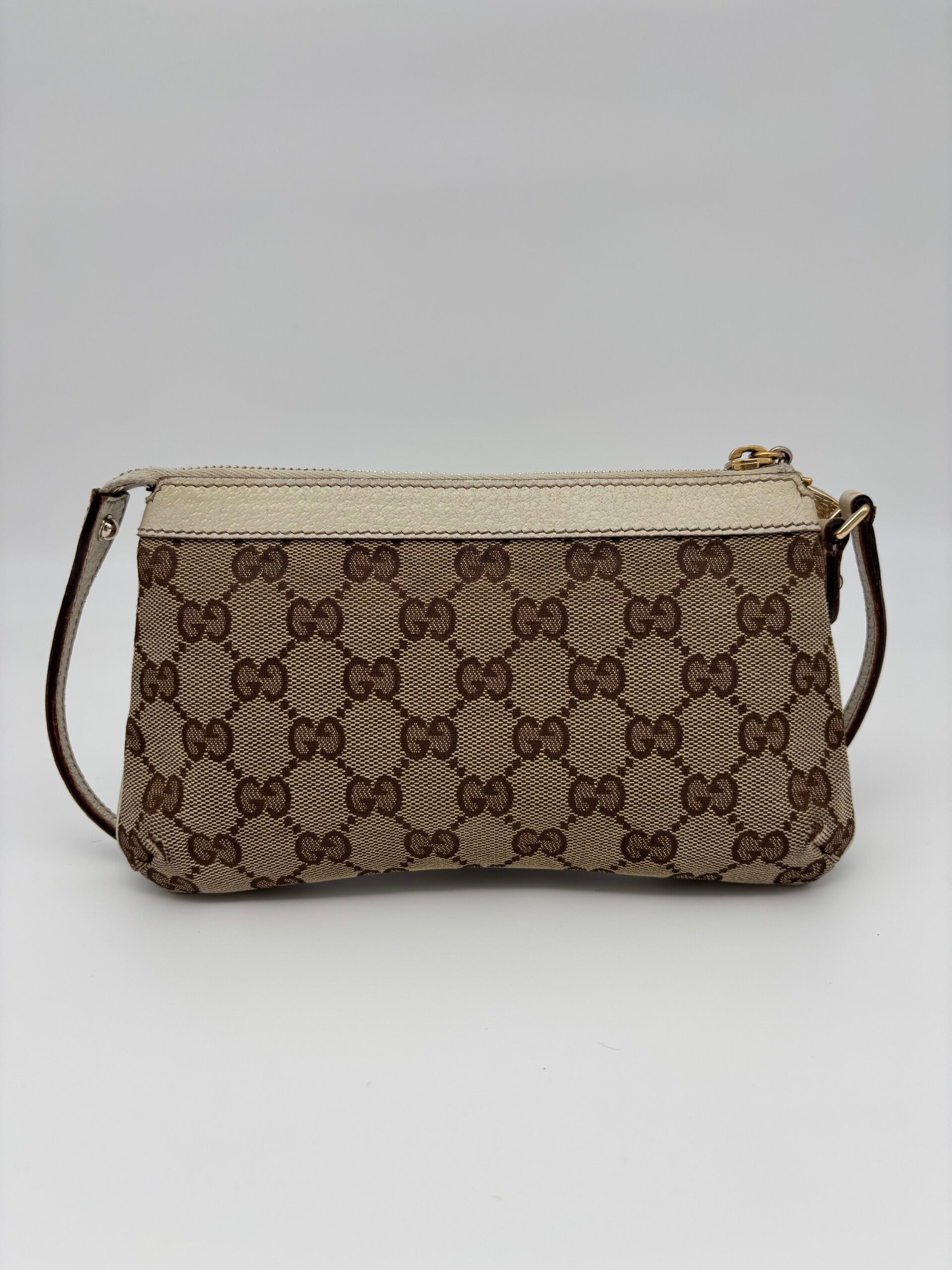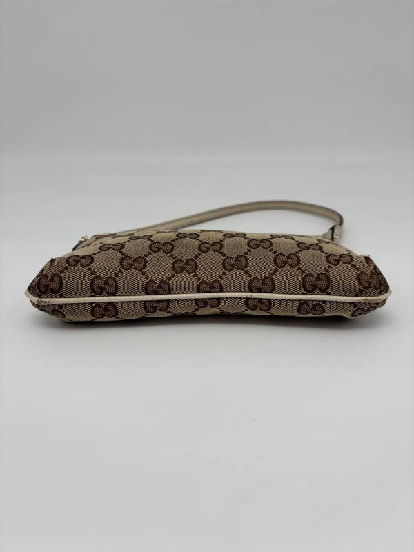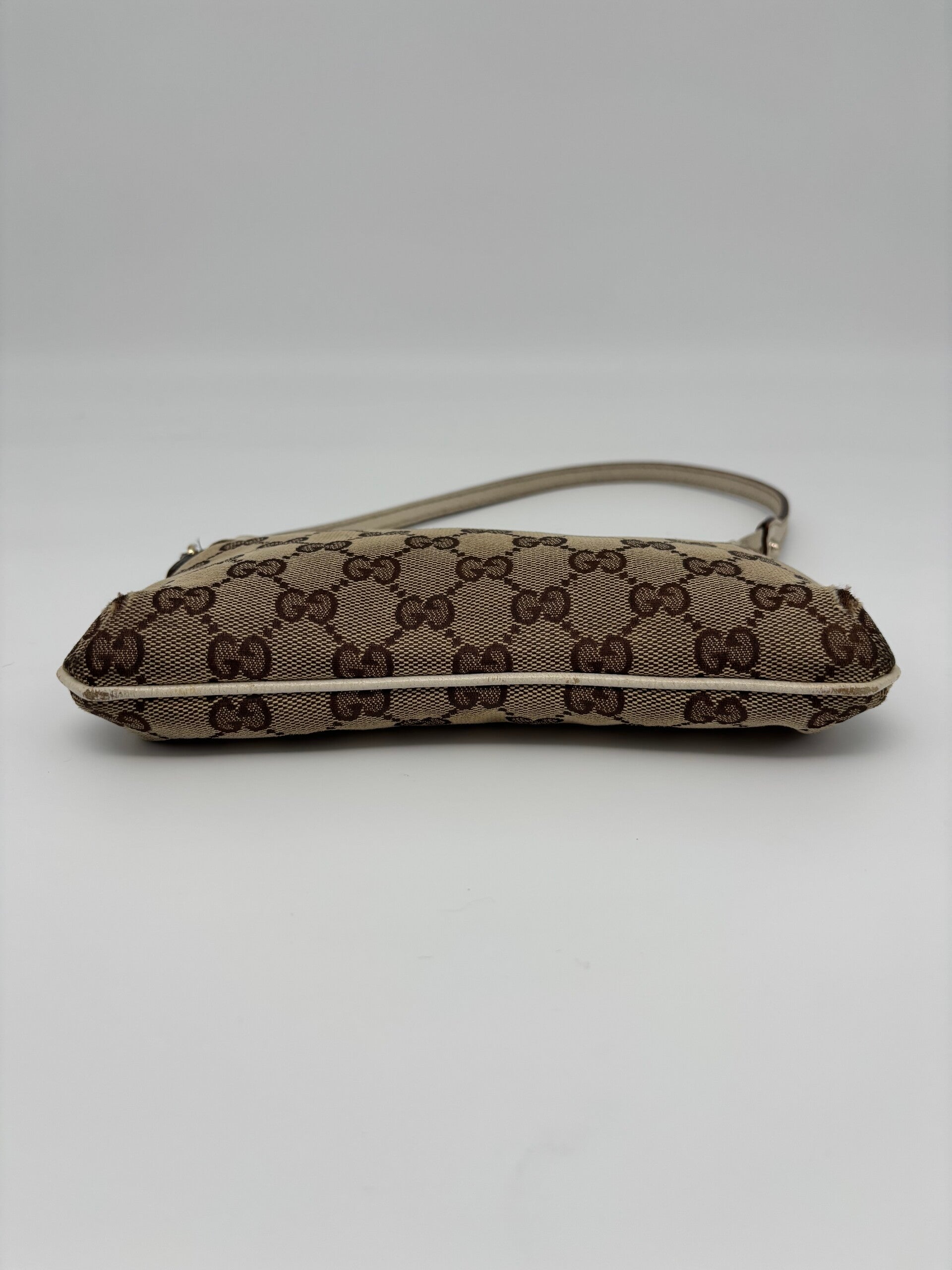 Gucci monogram pochette in goede staat. Kan over de schouder worden gedragen. De afmetingen zijn ongeveer 21 x 12 cm. Komt inclusief Veggel Vintage certificaat van authenticiteit en Veggel Vintage dustbag.