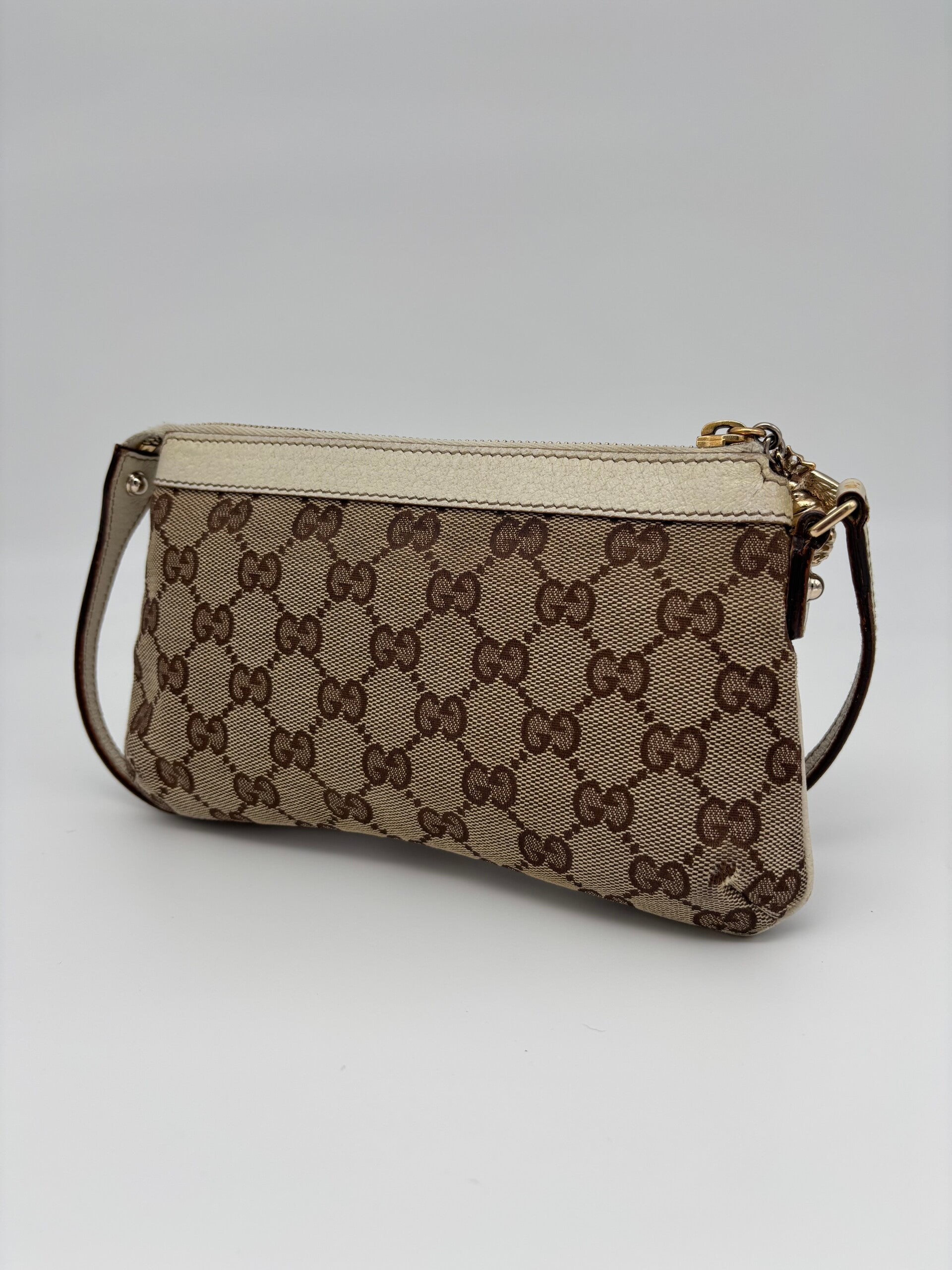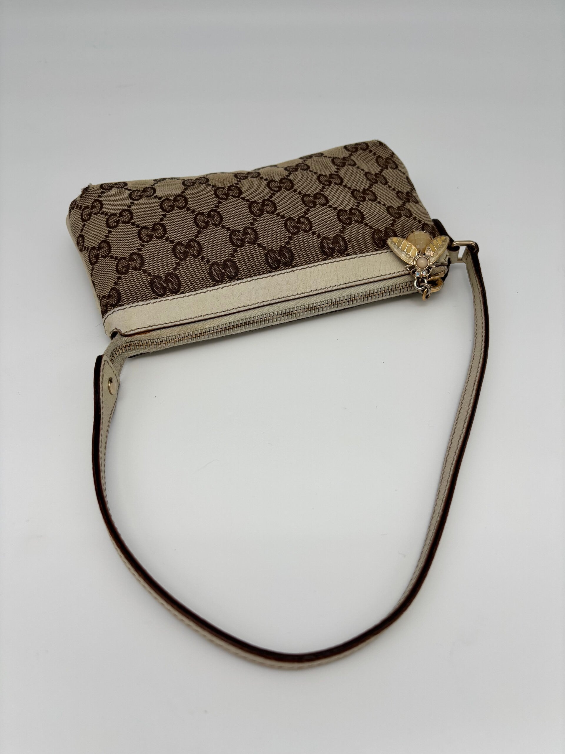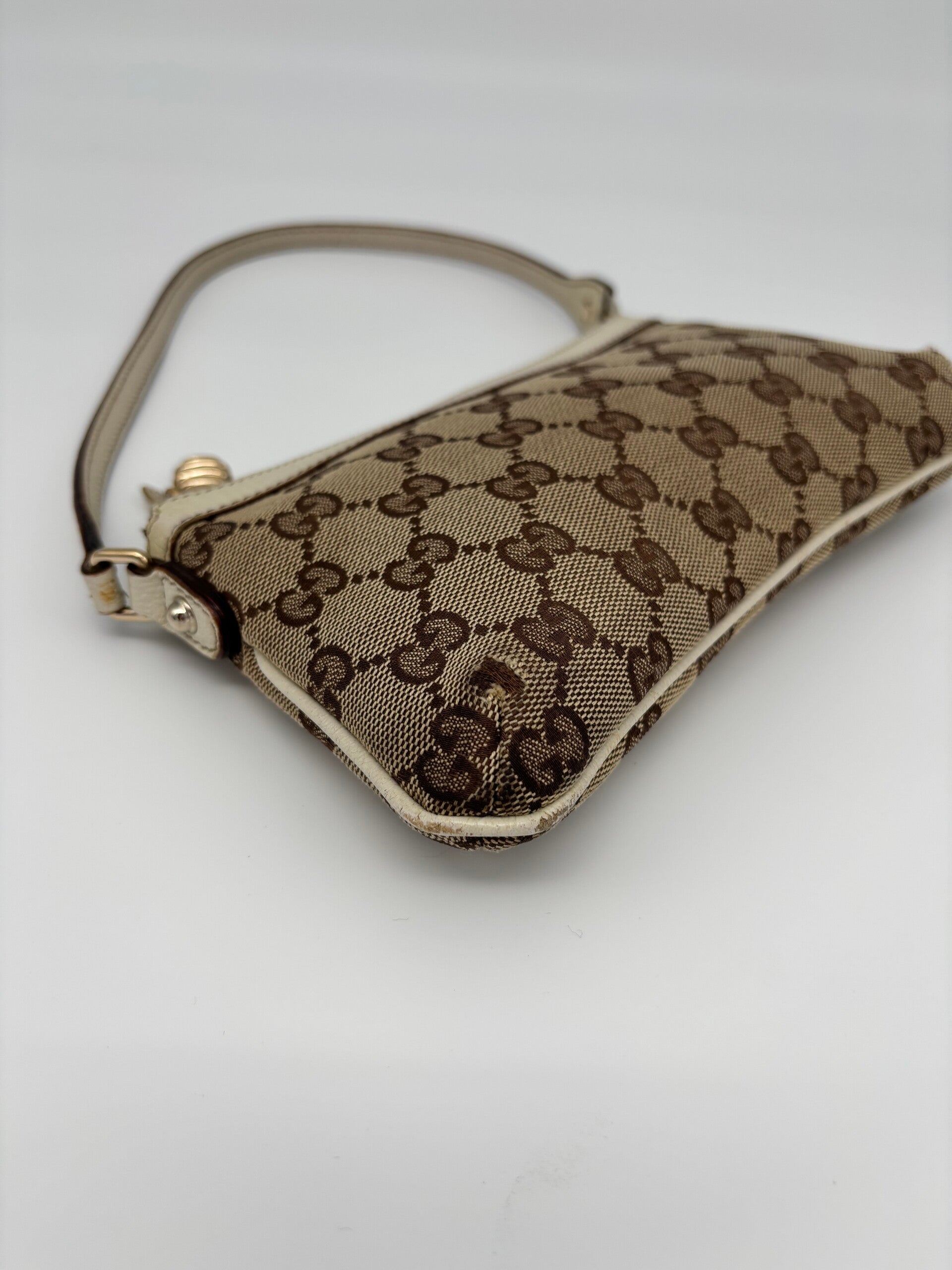 Gucci monogram pochette in goede staat. Kan over de schouder worden gedragen. De afmetingen zijn ongeveer 21 x 12 cm. Komt inclusief Veggel Vintage certificaat van authenticiteit en Veggel Vintage dustbag.